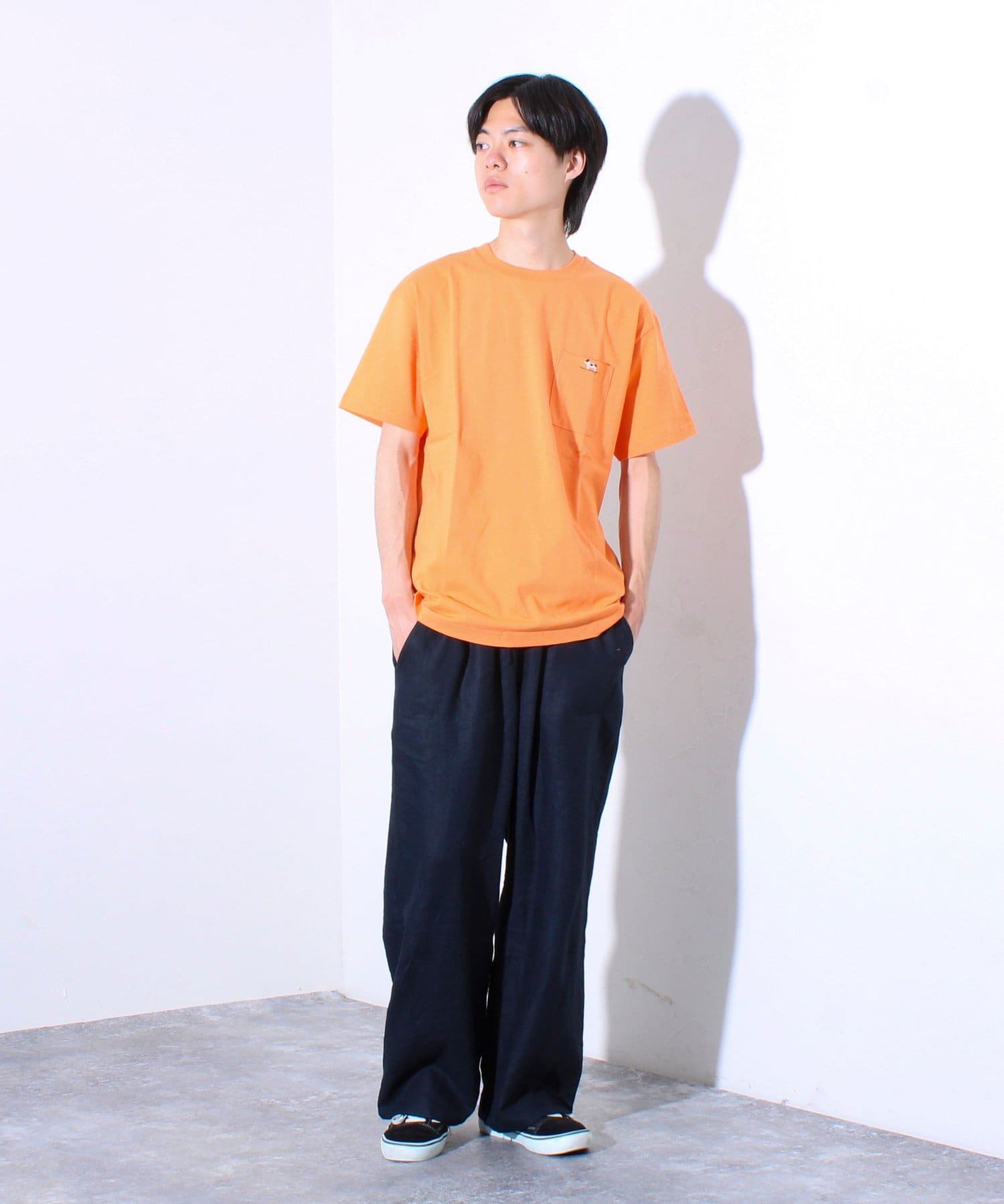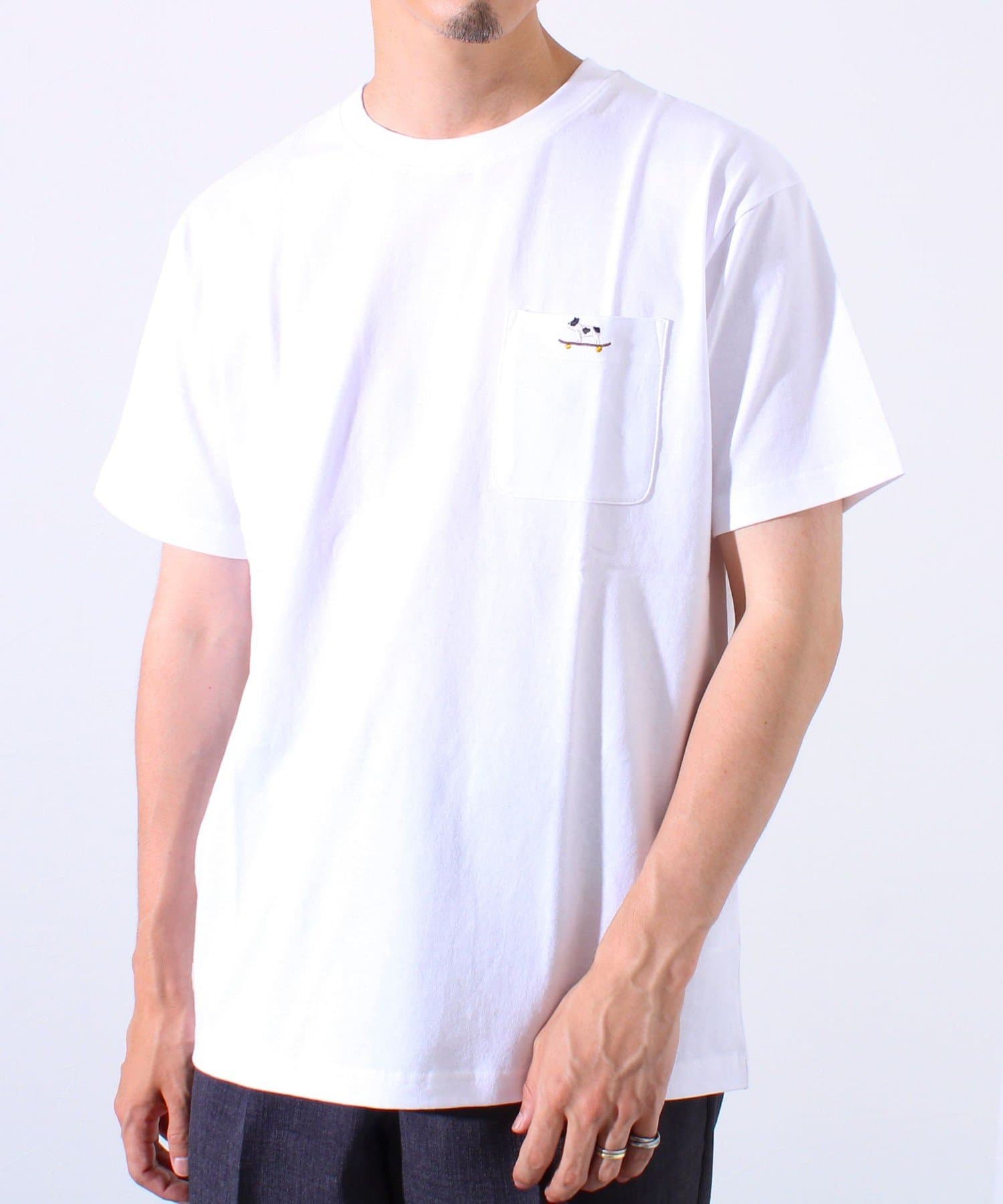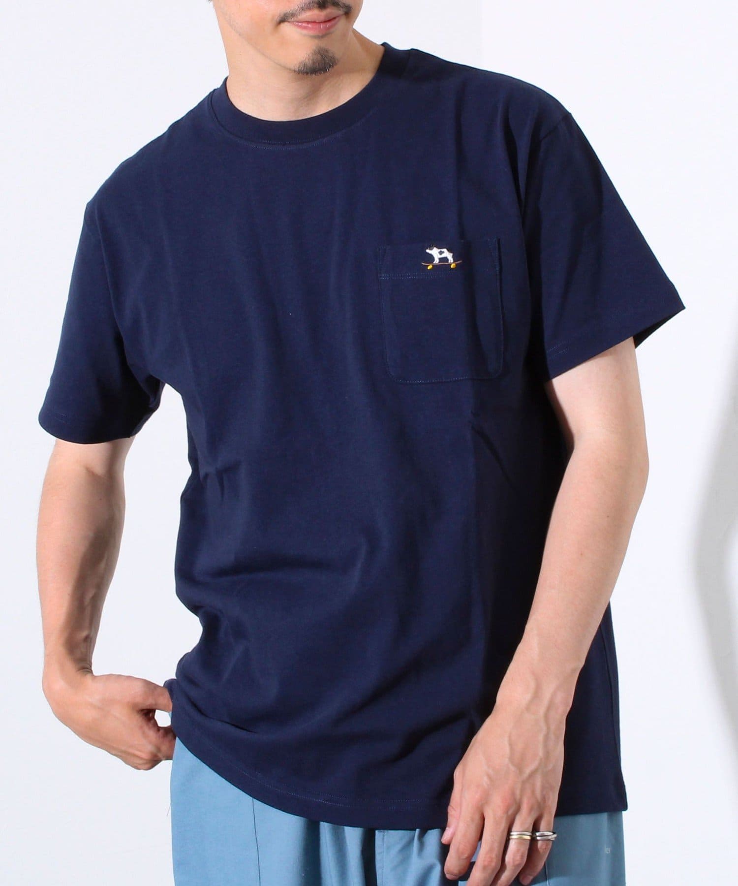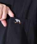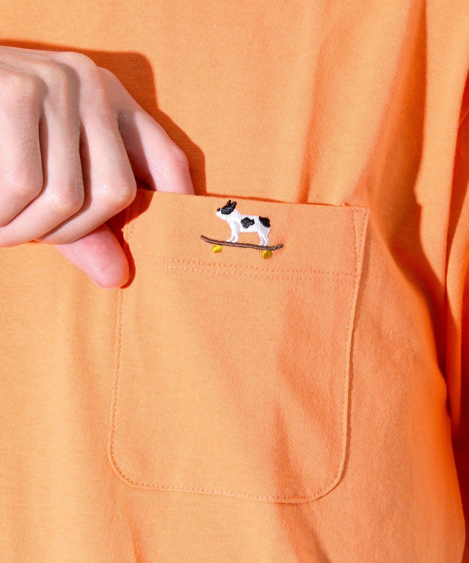 ・シンプルなポケットTシャツに、さりげない“フレンチブルドッグ刺繍”がアクセント。