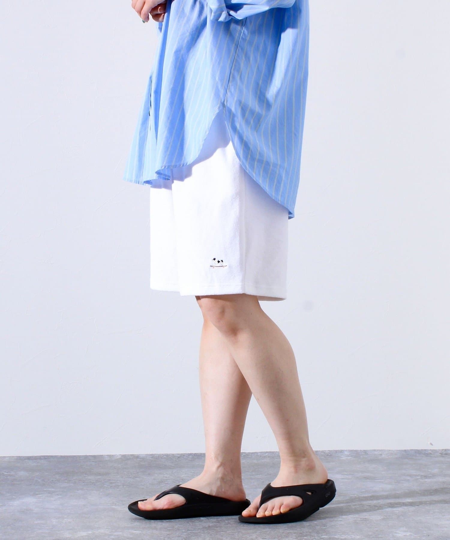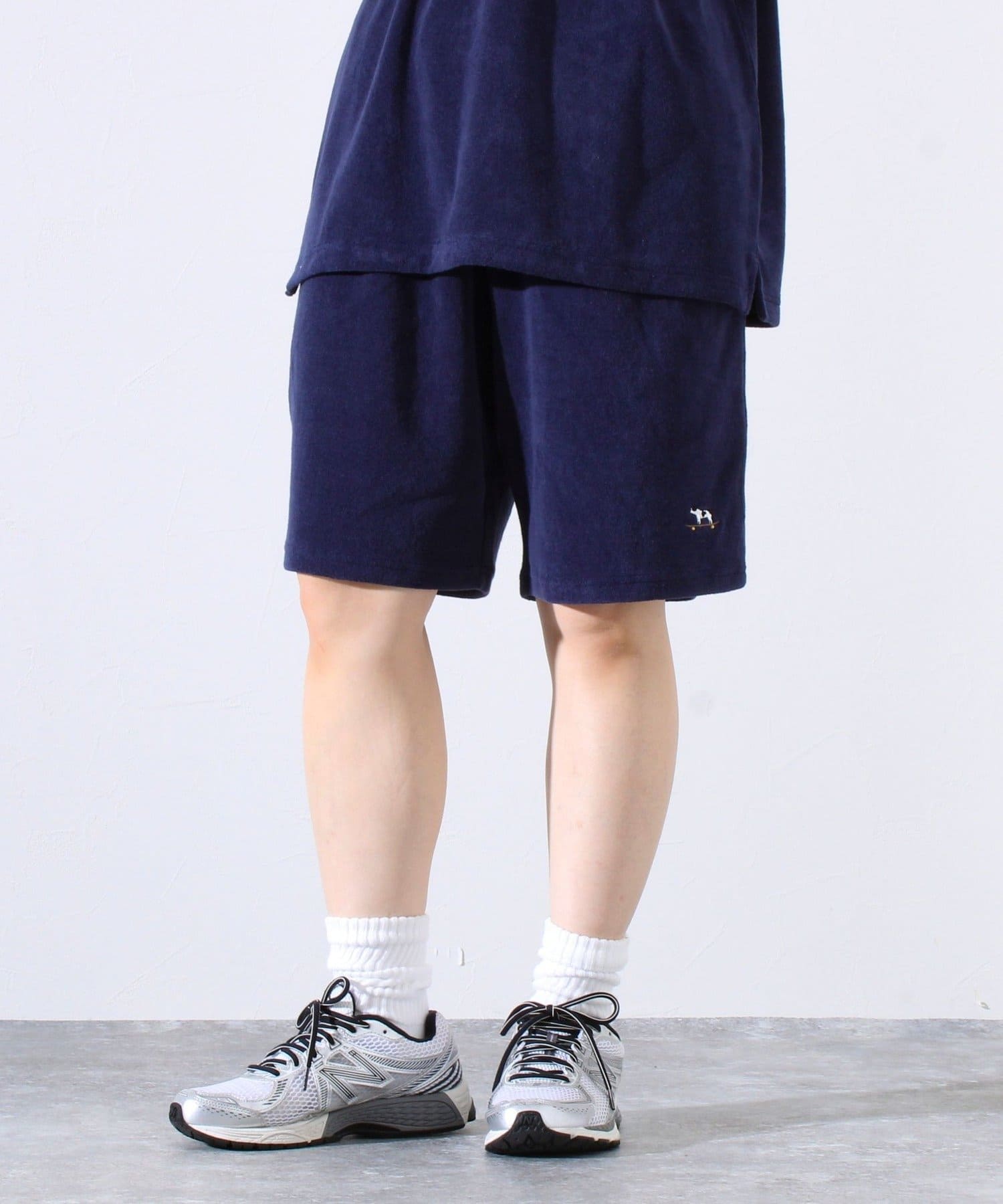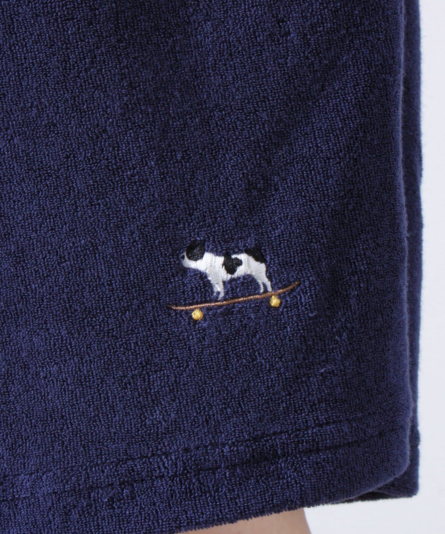 スケボーに乗ったフレンチブルドッグ刺繍がポイントの、遊び心あふれるパイルショーツ。