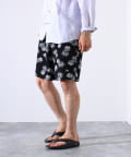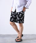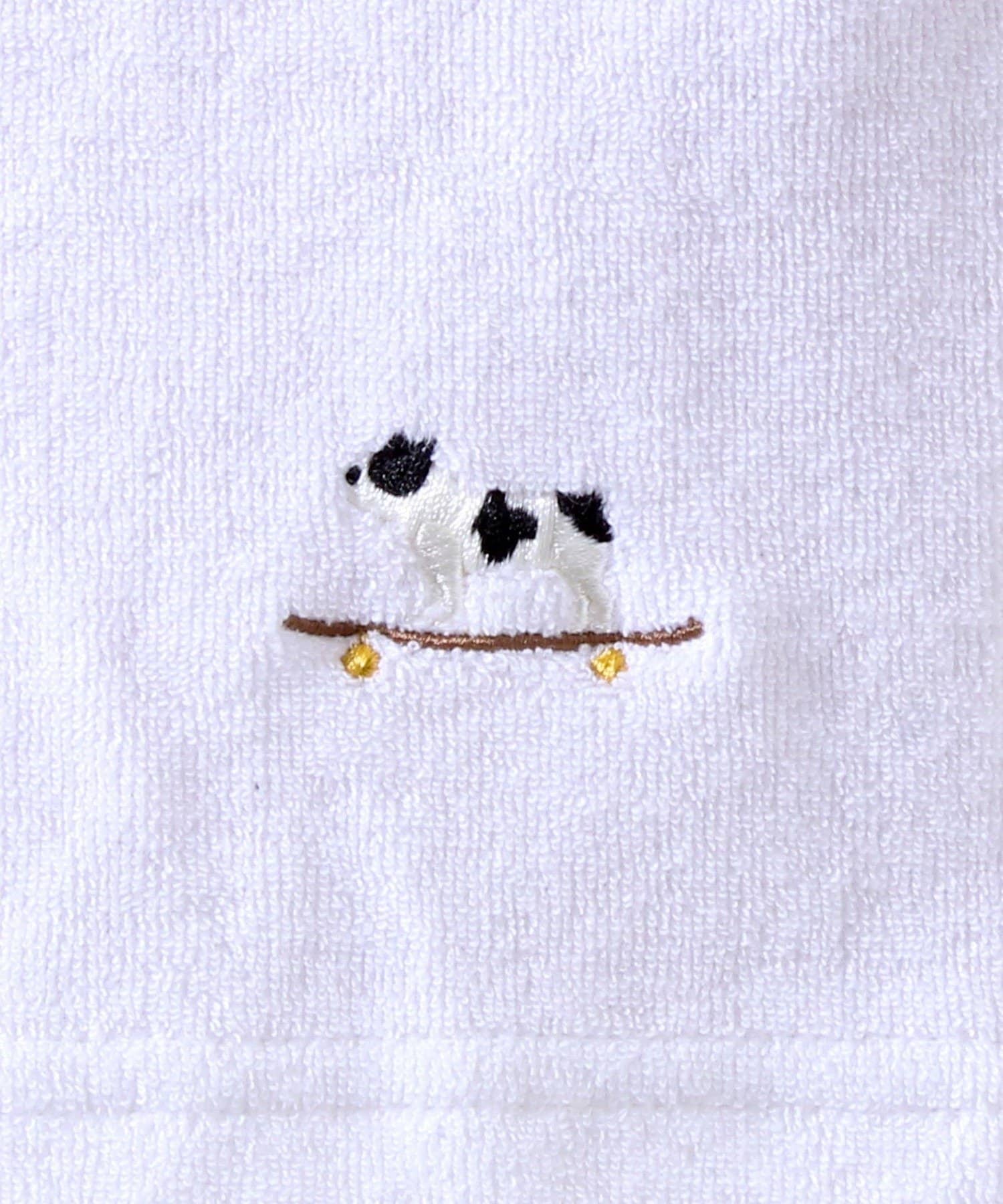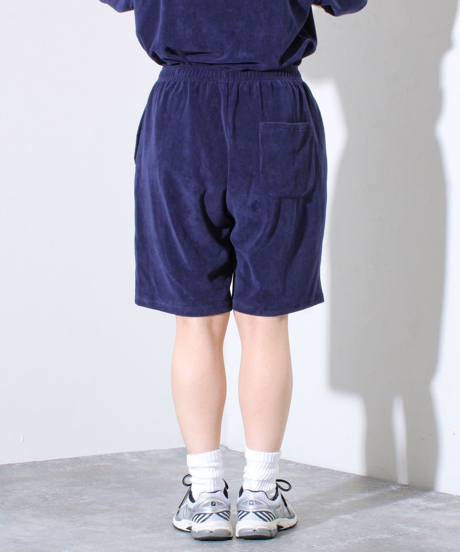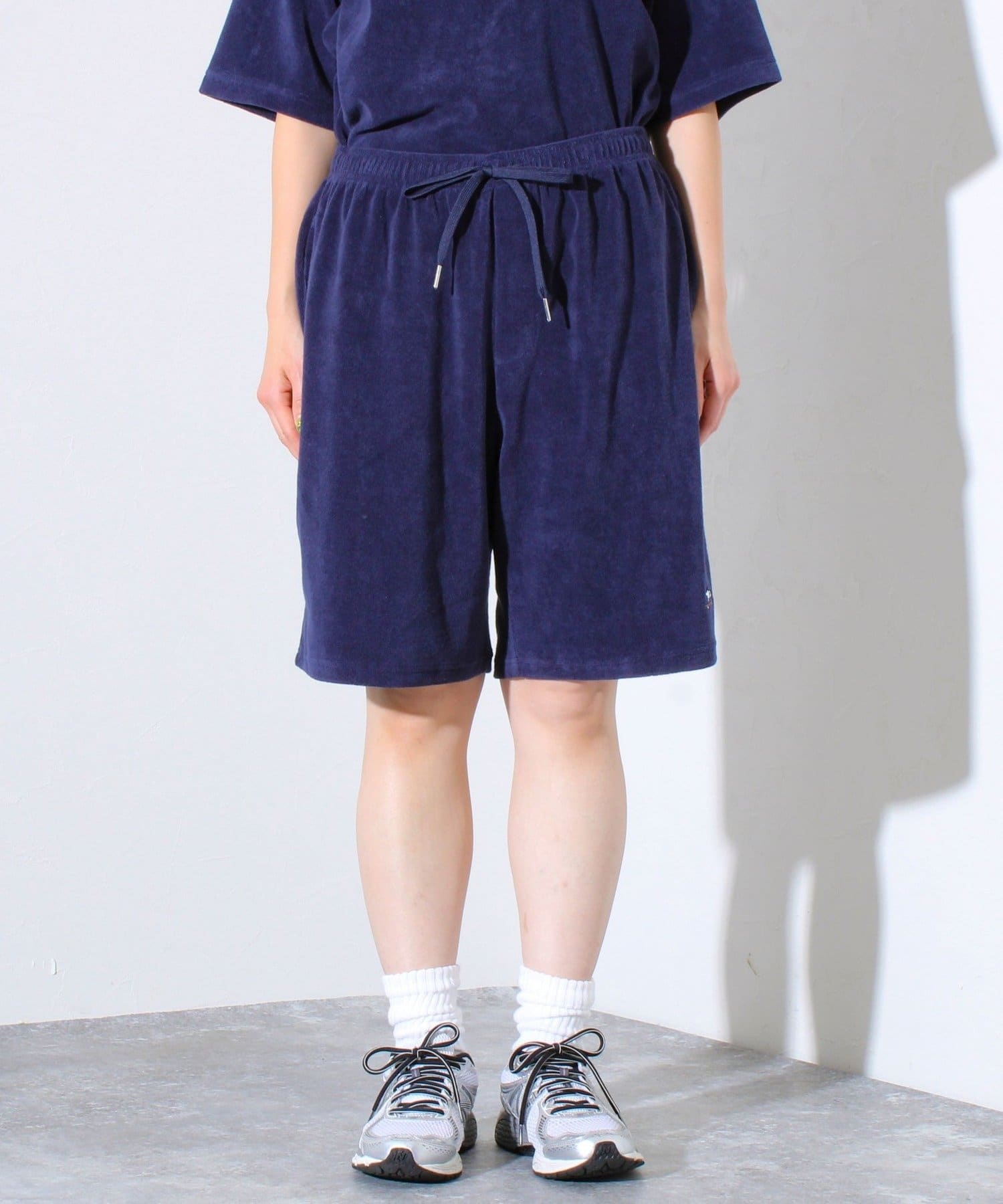 スケボーに乗ったフレンチブルドッグ刺繍がポイントの、遊び心あふれるパイルショーツ。