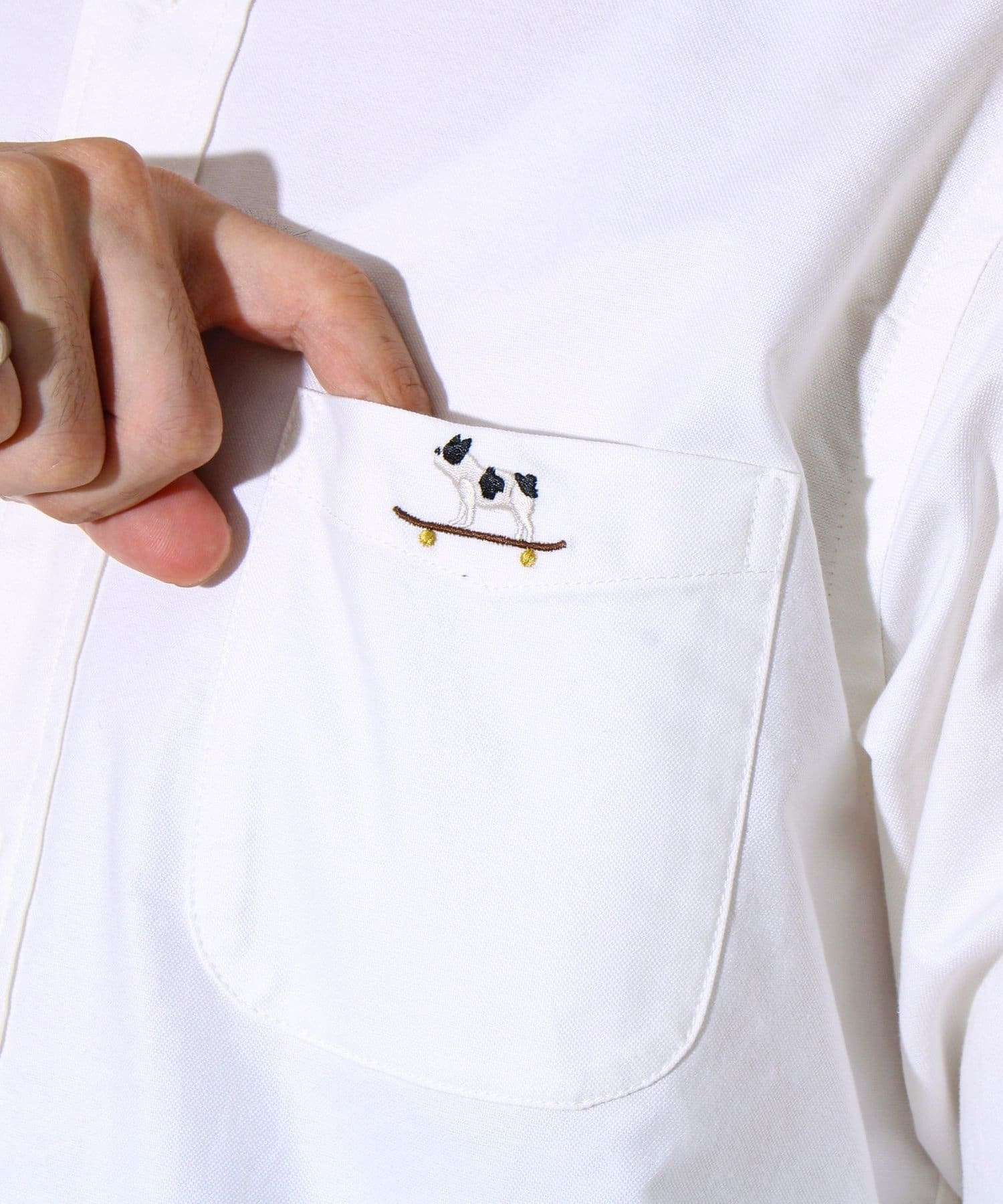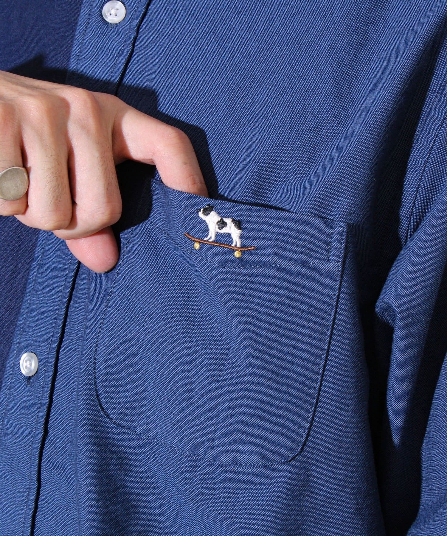胸ポケットにはさりげなくフレンチブルドッグの刺繍入り。ユーモアとこだわりが詰まったアクセントに。