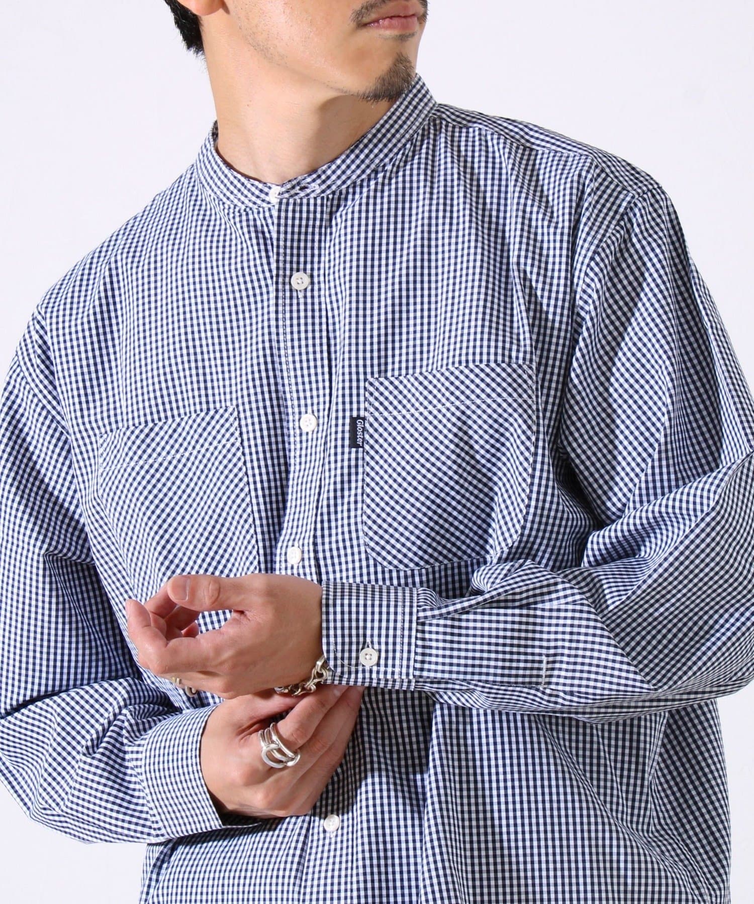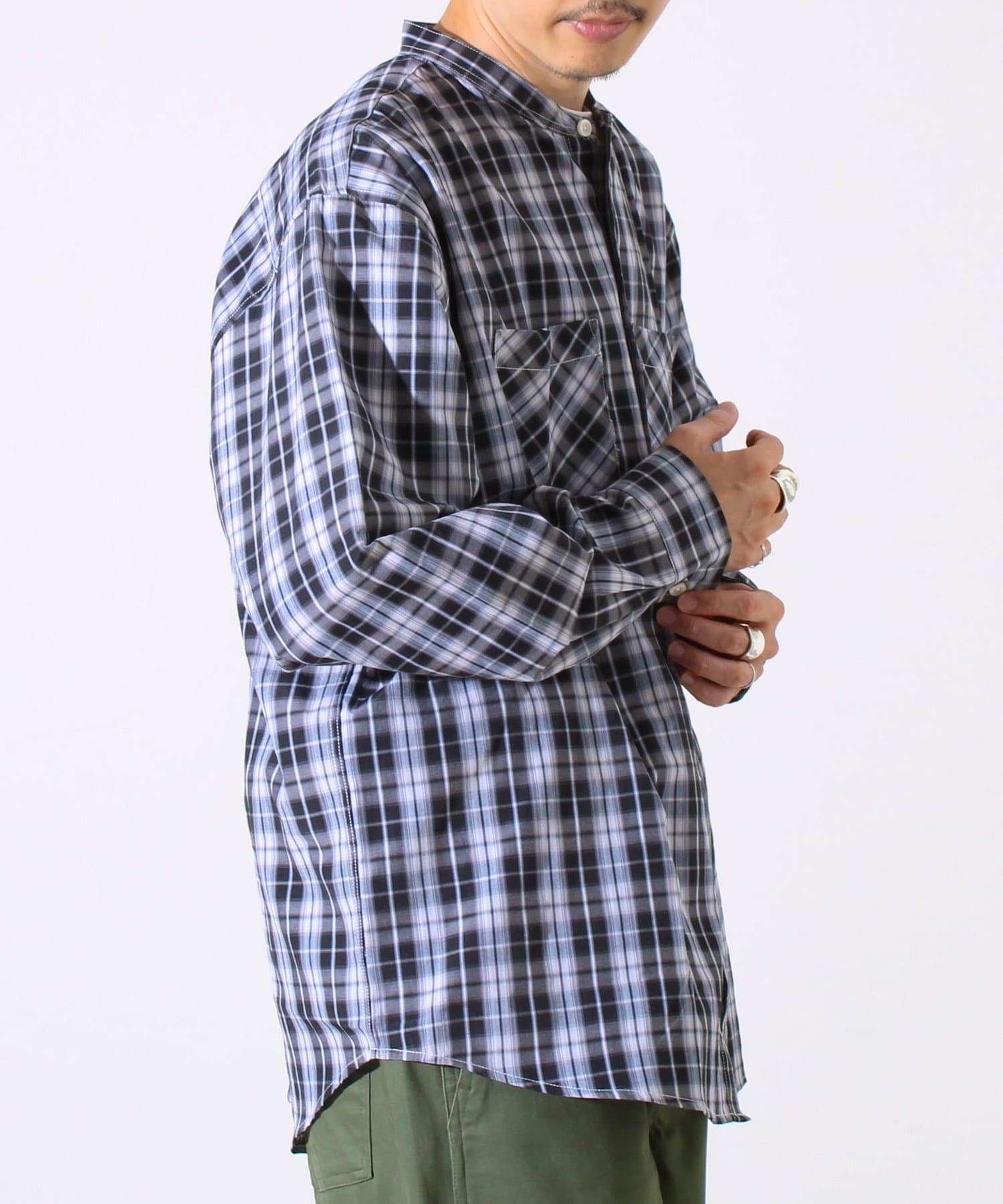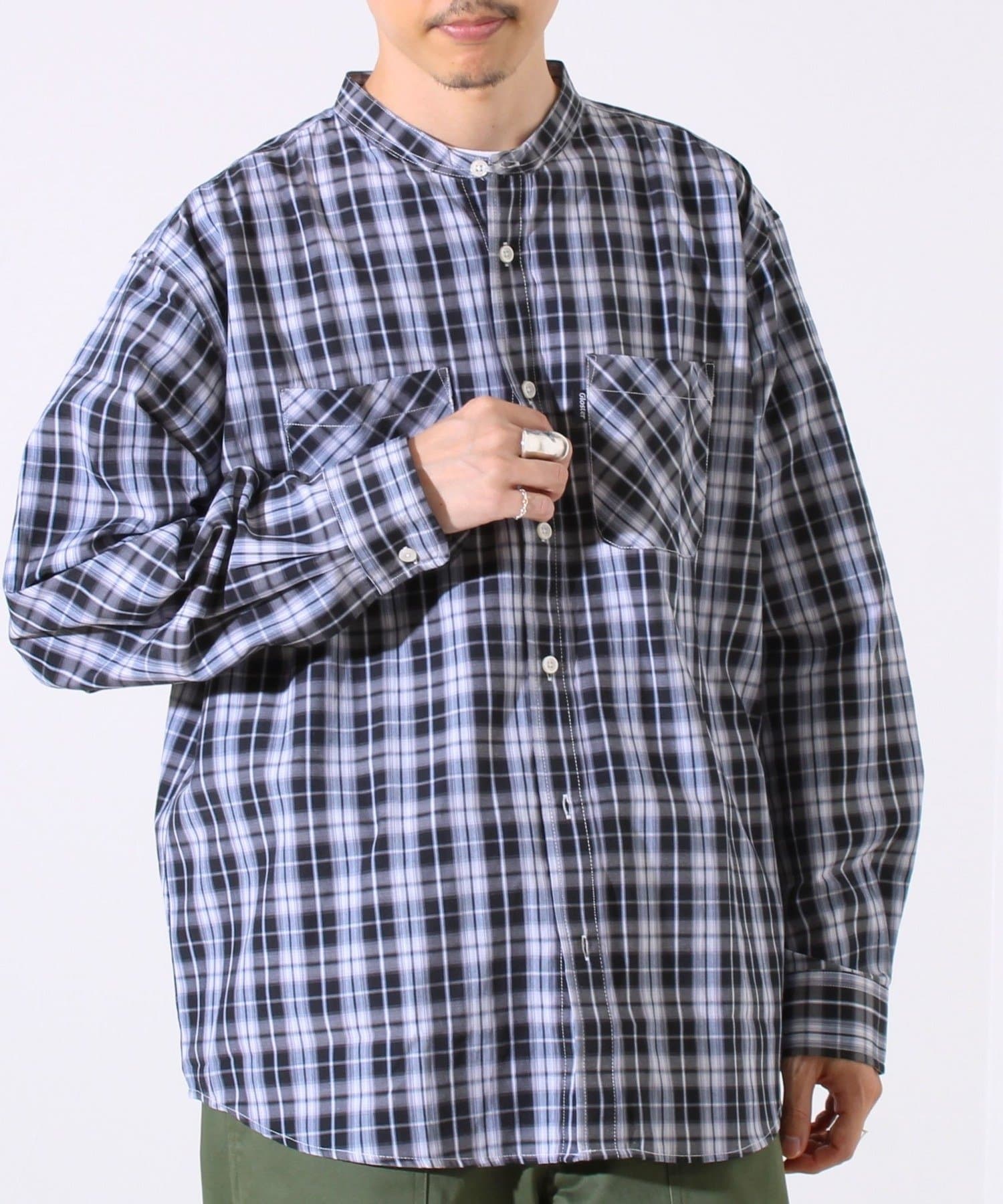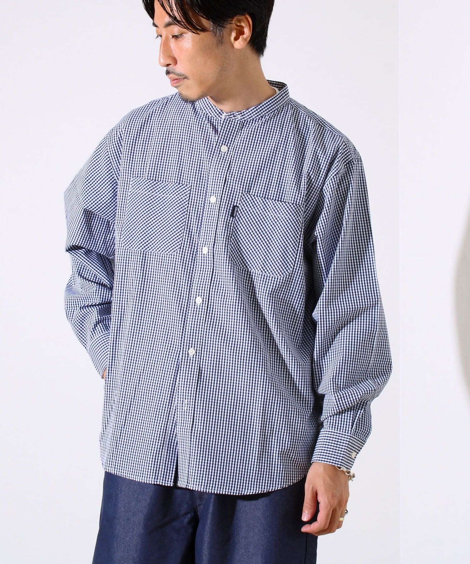 「大人カジュアルに映えるチェック柄バンドカラーシャツ」