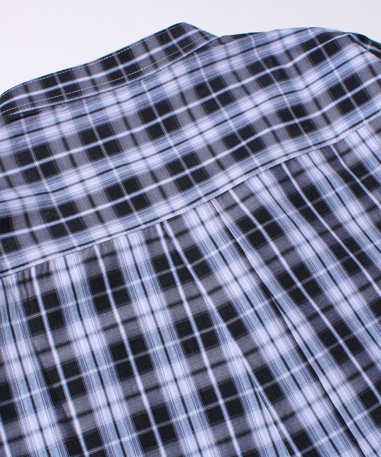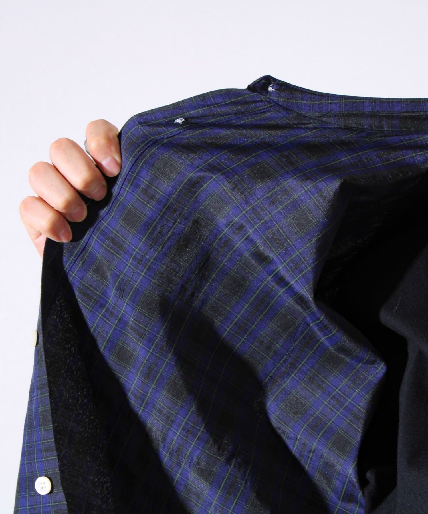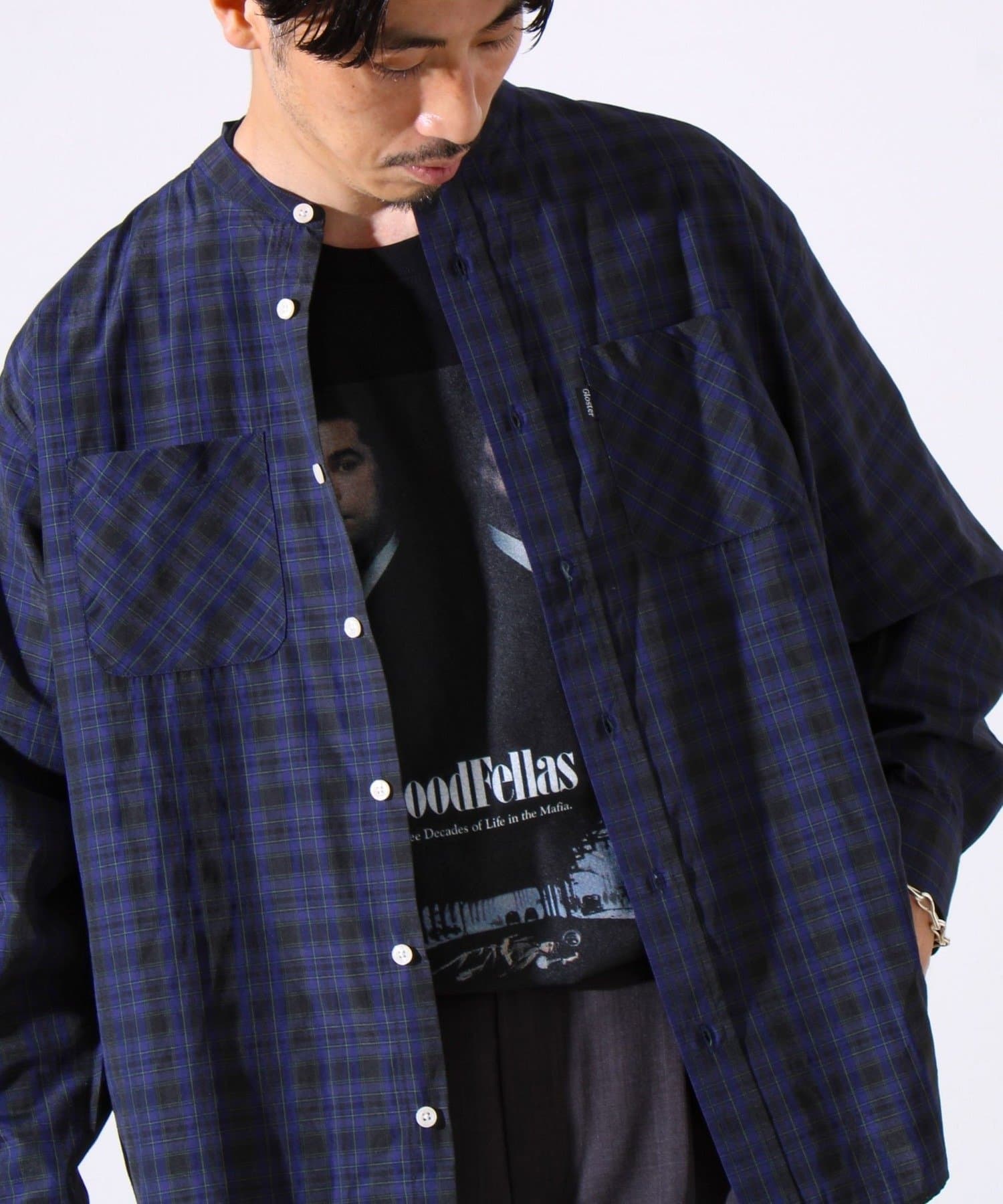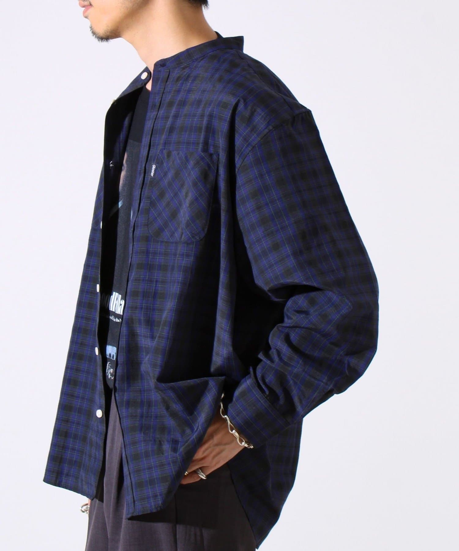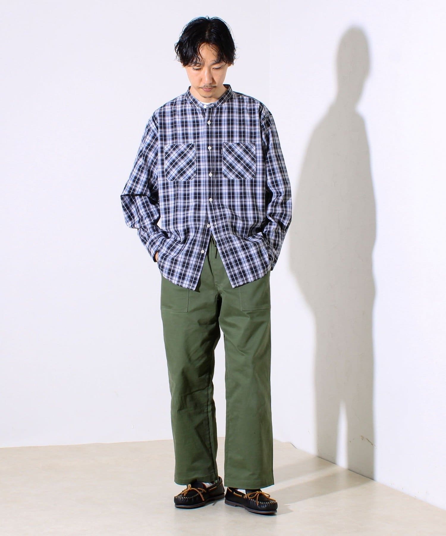 「大人カジュアルに映えるチェック柄バンドカラーシャツ」