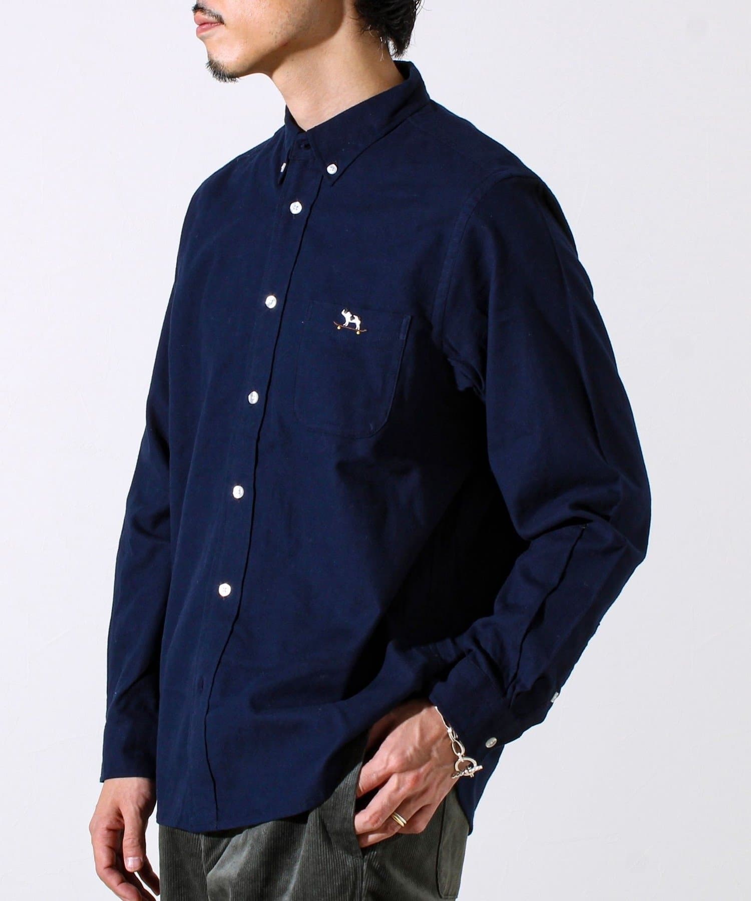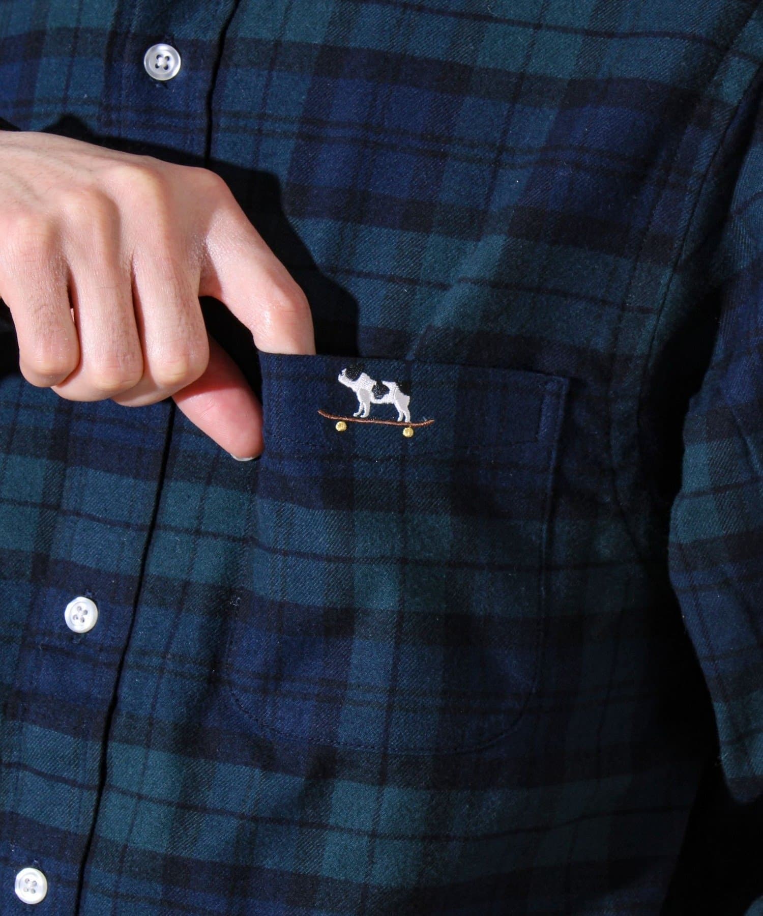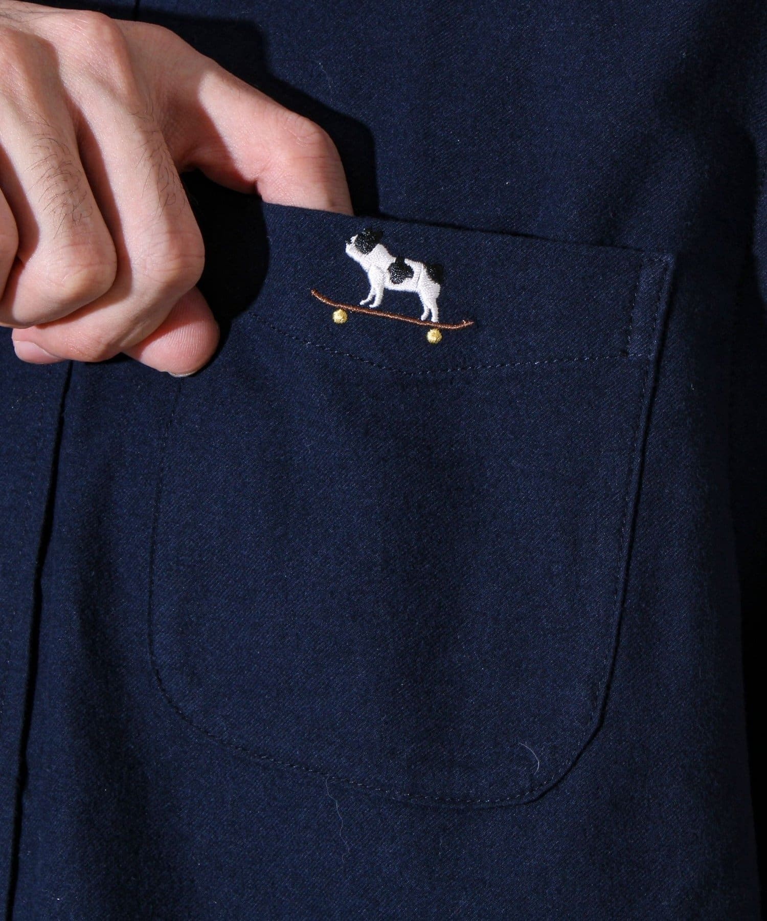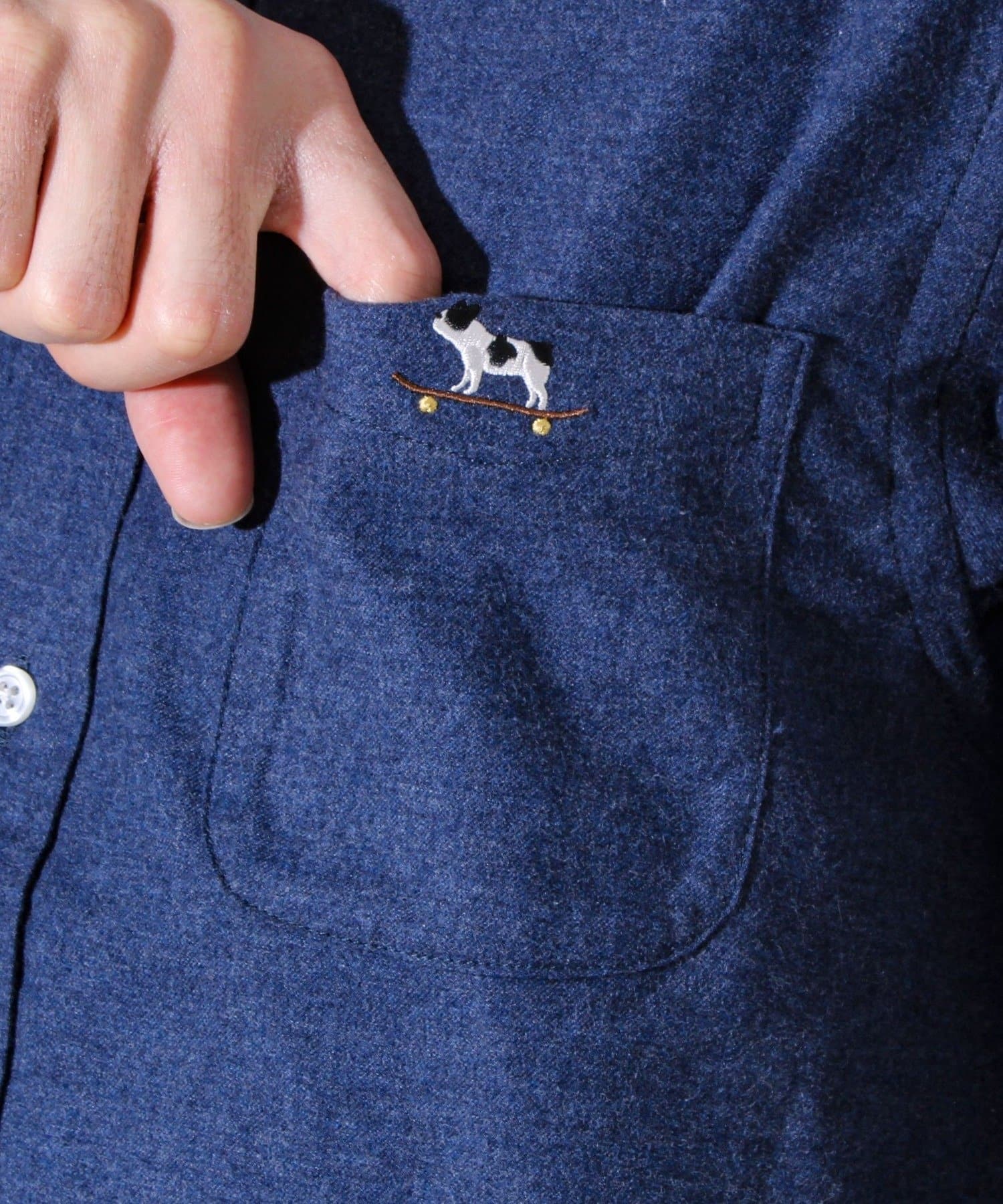 ・胸ポケットには人気の“スケボーするフレンチブルドッグ”刺繍入りで遊び心をプラス
