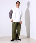 無地パンツに合わせるだけで、袖の配色デザインがコーデを格上げ。