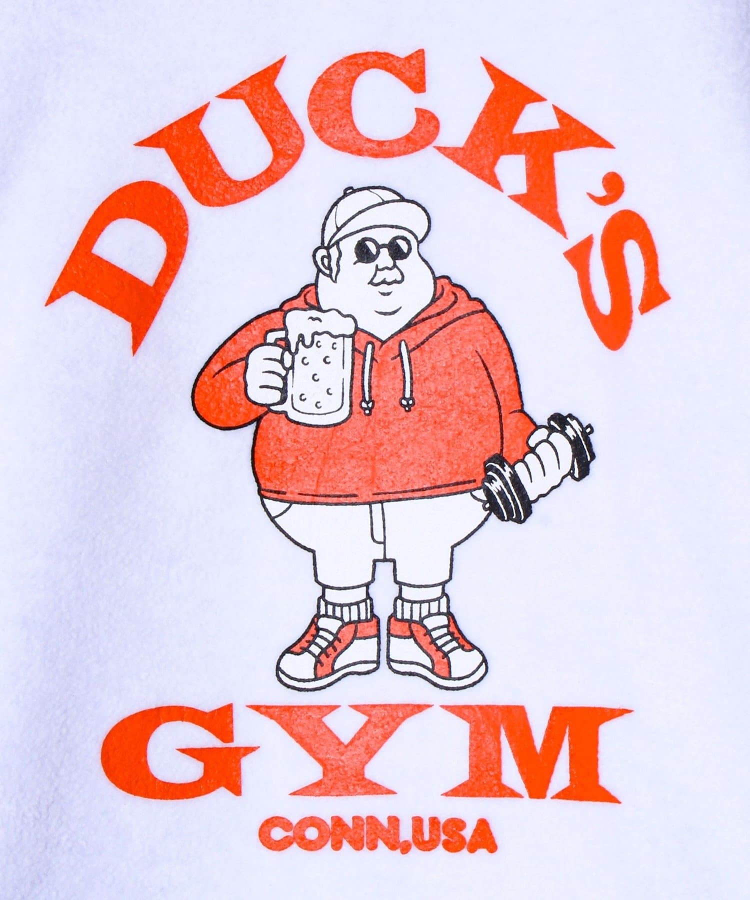・表面はバックに4コマ風イラスト入りで遊び心満点、裏面は“DUCK’S GYM”のユーモラスなキャラクタープリント