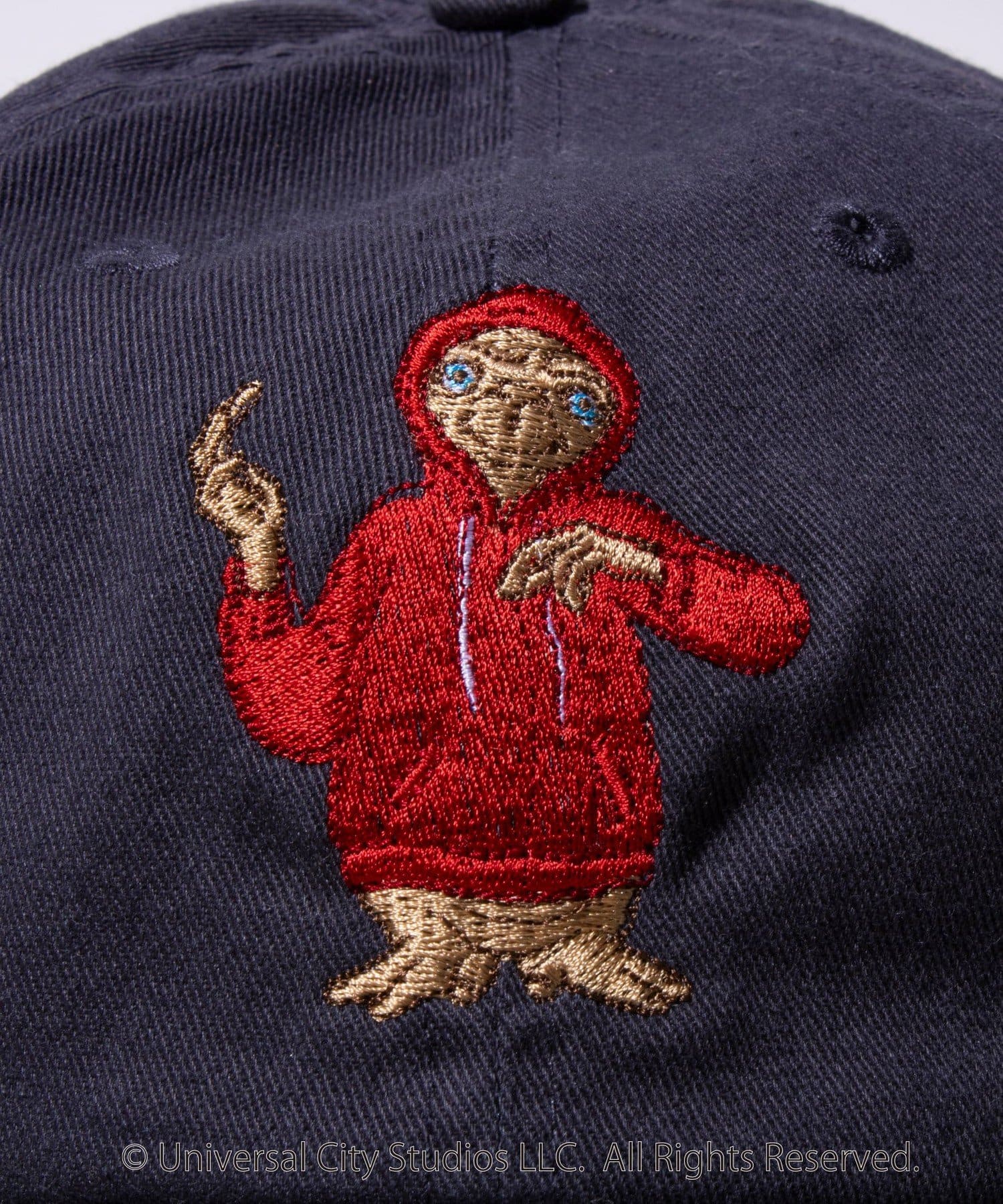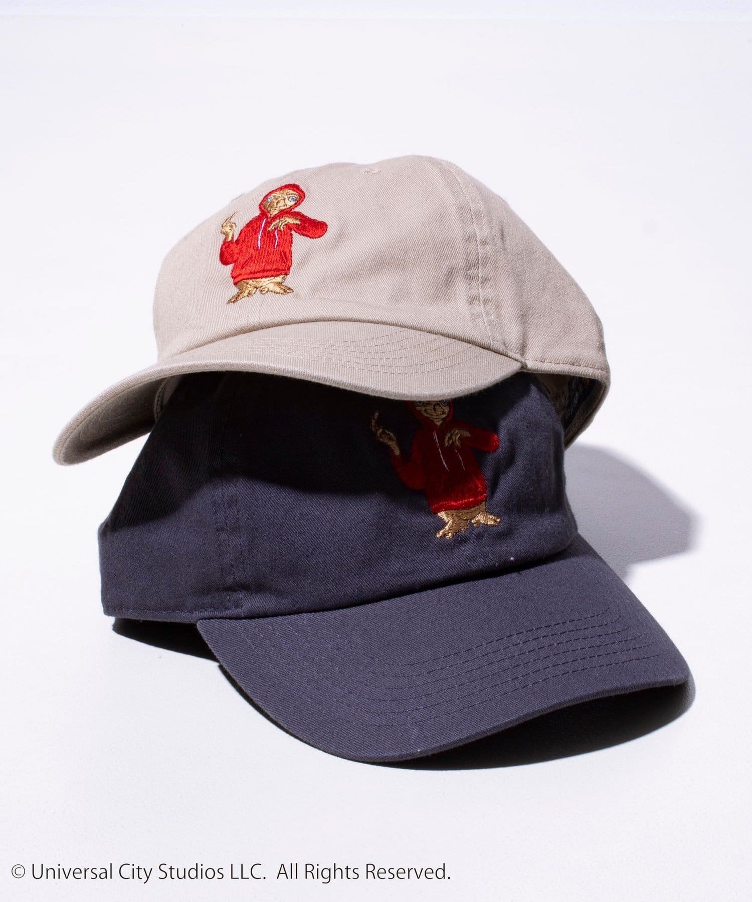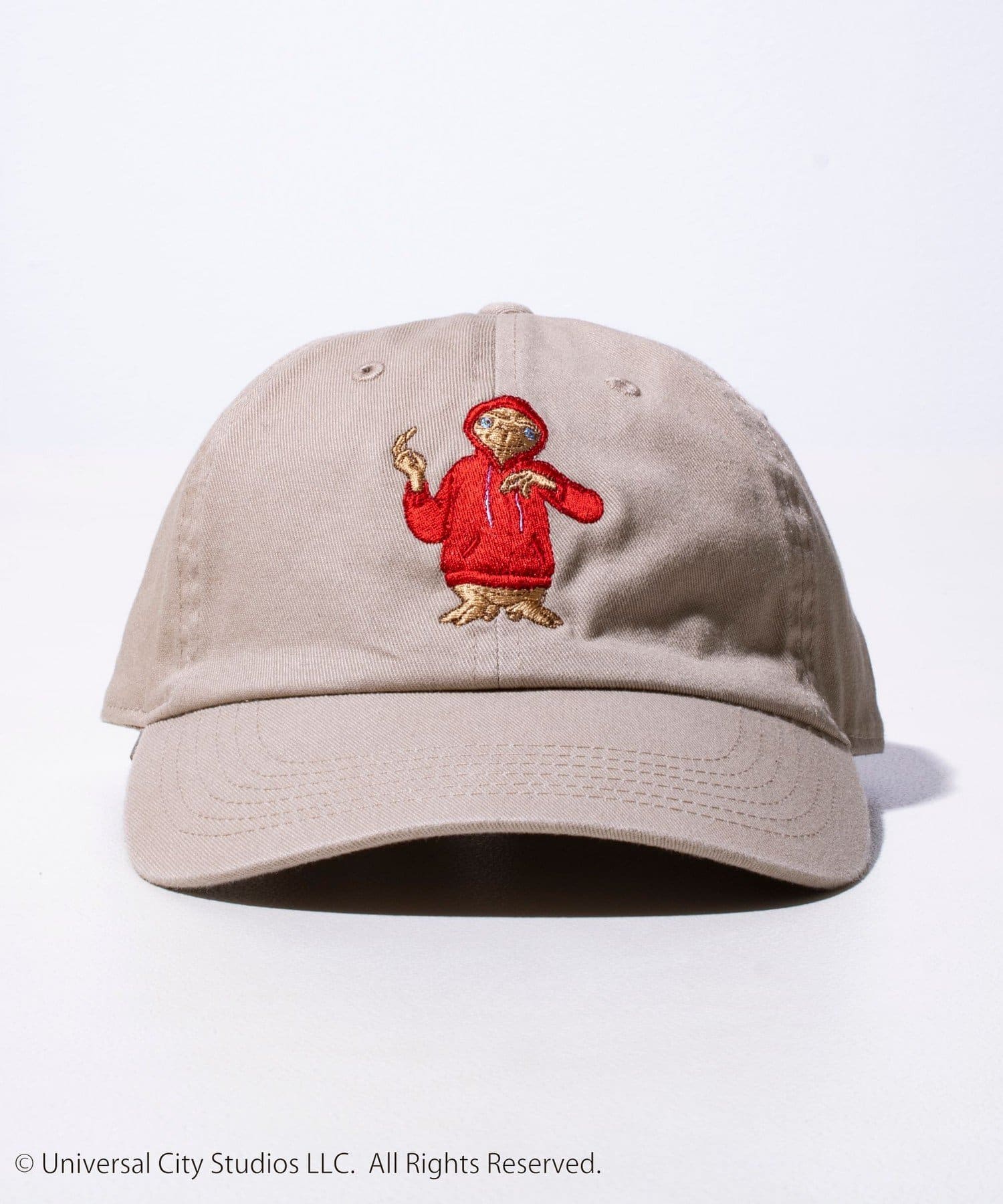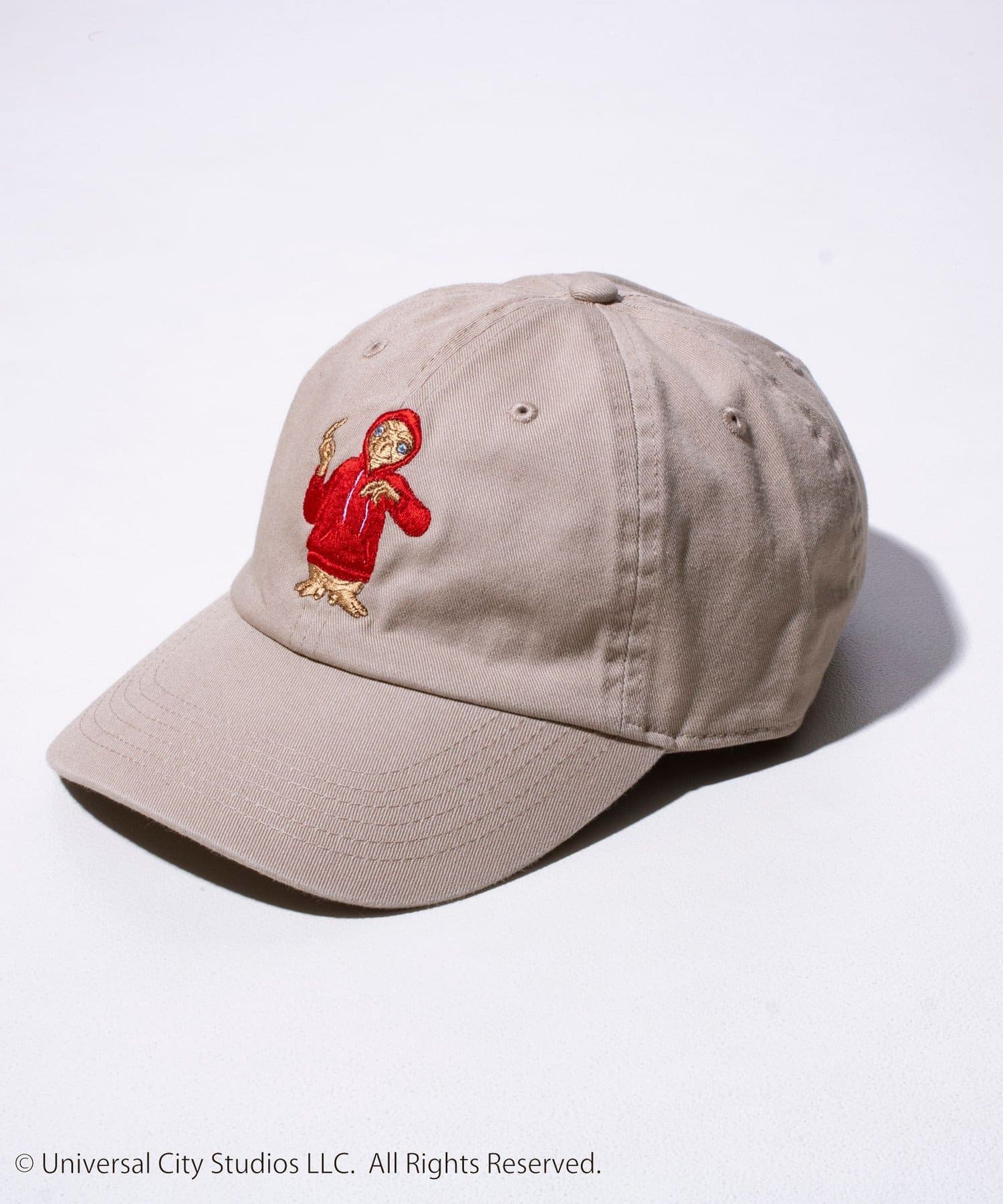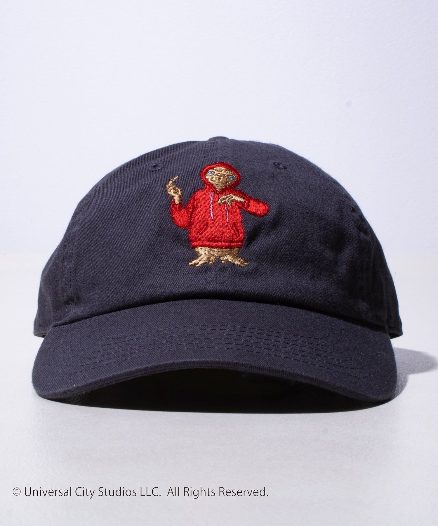 パーカーを着ているE.T.の刺繍を施したシンプルで合わせやすいキャップ。