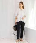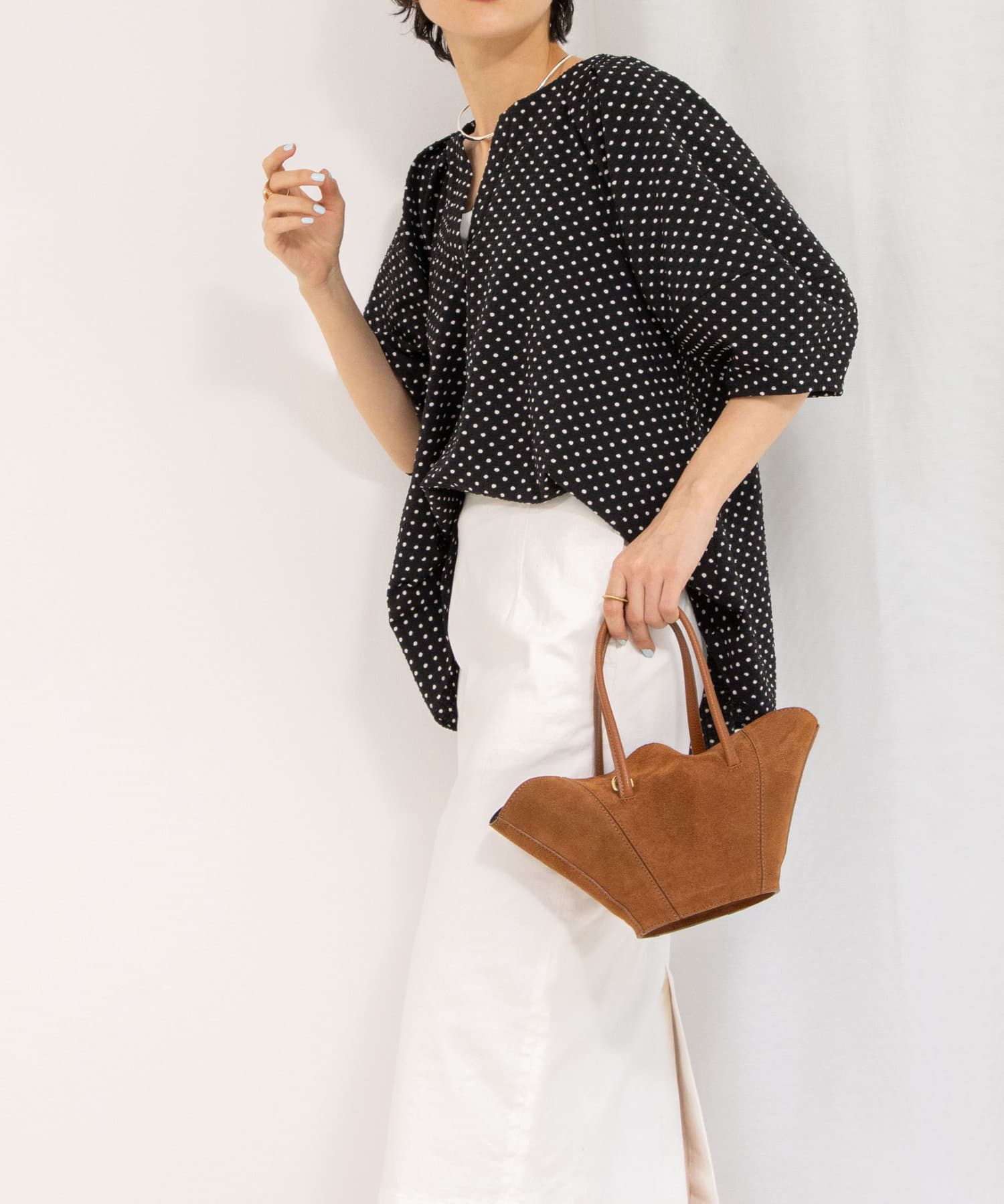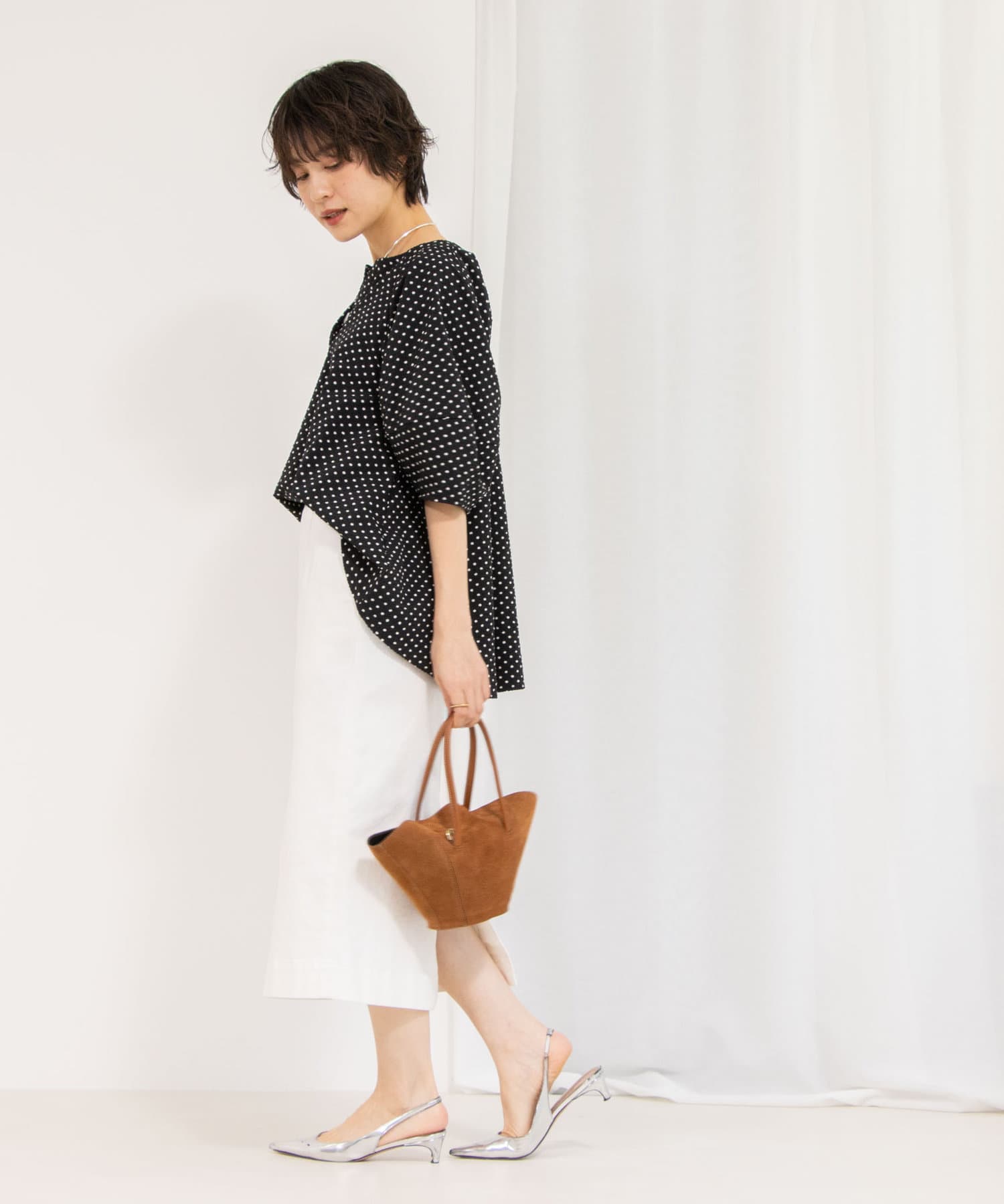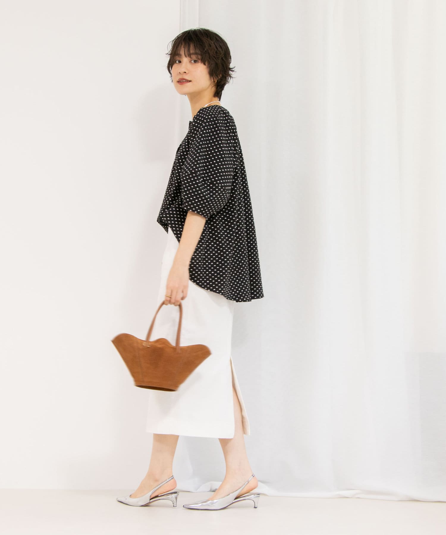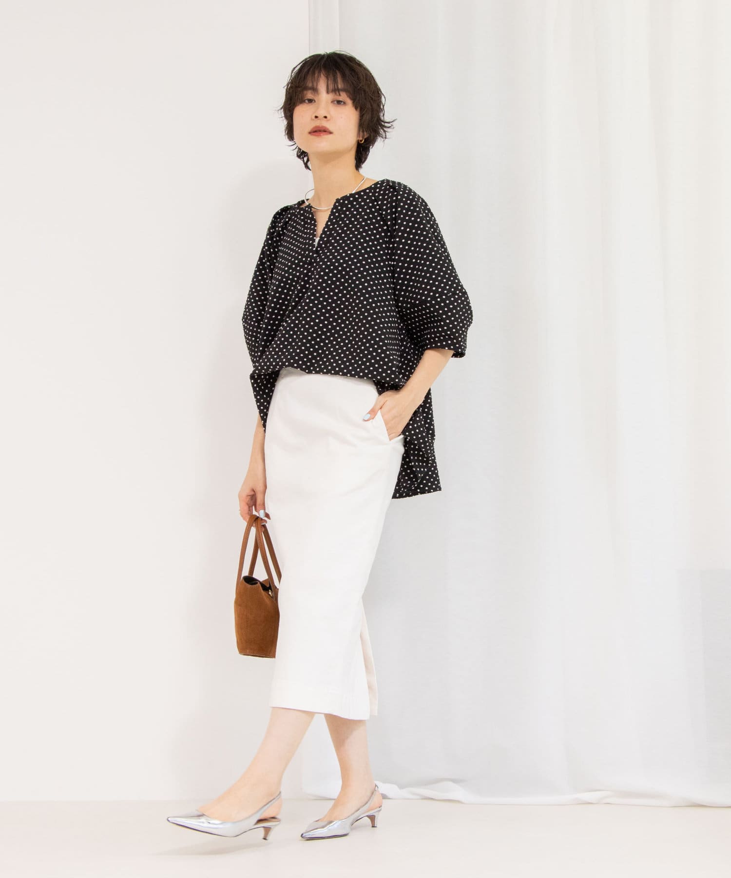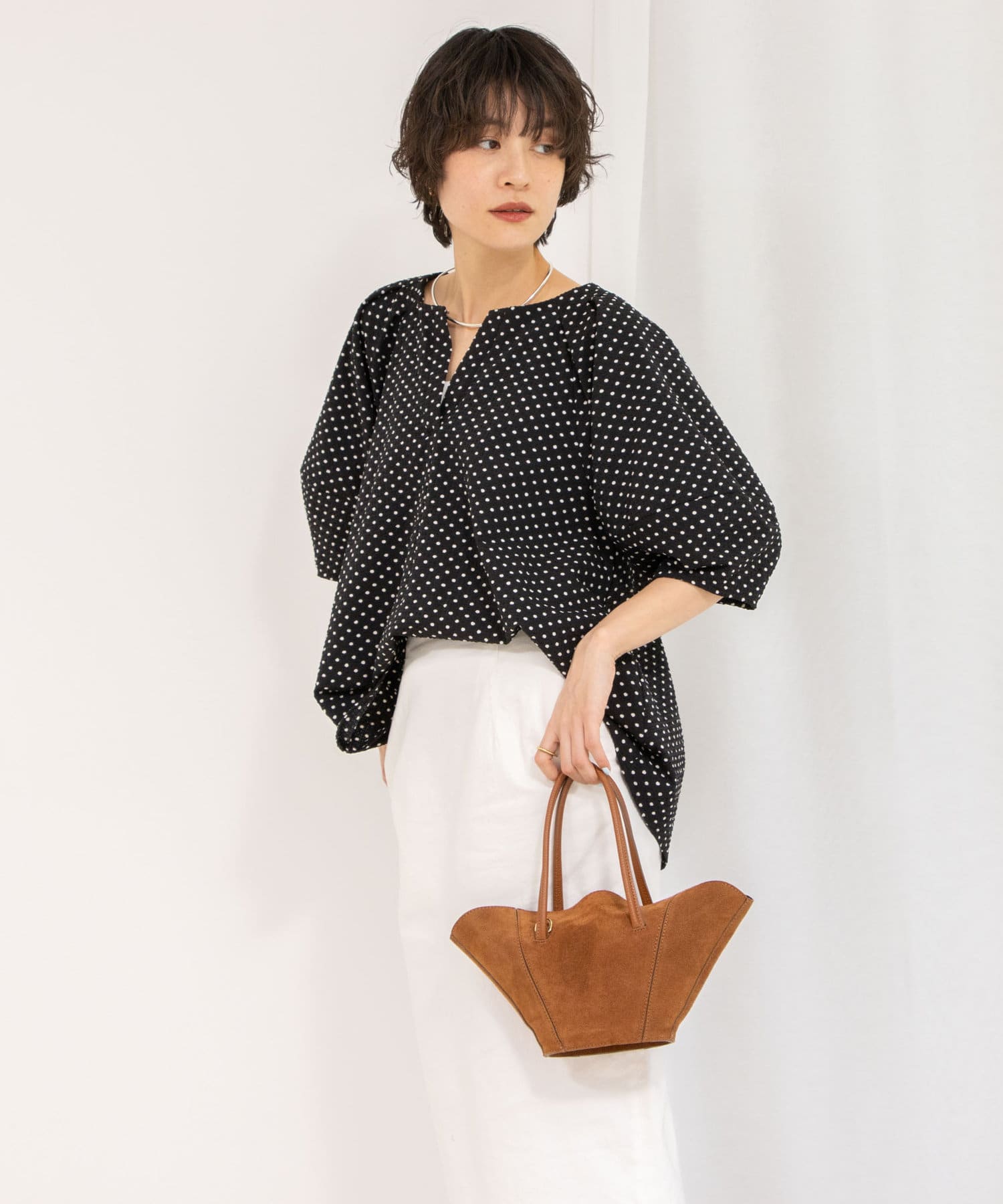 ・ふくらみのある5分袖がポイントで、長い期間着用できる1枚