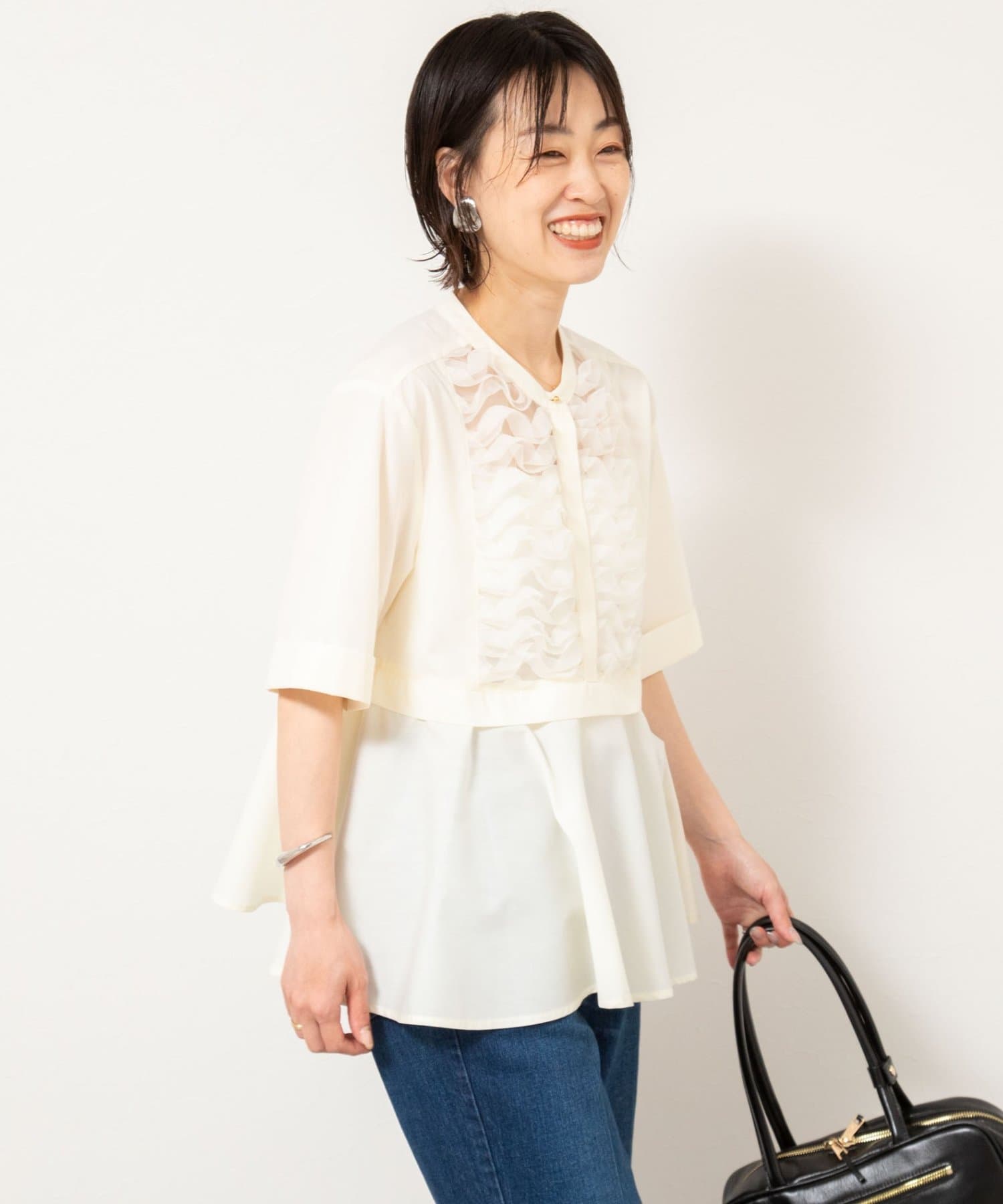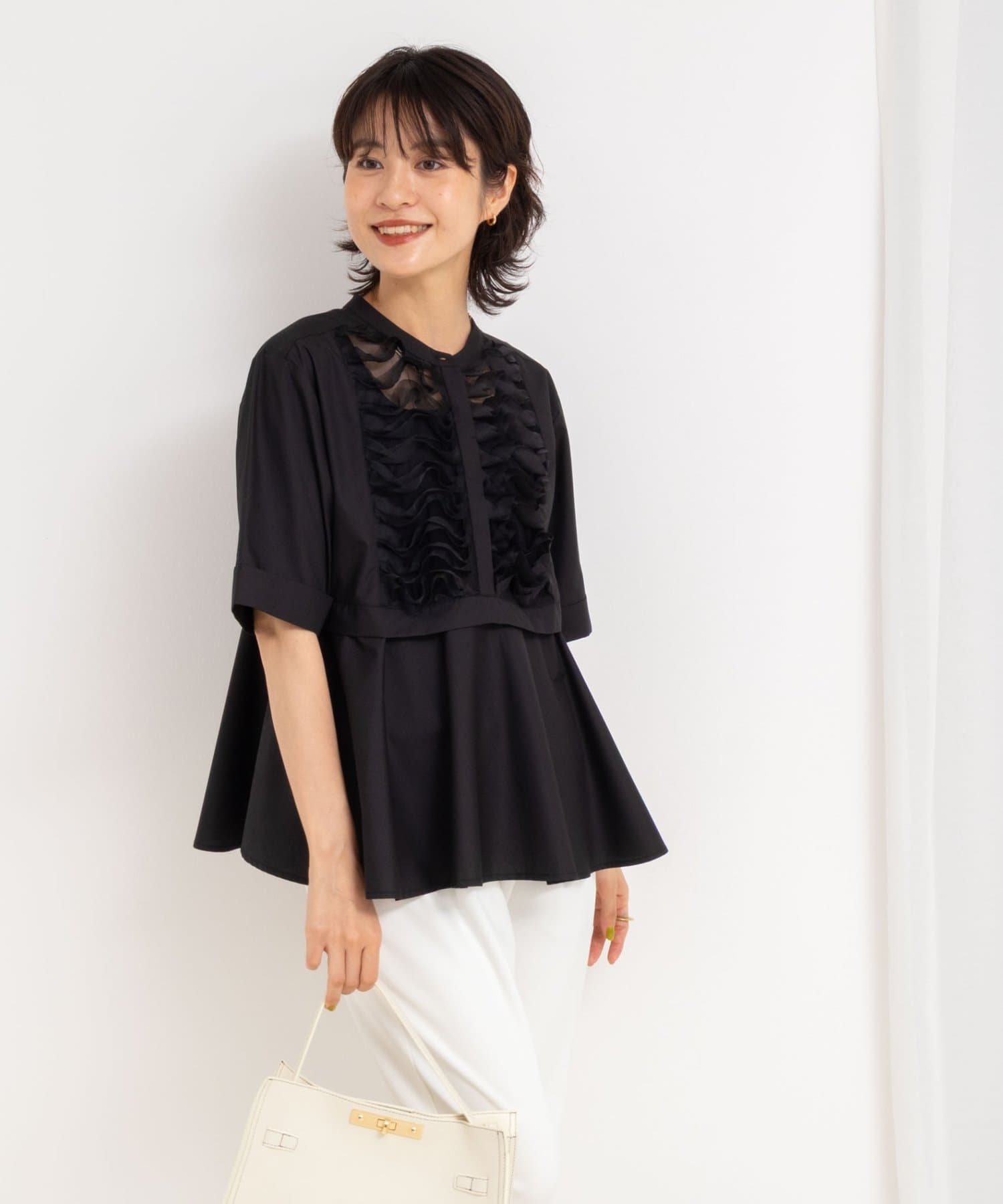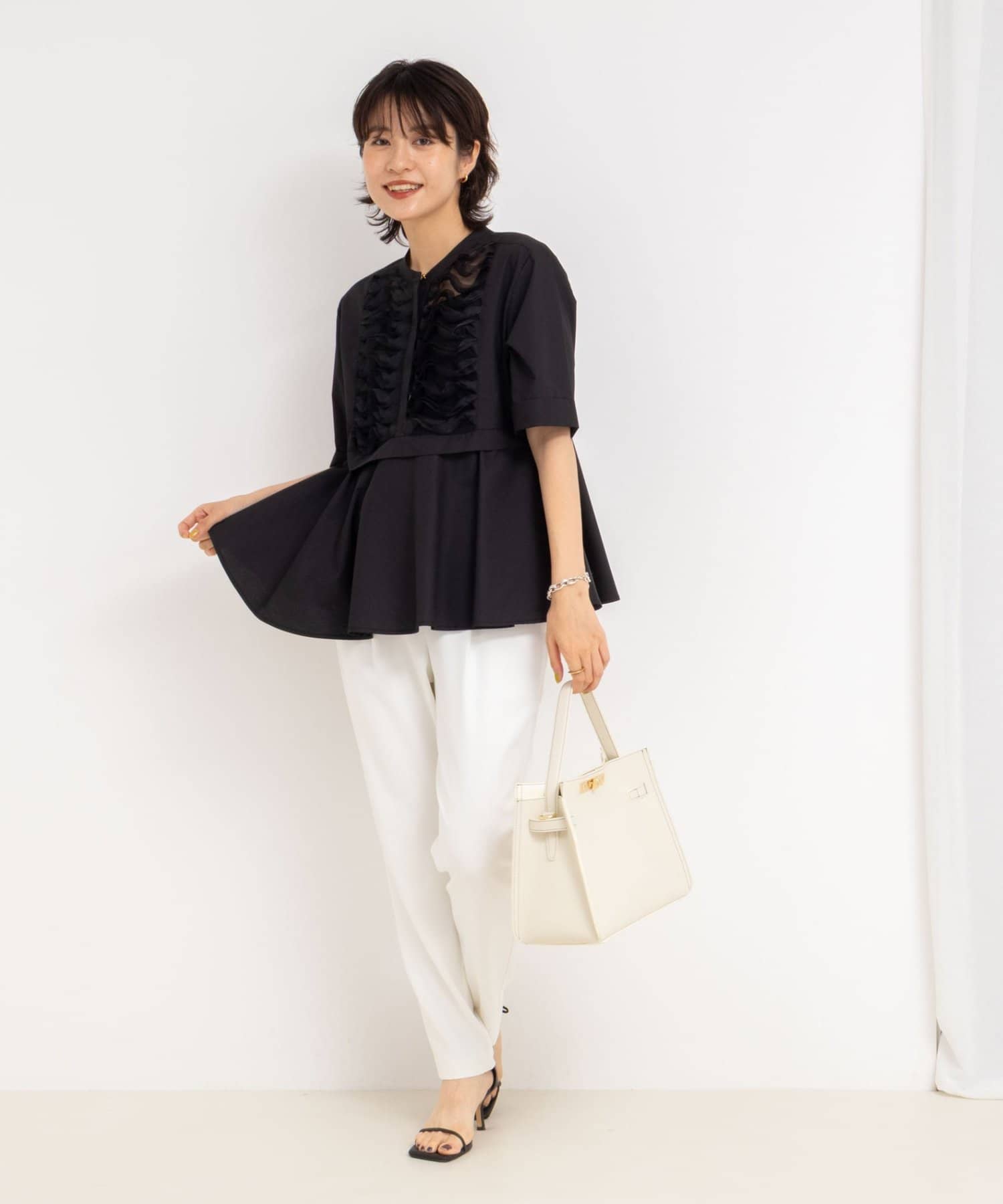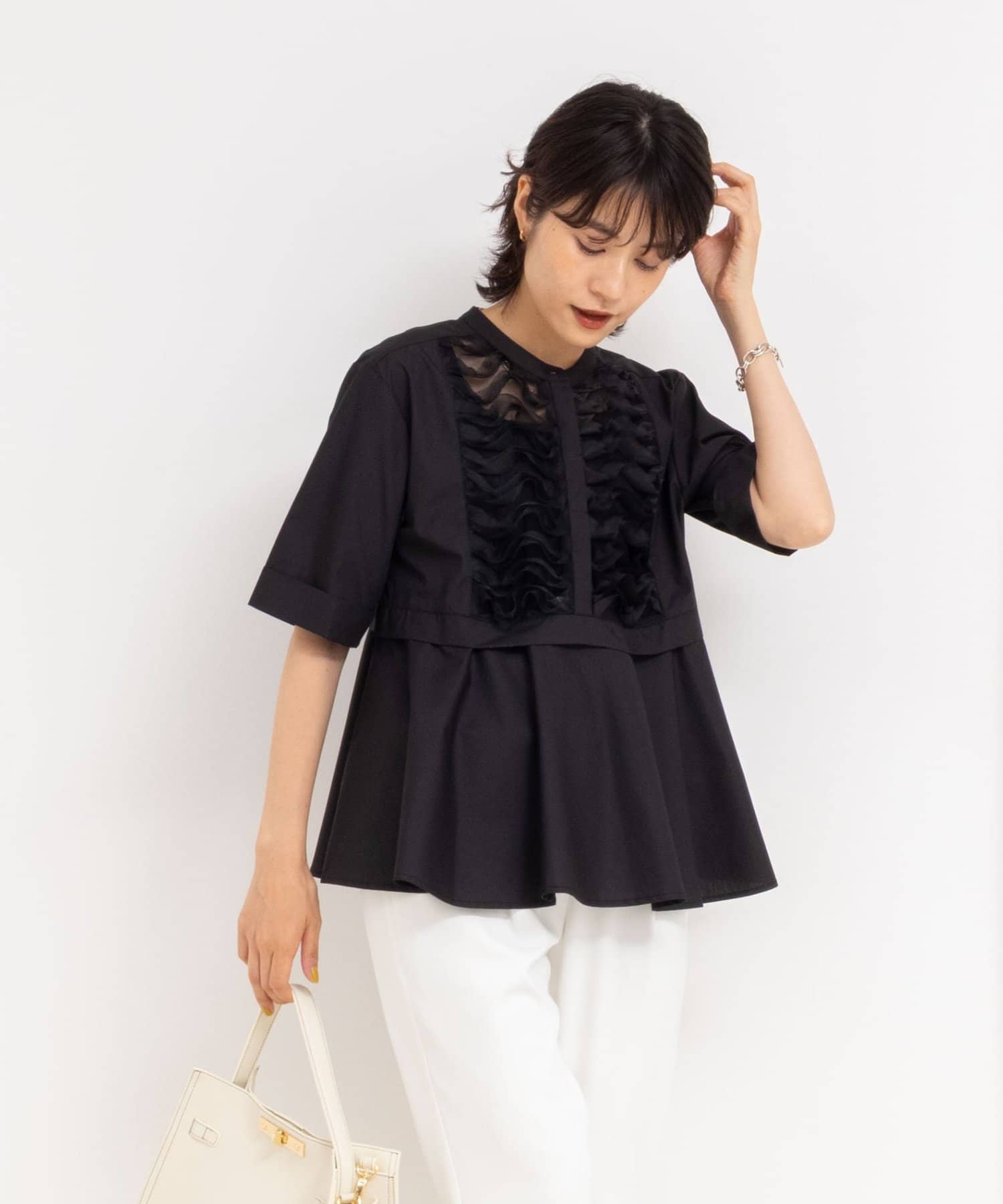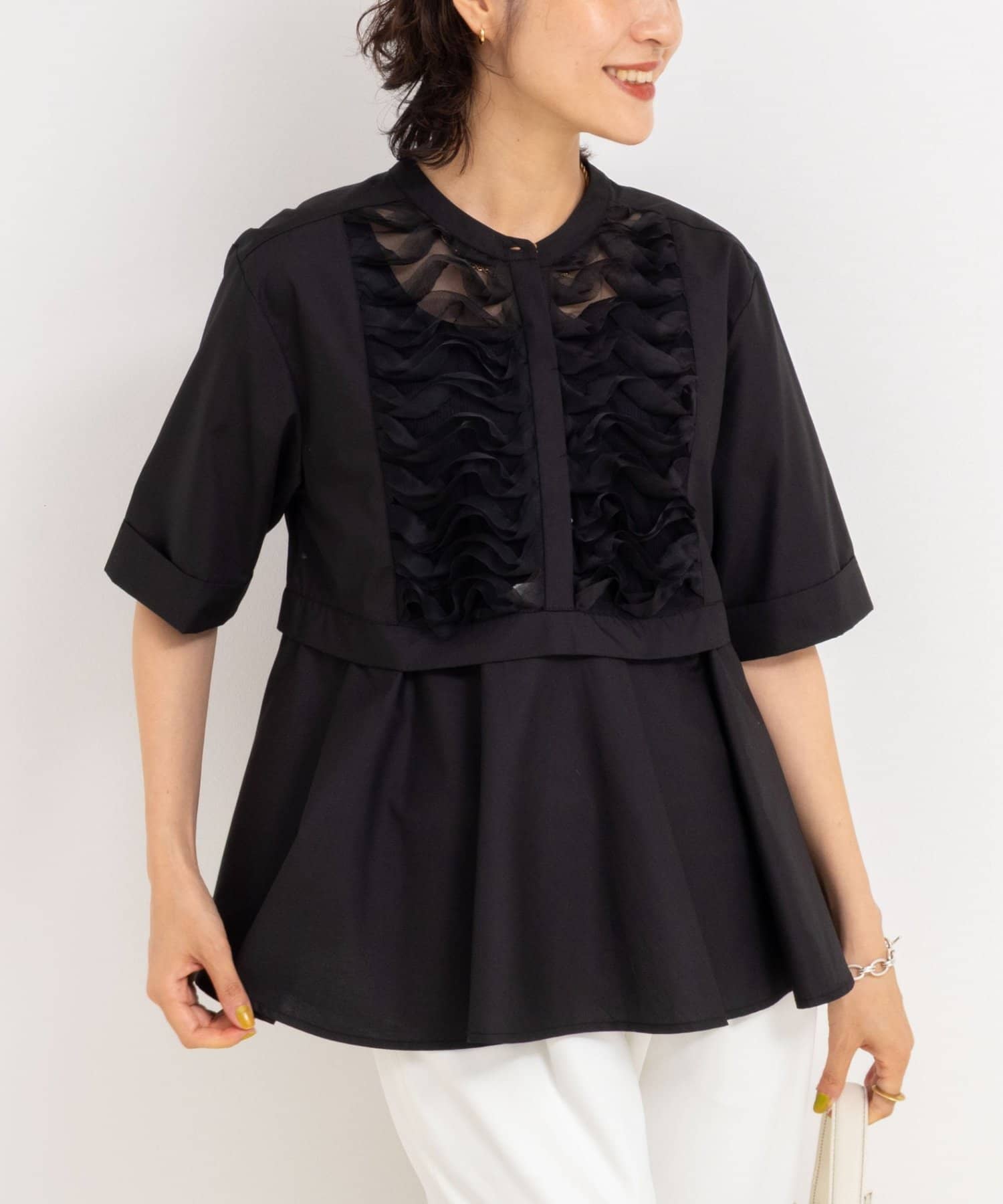 ・フロントのチュールフリルがポイントのペプラムブラウス