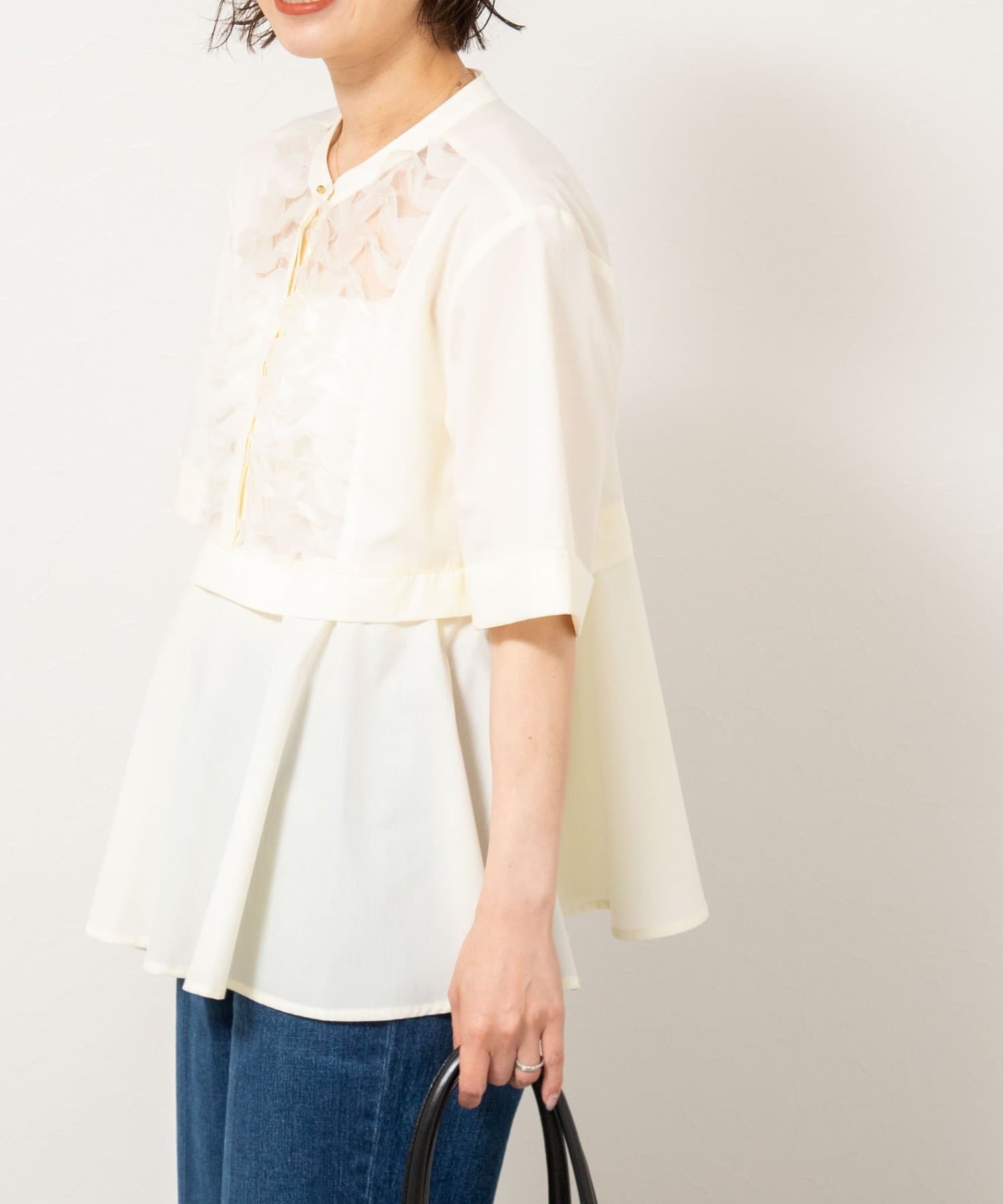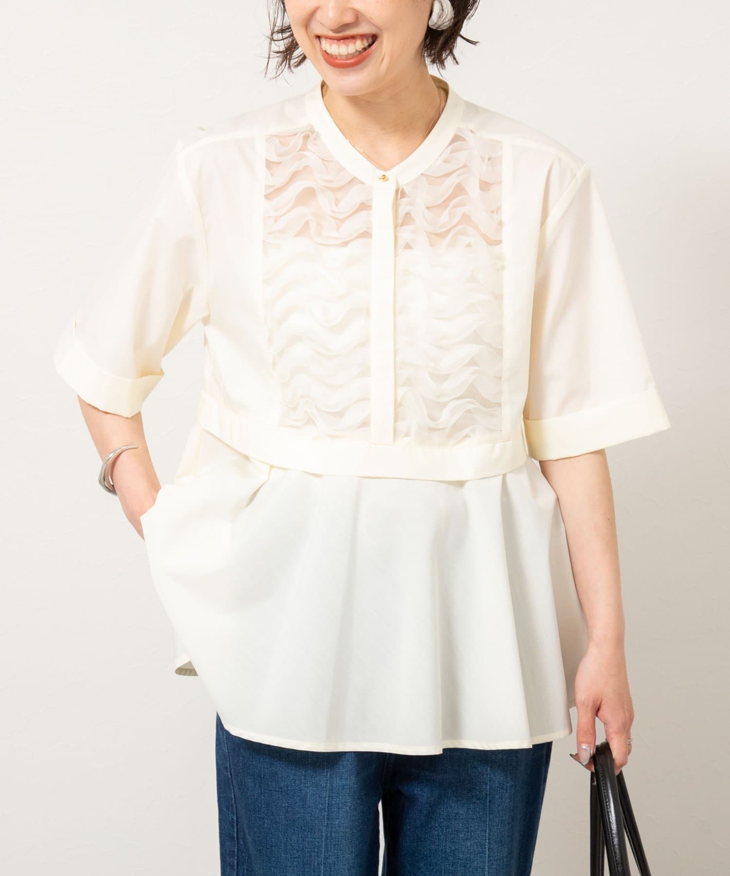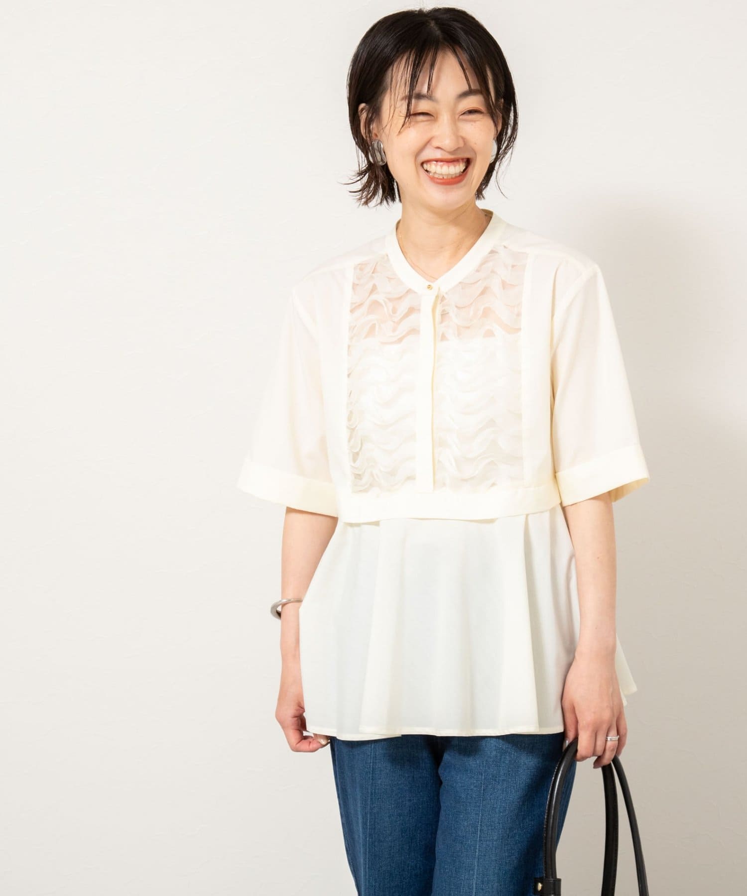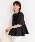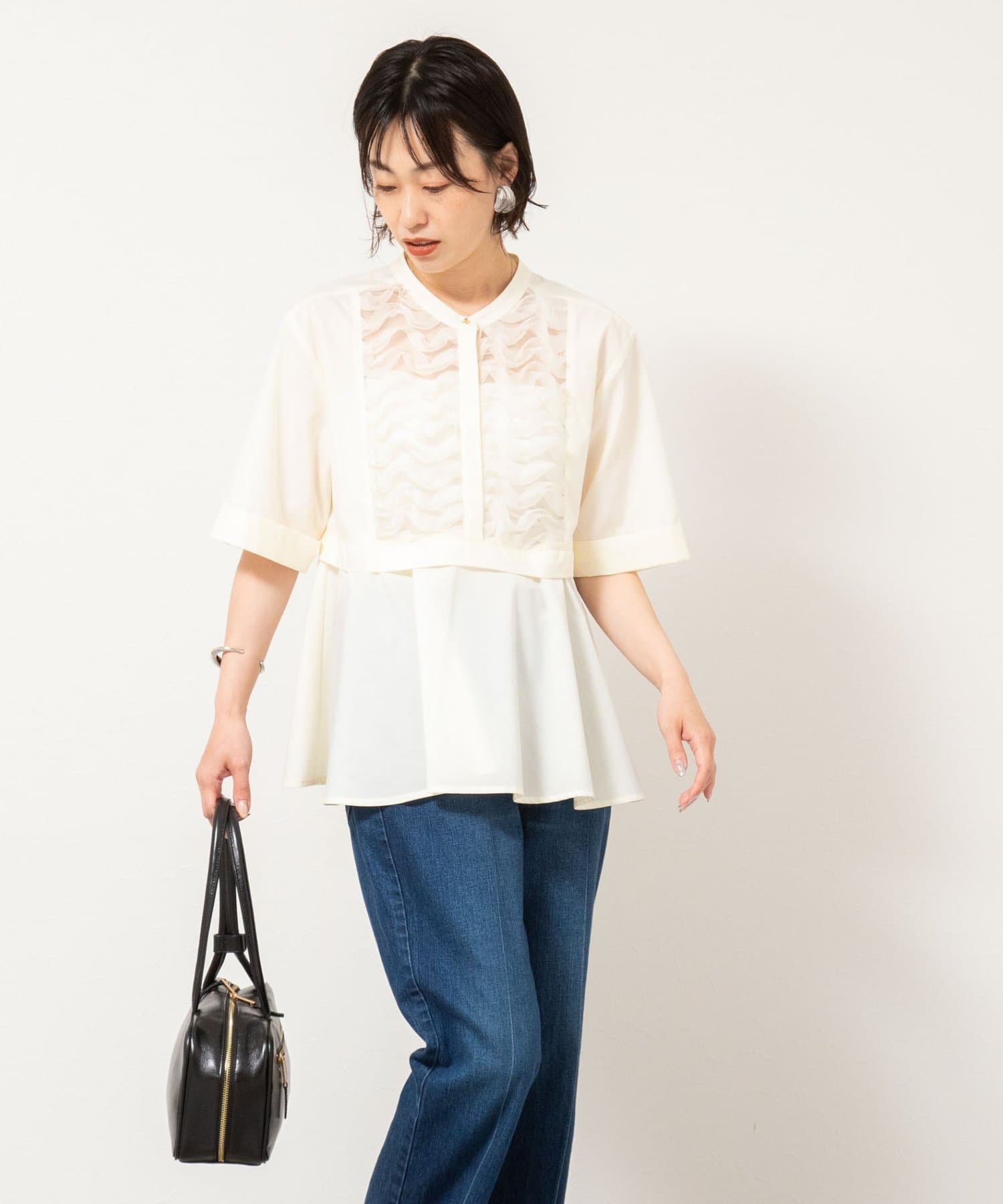 ・フロントのチュールフリルがポイントのペプラムブラウス