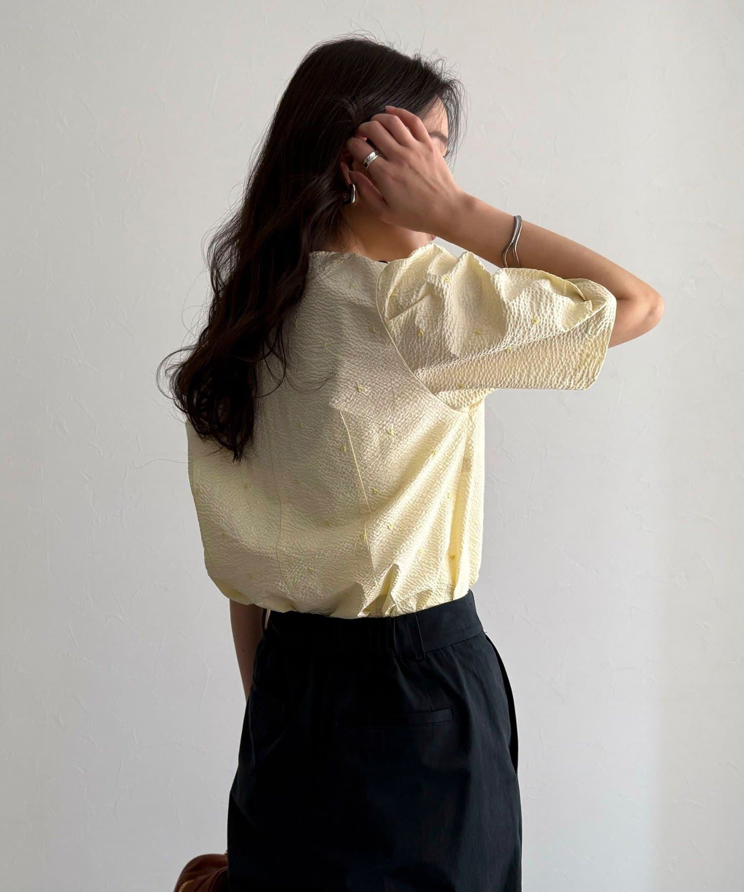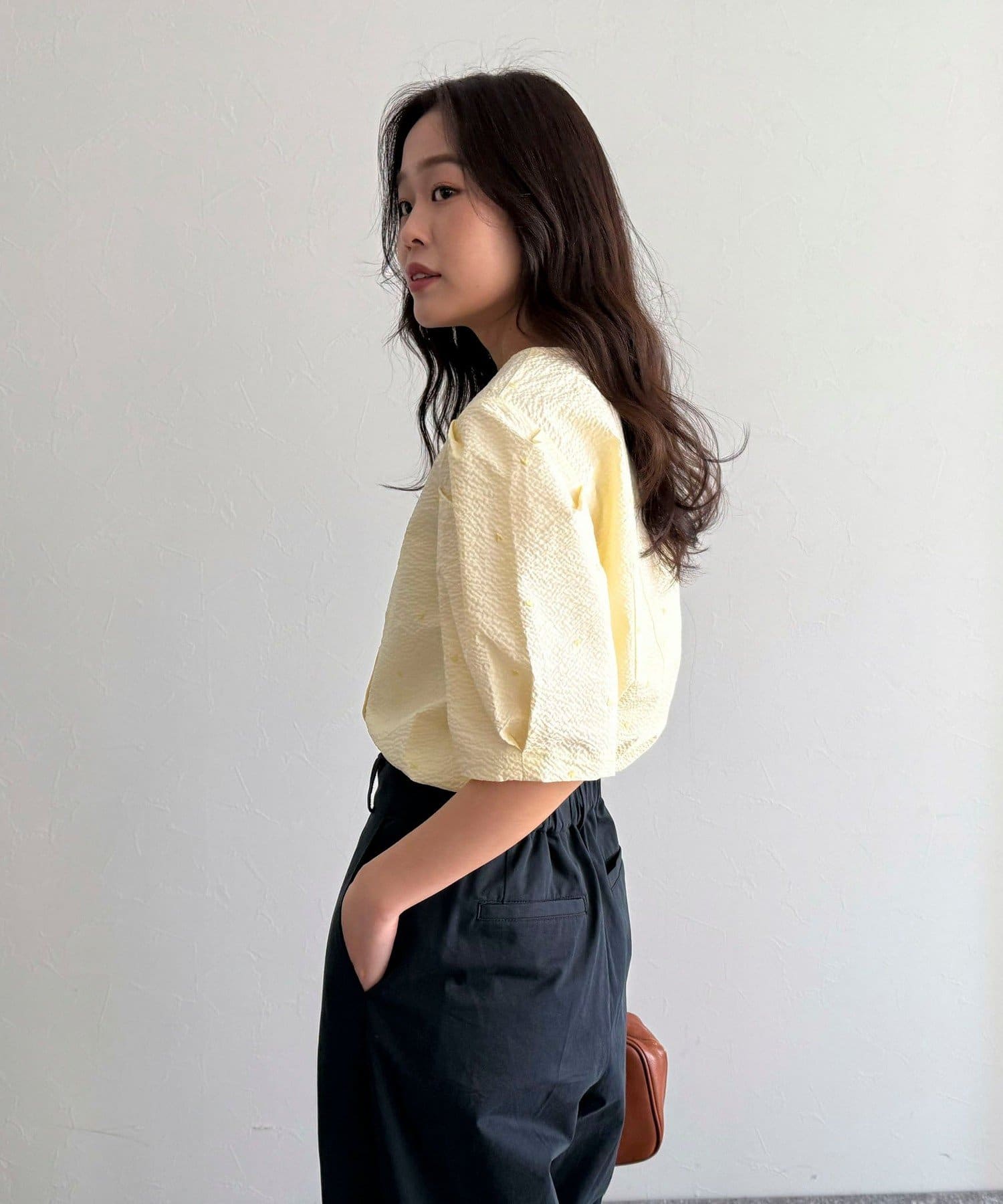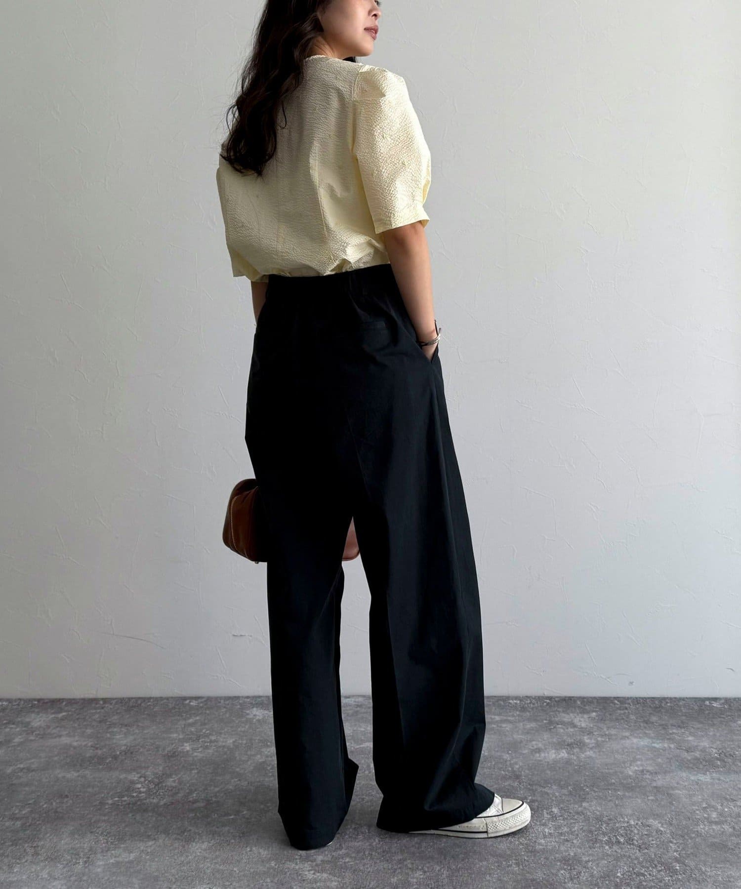 *この製品は、生地の特性上引っかかると糸が飛び出しやすい傾向があります。着用時にはベルトやバック、周囲の壁など表面の粗いものとの摩擦や引っかかりにご注意ください。