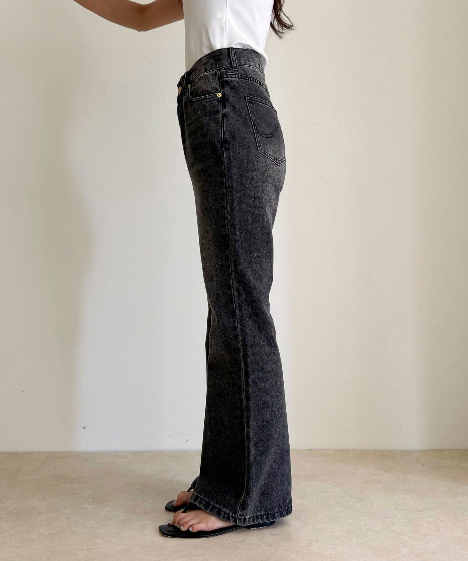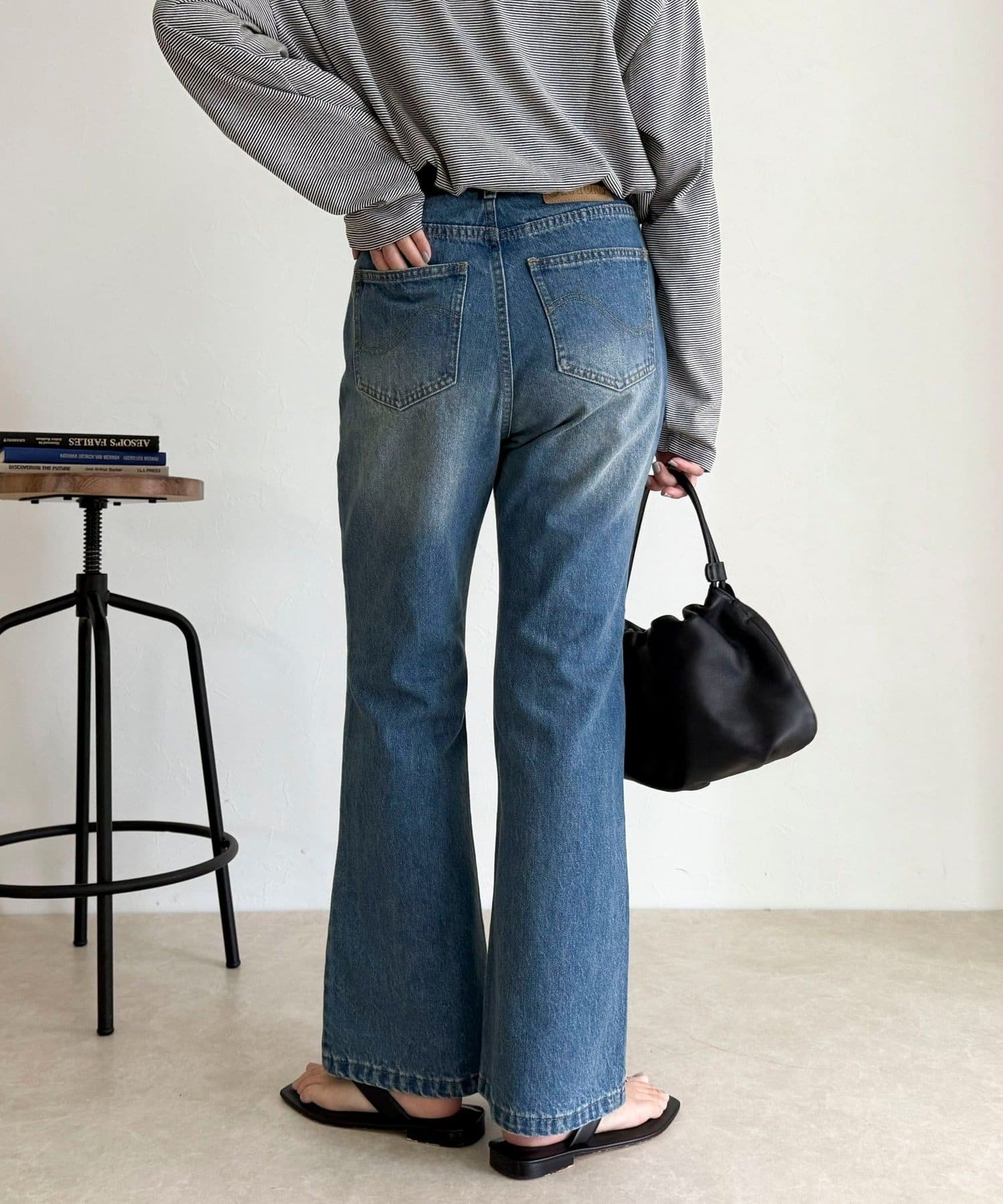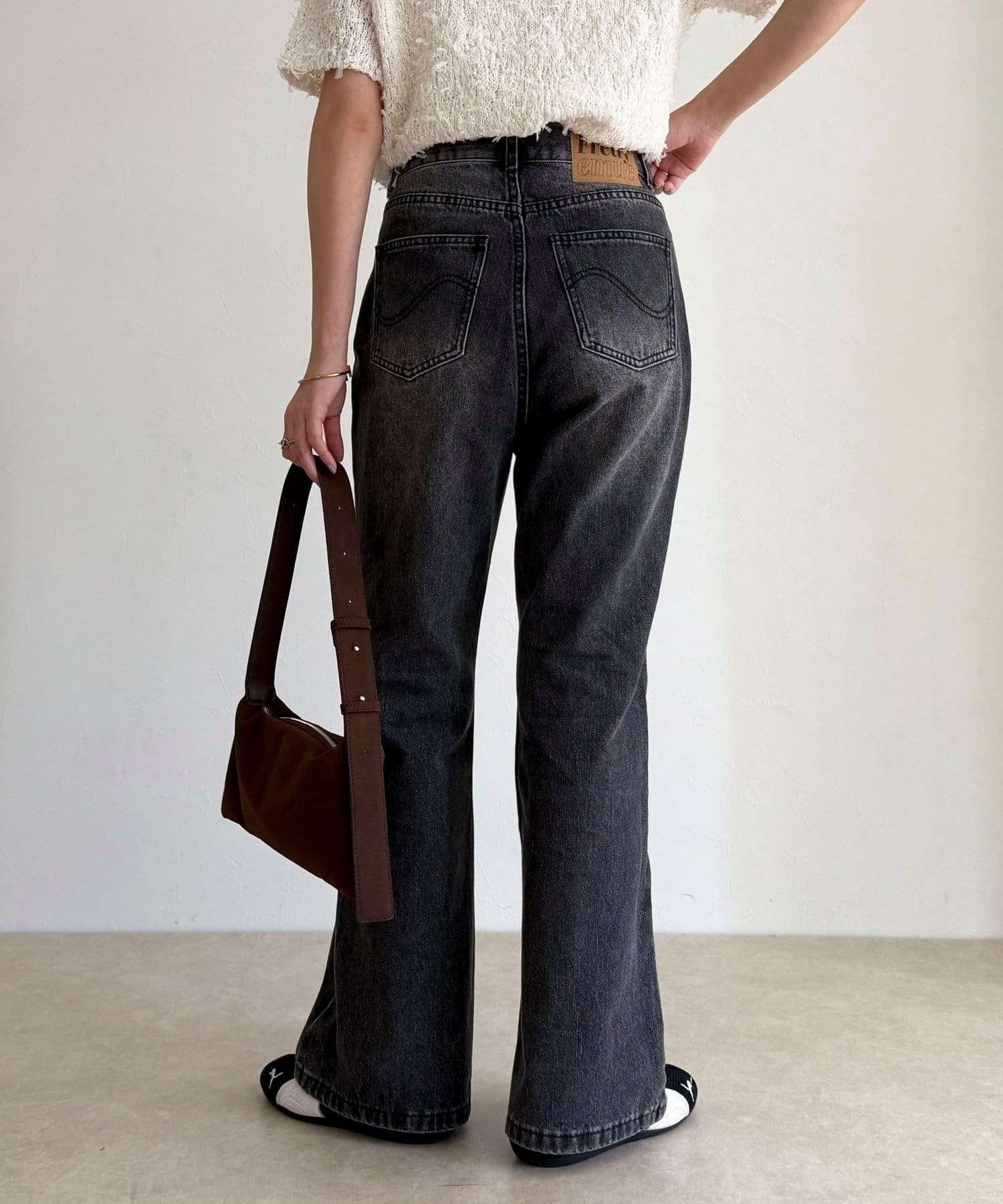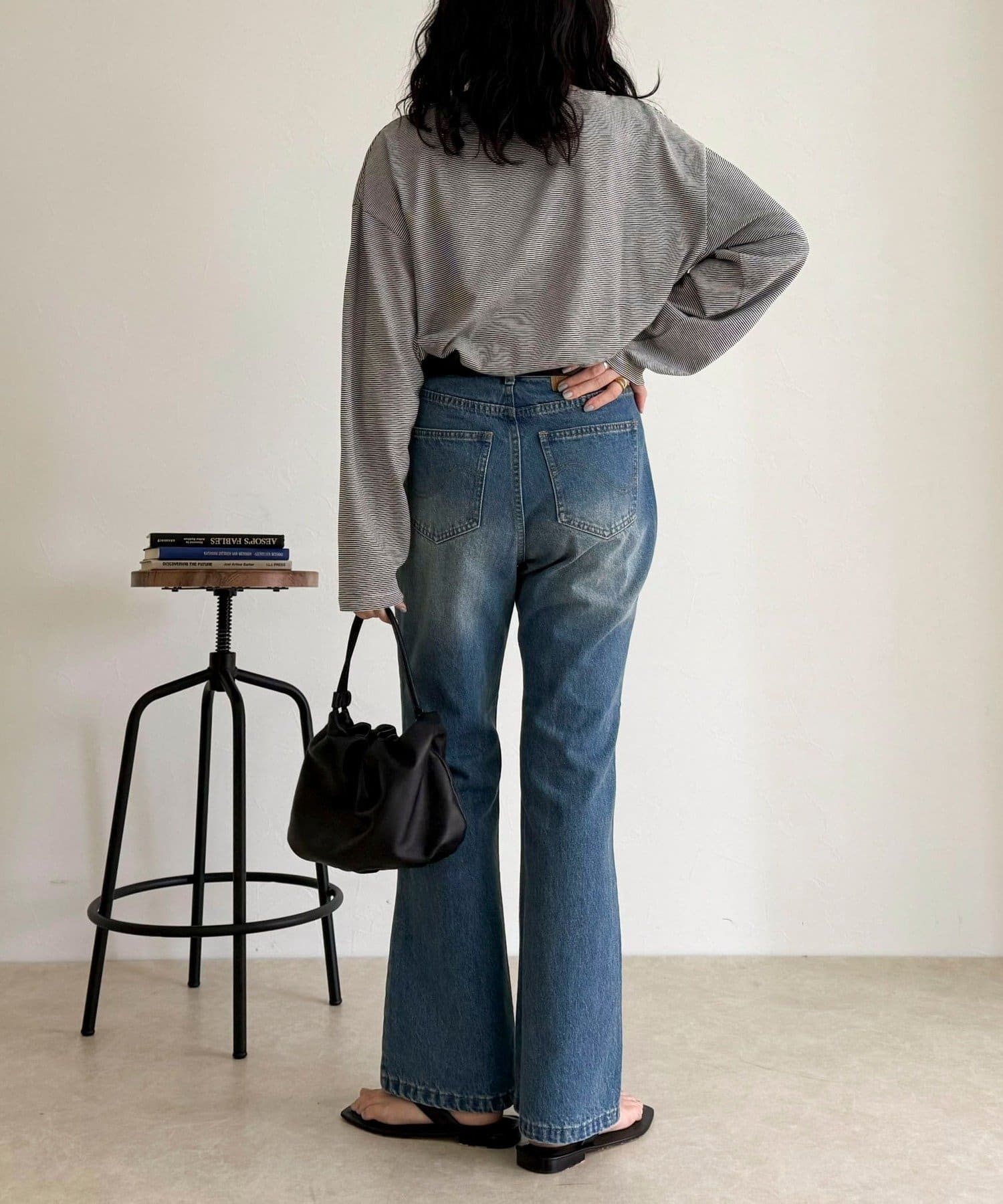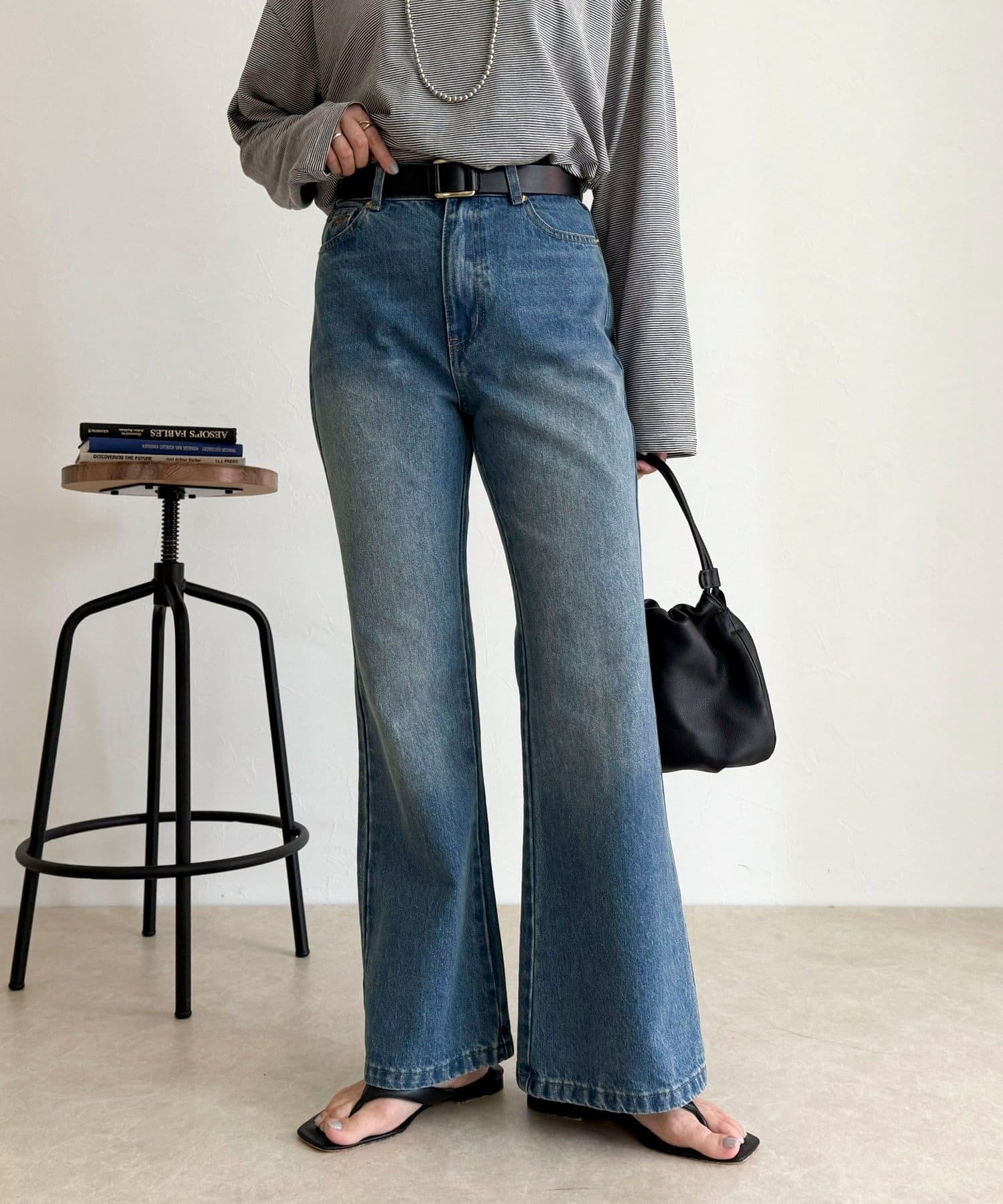 ・腰回りから裾に向かって広がるすっきりとしたフレアシルエットが、脚を長く美しく見せてくれるフレアデニム