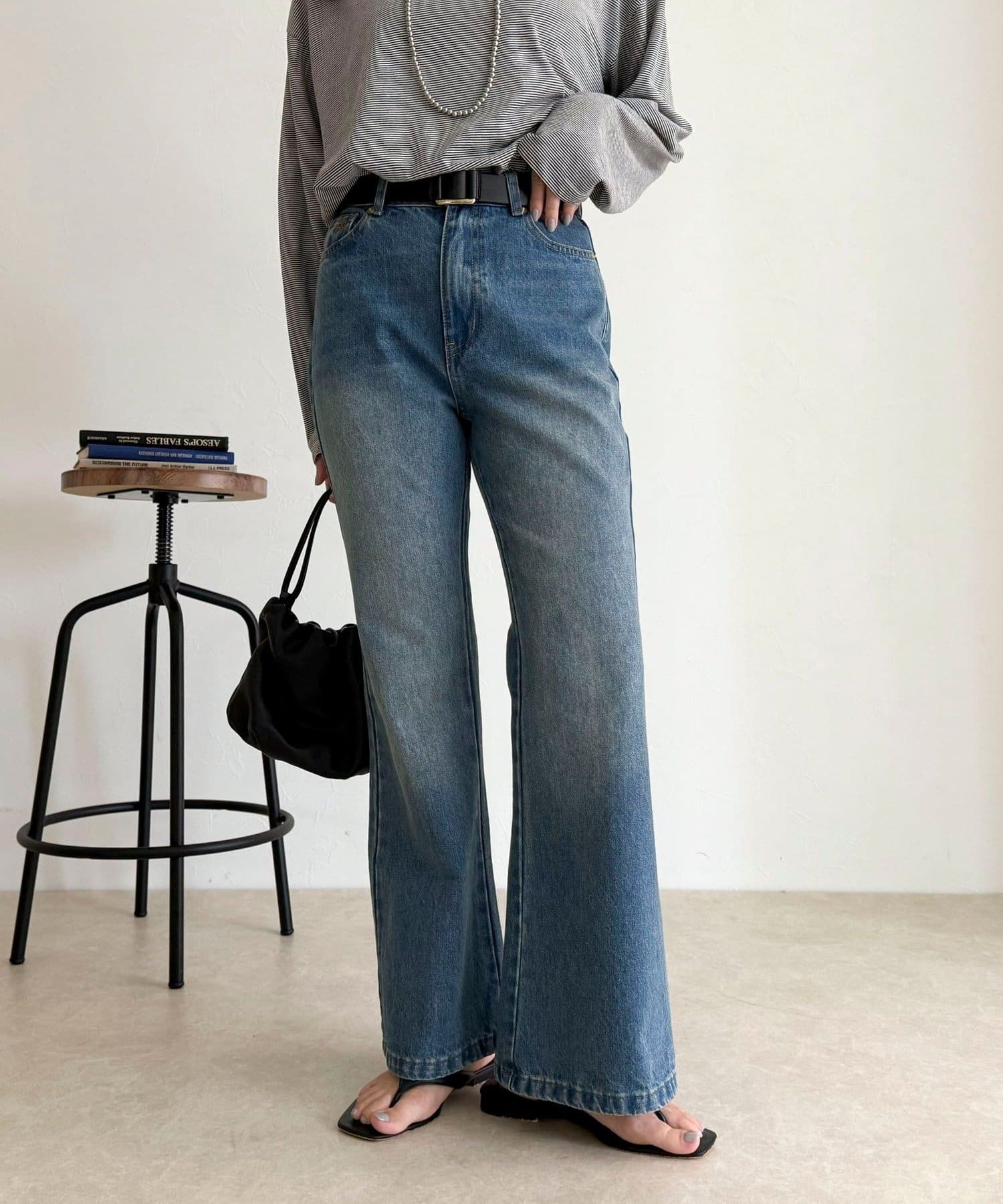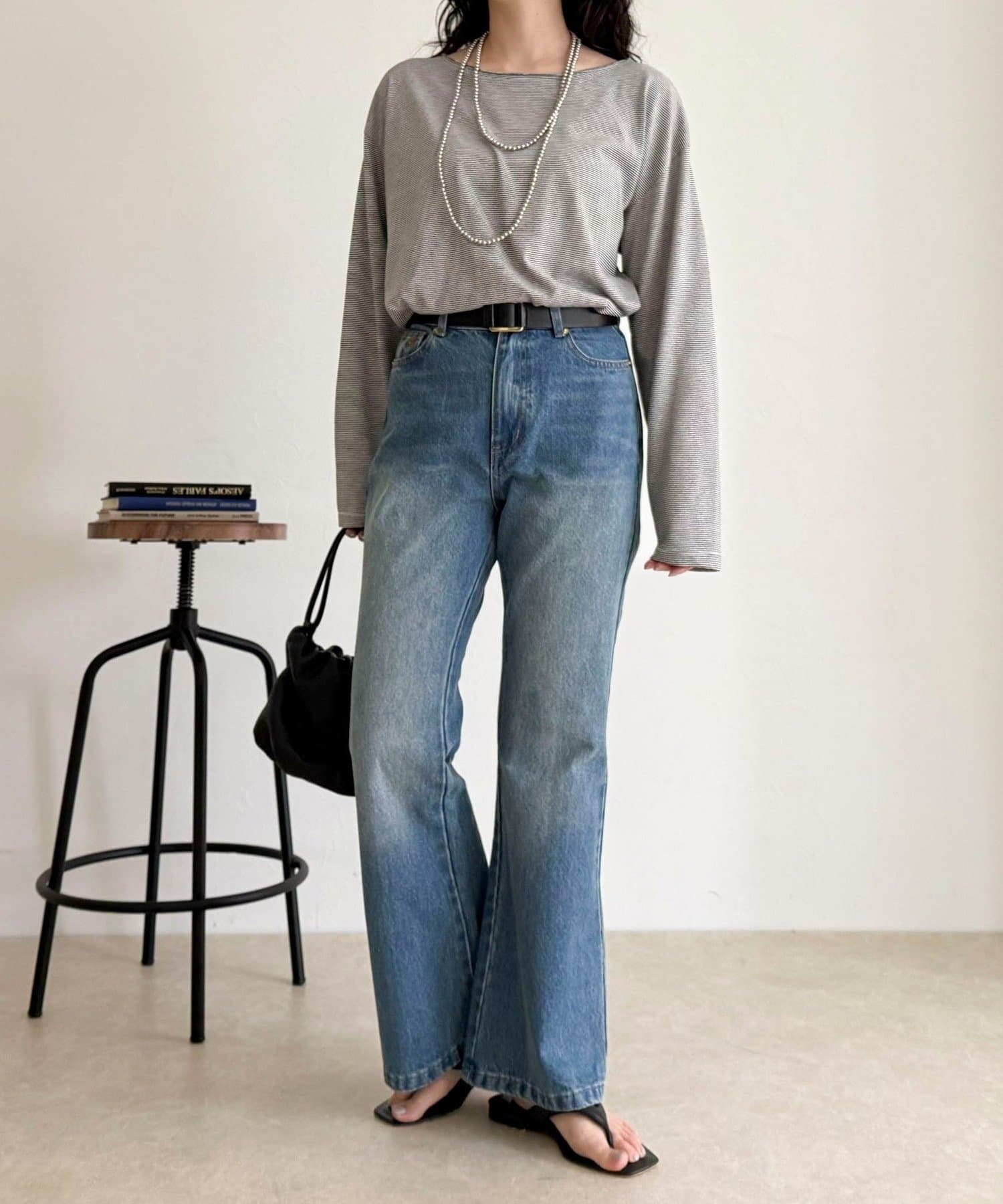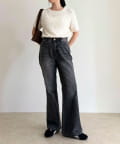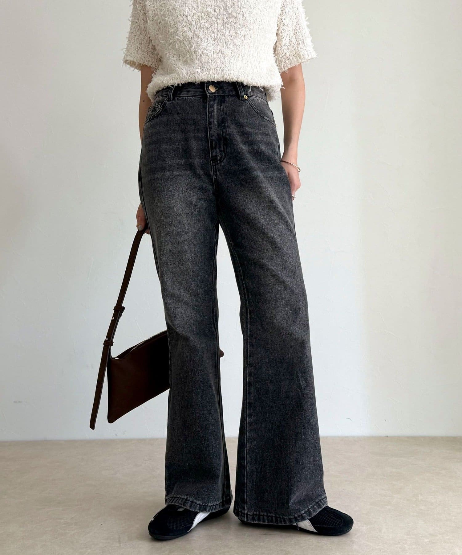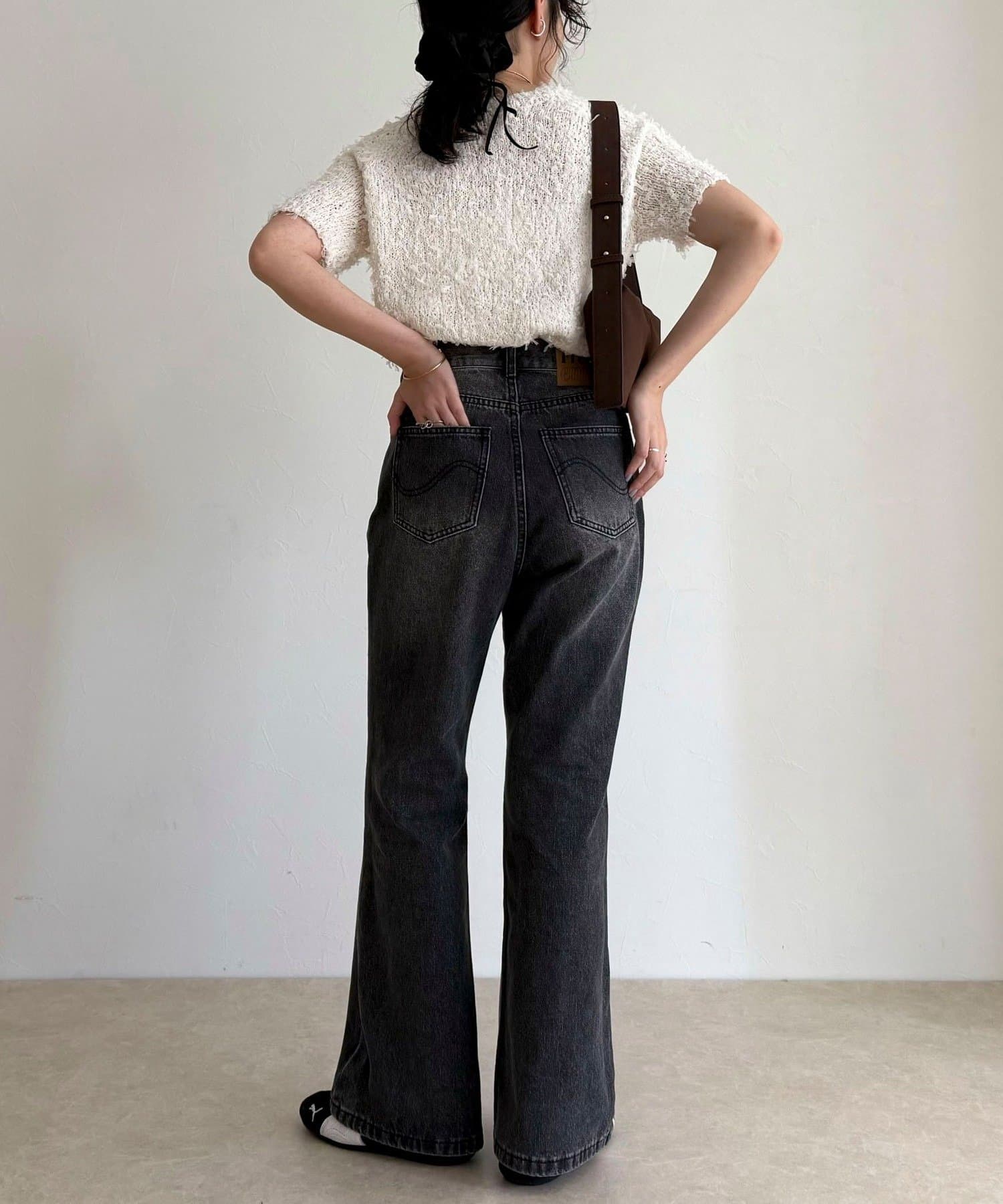 ・腰回りから裾に向かって広がるすっきりとしたフレアシルエットが、脚を長く美しく見せてくれるフレアデニム