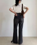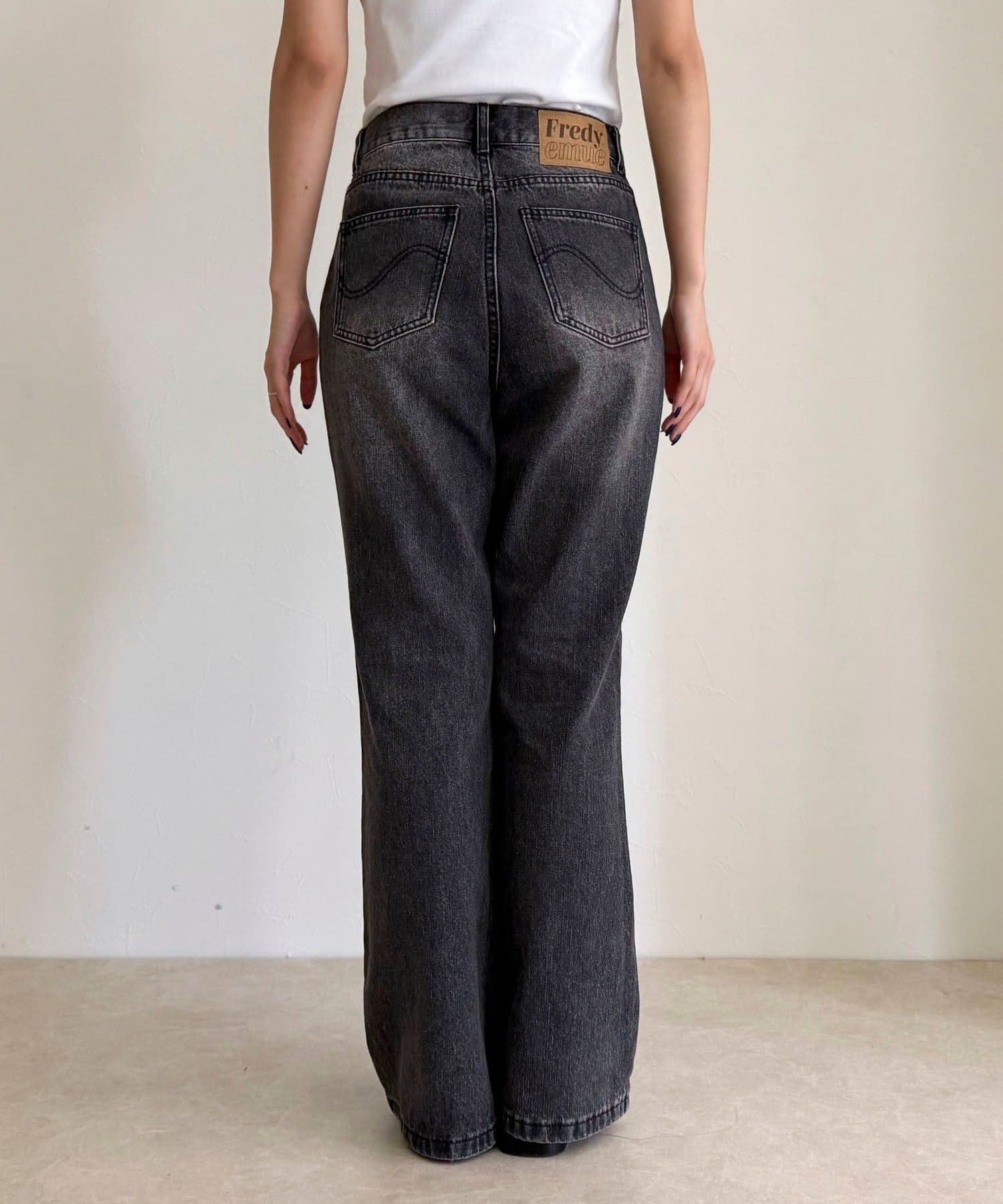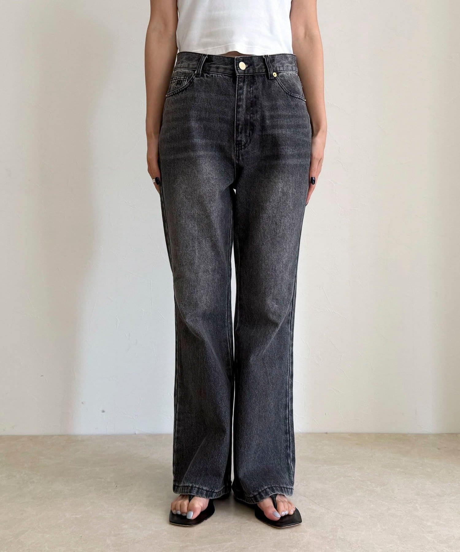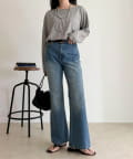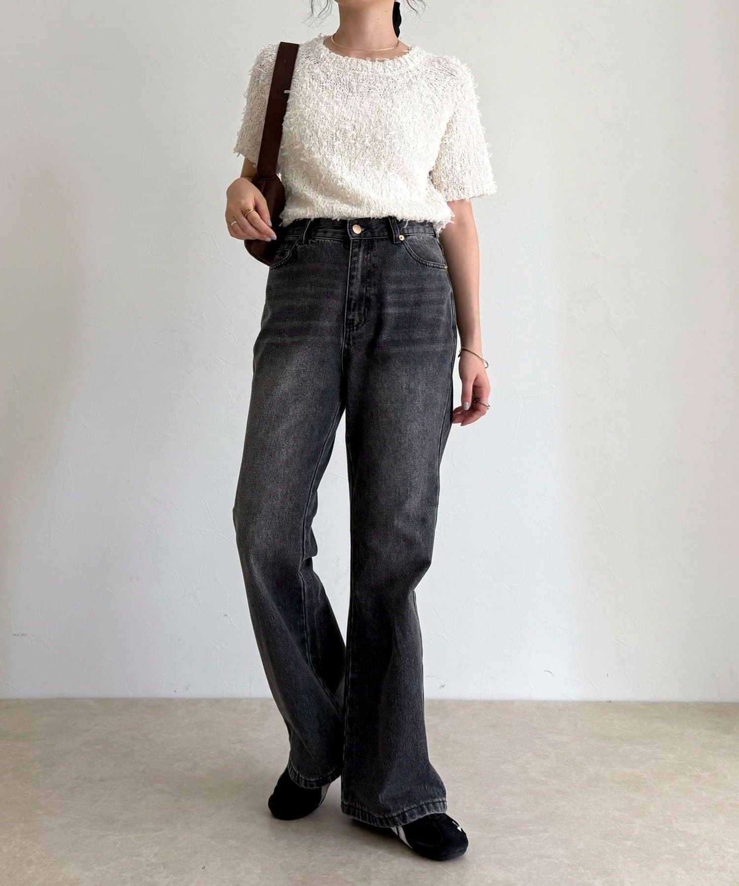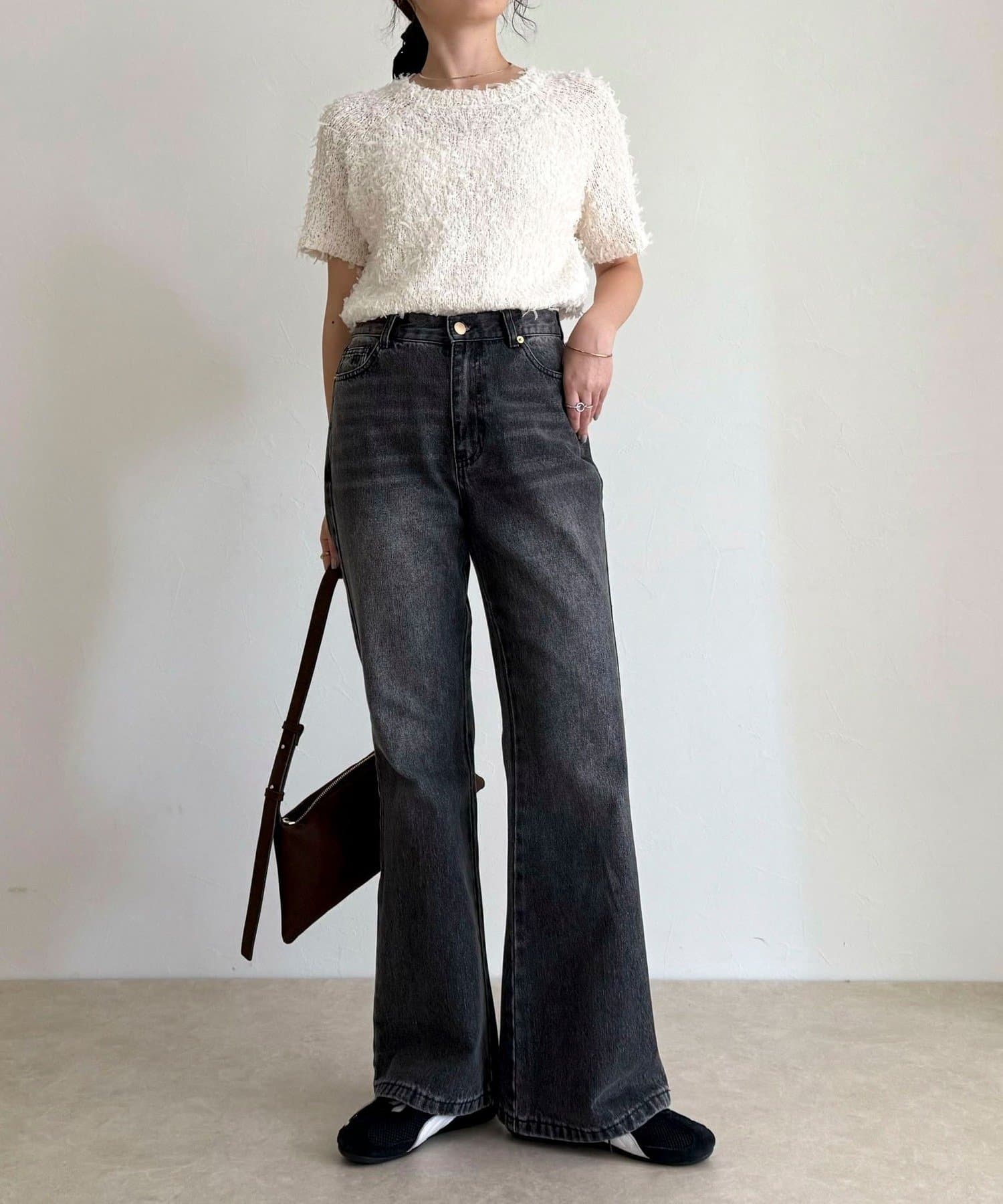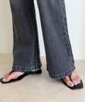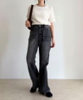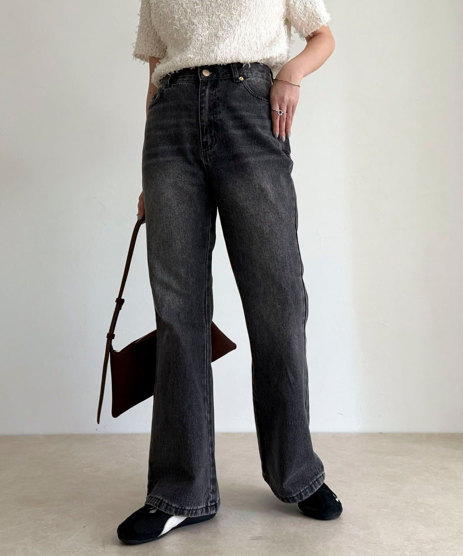 ・腰回りから裾に向かって広がるすっきりとしたフレアシルエットが、脚を長く美しく見せてくれるフレアデニム