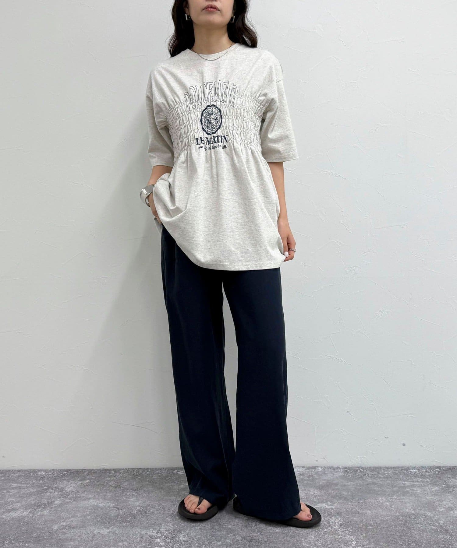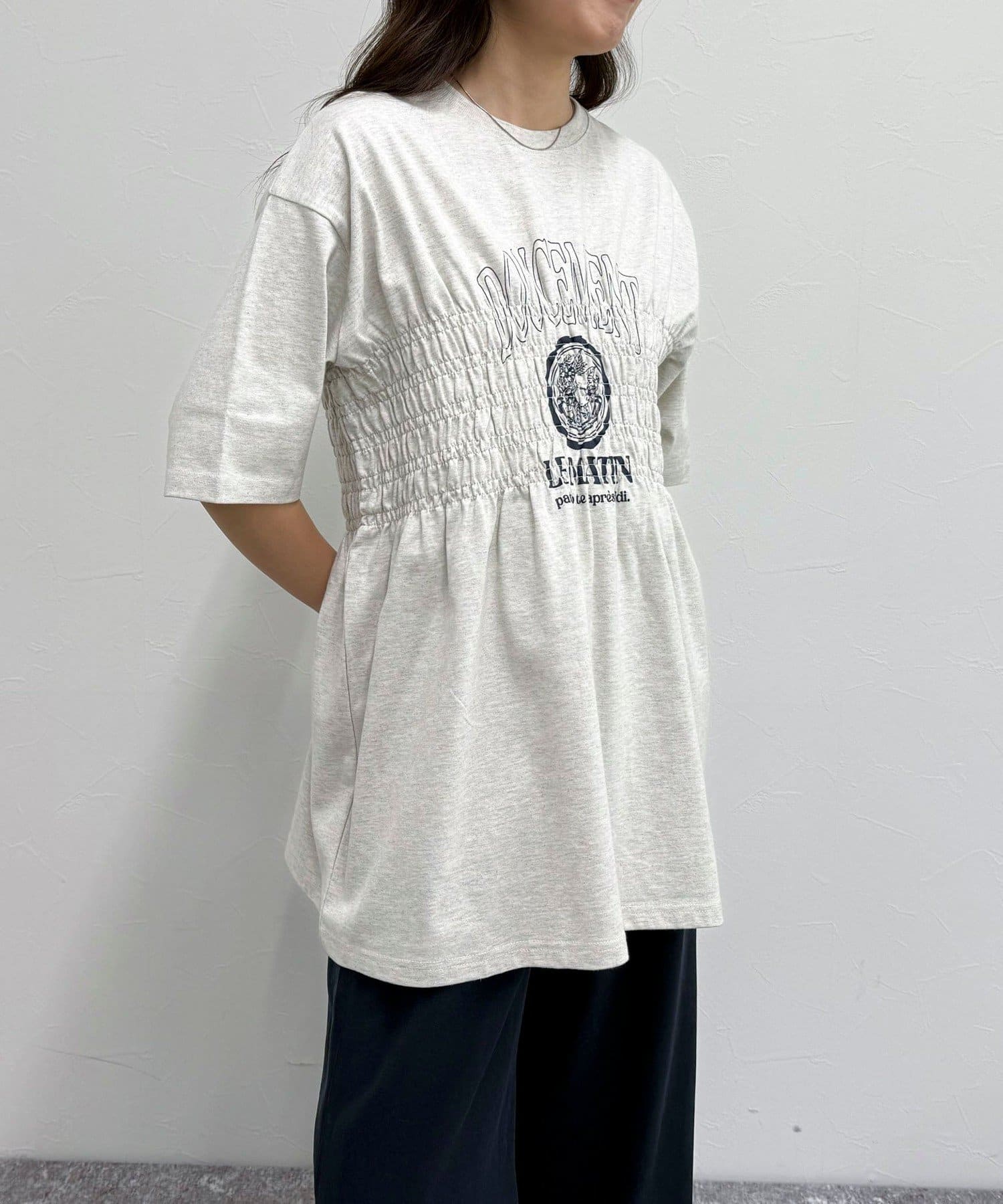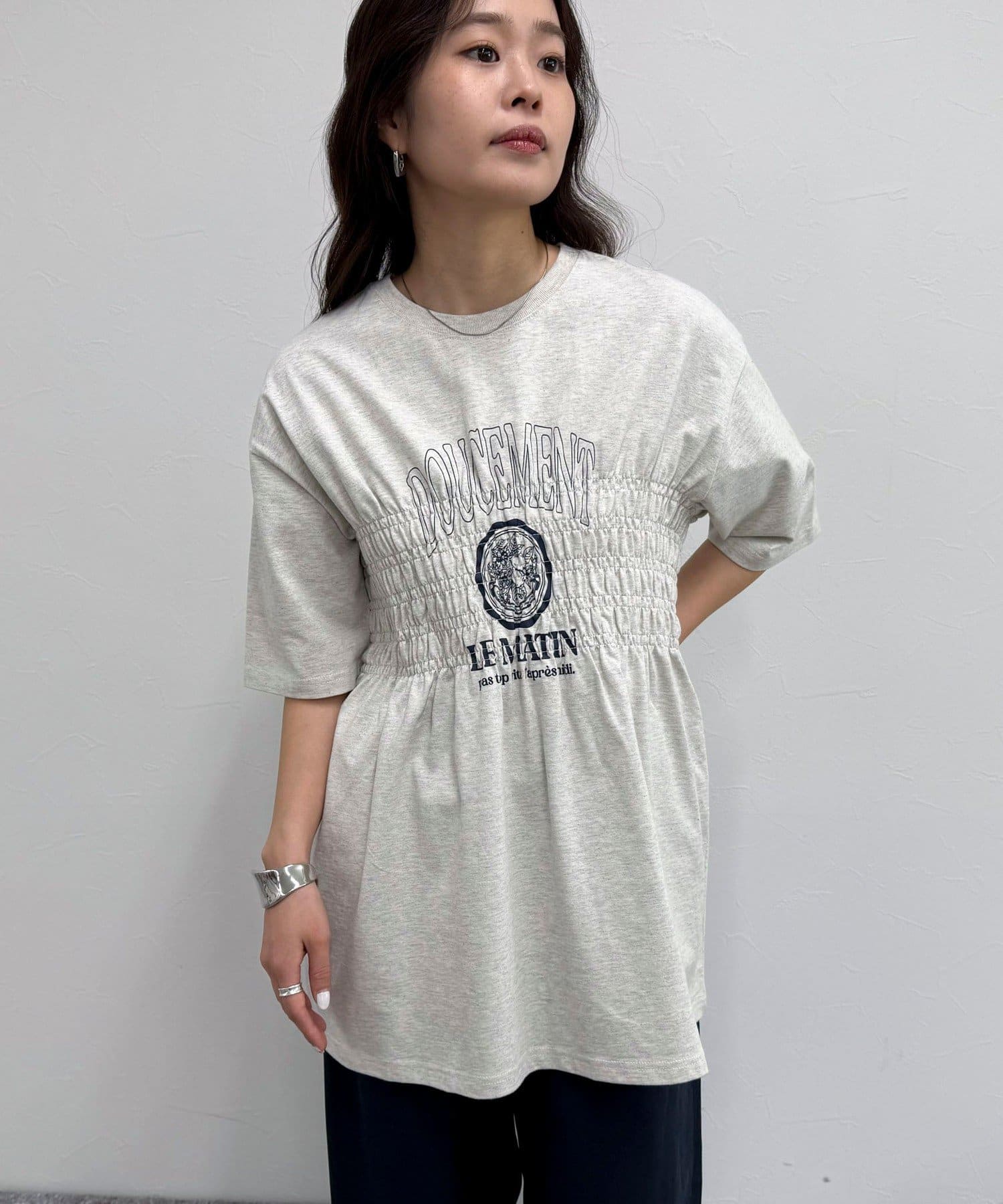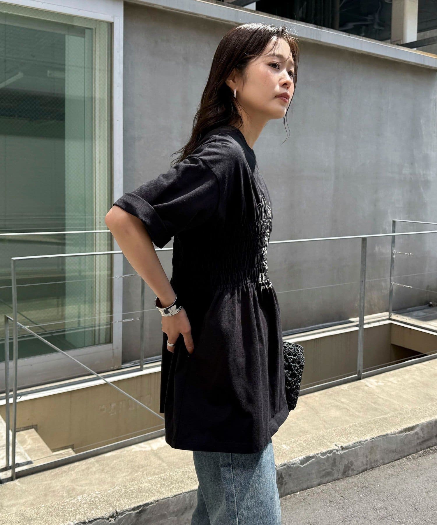 ・カジュアル感の強いロゴTにシャーリングをプラスし女性らしいシルエットに!