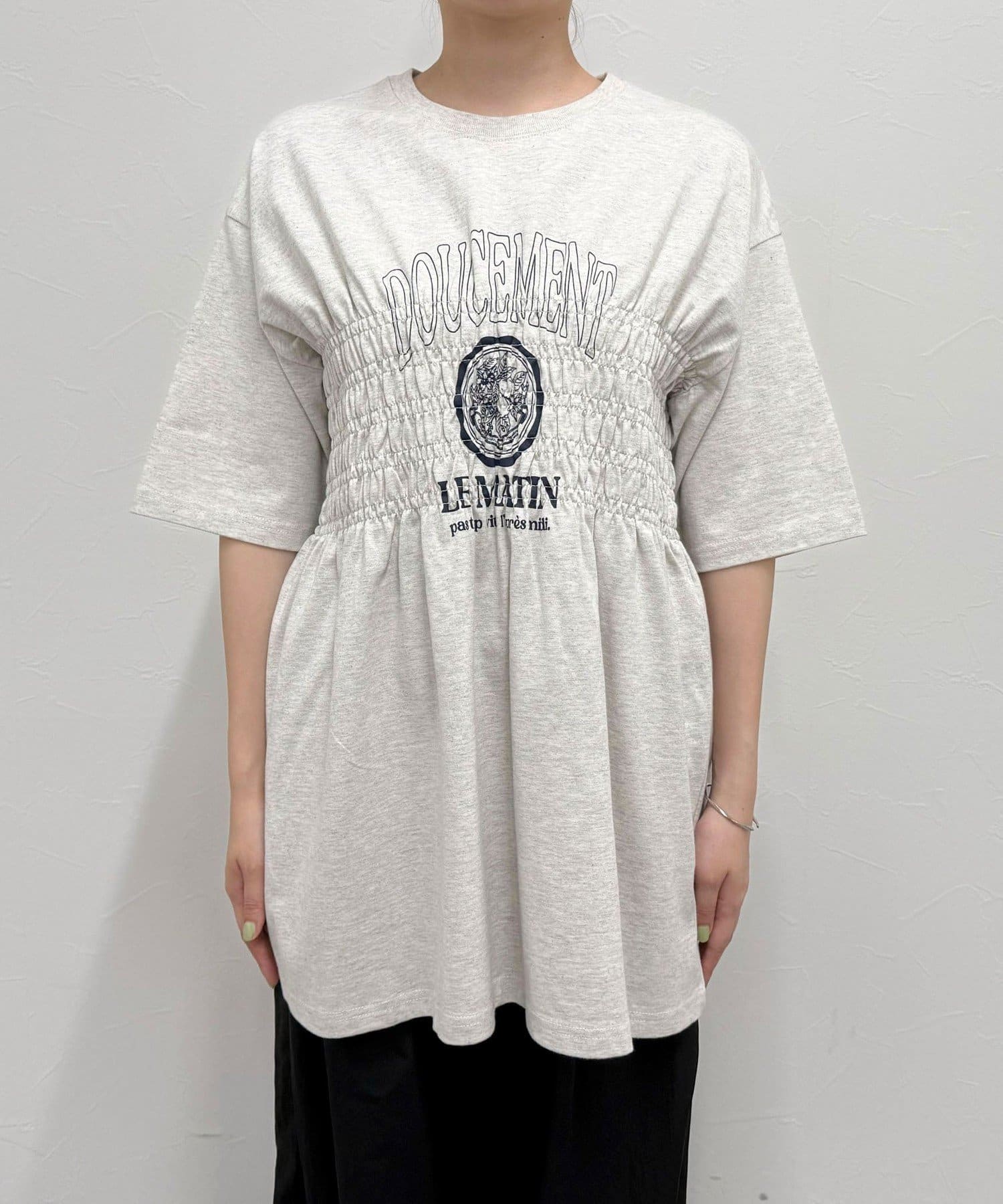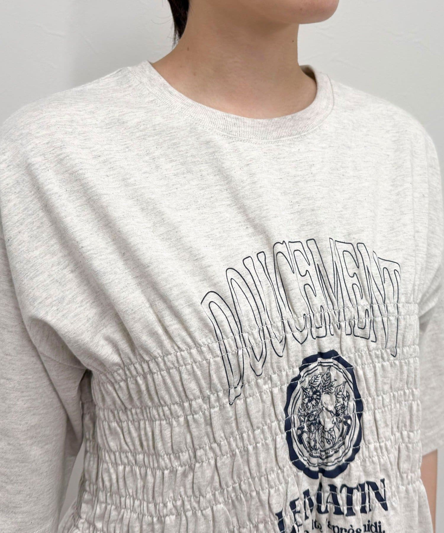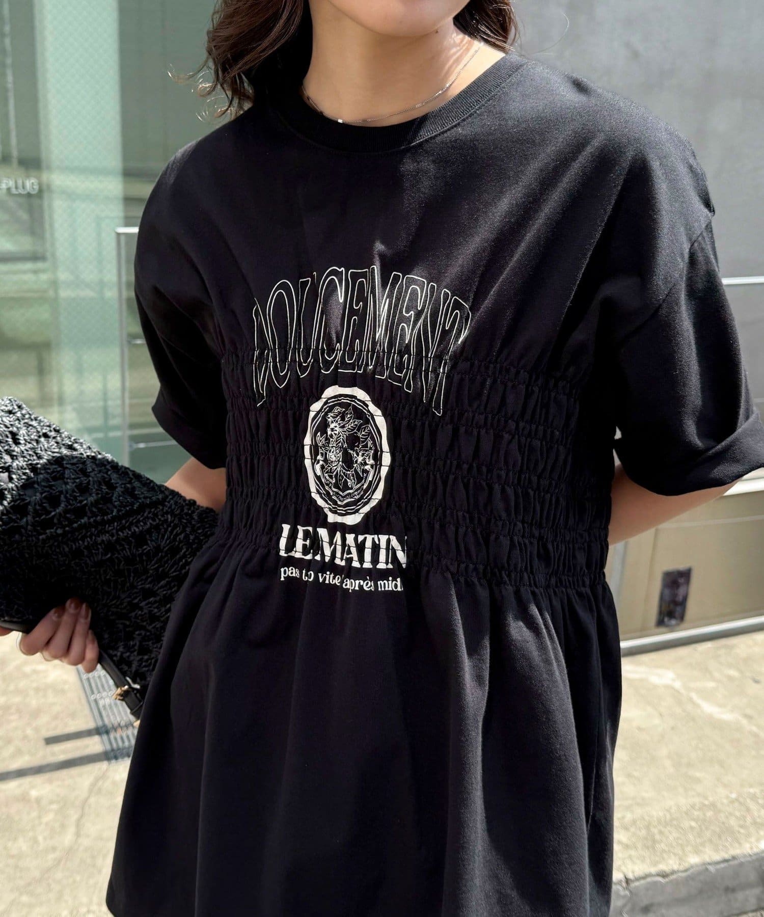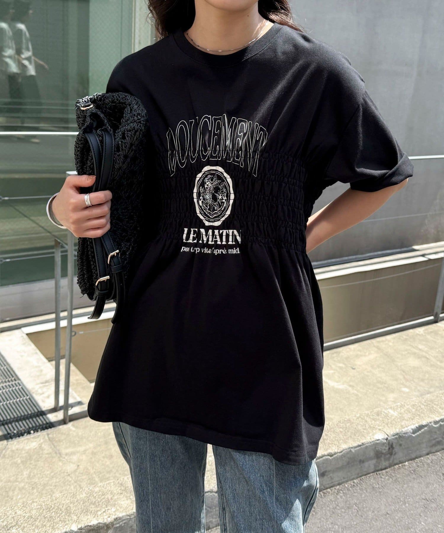 ・カジュアル感の強いロゴTにシャーリングをプラスし女性らしいシルエットに!