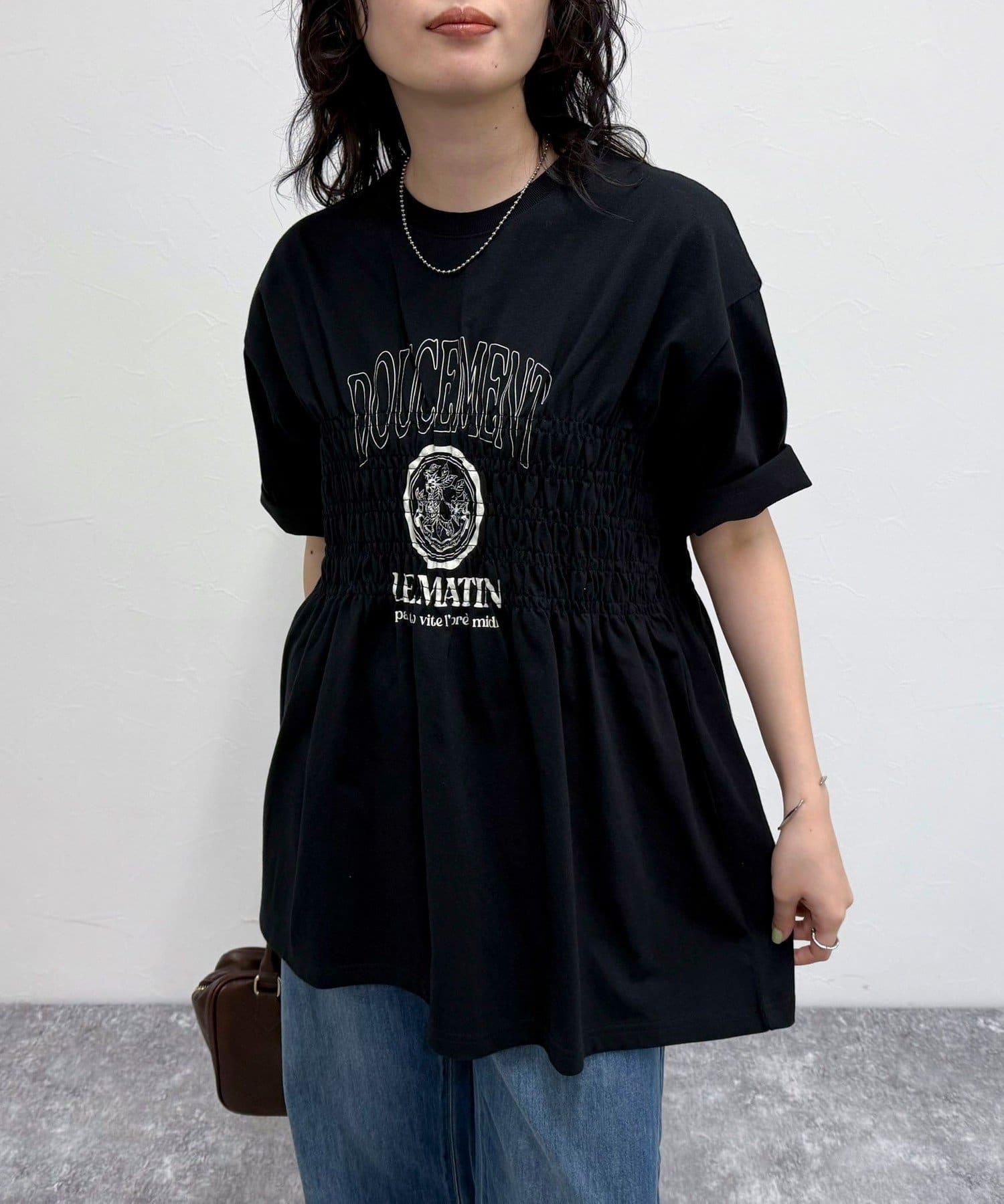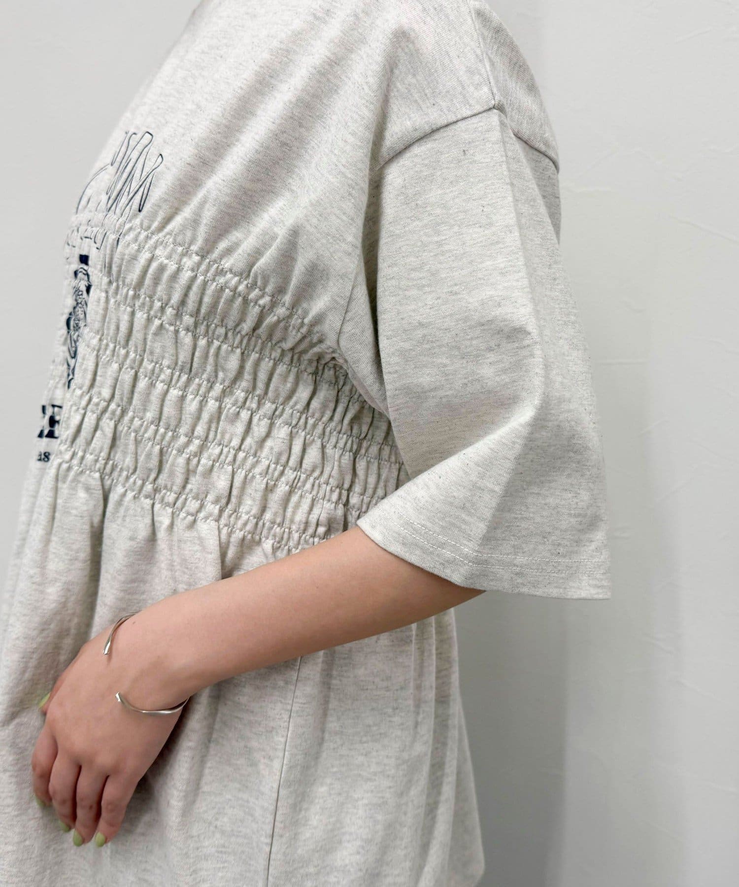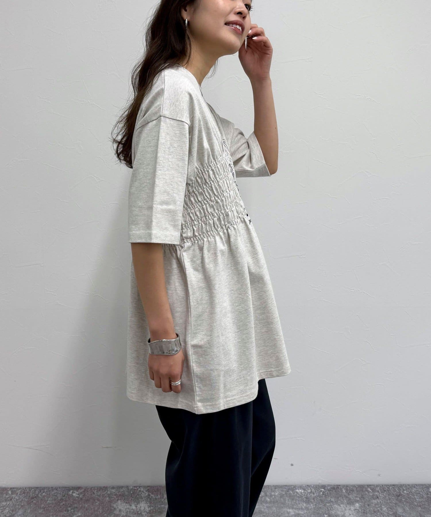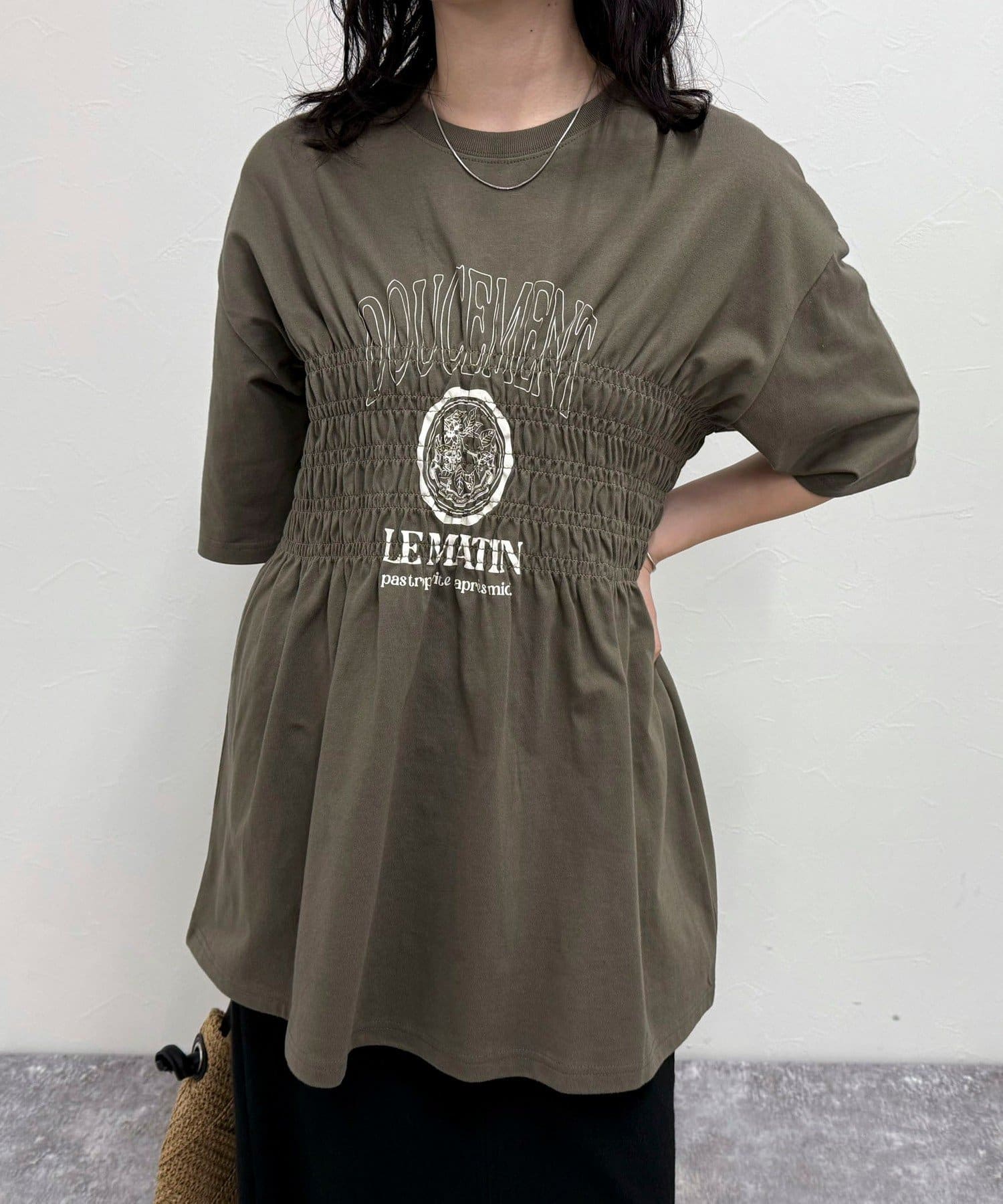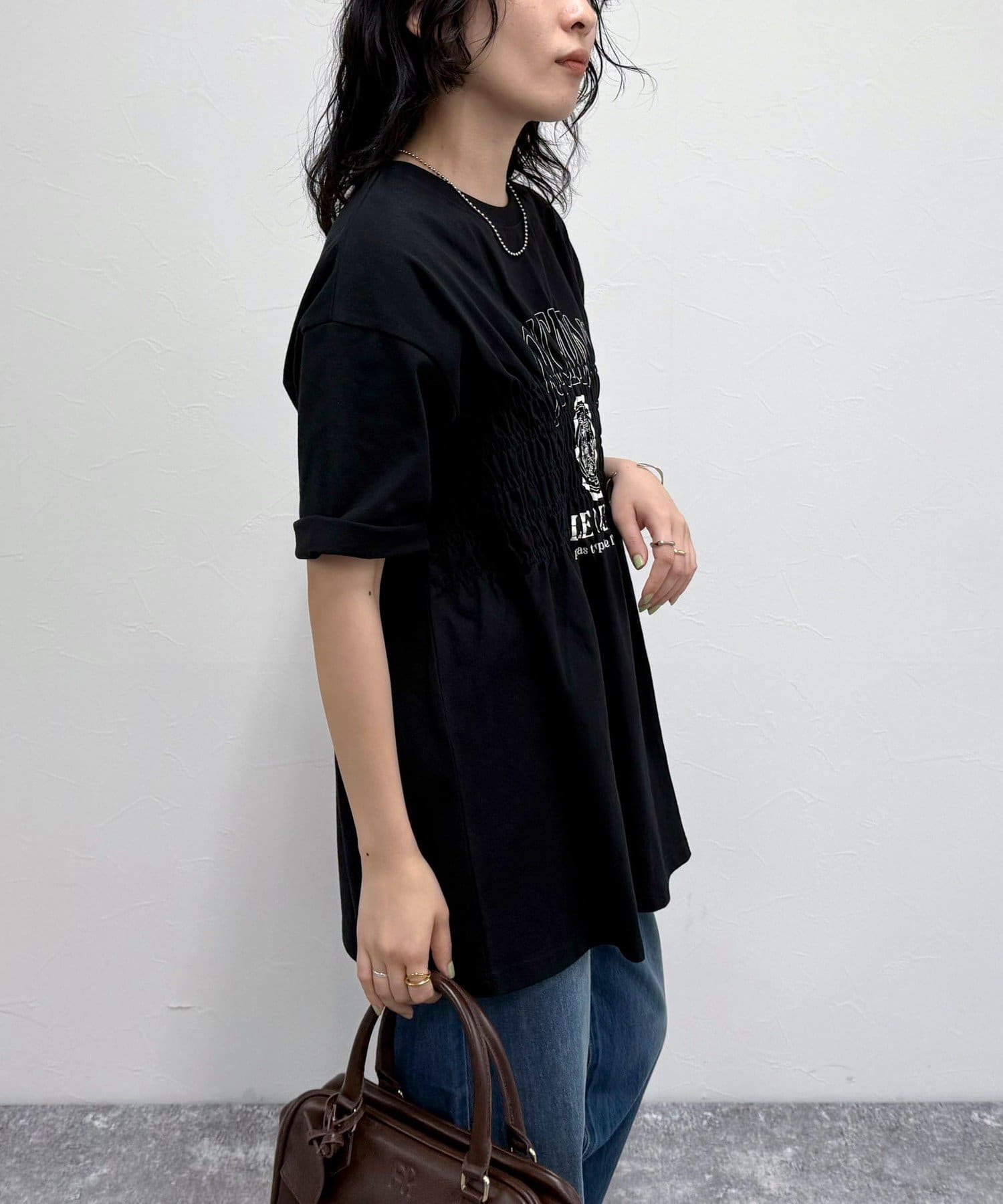 ・カジュアル感の強いロゴTにシャーリングをプラスし女性らしいシルエットに!