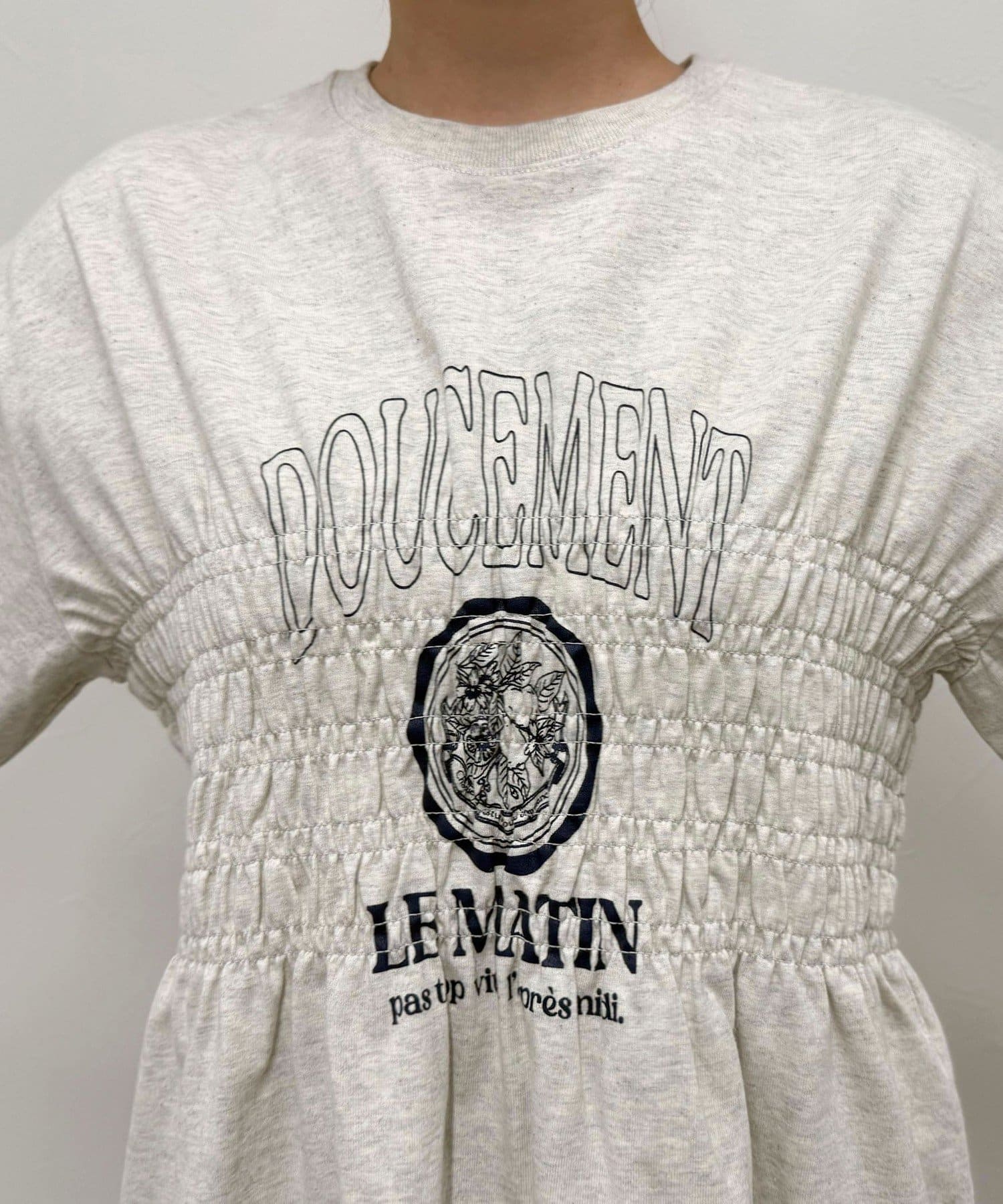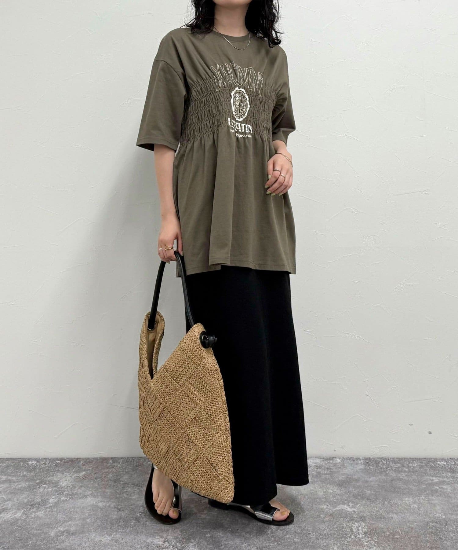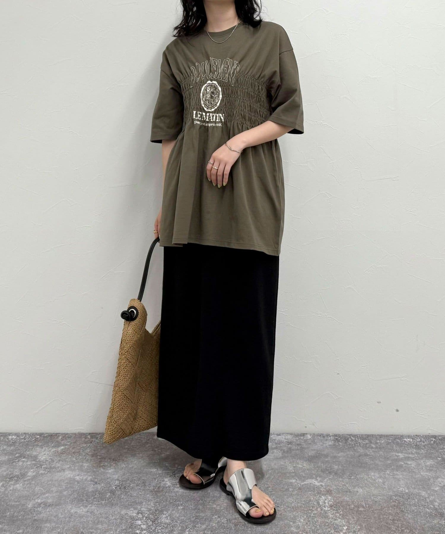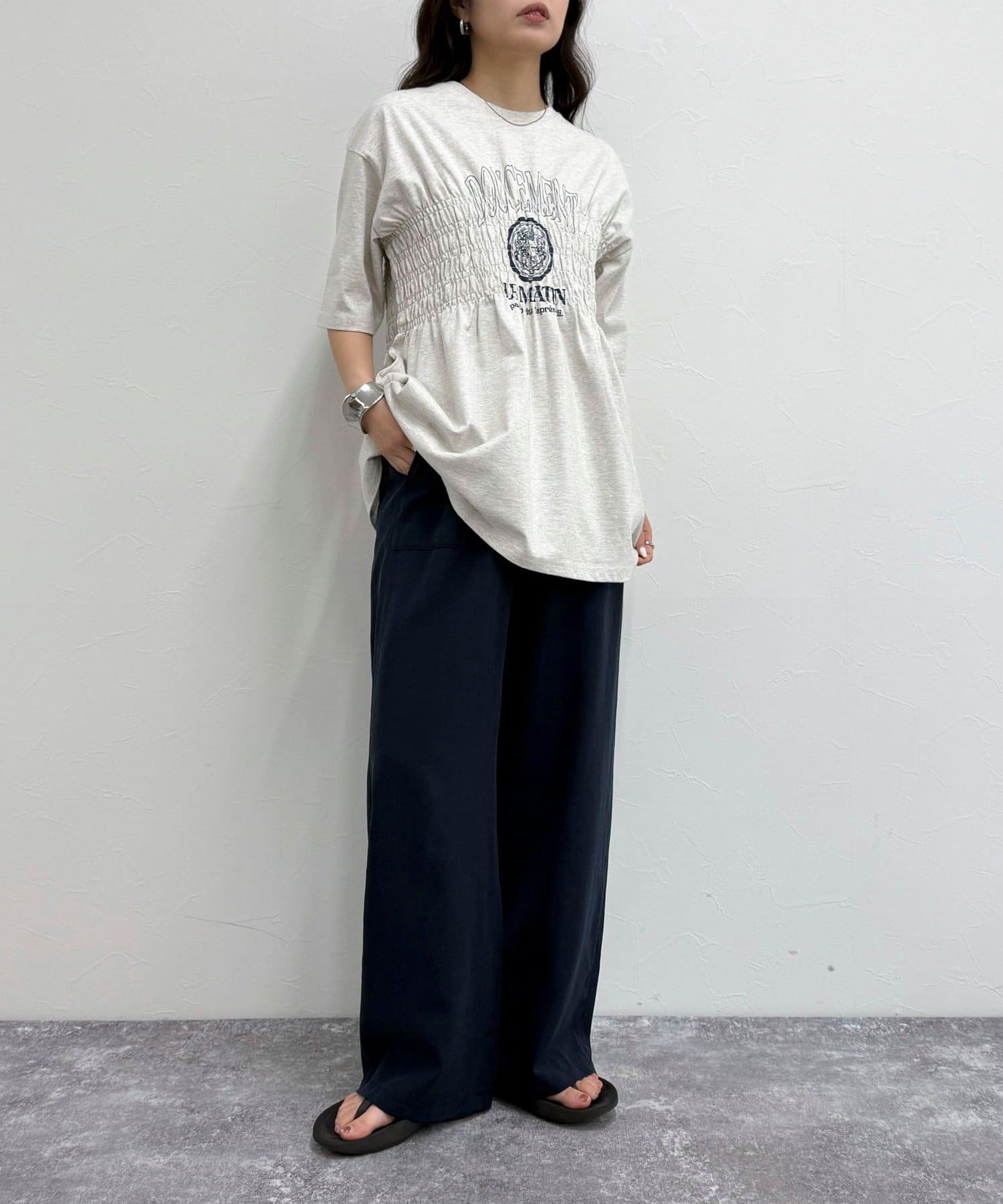 ・カジュアル感の強いロゴTにシャーリングをプラスし女性らしいシルエットに!