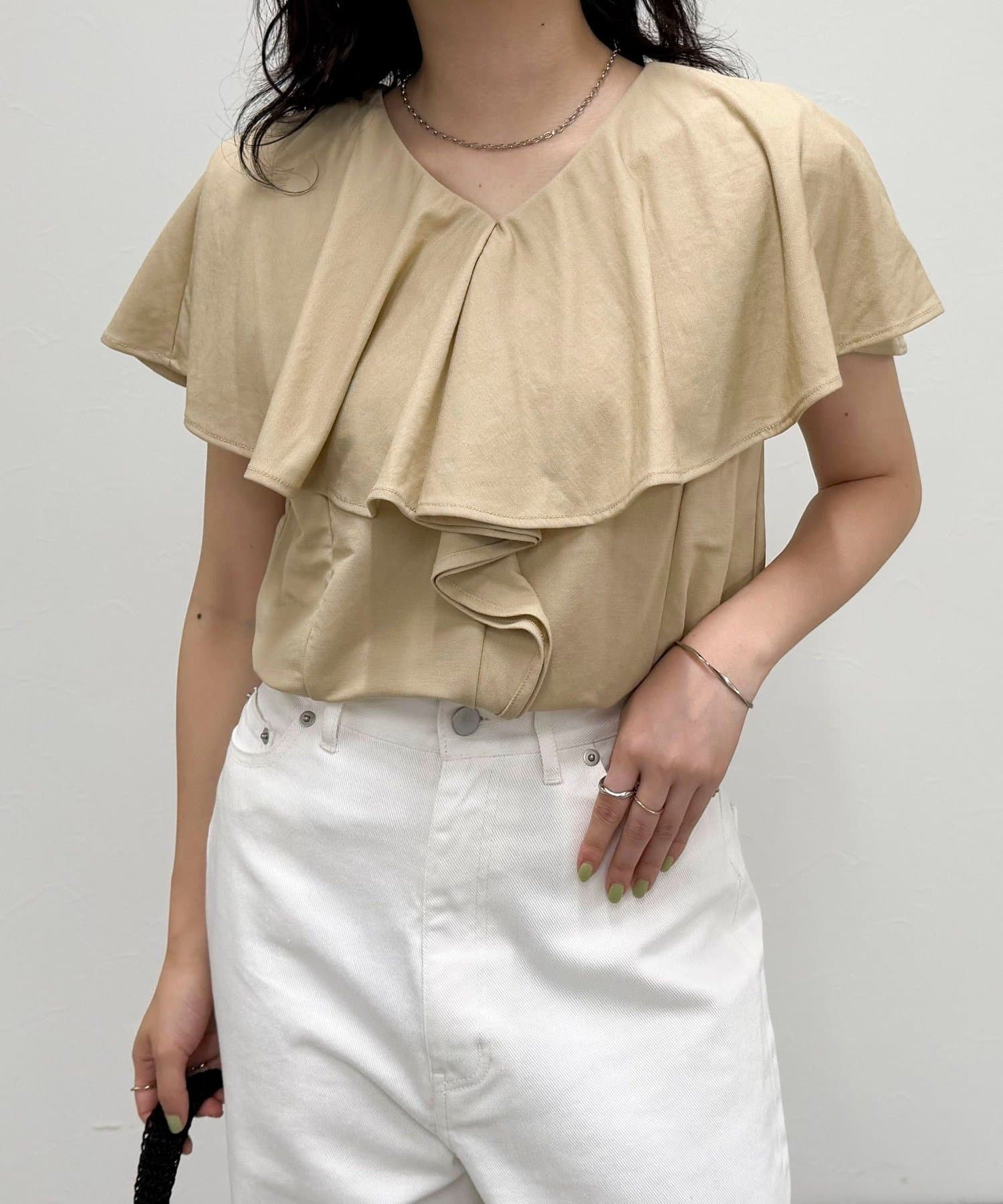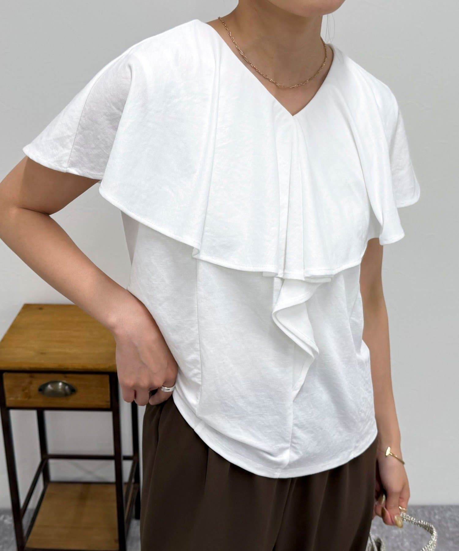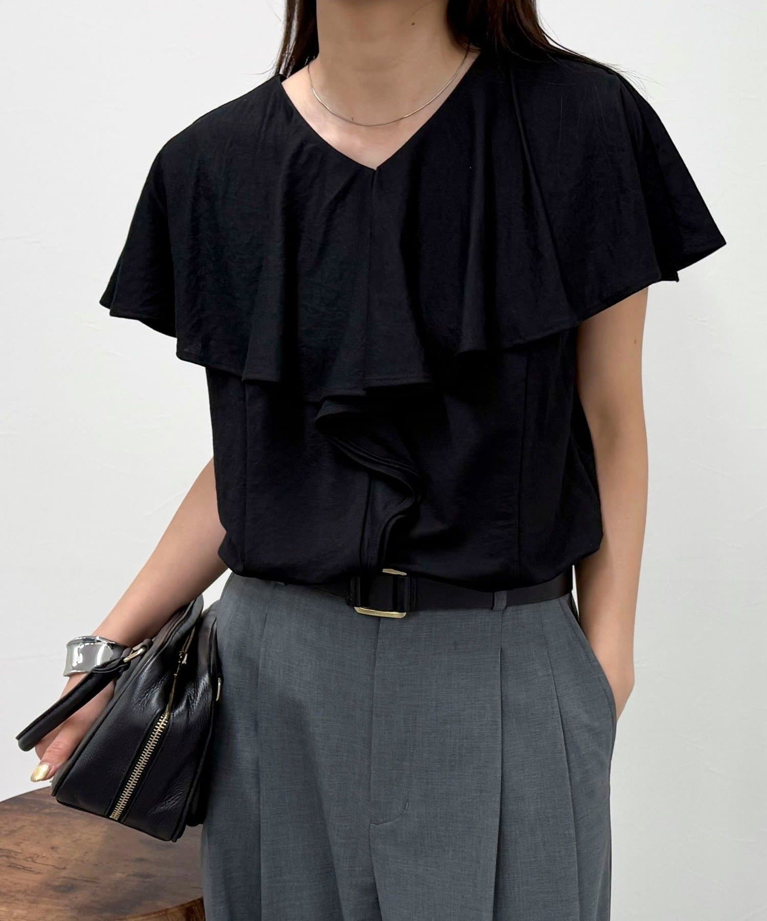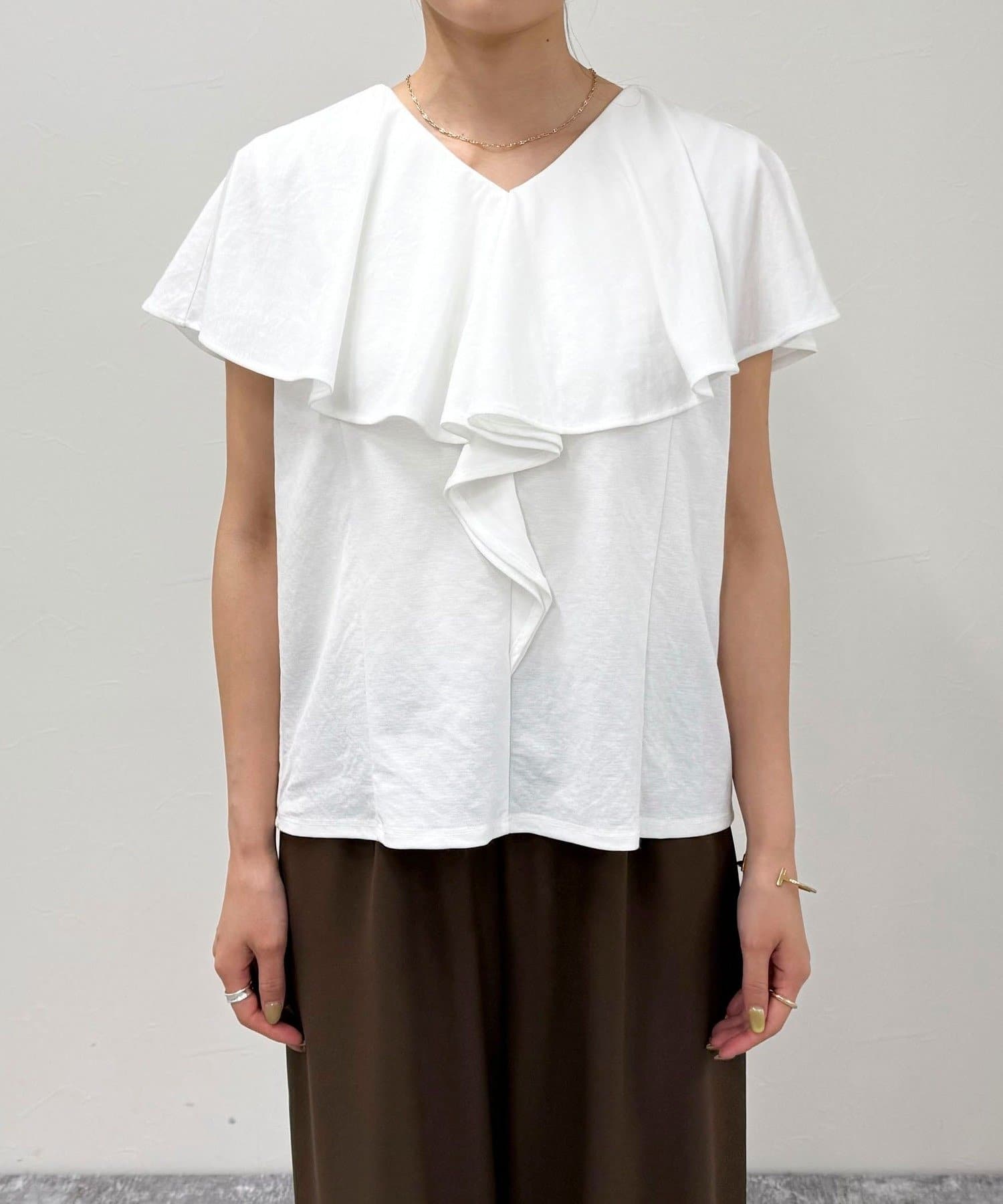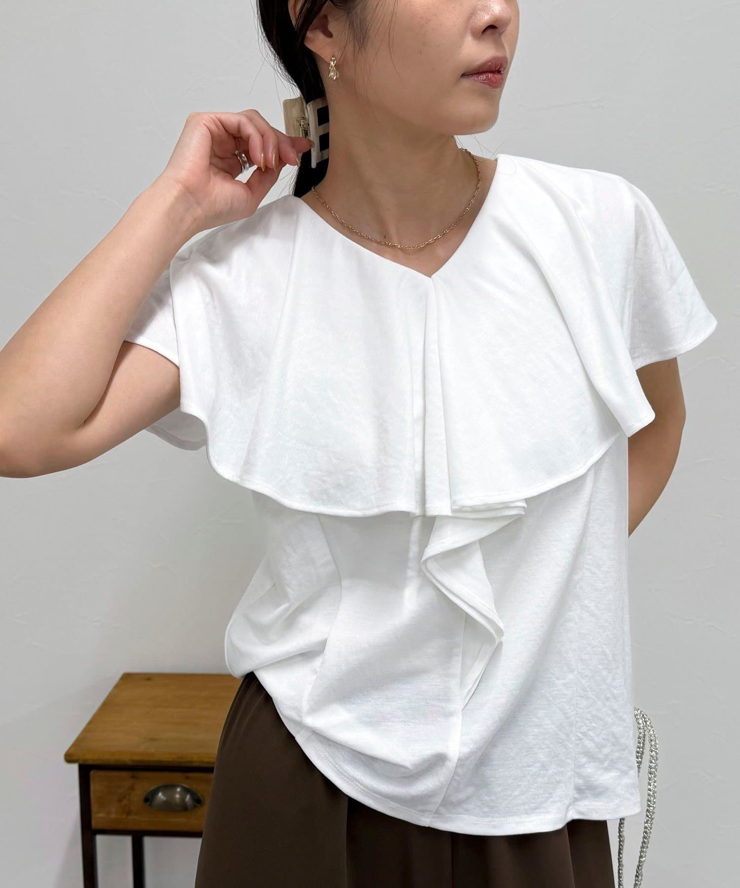 ・ふんわりとしたラッフルが顔周りを華やかに彩るカットソーブラウスです