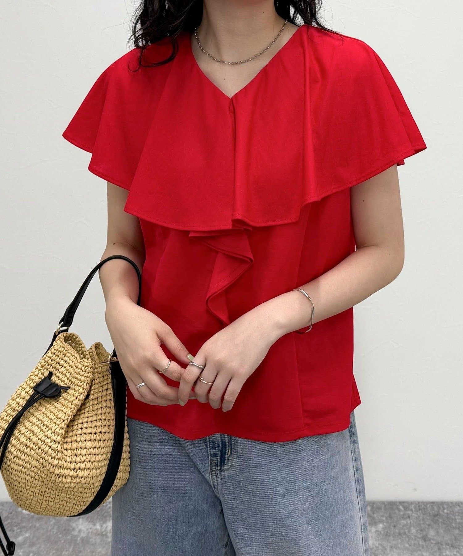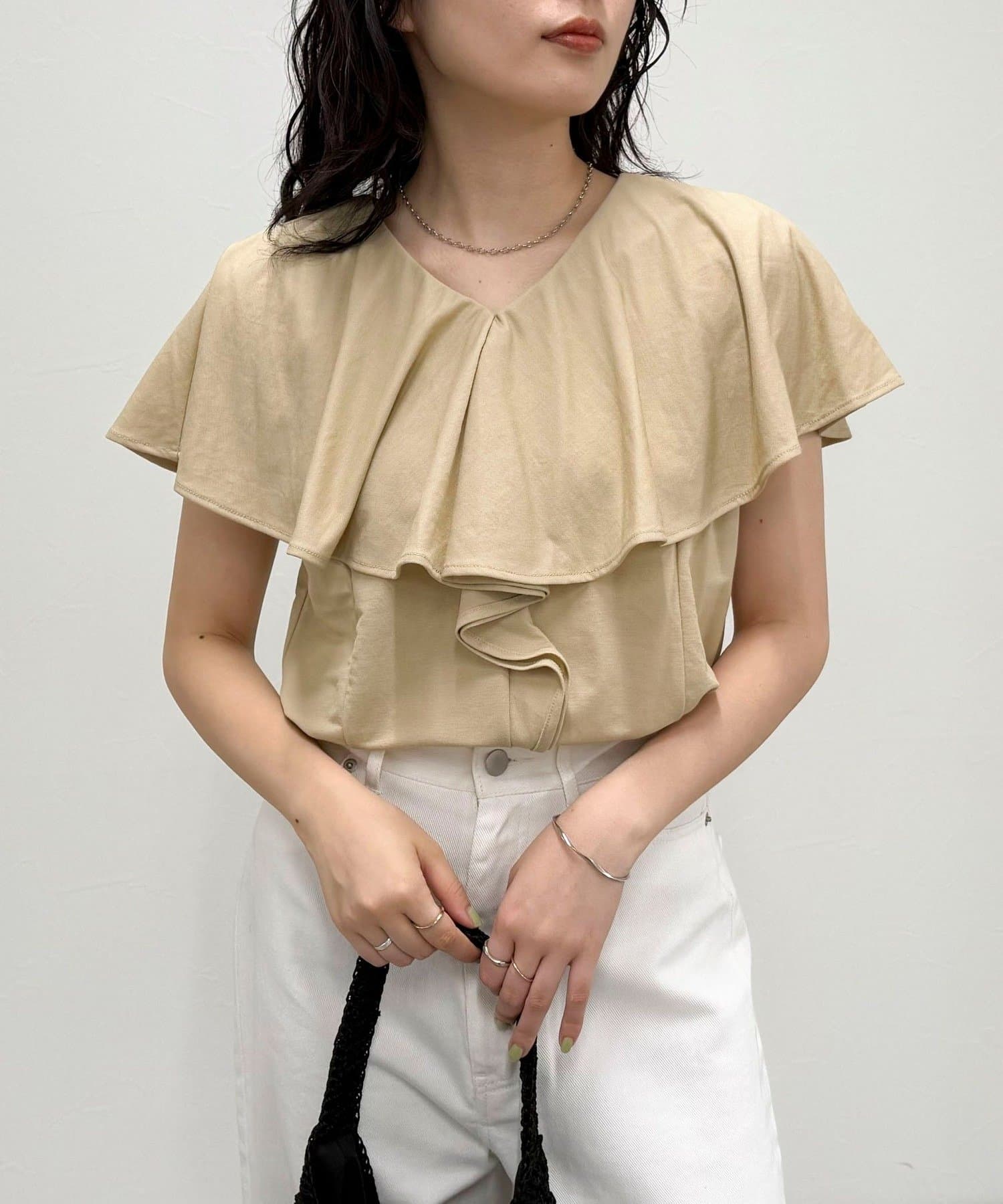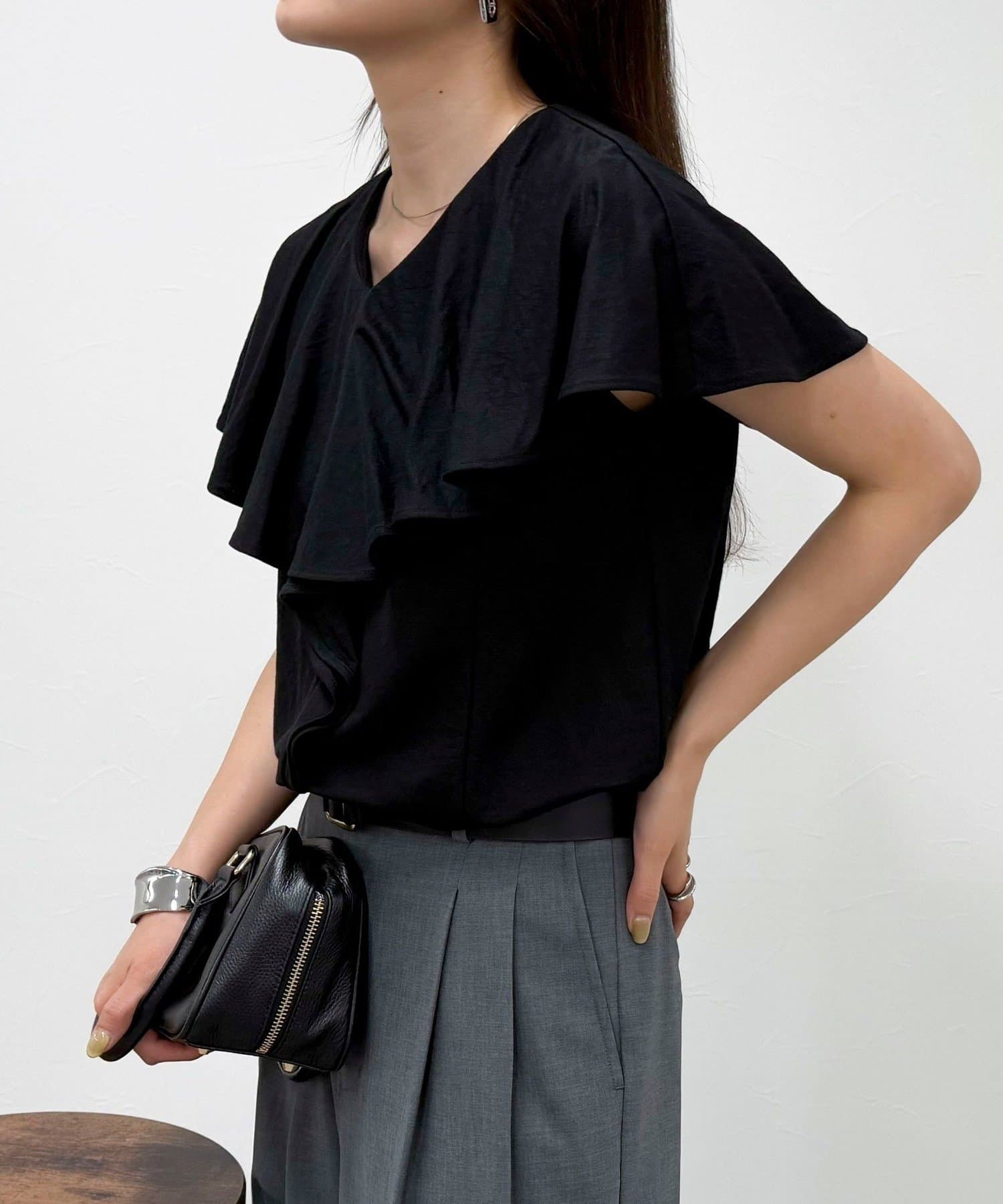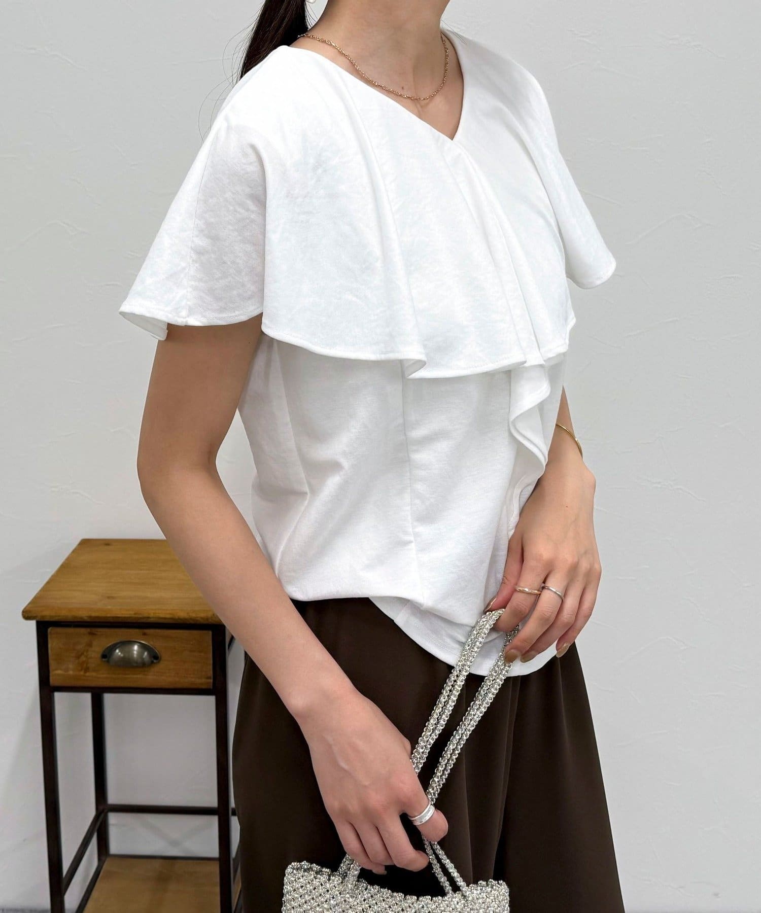 ・ふんわりとしたラッフルが顔周りを華やかに彩るカットソーブラウスです