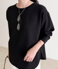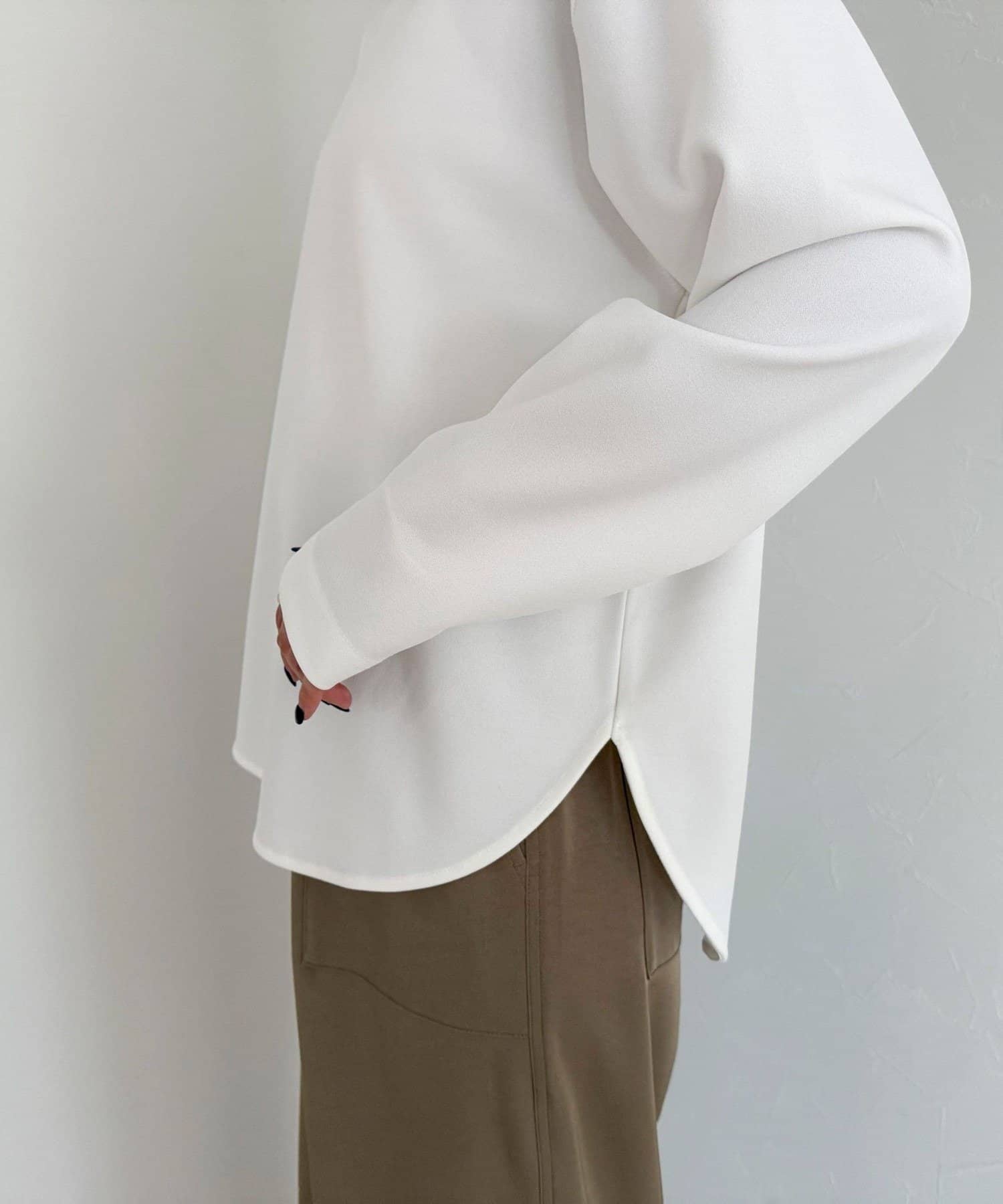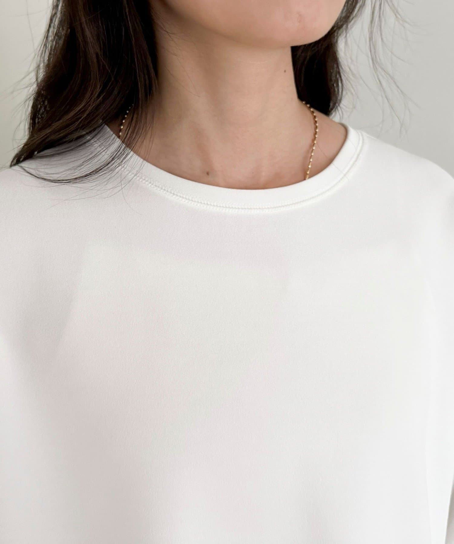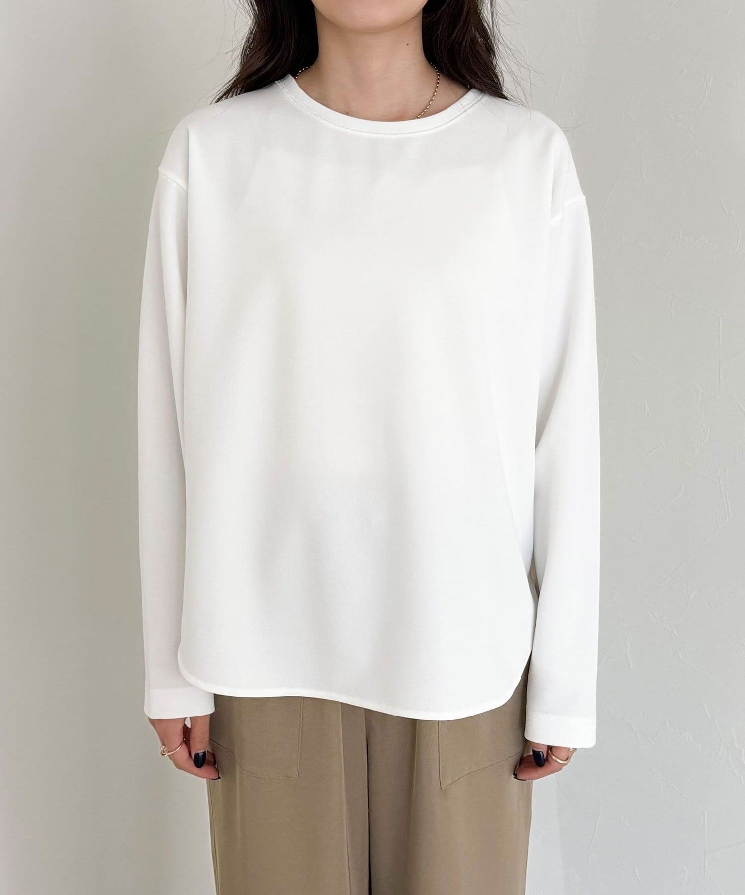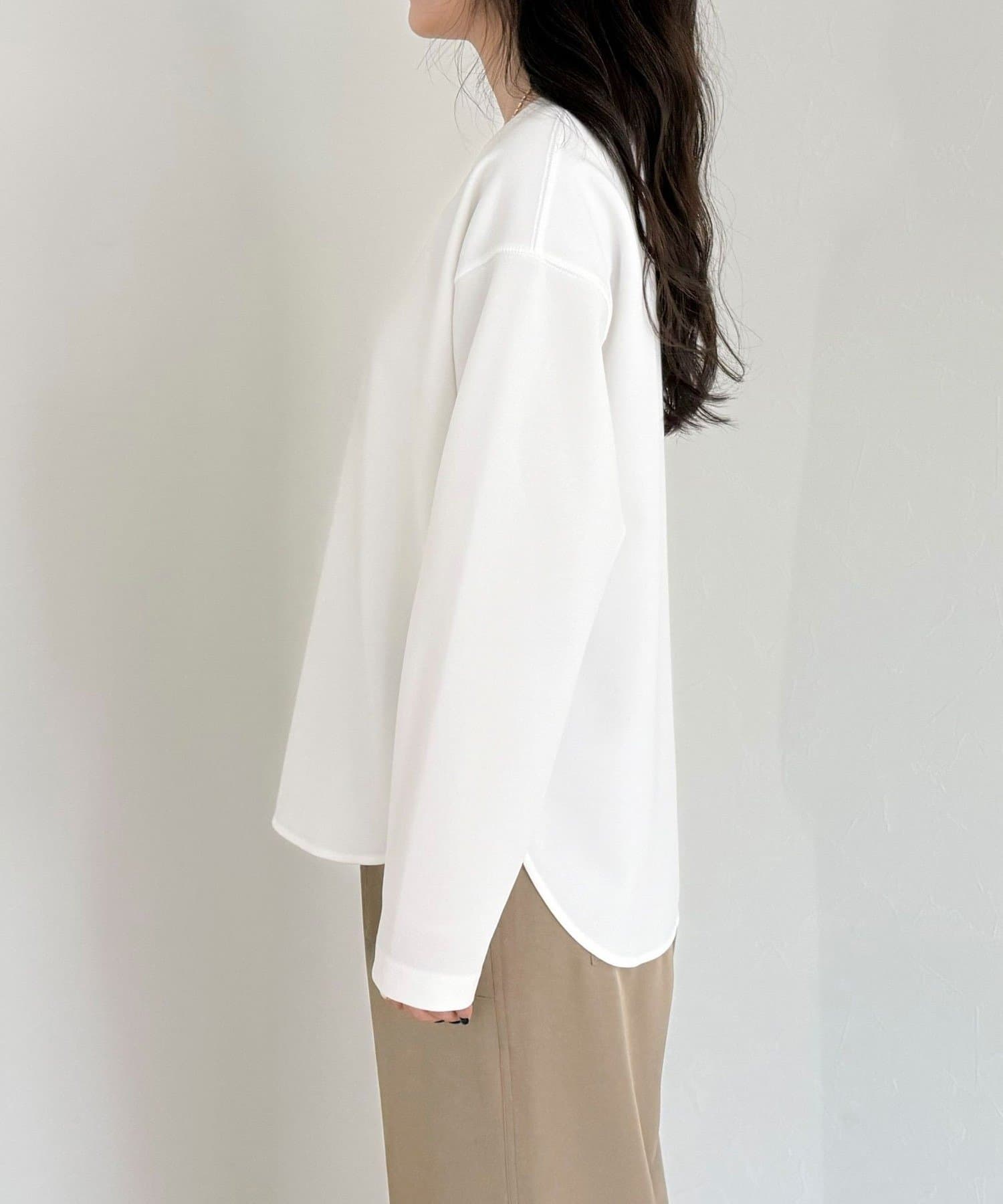 156cmスタッフ(38サイズ着用):ゆったりしすぎず程よく体に沿うシルエットで、きれいめに見えるのに着心地はTシャツ感覚。ストレッチが効いていて、長時間着ていてもラクでした。首元の開きも上品で、一枚でもレイヤードでも◎