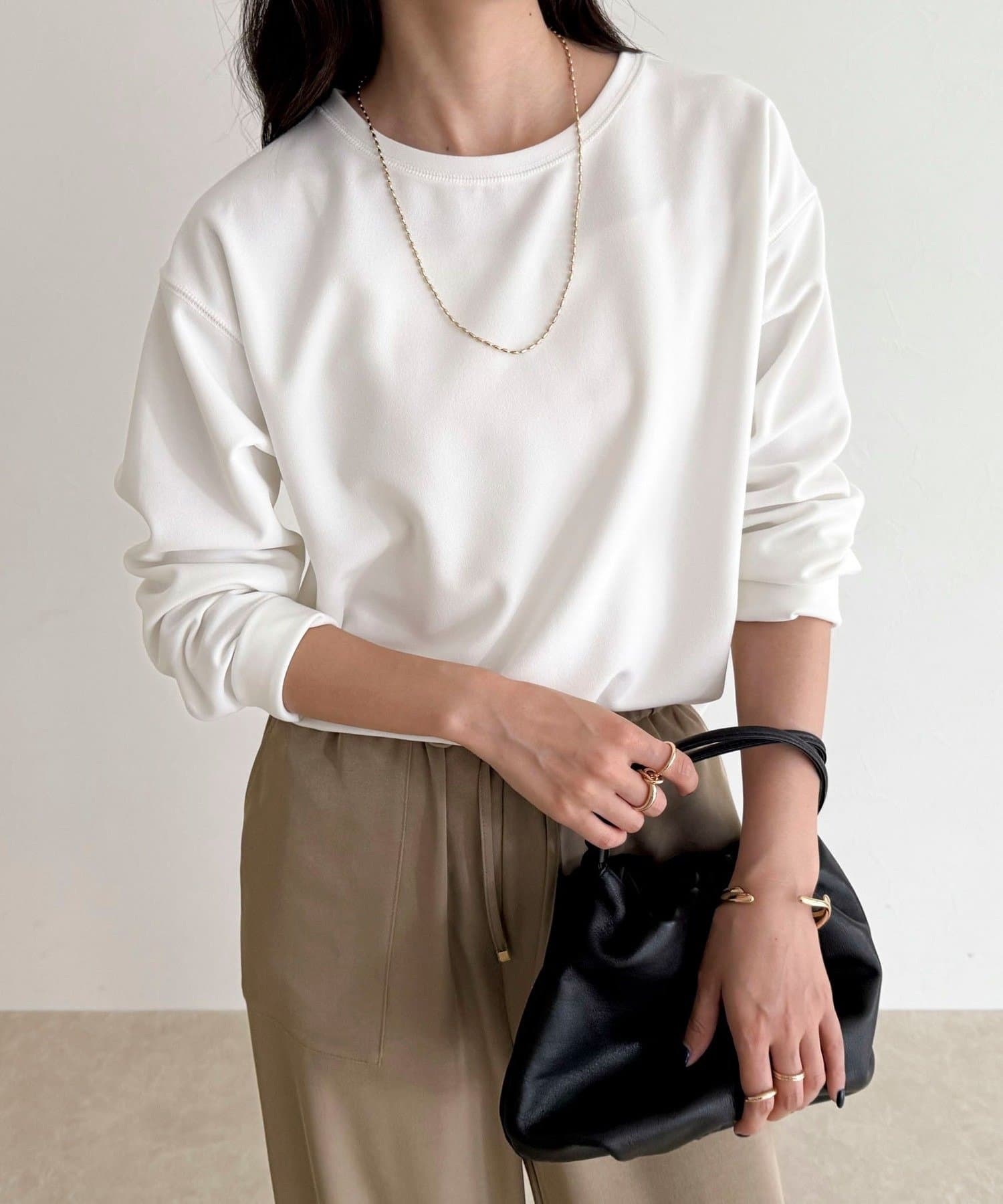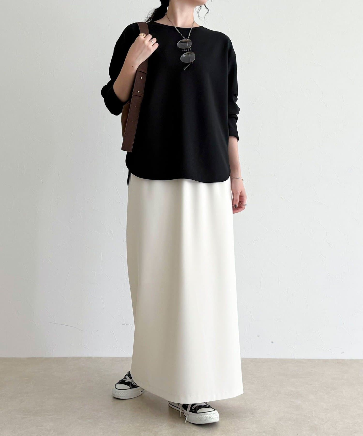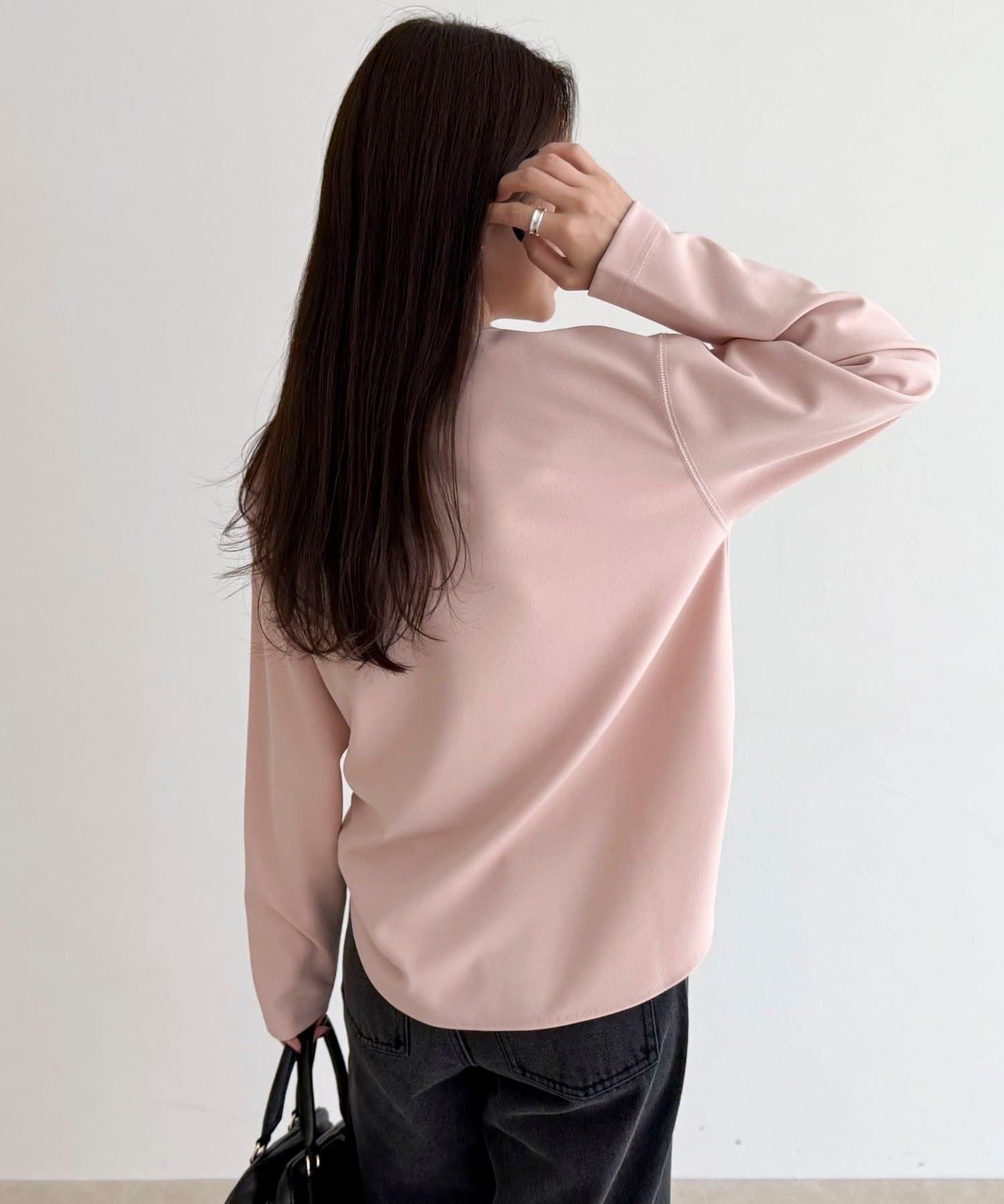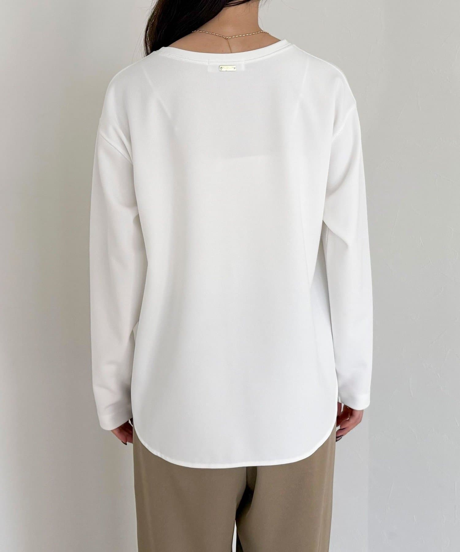 156cmスタッフ(38サイズ着用):ゆったりしすぎず程よく体に沿うシルエットで、きれいめに見えるのに着心地はTシャツ感覚。ストレッチが効いていて、長時間着ていてもラクでした。首元の開きも上品で、一枚でもレイヤードでも◎