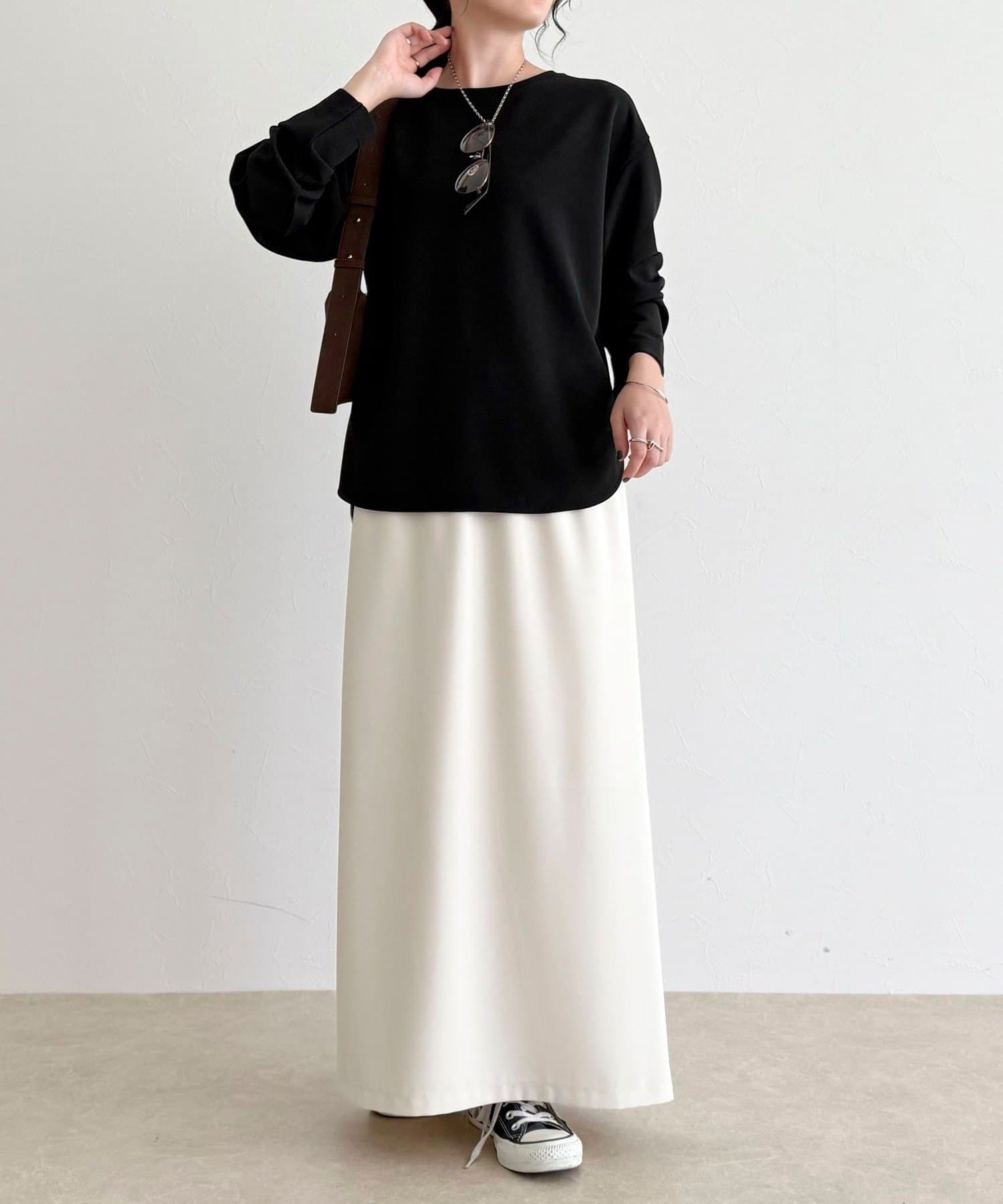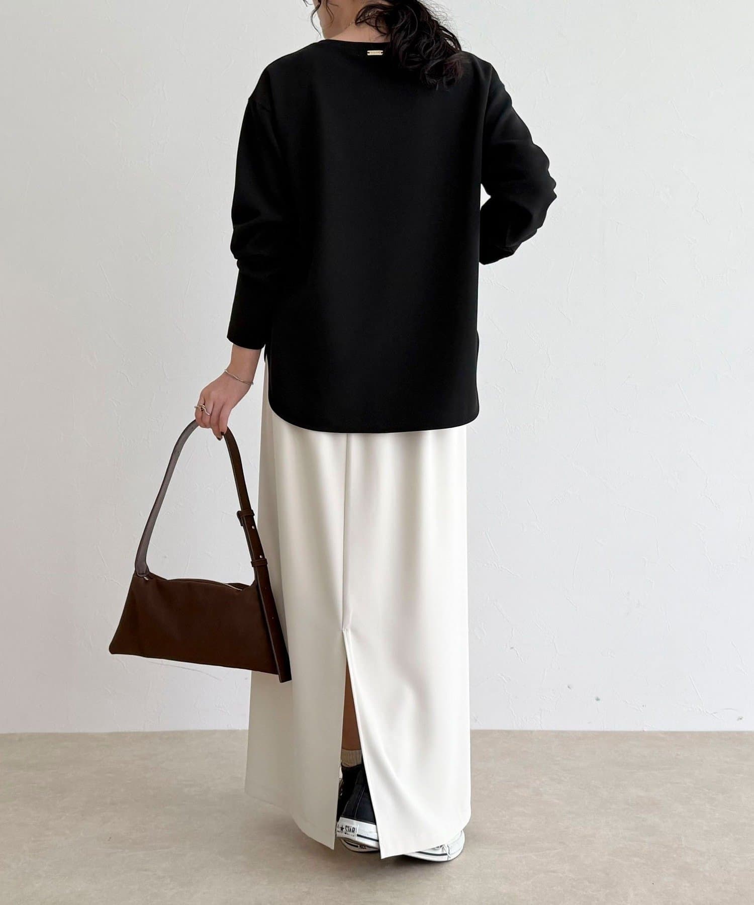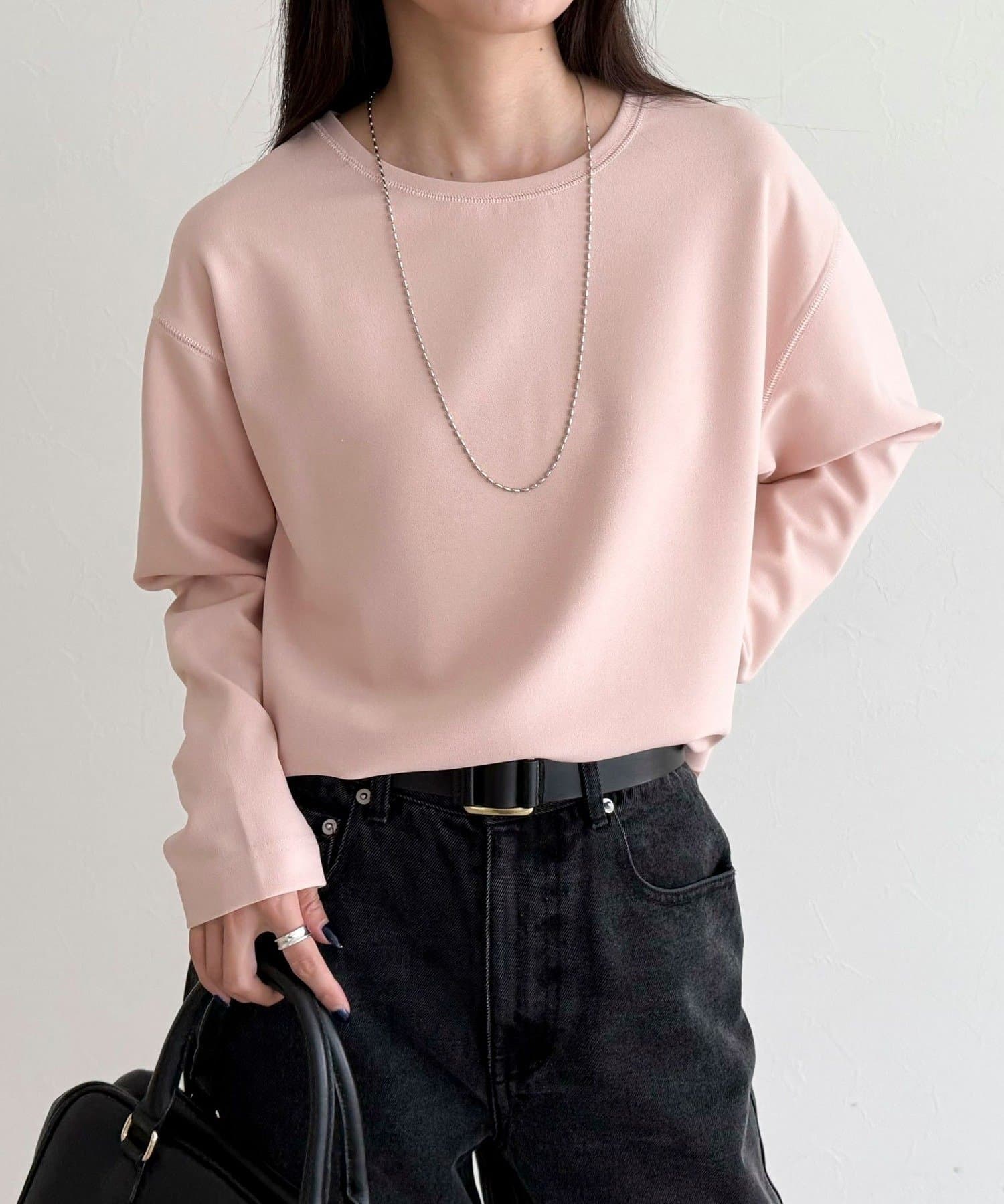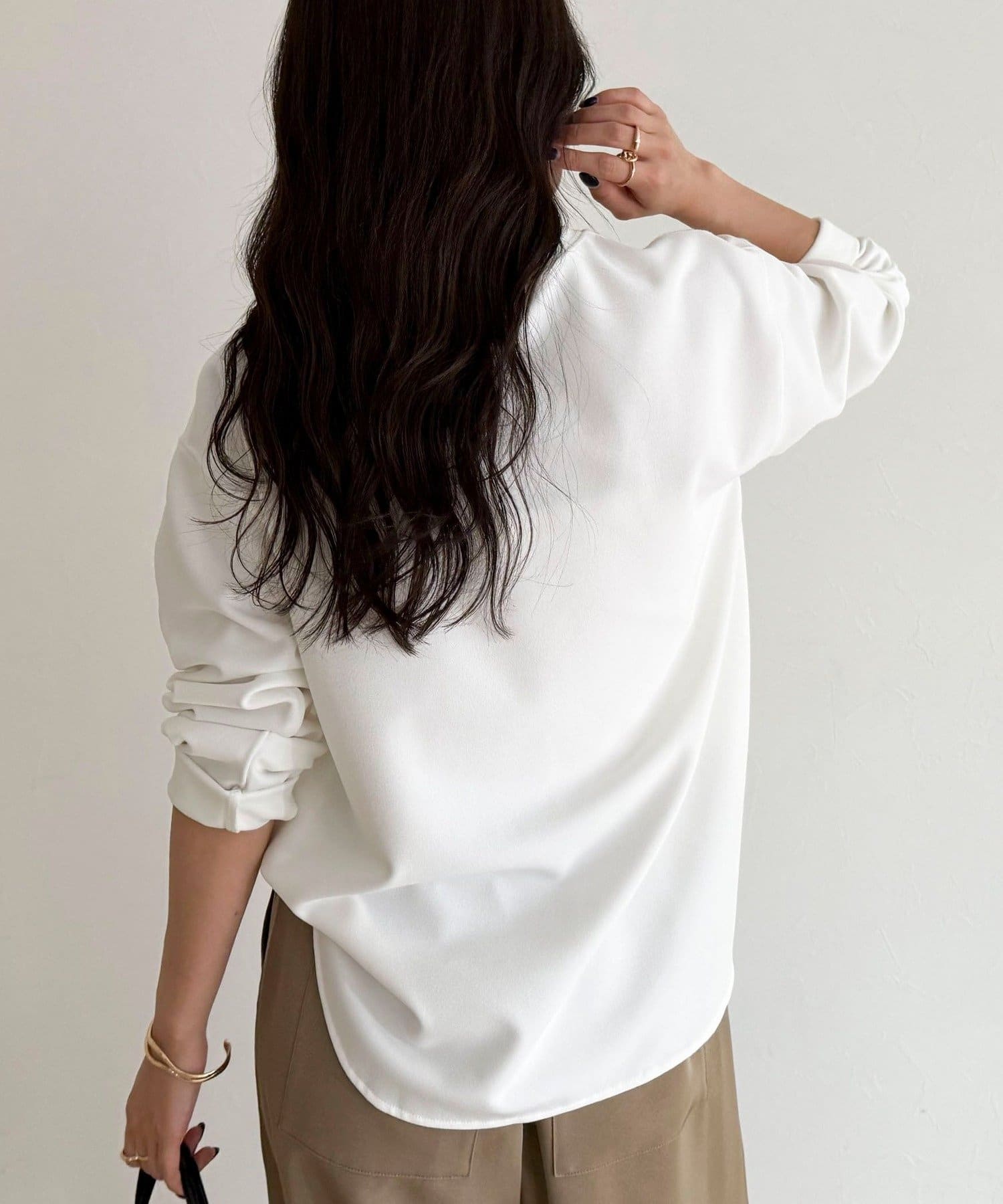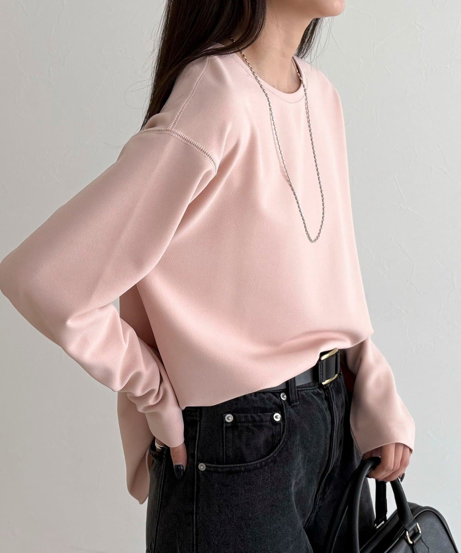 156cmスタッフ(38サイズ着用):ゆったりしすぎず程よく体に沿うシルエットで、きれいめに見えるのに着心地はTシャツ感覚。ストレッチが効いていて、長時間着ていてもラクでした。首元の開きも上品で、一枚でもレイヤードでも◎
