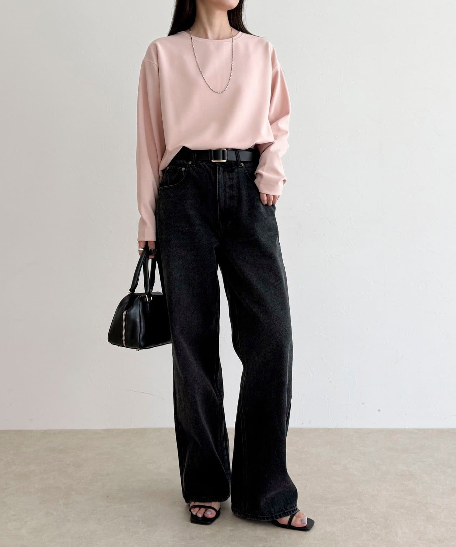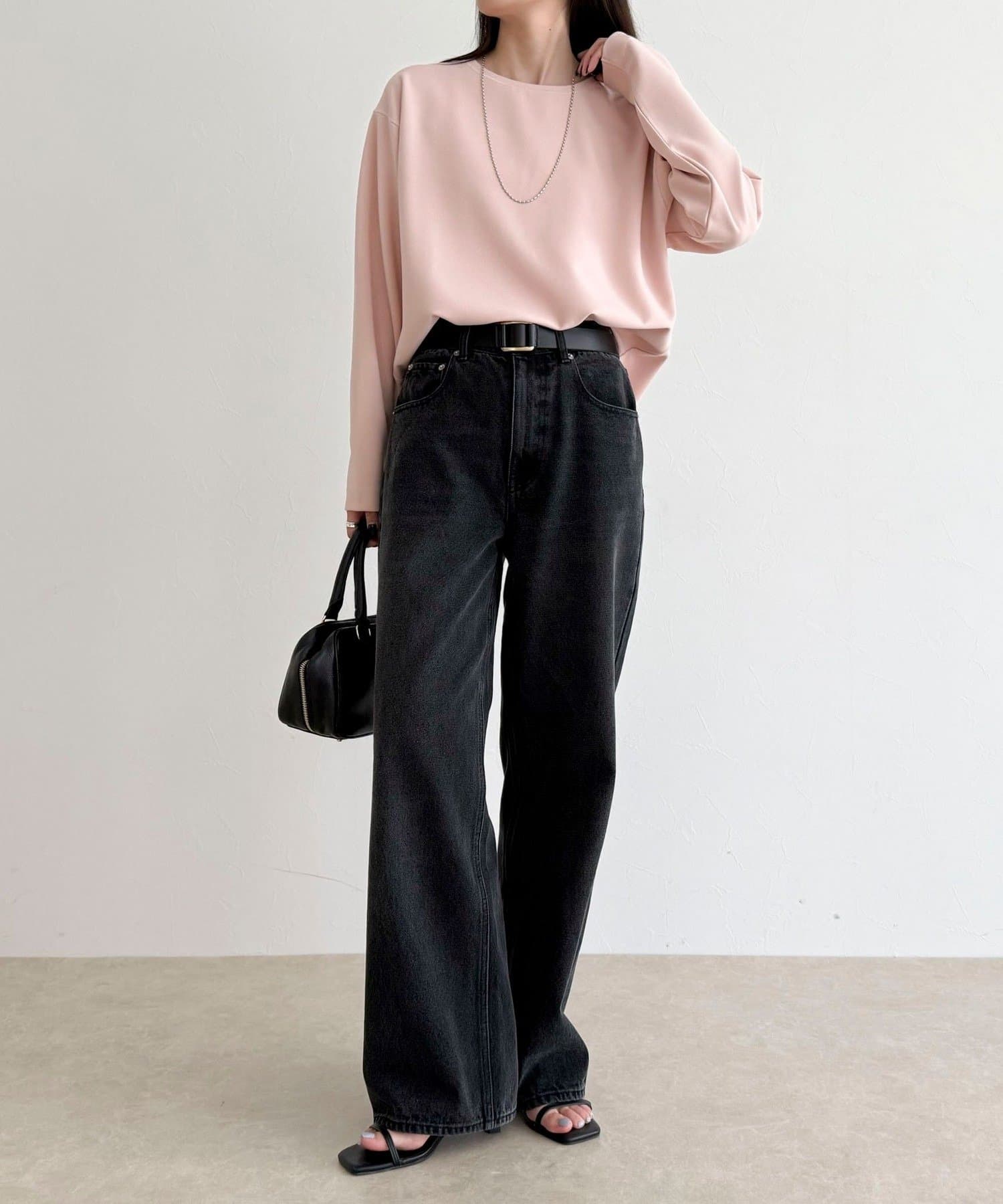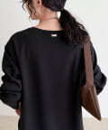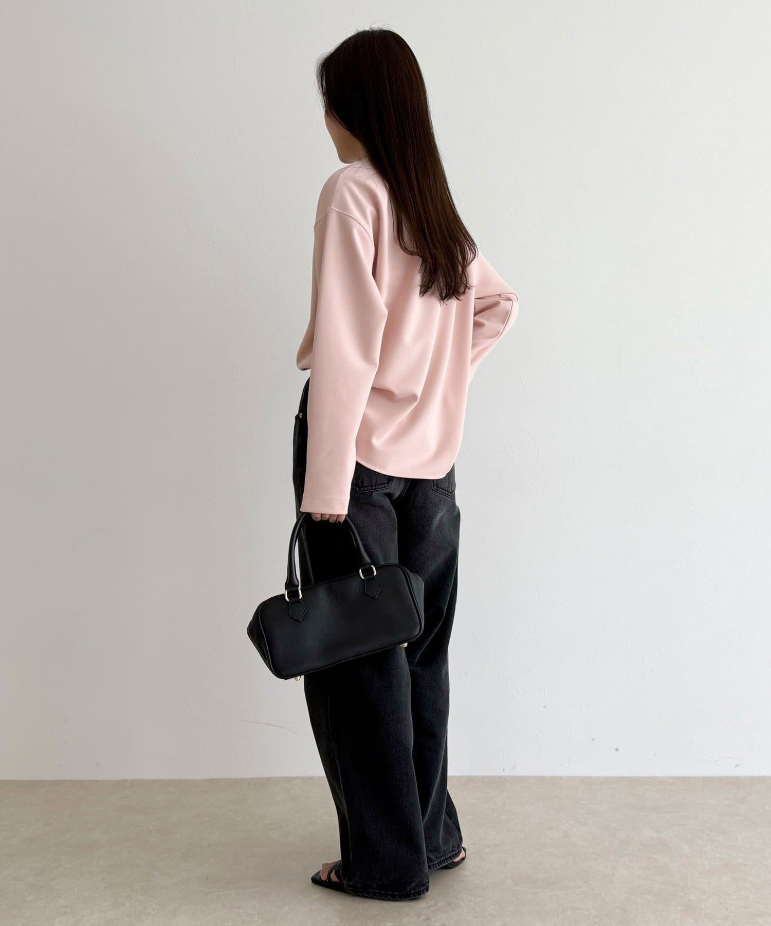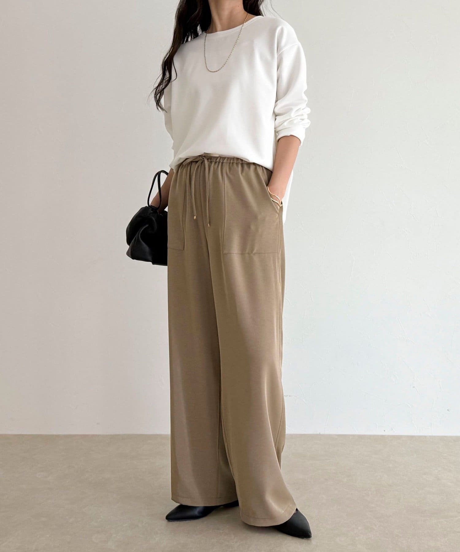 156cmスタッフ(38サイズ着用):ゆったりしすぎず程よく体に沿うシルエットで、きれいめに見えるのに着心地はTシャツ感覚。ストレッチが効いていて、長時間着ていてもラクでした。首元の開きも上品で、一枚でもレイヤードでも◎