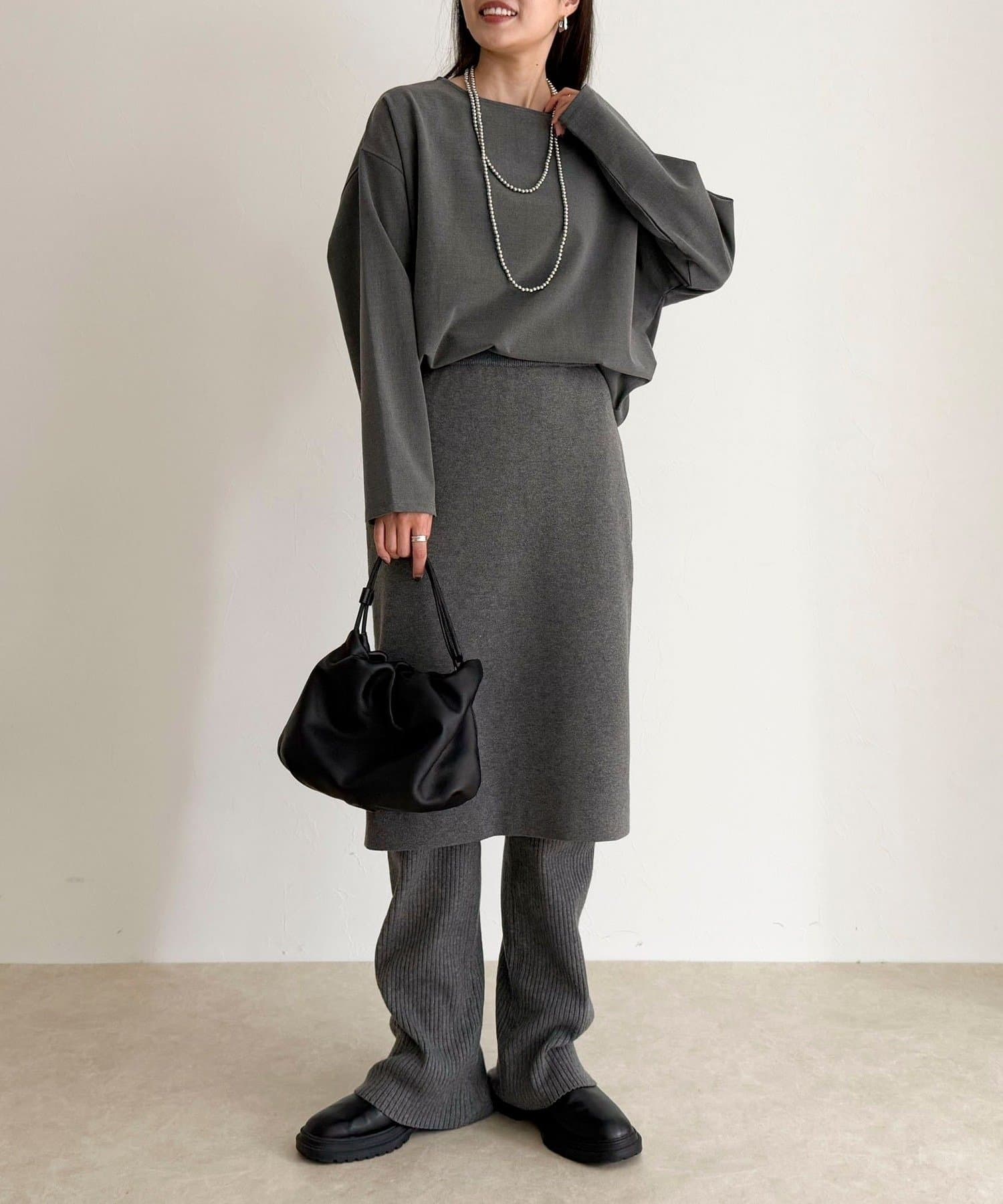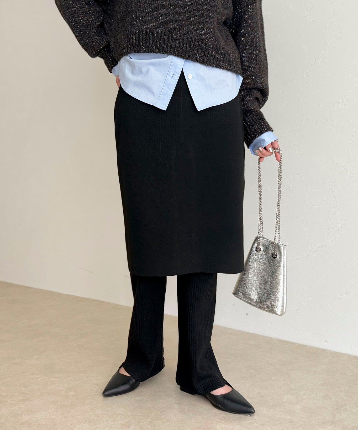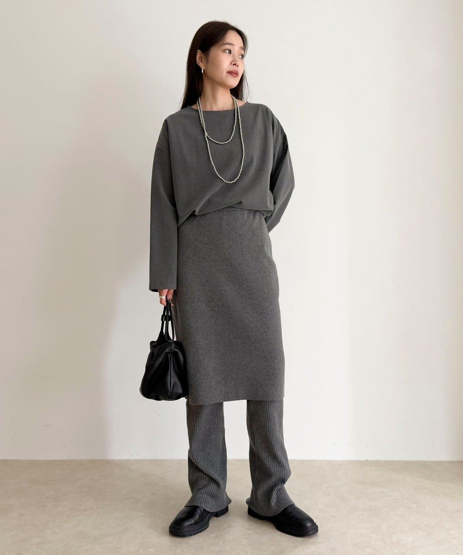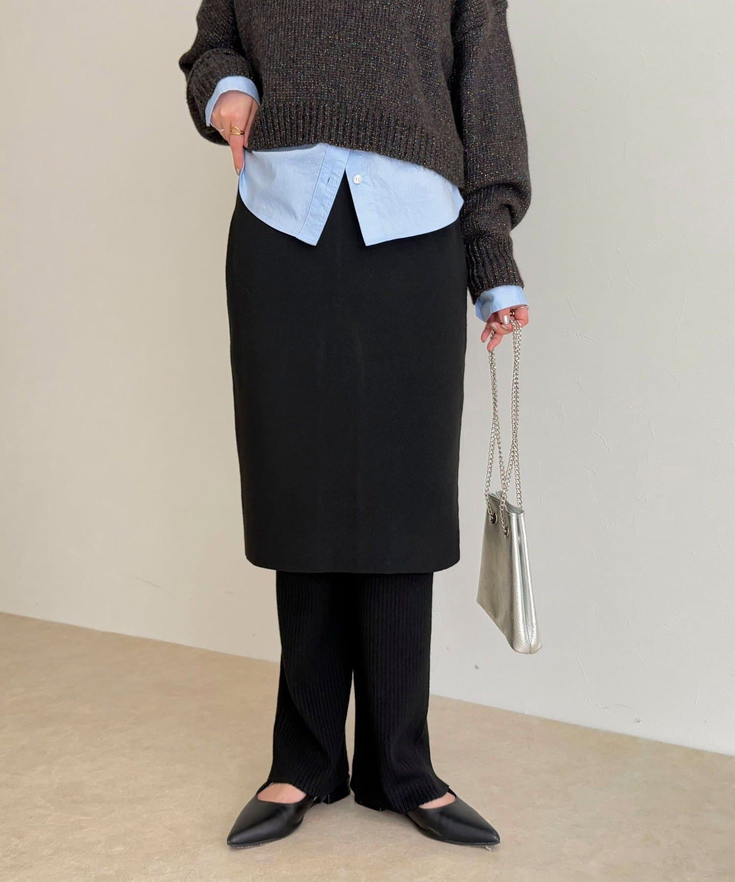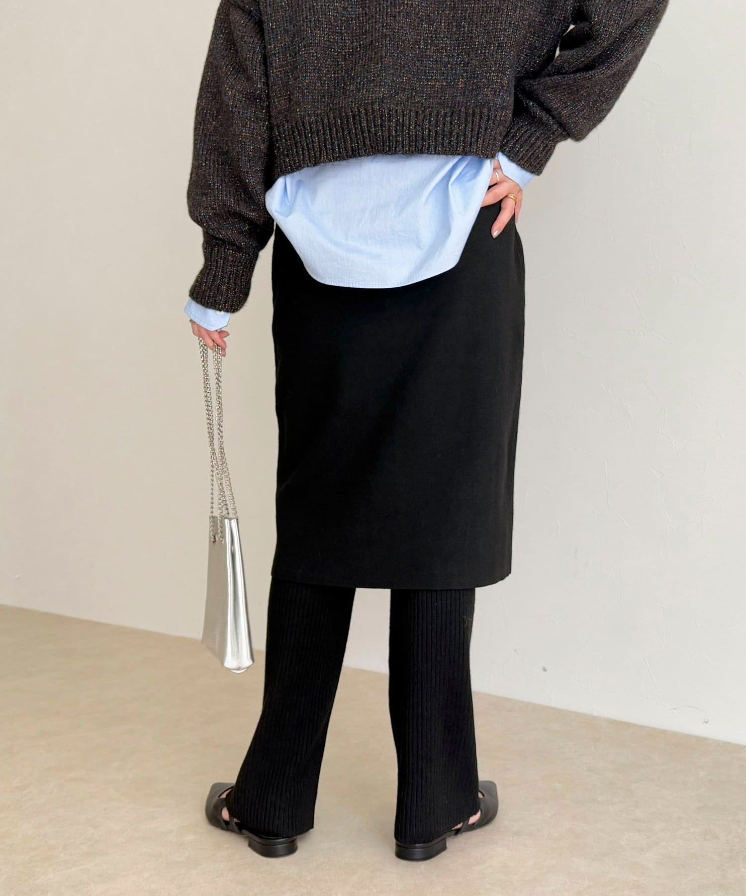 156cmスタッフ(38サイズ着用):リブ素材は伸びが良く窮屈感がなく、長時間の着用でも快適でした!気になるヒップラインをカバーしてくれて、脚がきれいに見えました。トップスをシンプルに合わせるだけで旬のスタイルが完成します◎