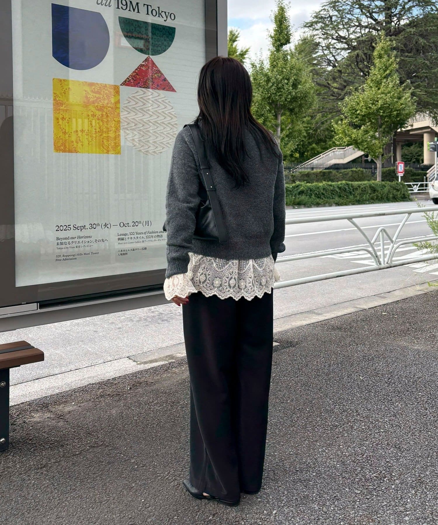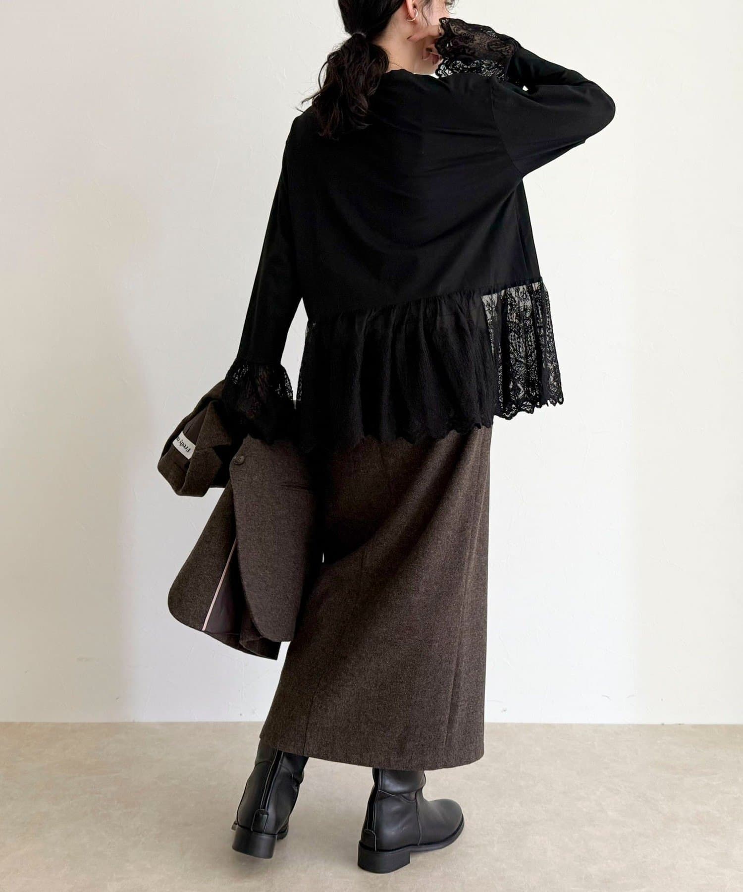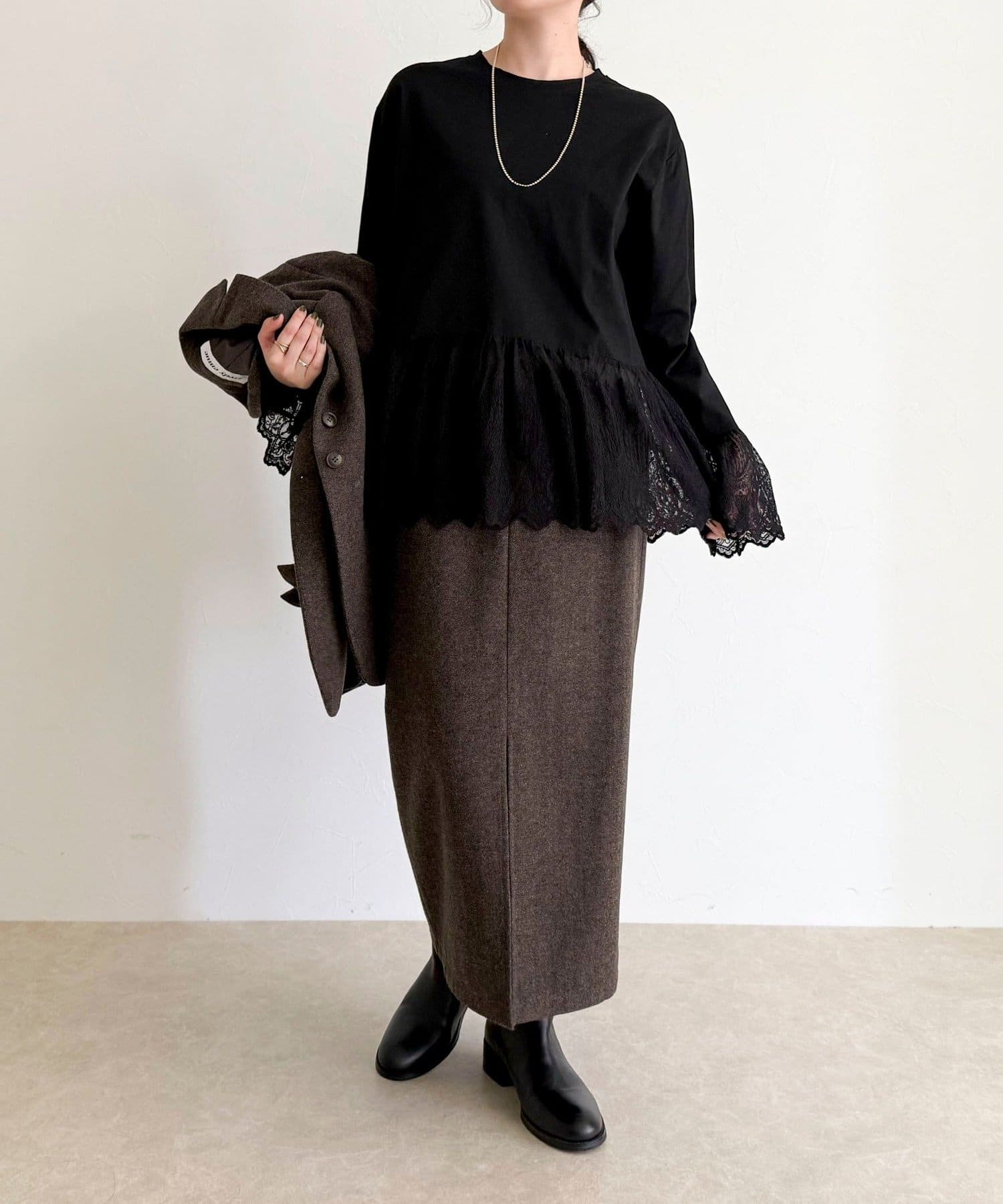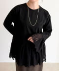 ・裾と袖にあしらったレースがアクセントになり、重ね着風のデザインで着こなしの幅が広がります