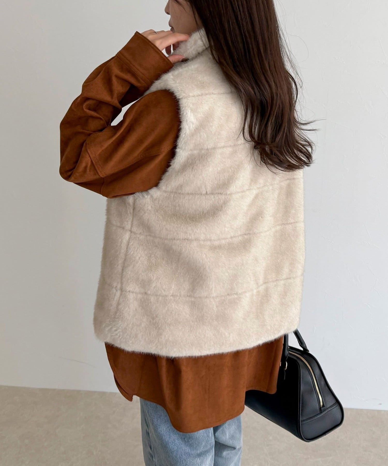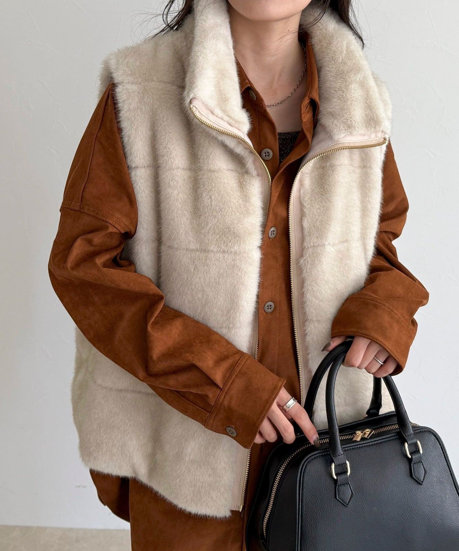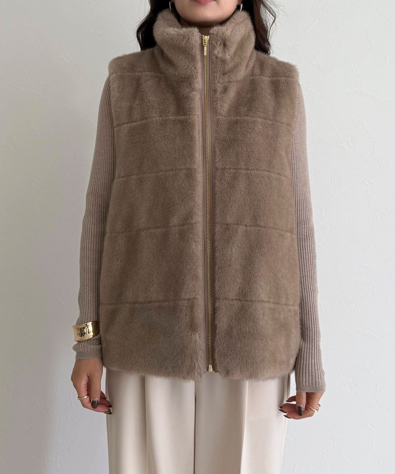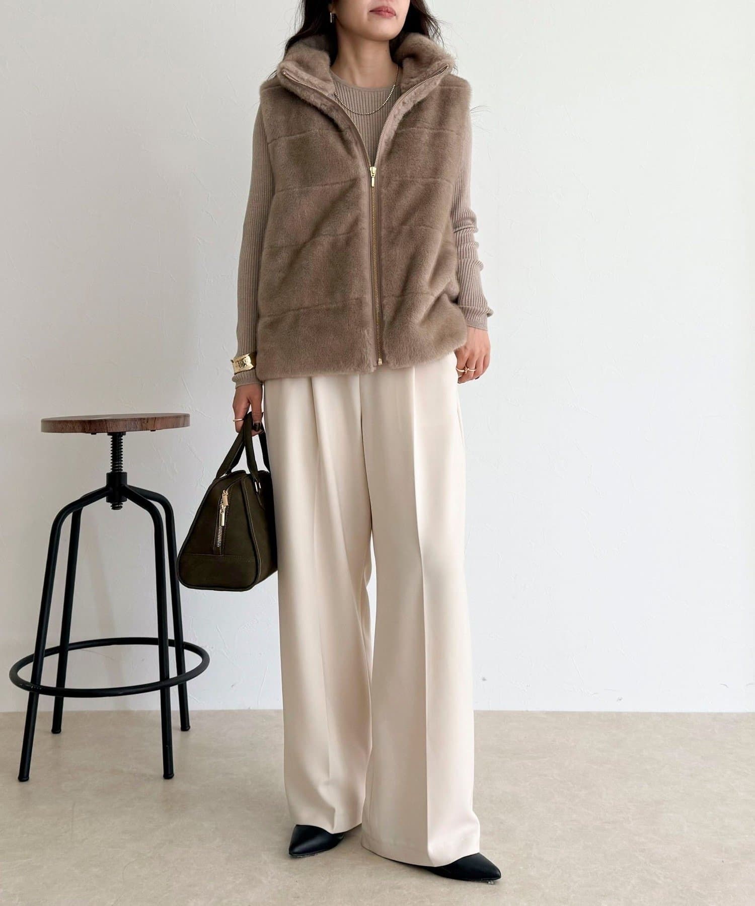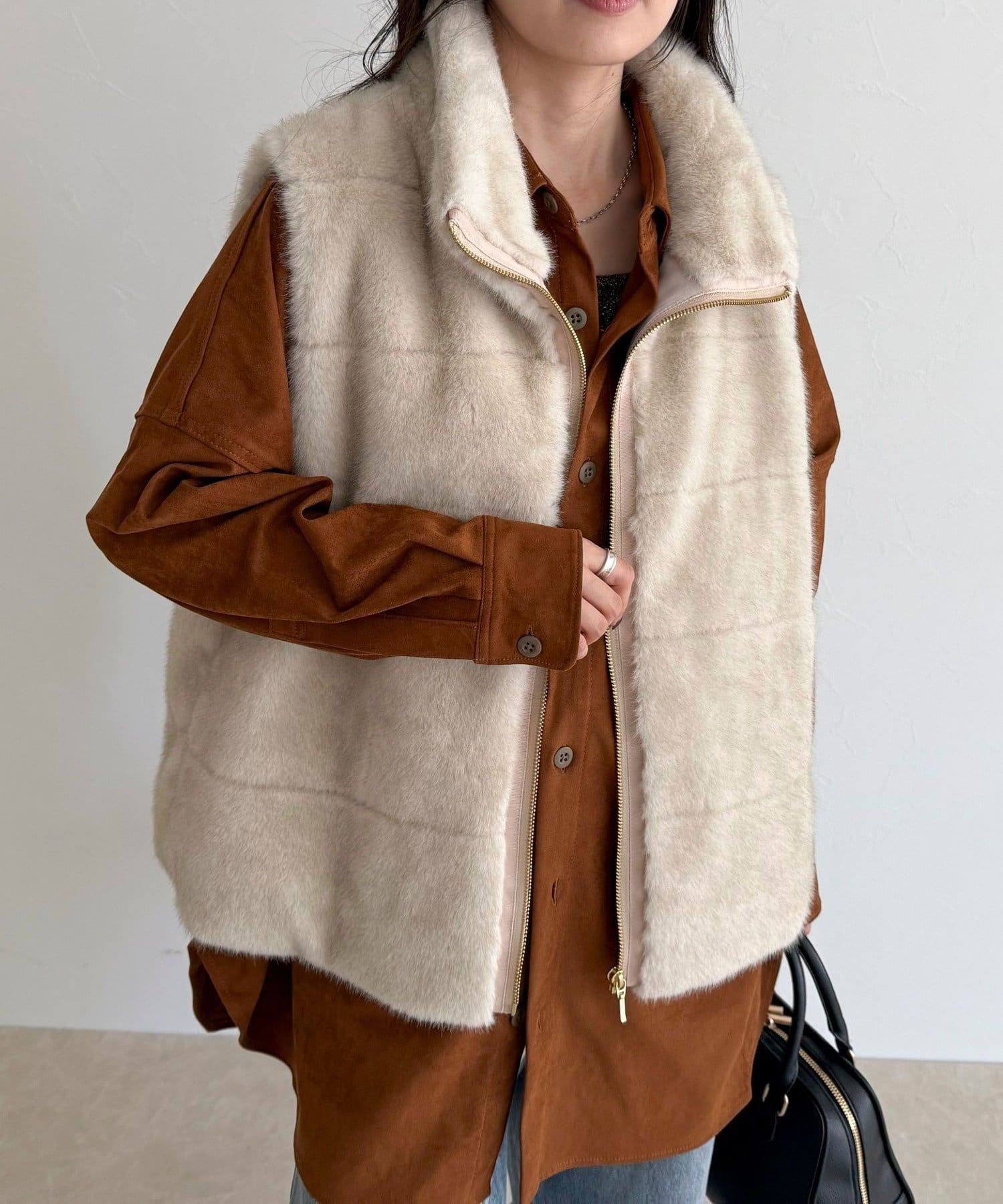 ・ふわふわのファーが魅力的なボーダーキルトファーベスト