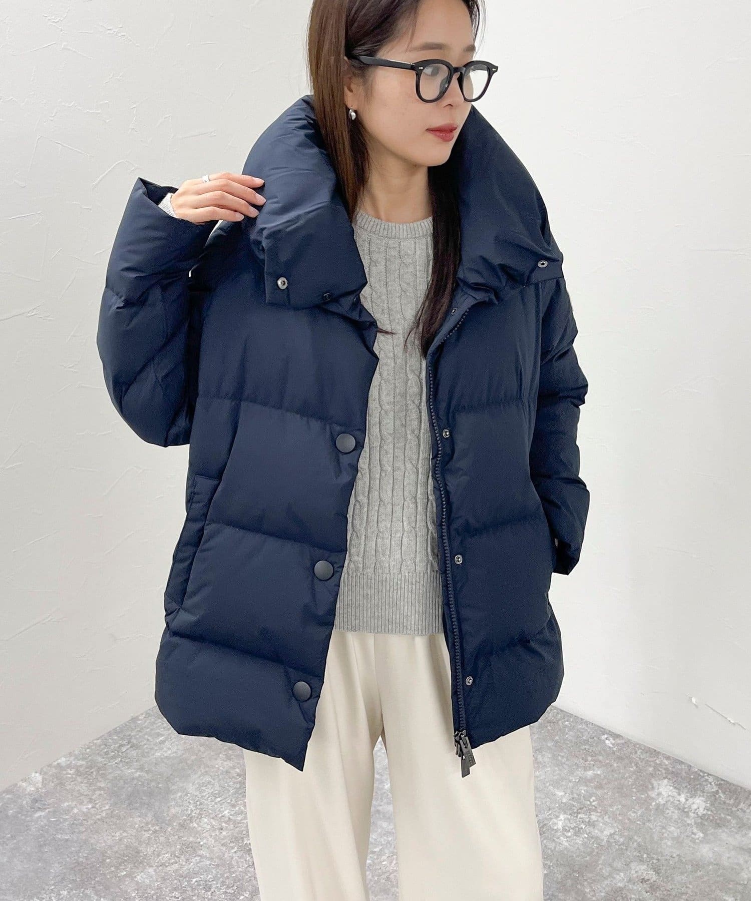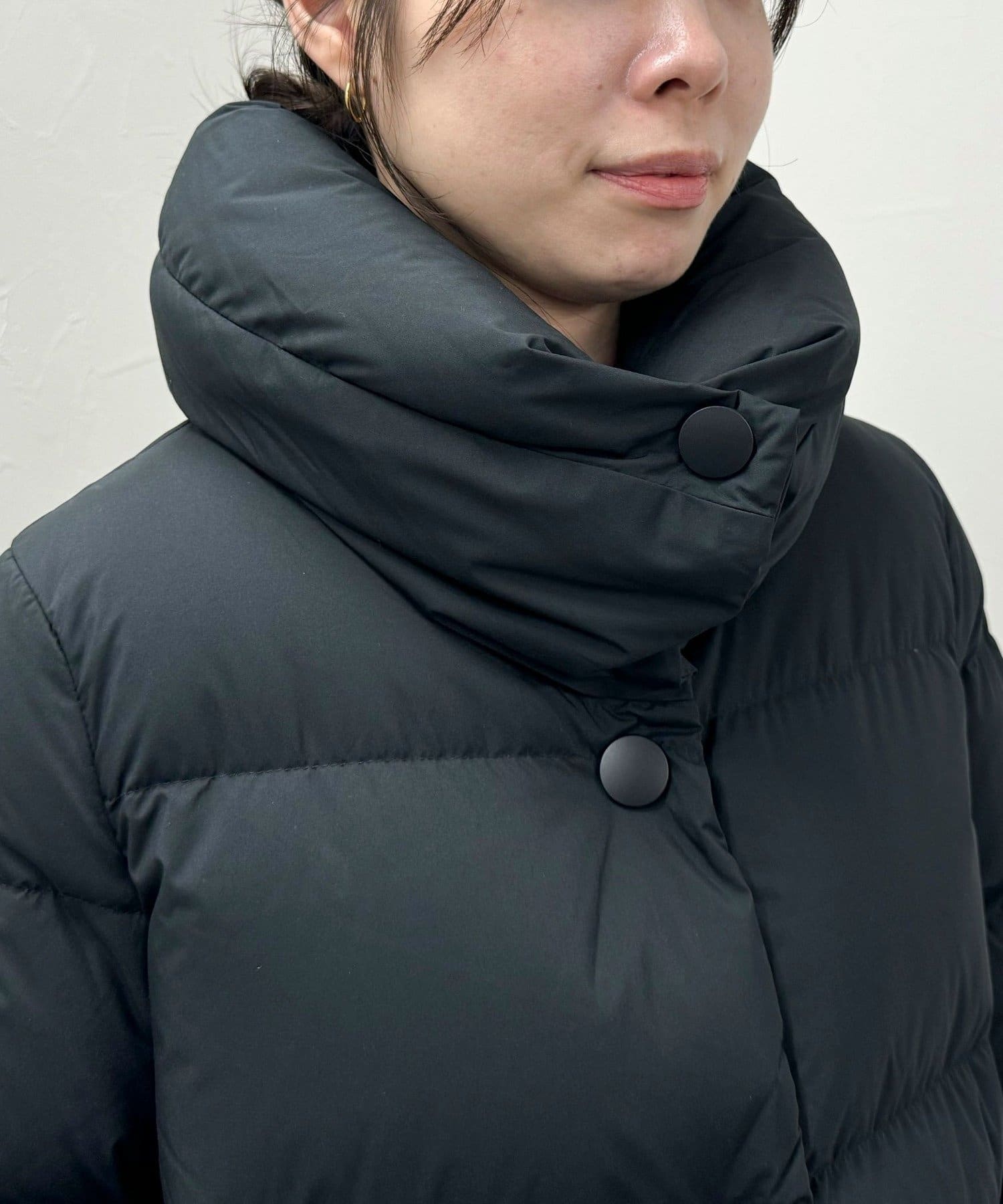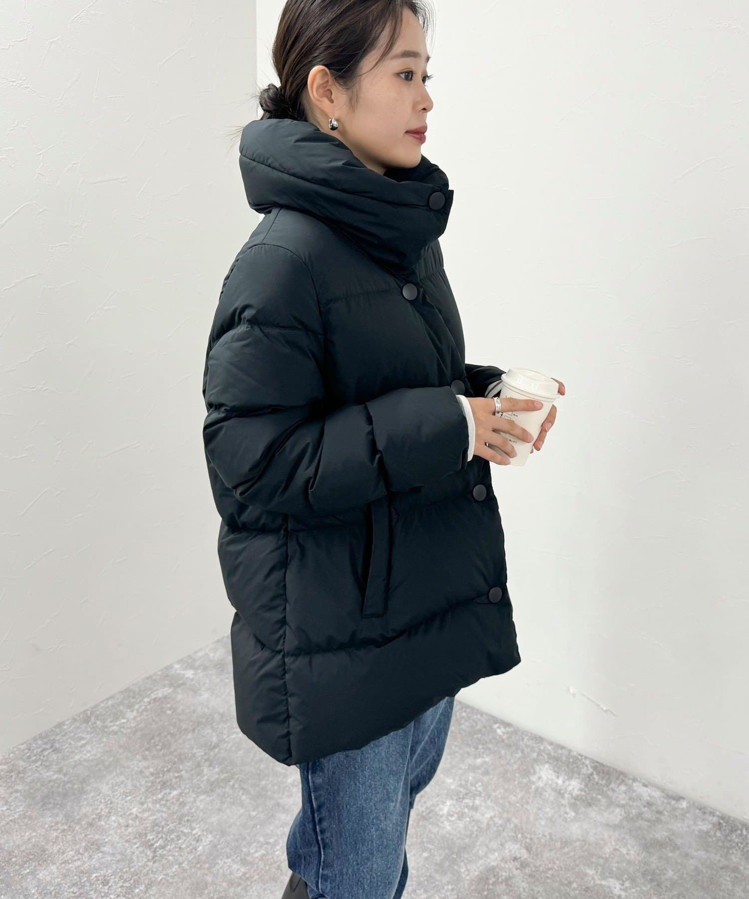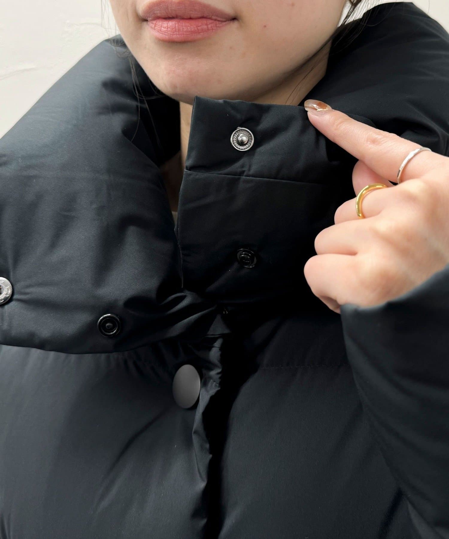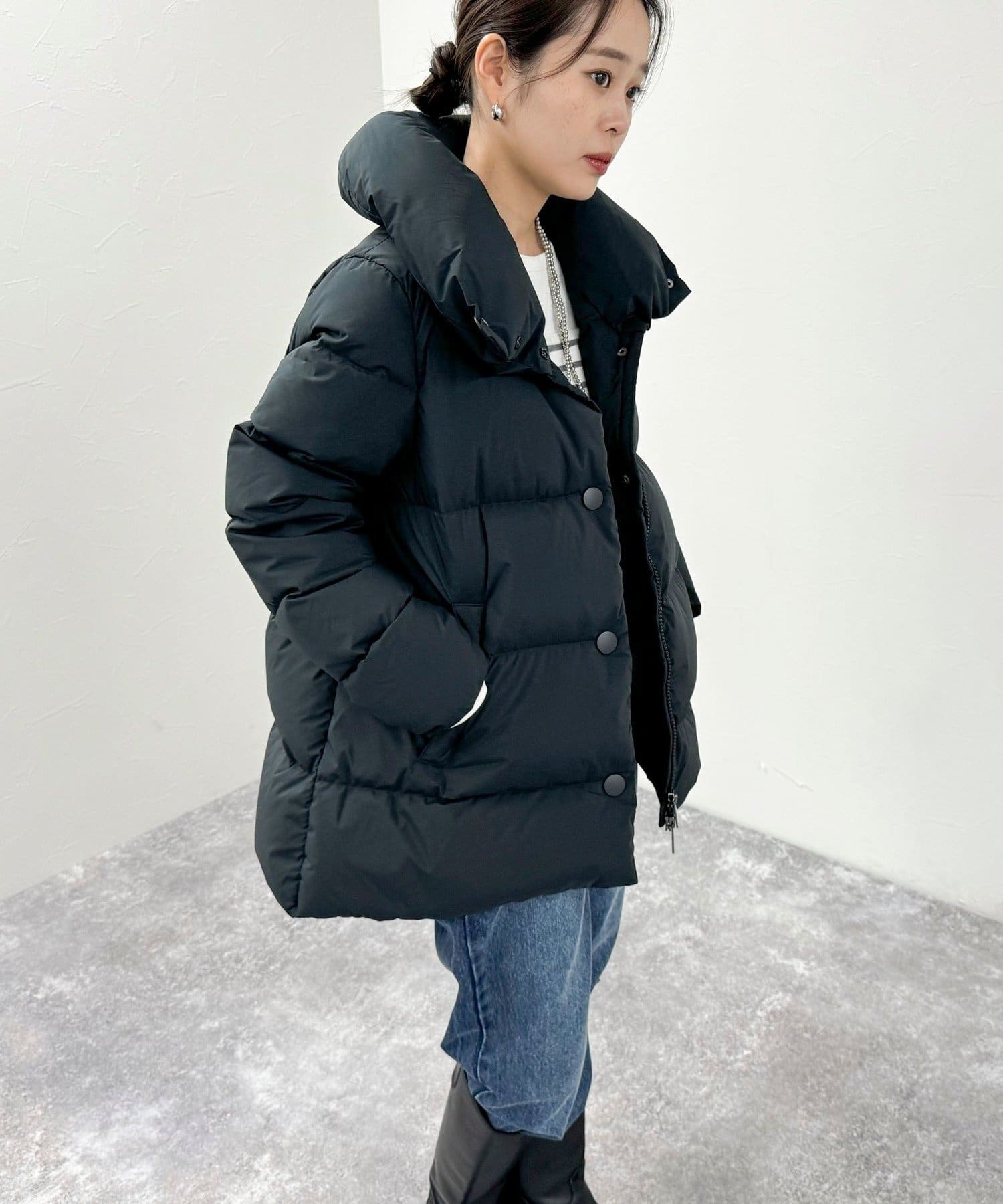 ・ボリュームのある襟元とフロントのドットボタンがポイントのダウンジャケット