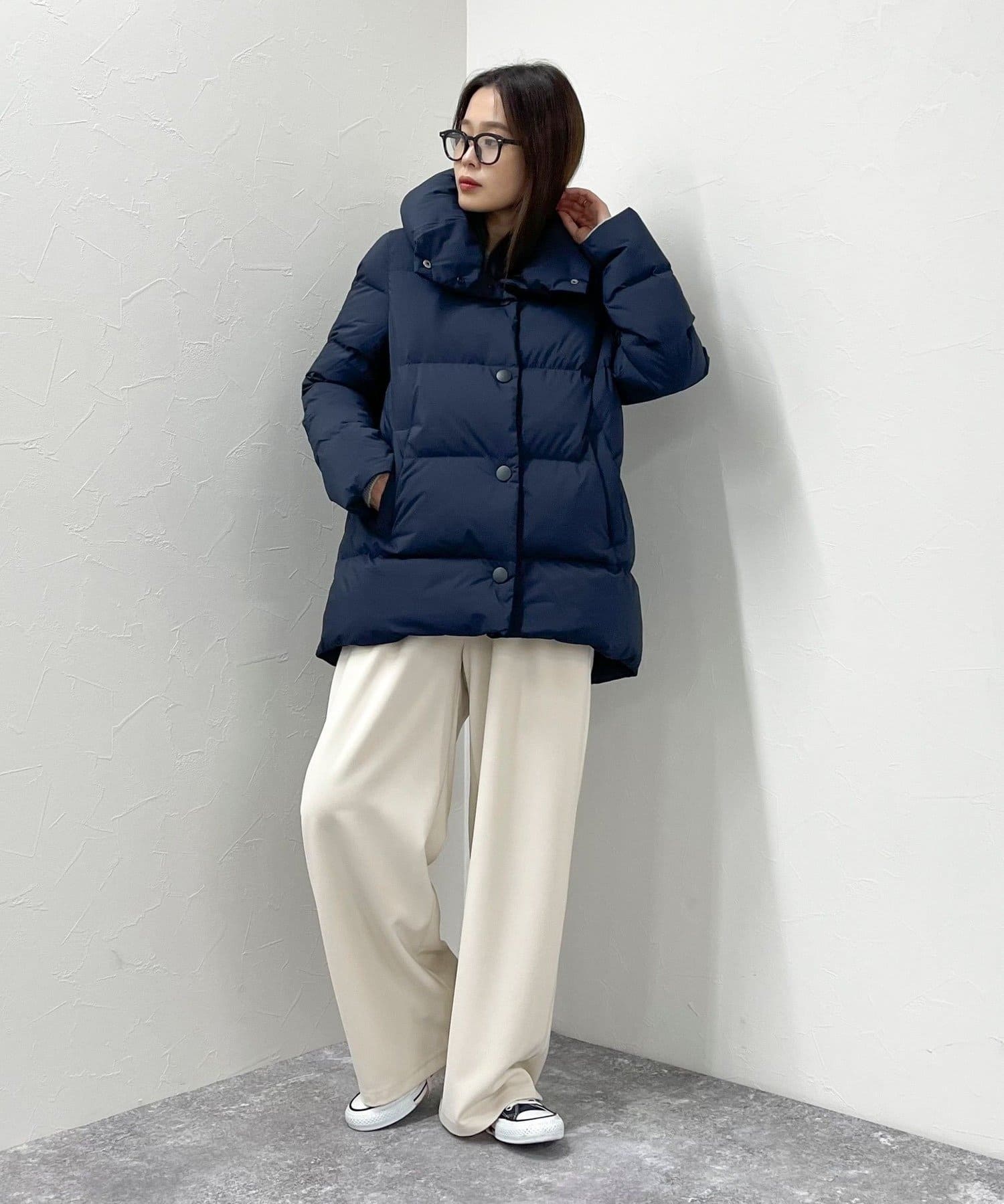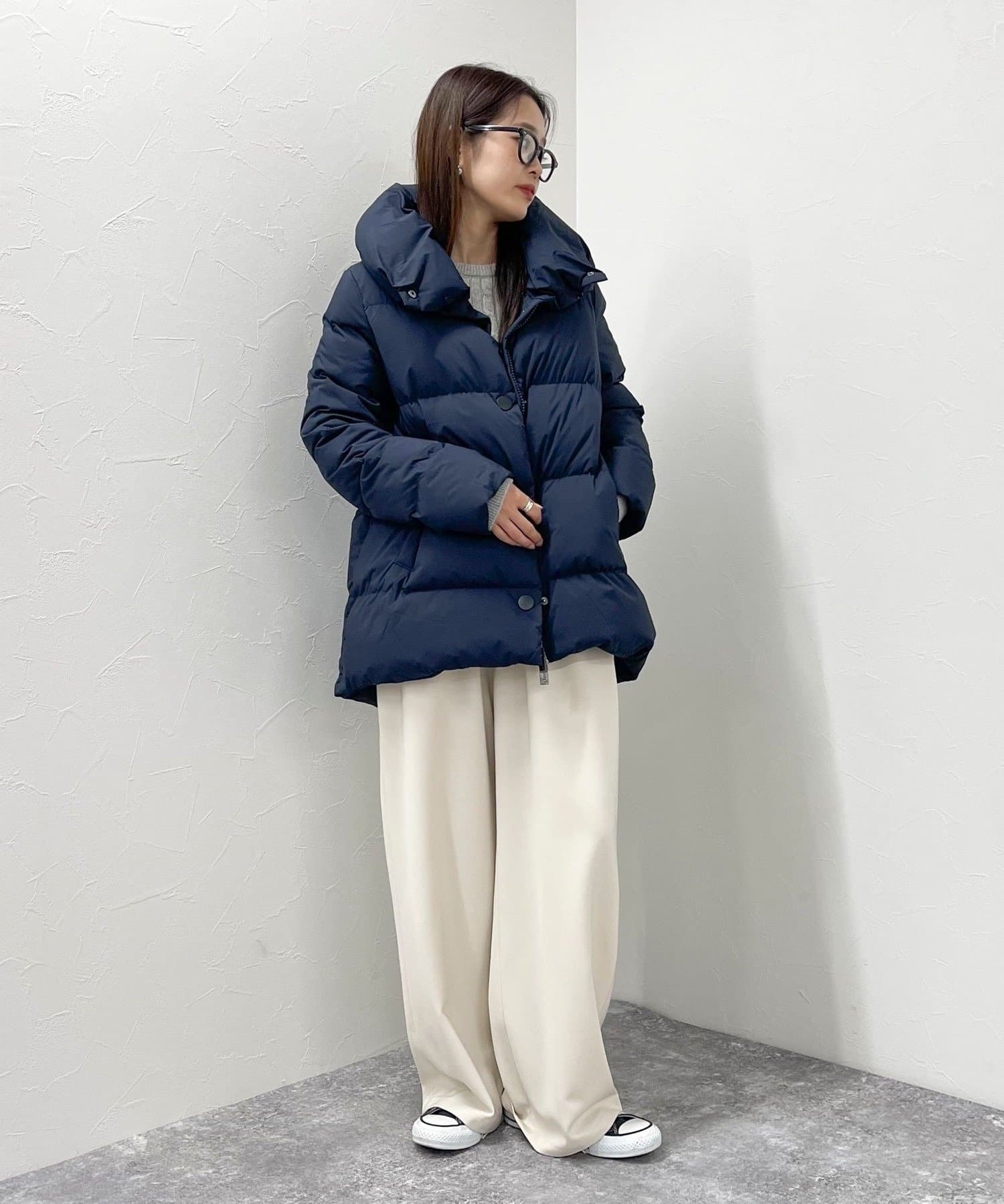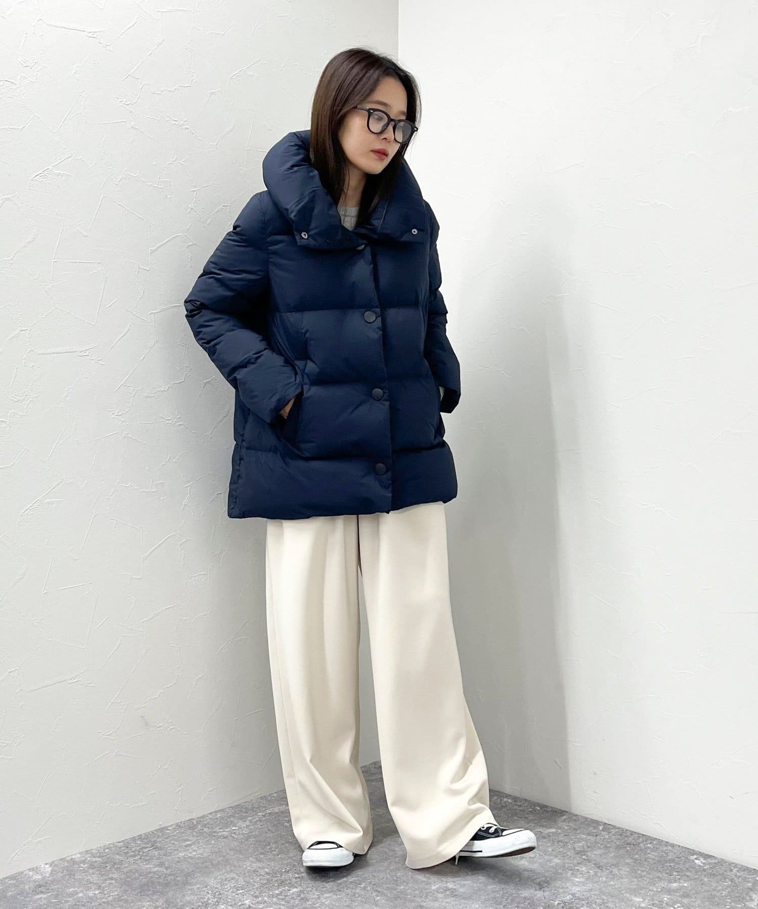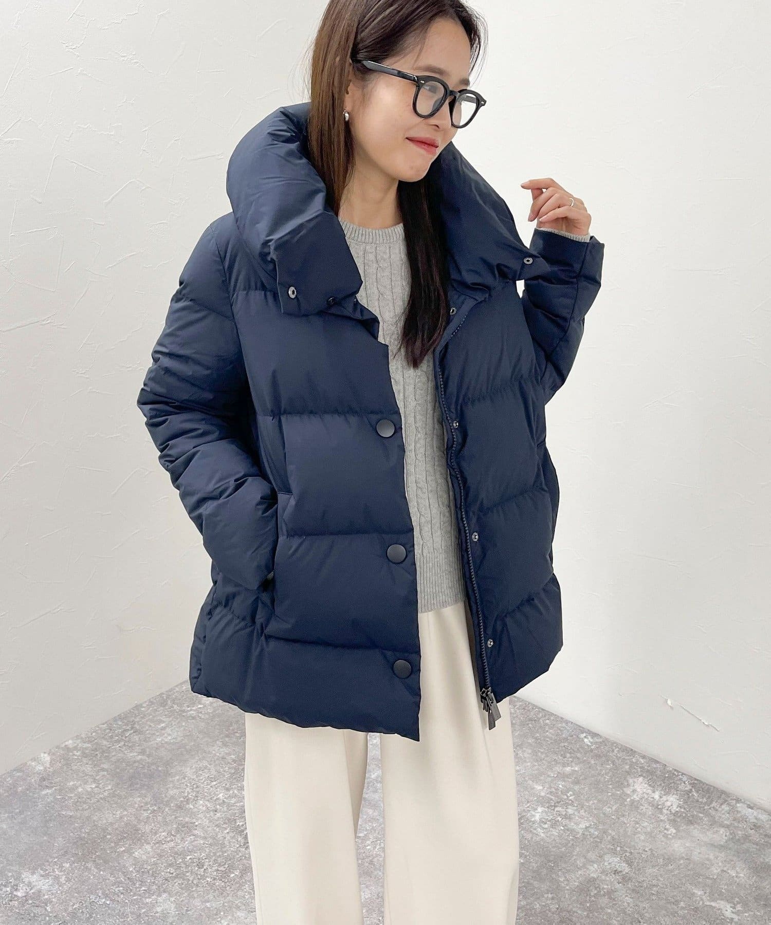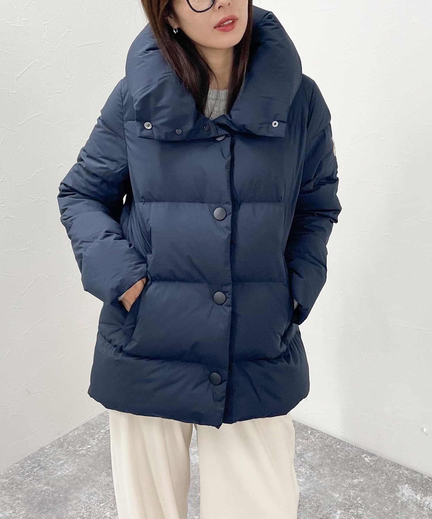 ・ボリュームのある襟元とフロントのドットボタンがポイントのダウンジャケット