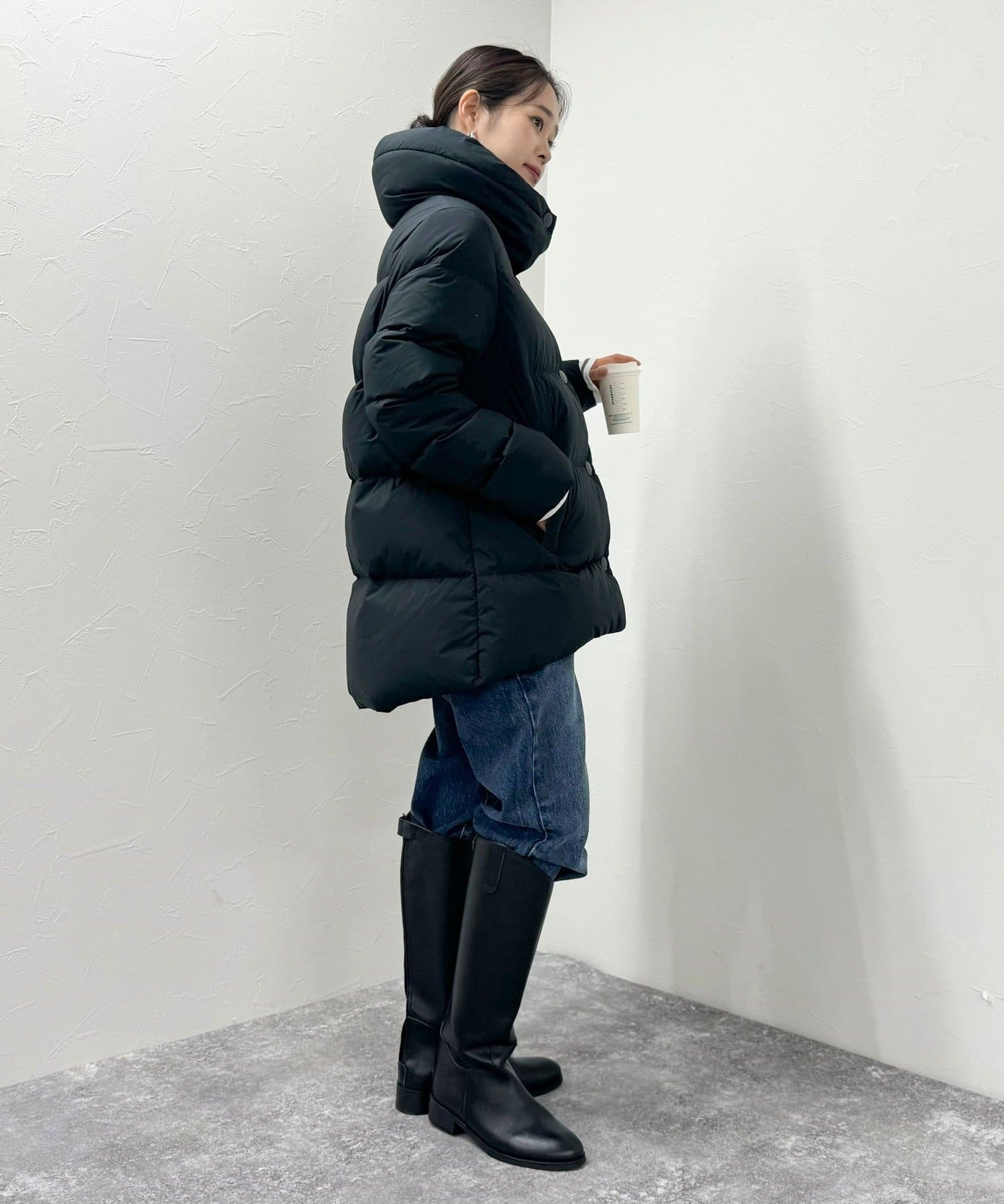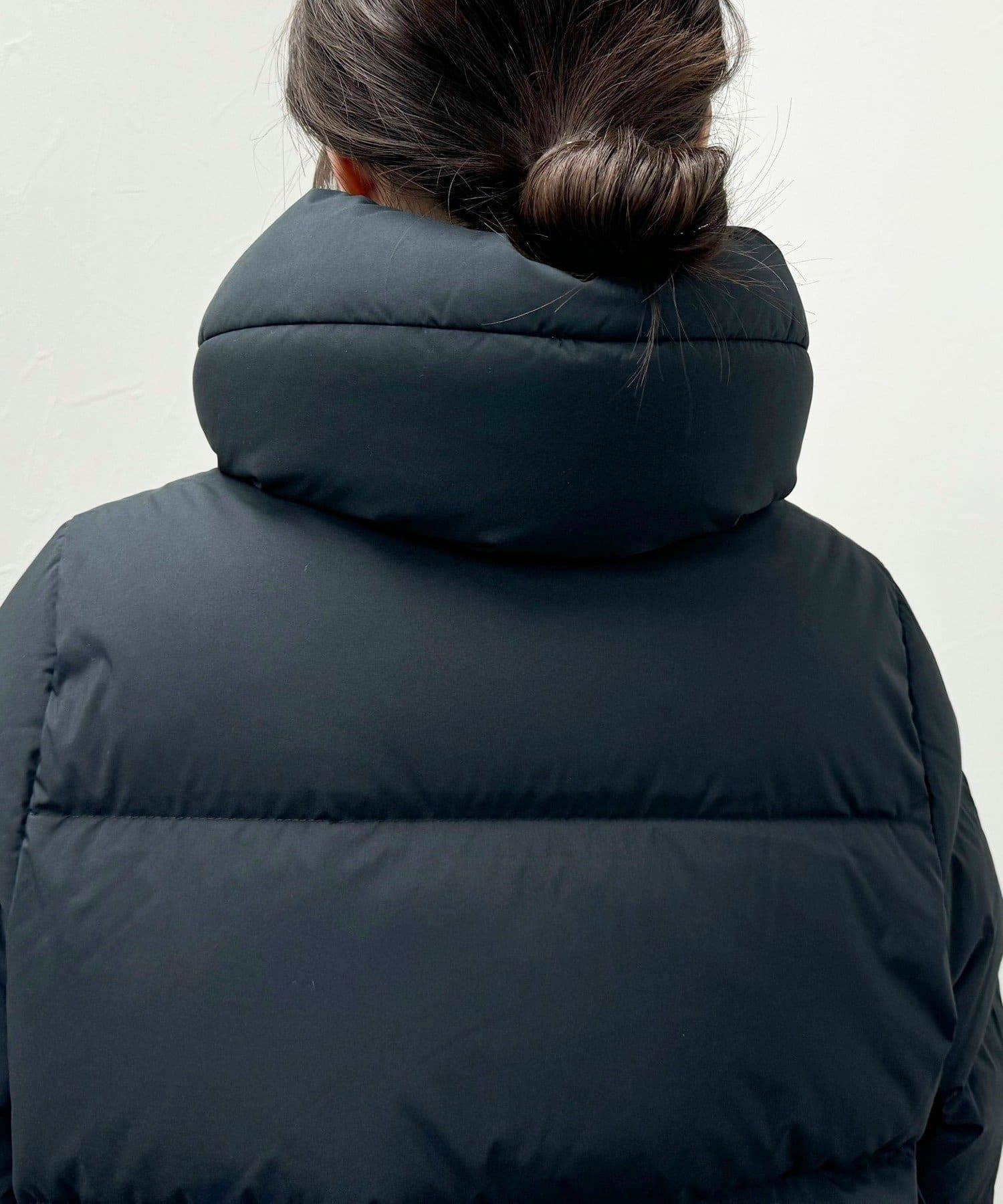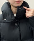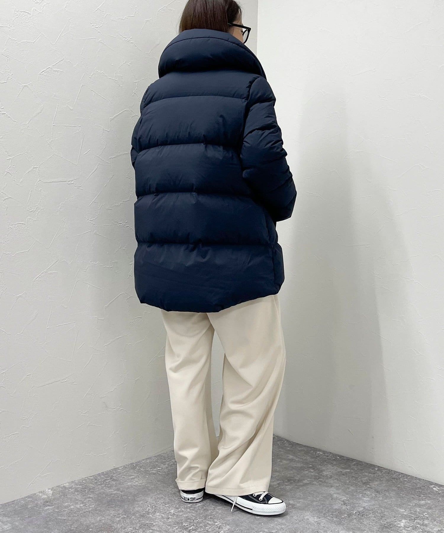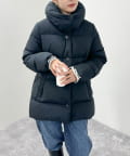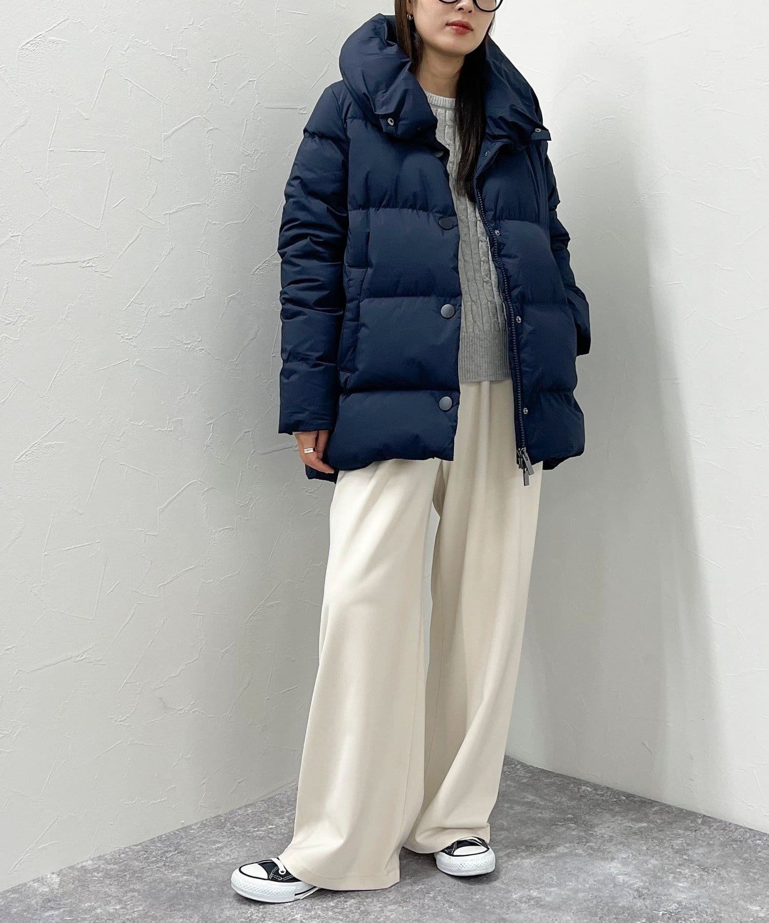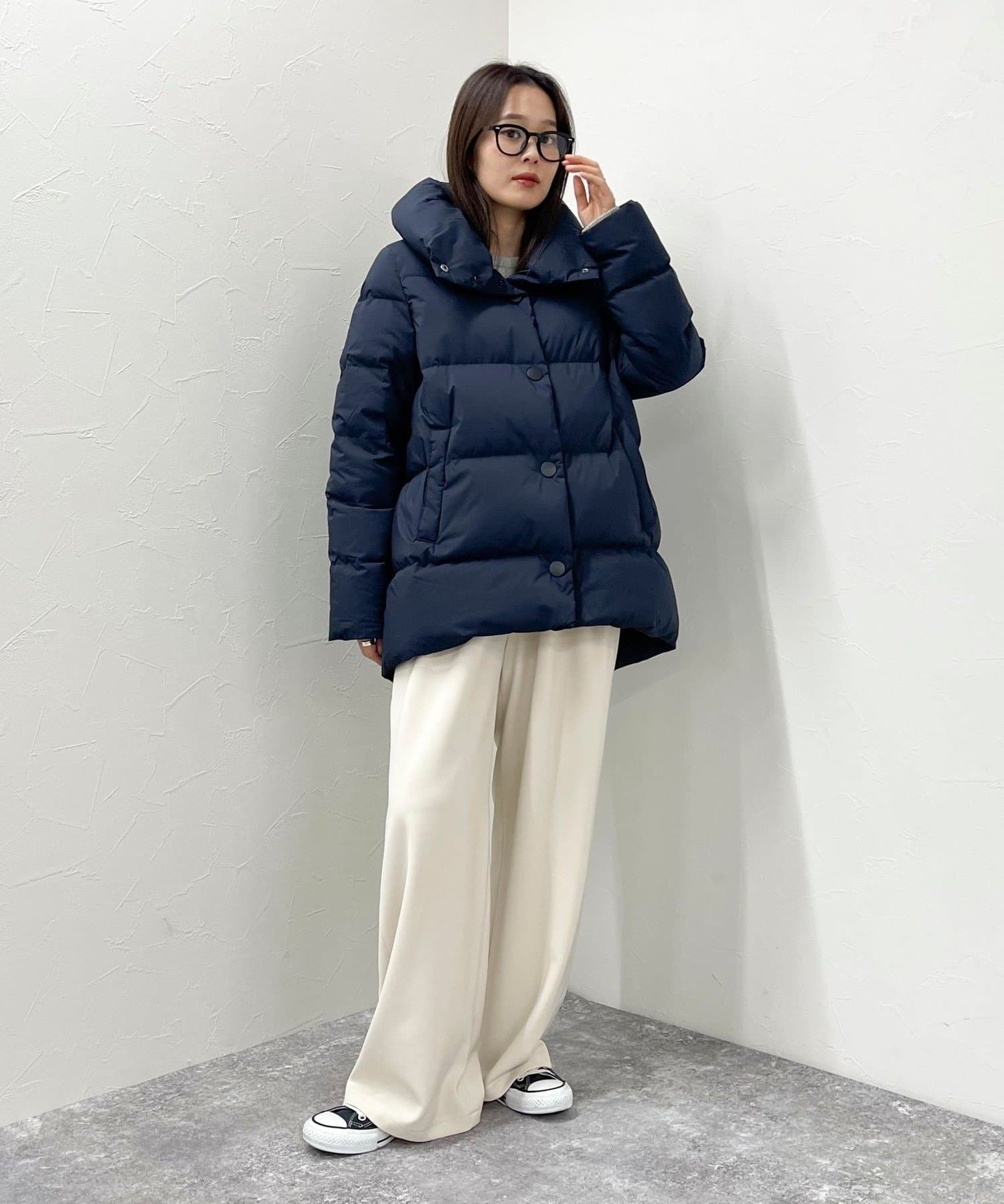 ・ボリュームのある襟元とフロントのドットボタンがポイントのダウンジャケット
