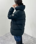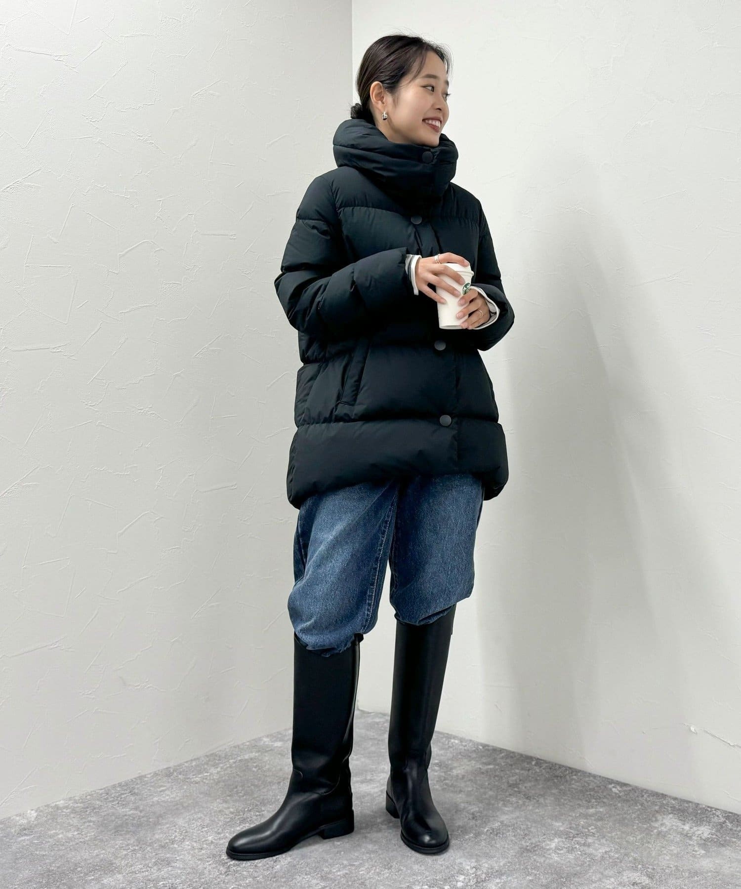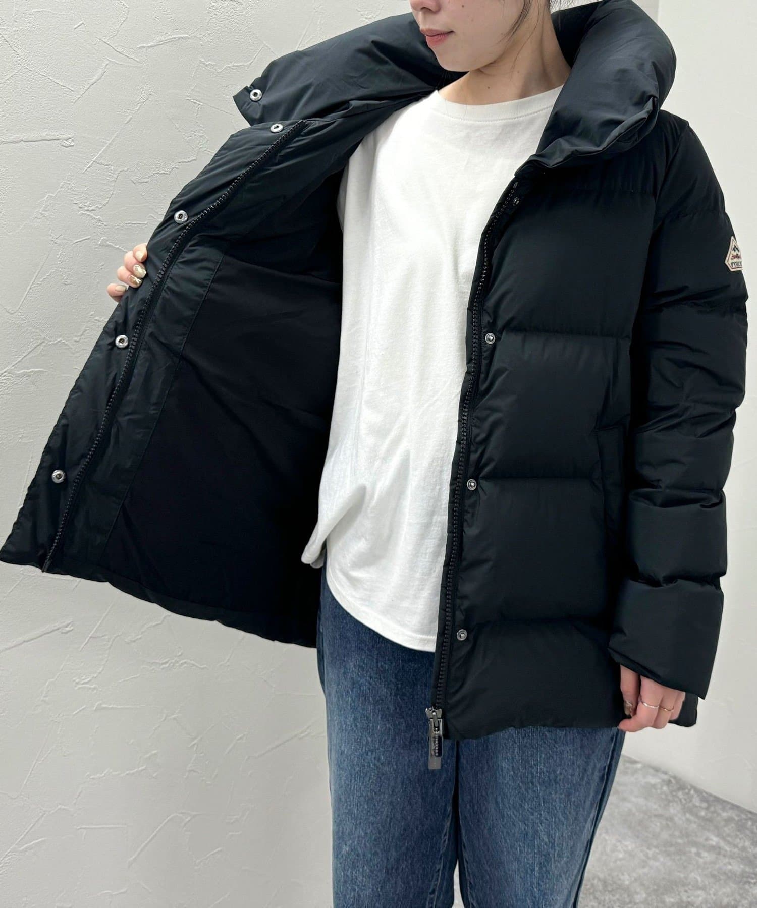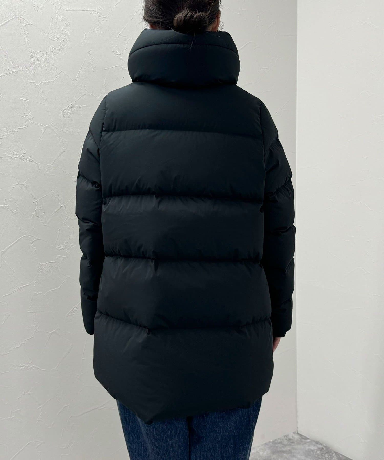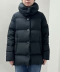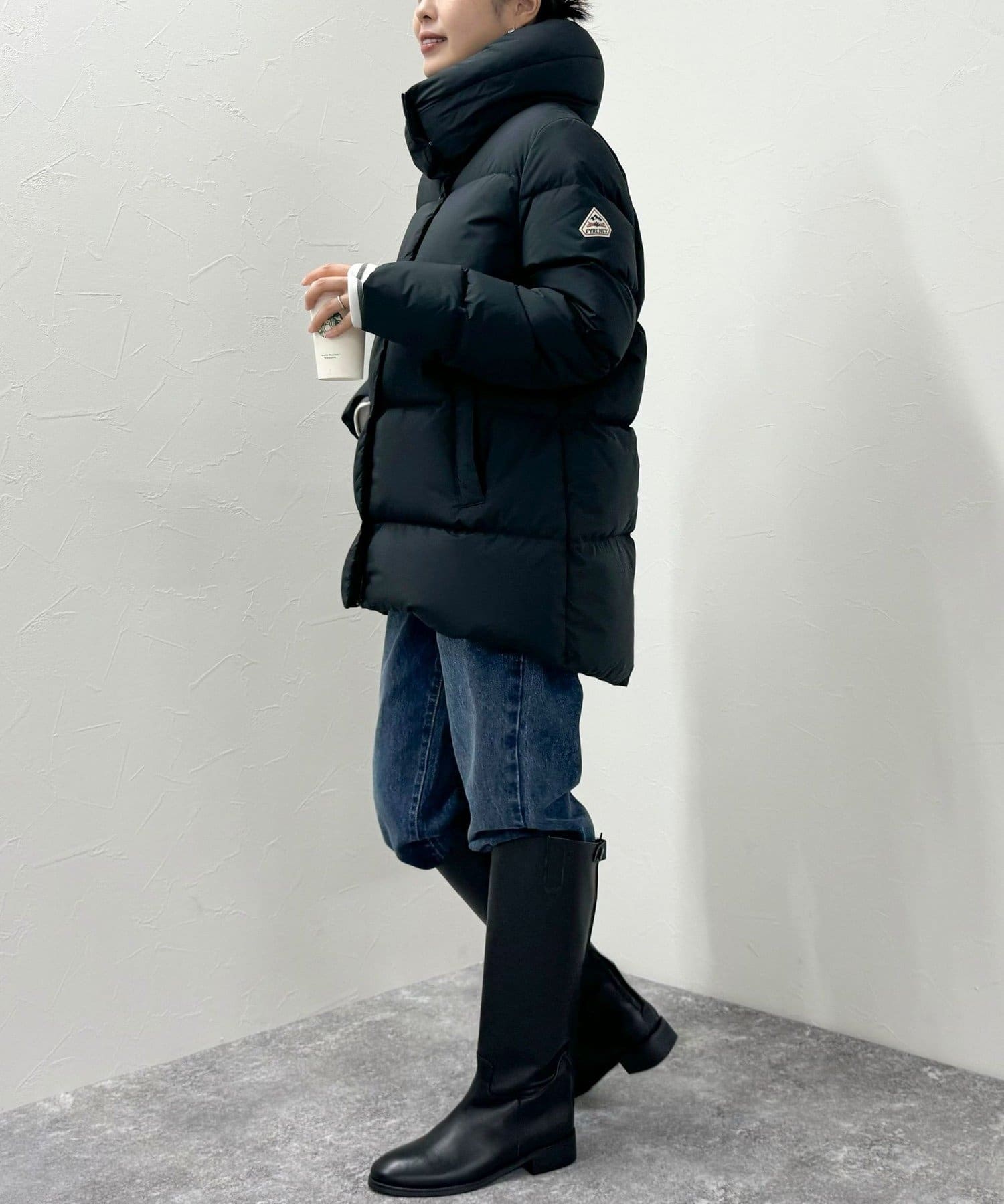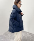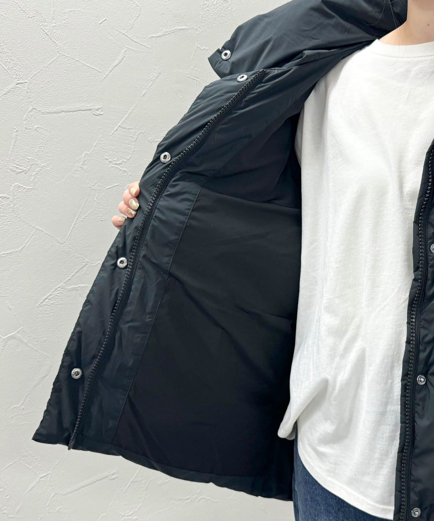 ・ボリュームのある襟元とフロントのドットボタンがポイントのダウンジャケット