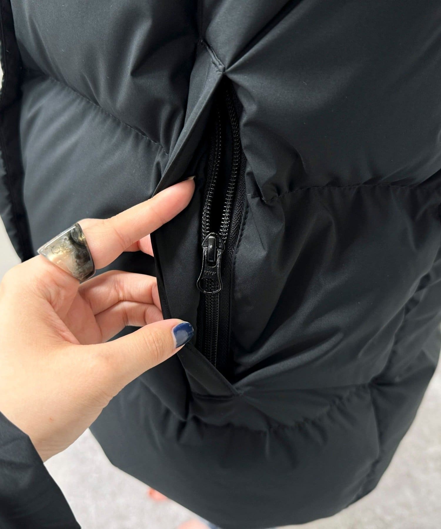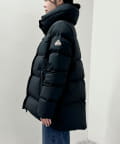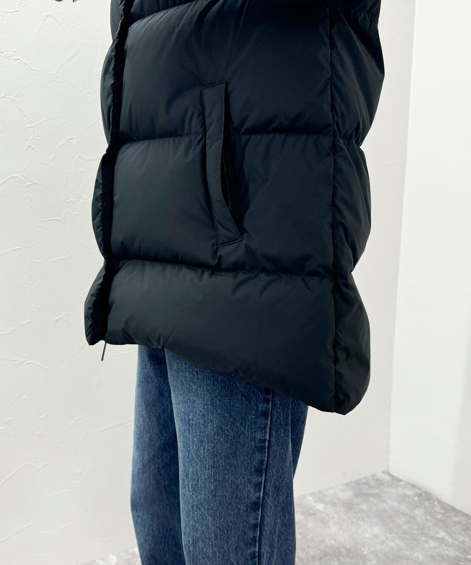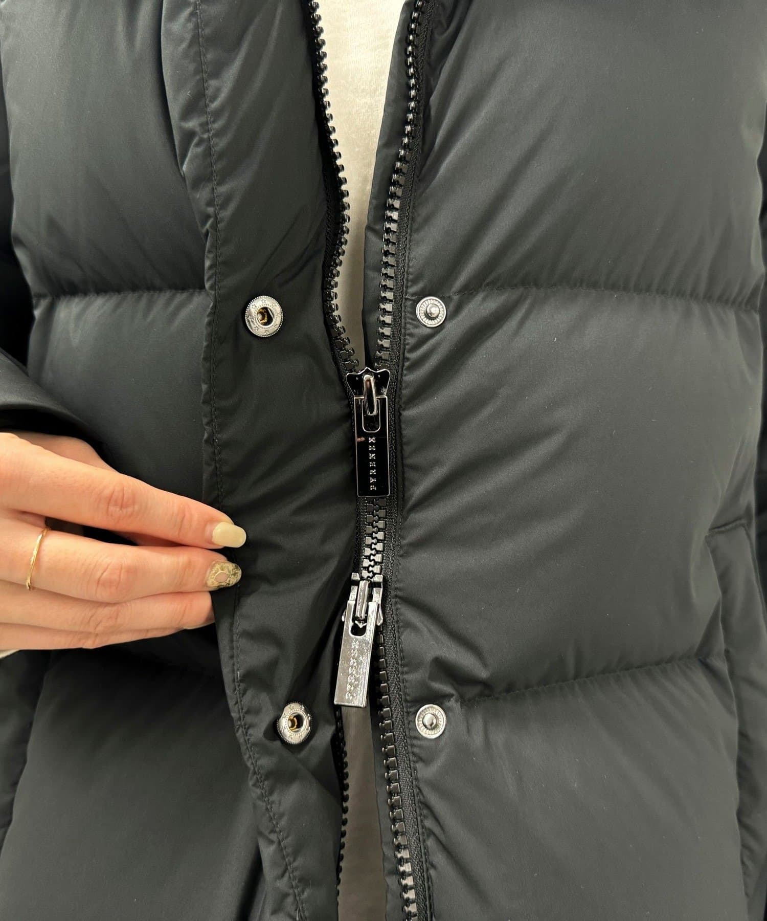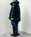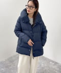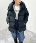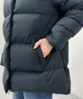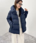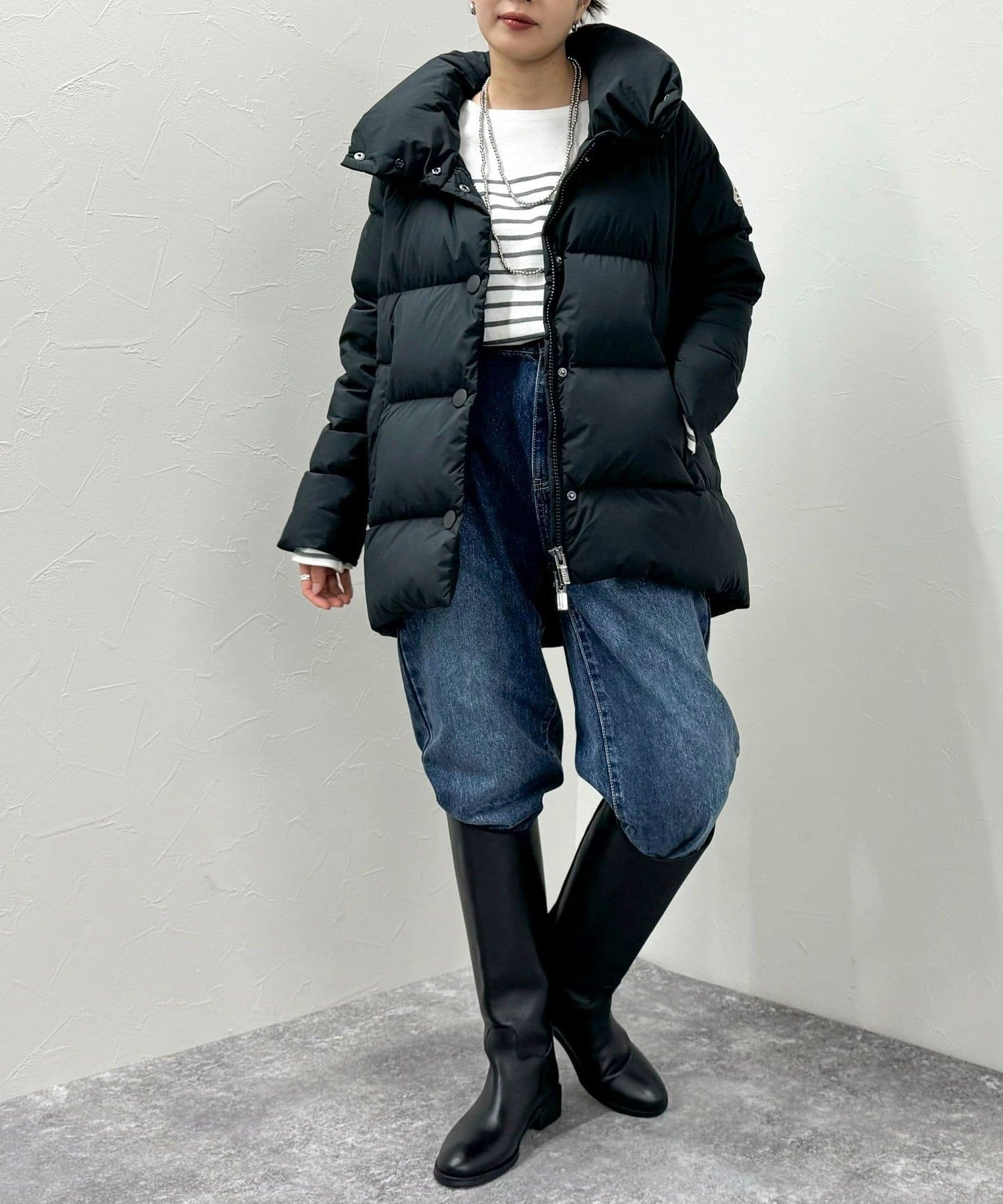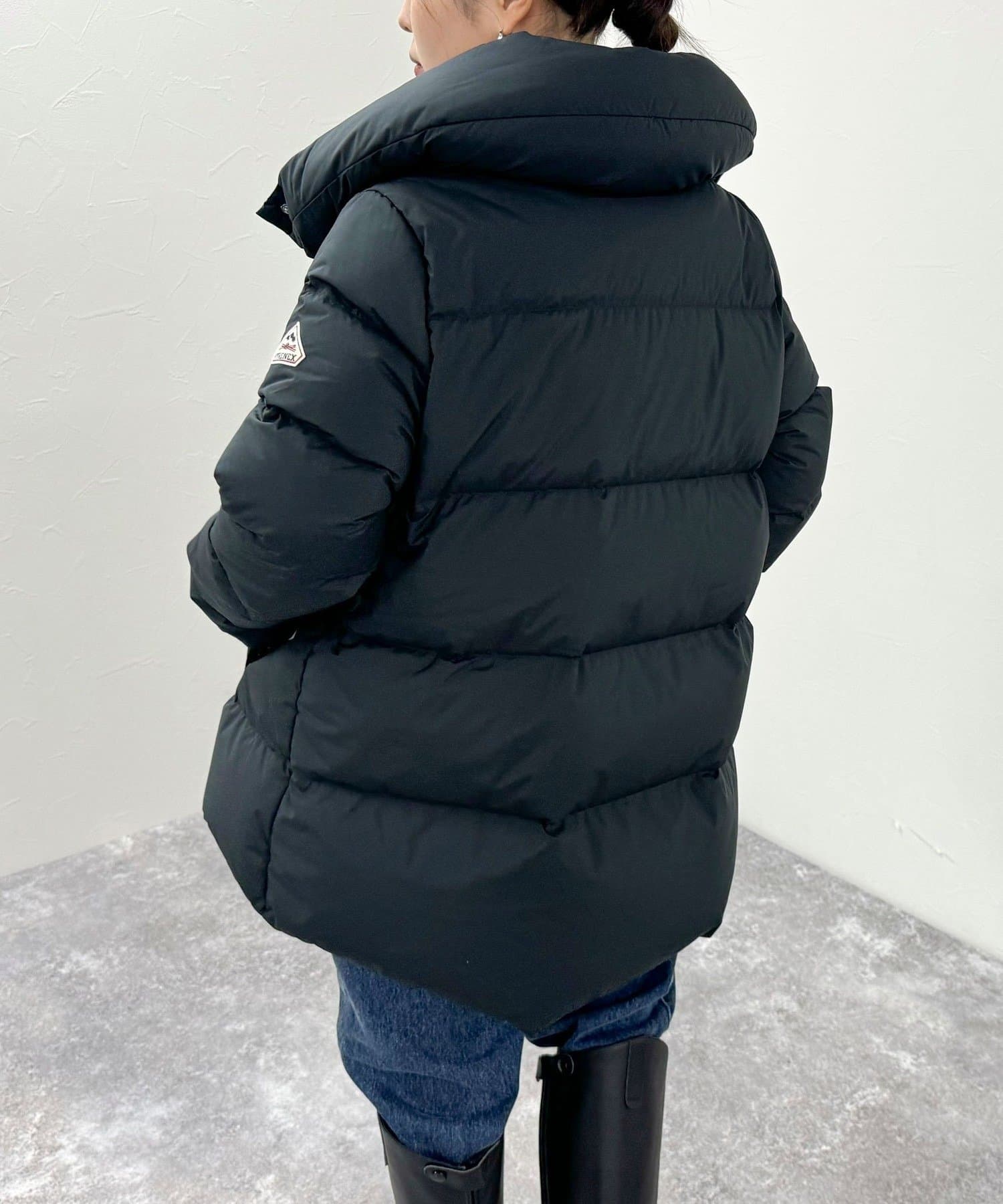・ボリュームのある襟元とフロントのドットボタンがポイントのダウンジャケット