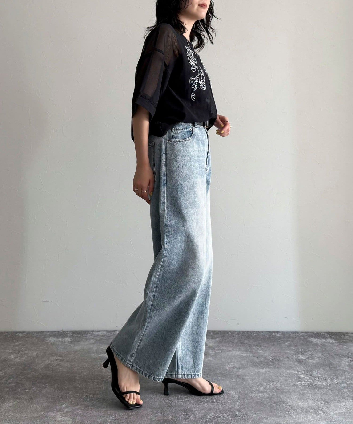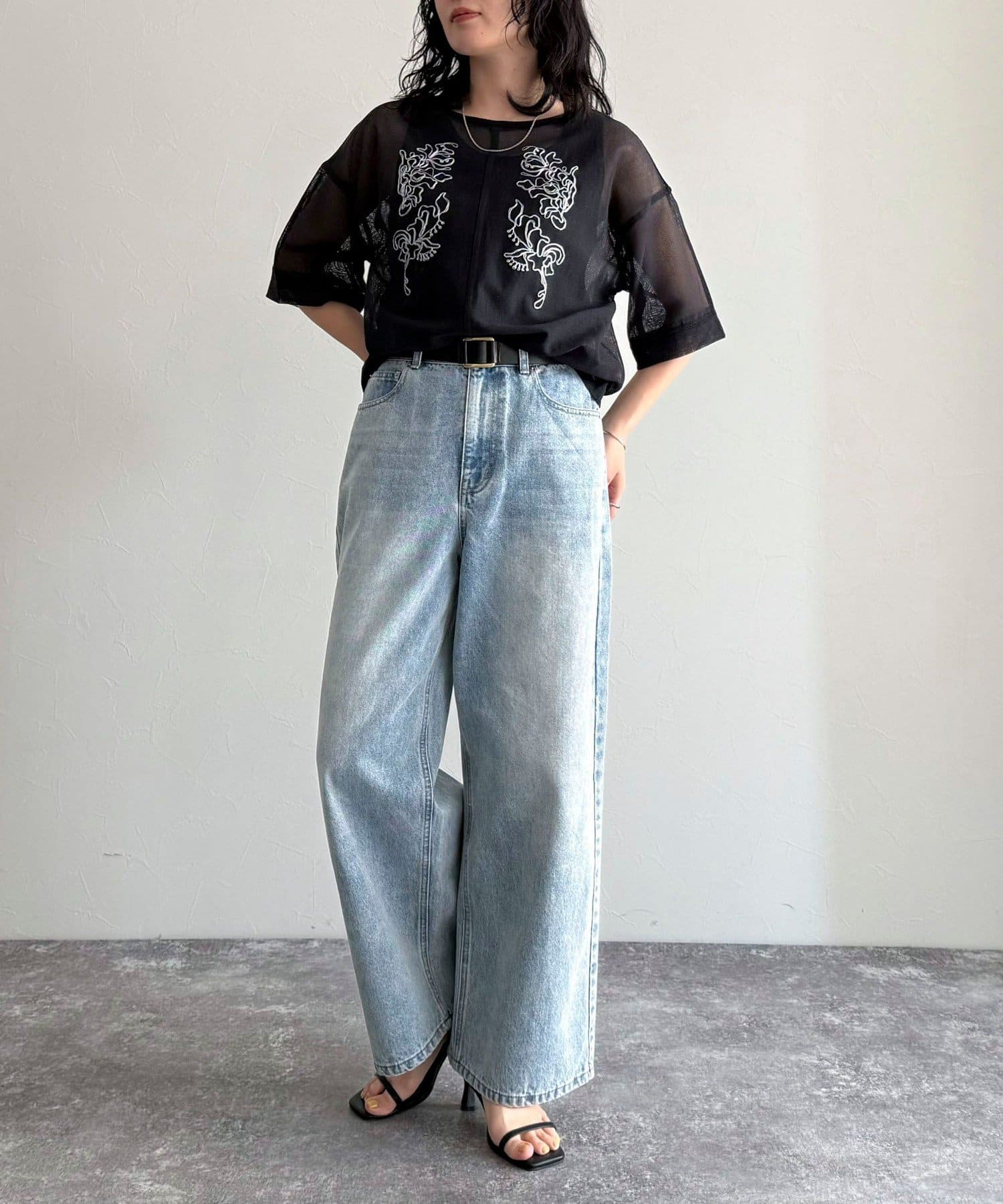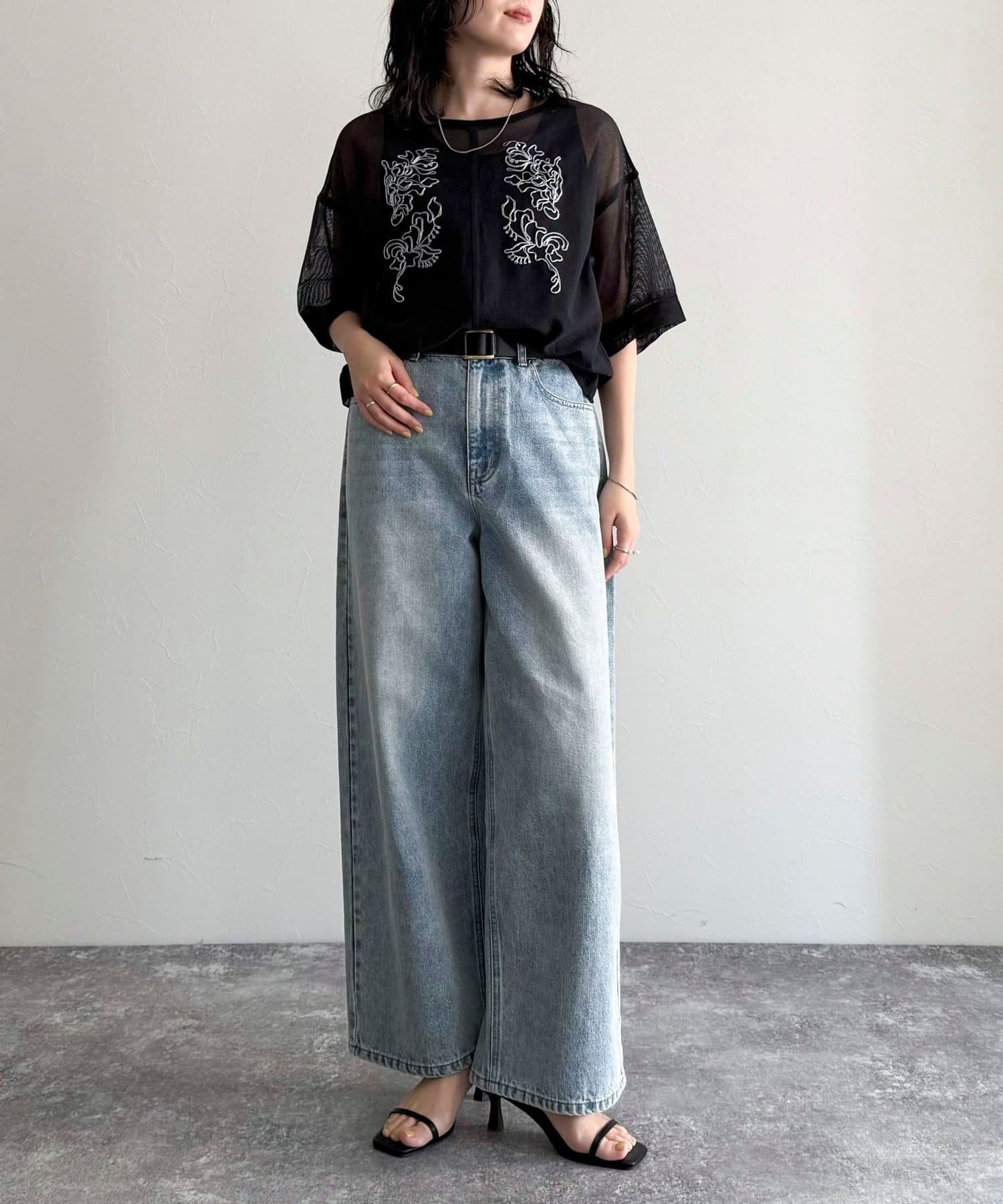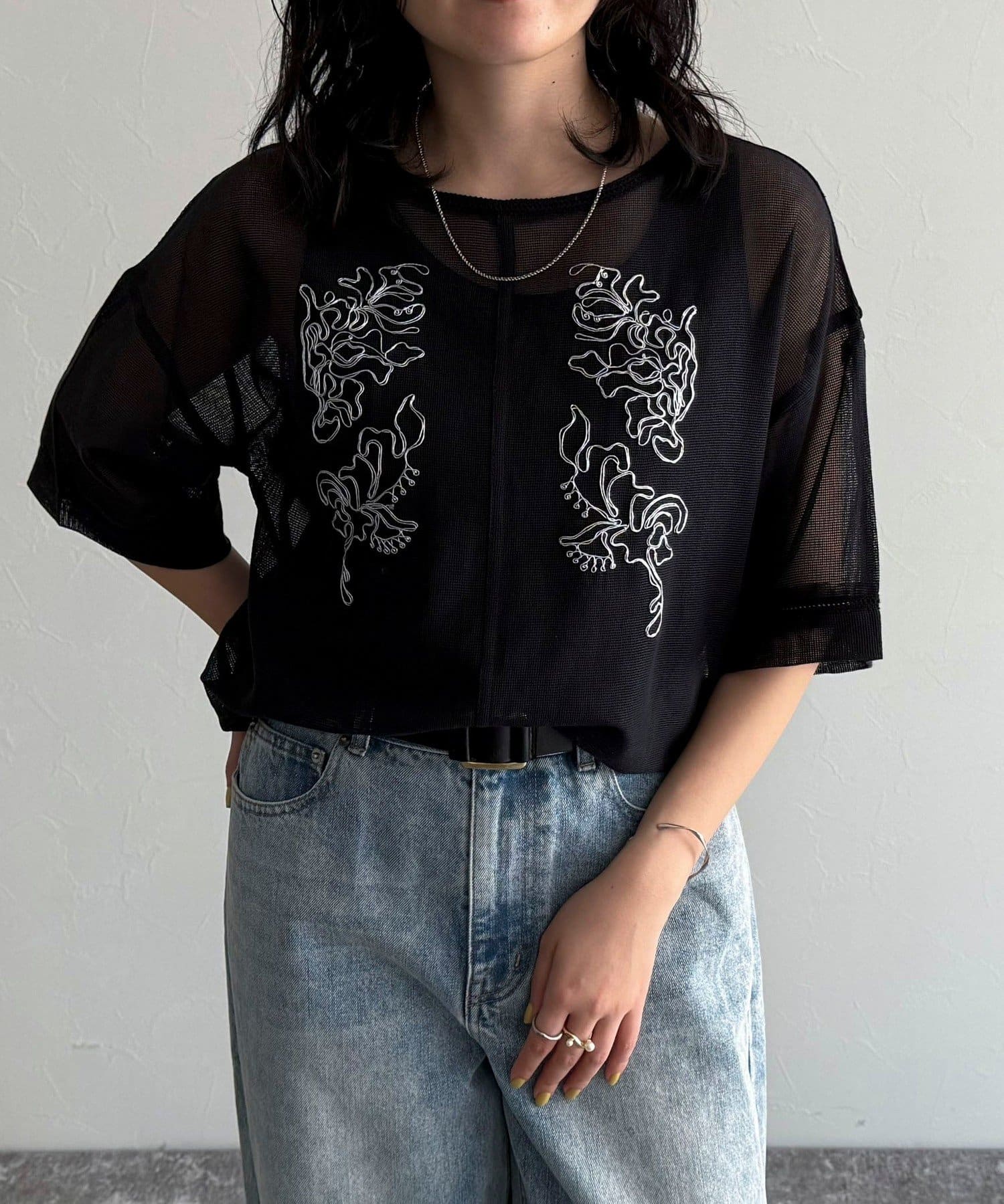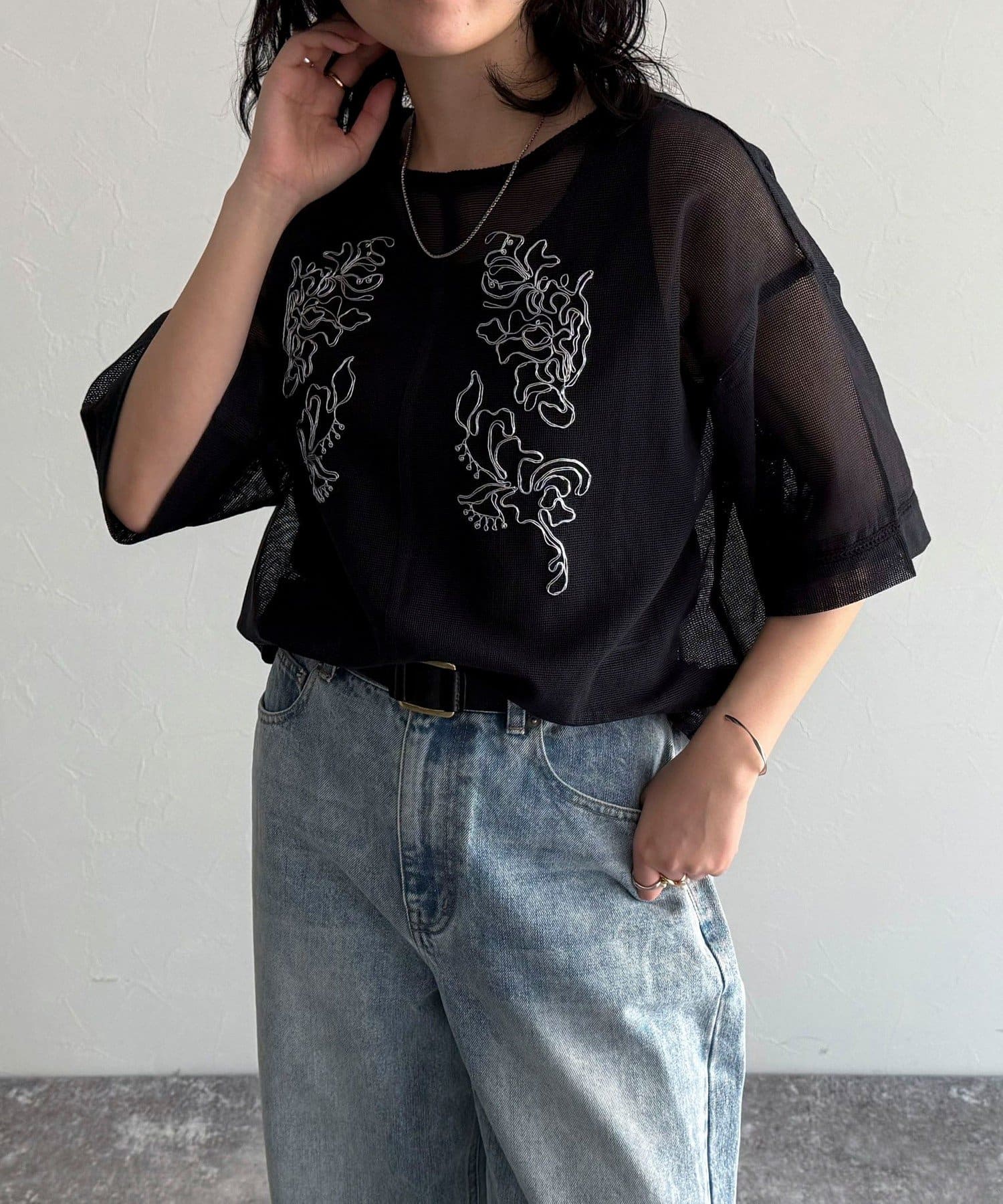 コーデのアクセントになる刺繍が華やかなシアープルオーバー