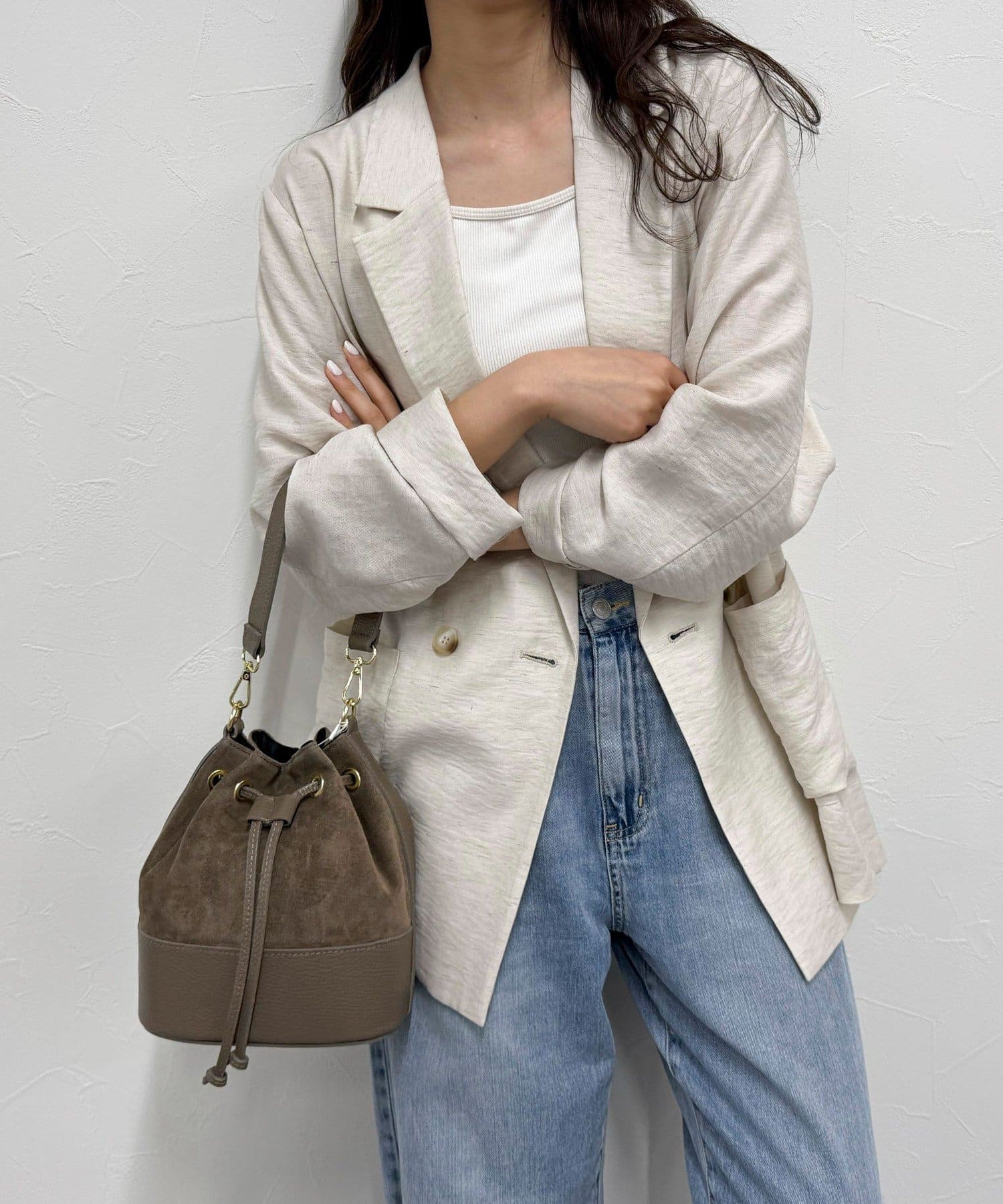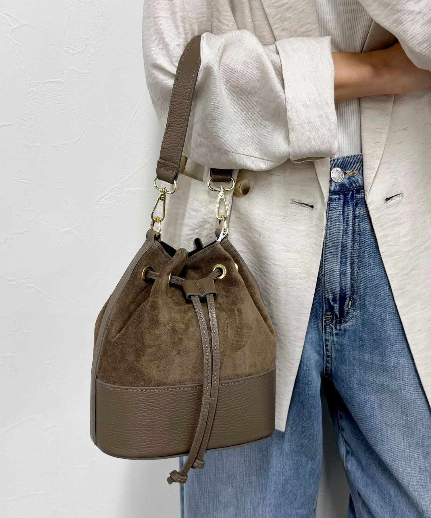 上品な質感がポイントのスエード巾着ショルダー