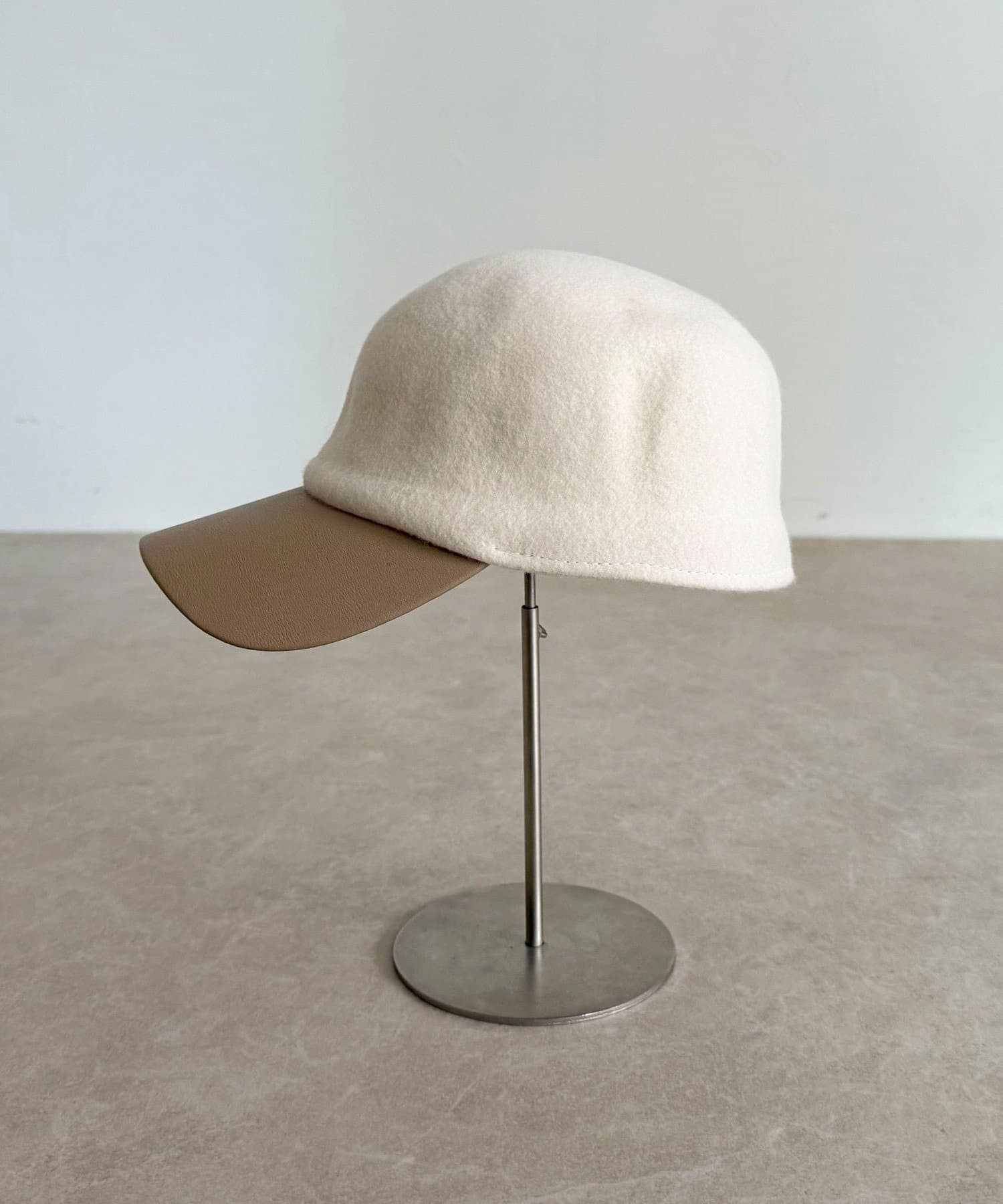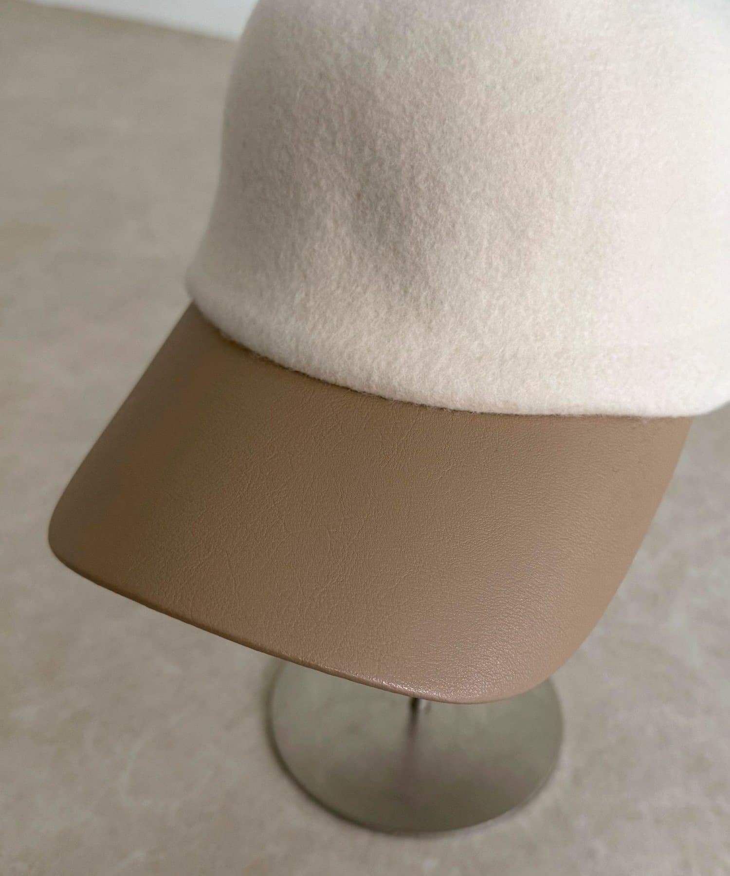 ・柔らかなフェルト素材とレザーのコンビデザインが特徴のキャップ