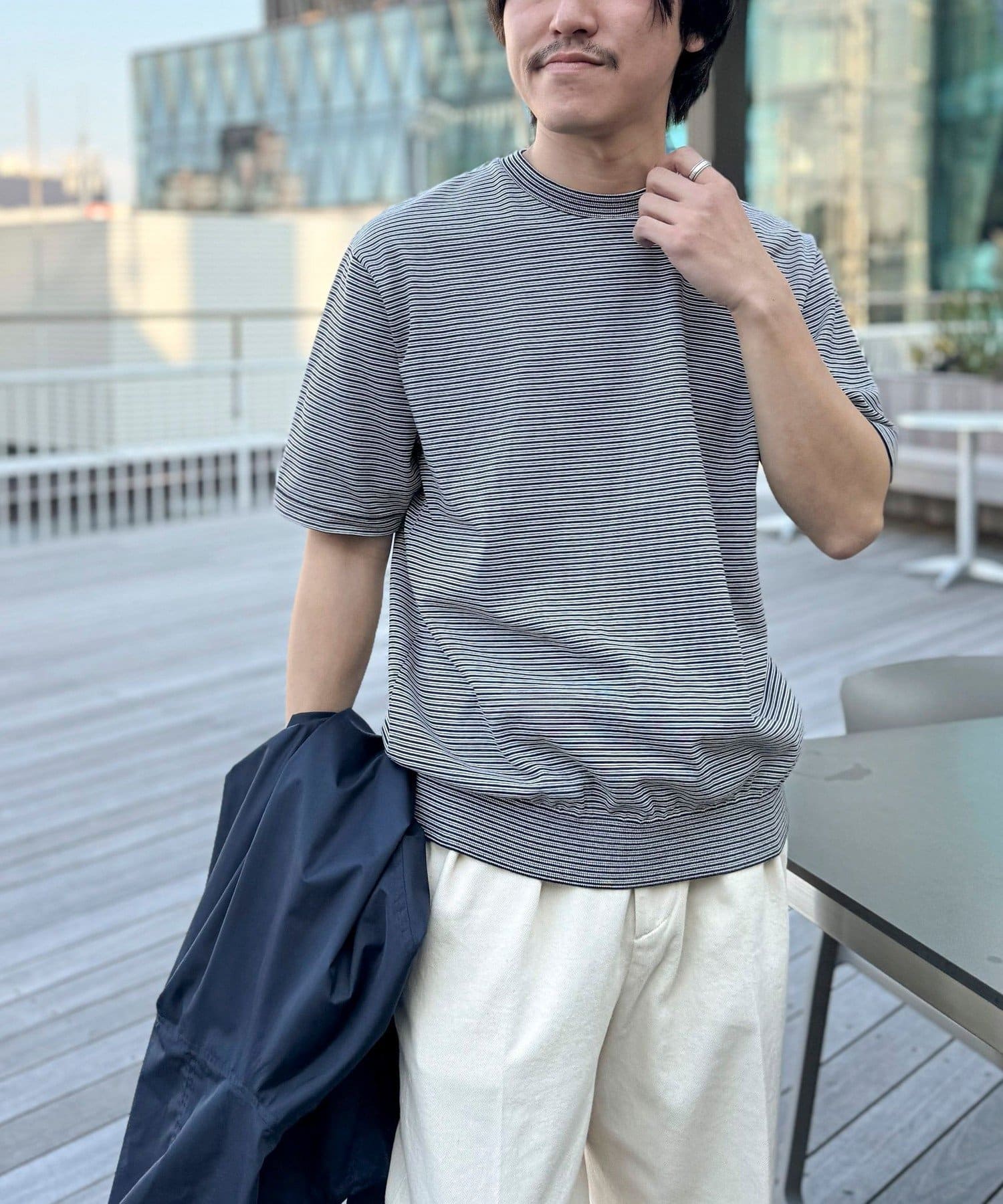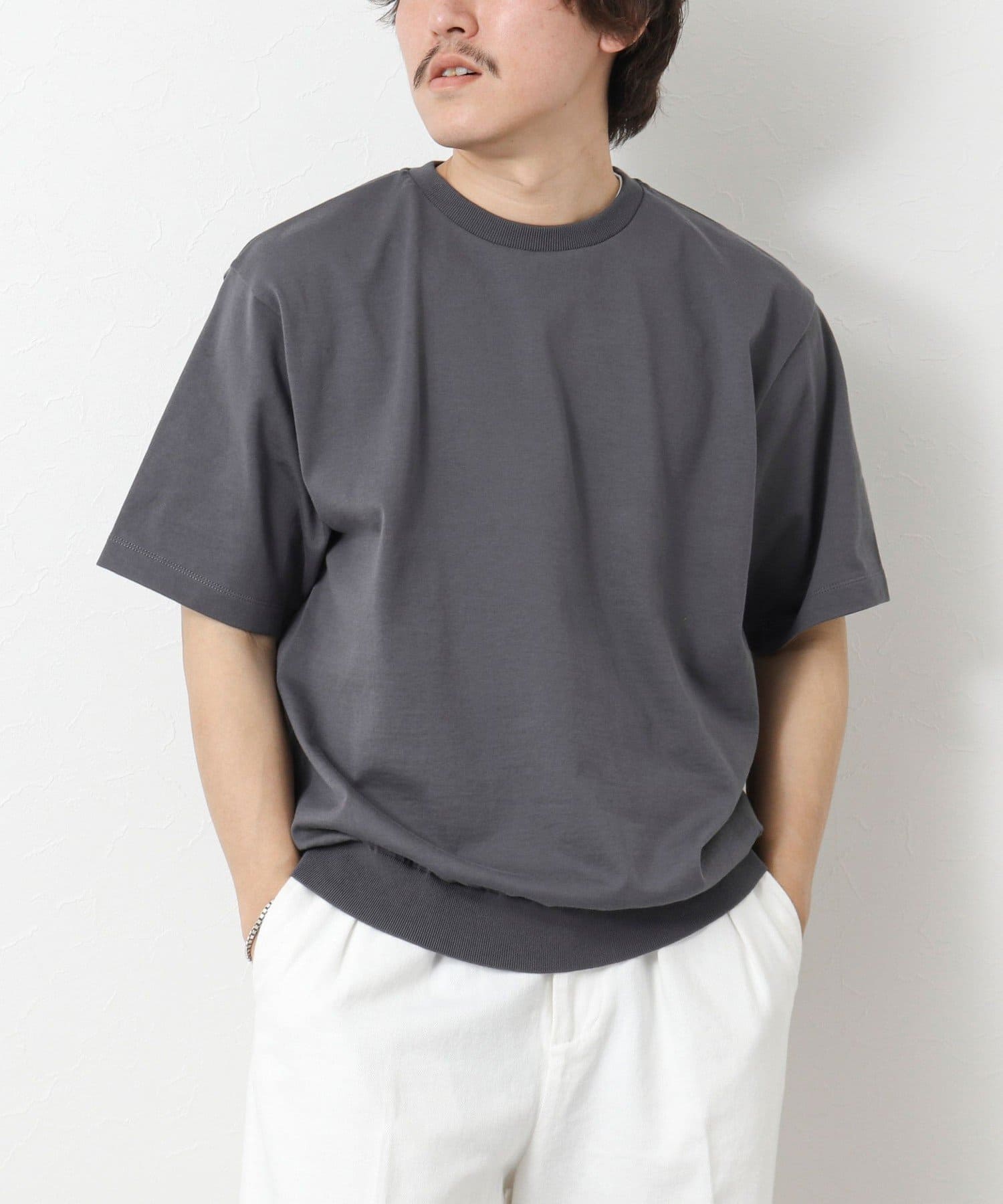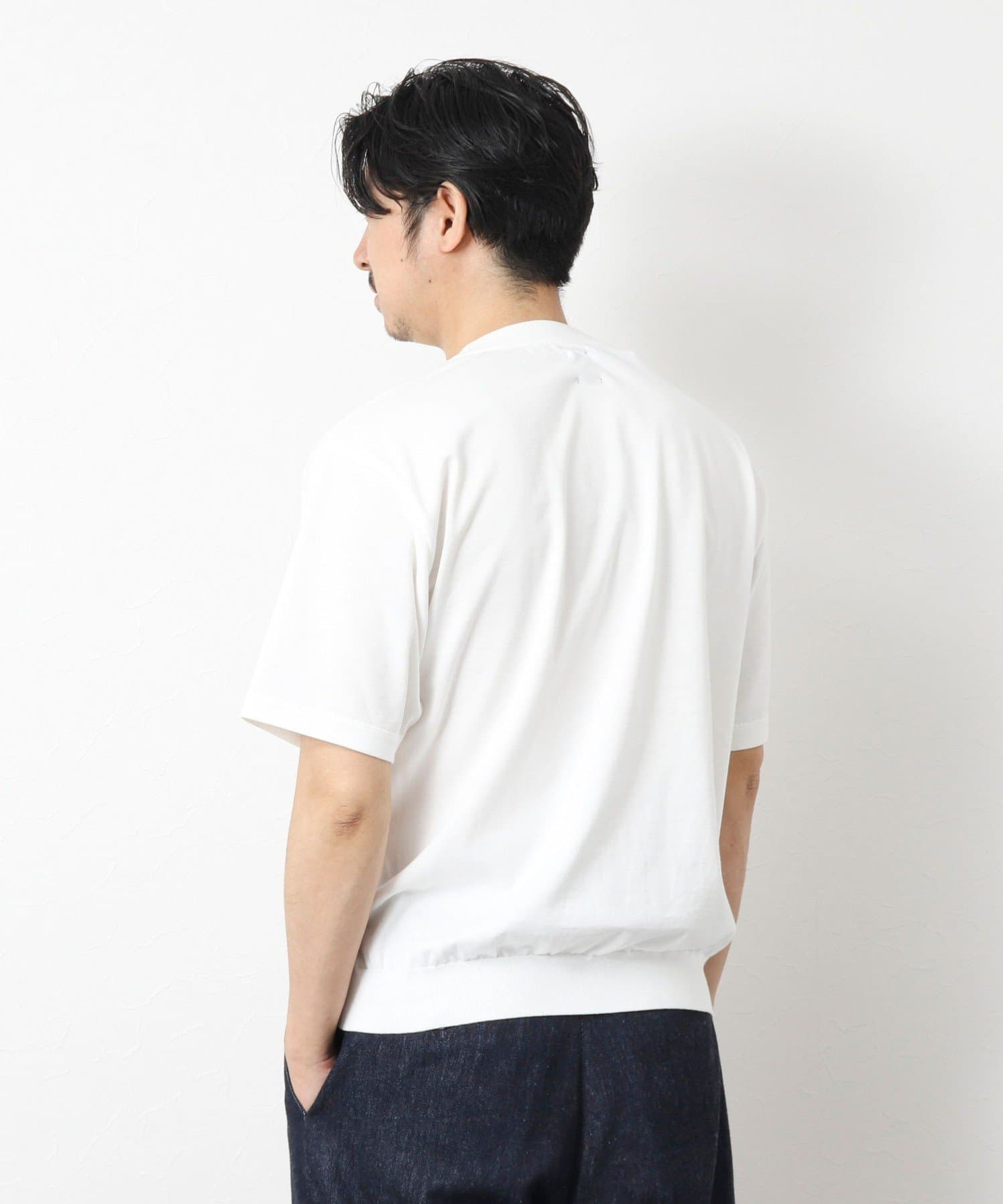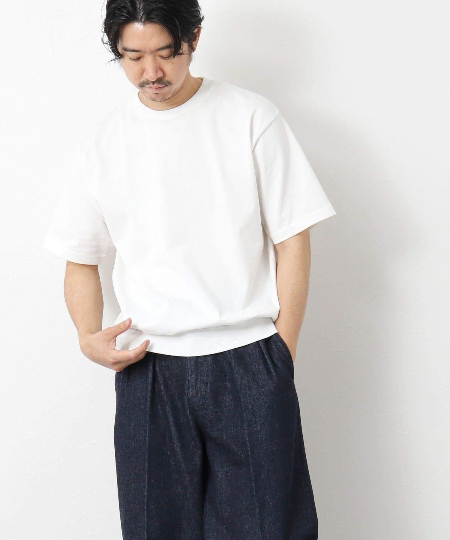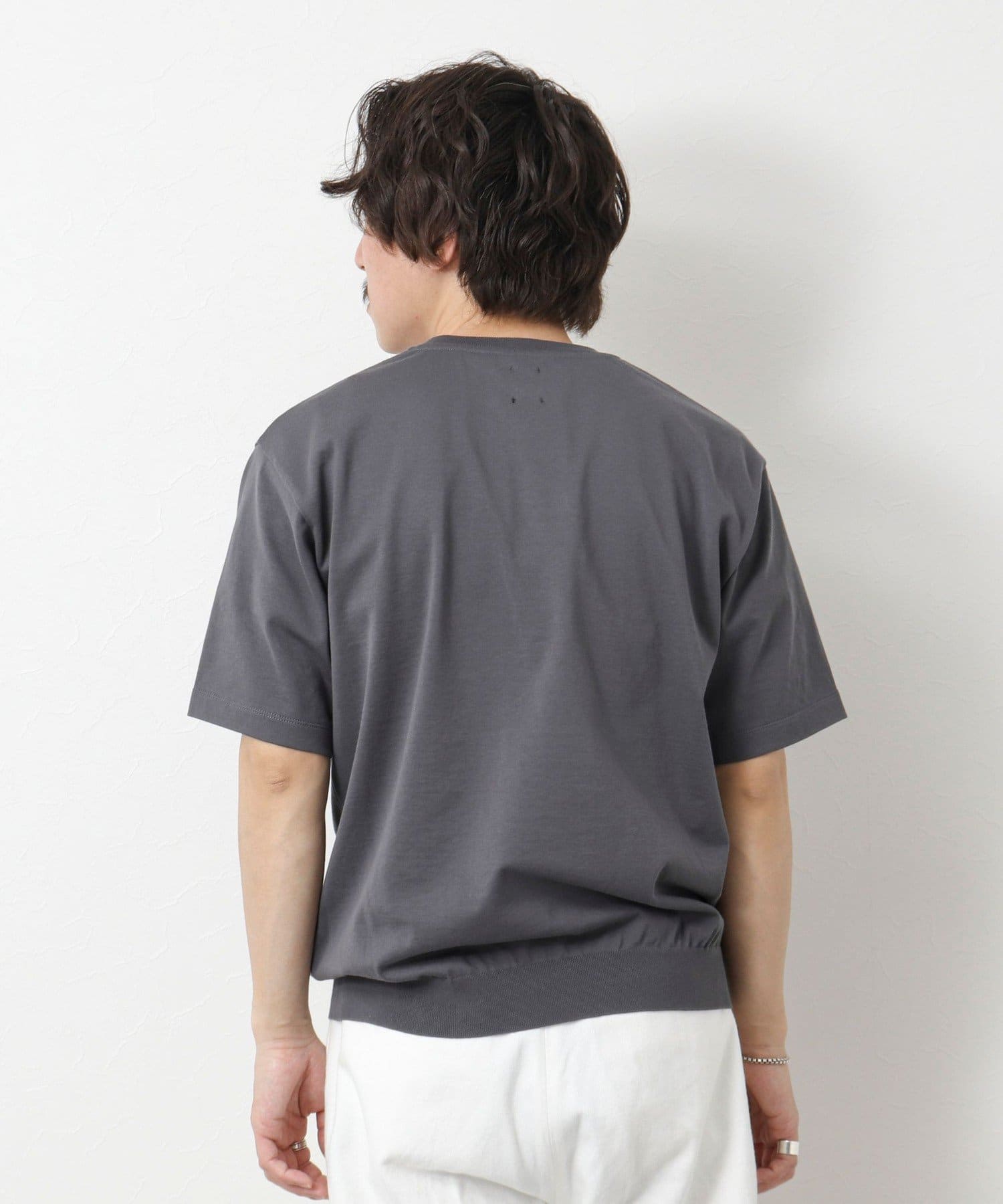 超長綿の毛羽立ちを抑えるようコンパクト紡績し、しっかりと度詰めで編んだアイテム。ニットならではの組織変化によるリブ付きでブラウジングがしっかり効いたTシャツ。1枚でサマになるようなパターンのTシャツです。