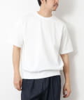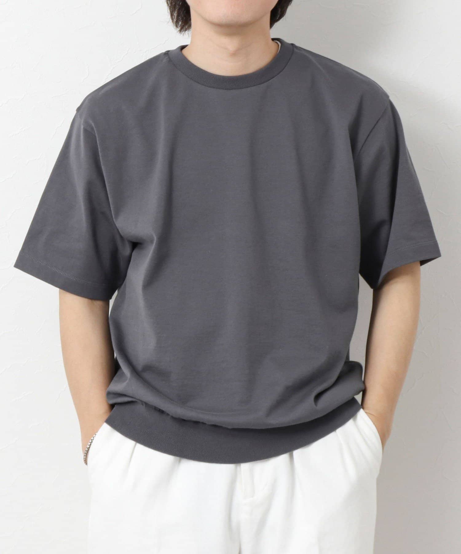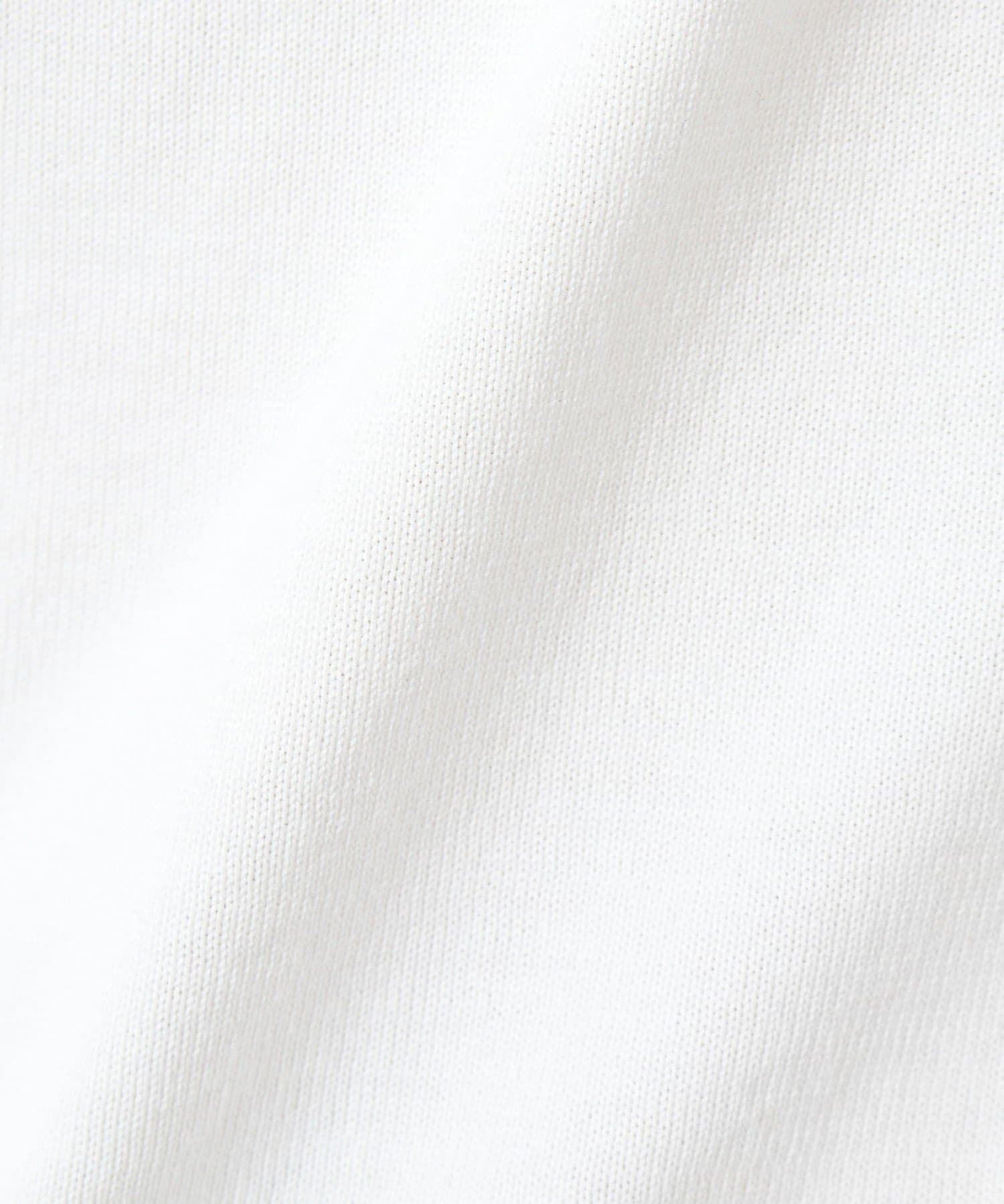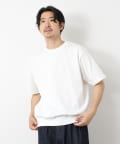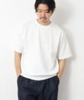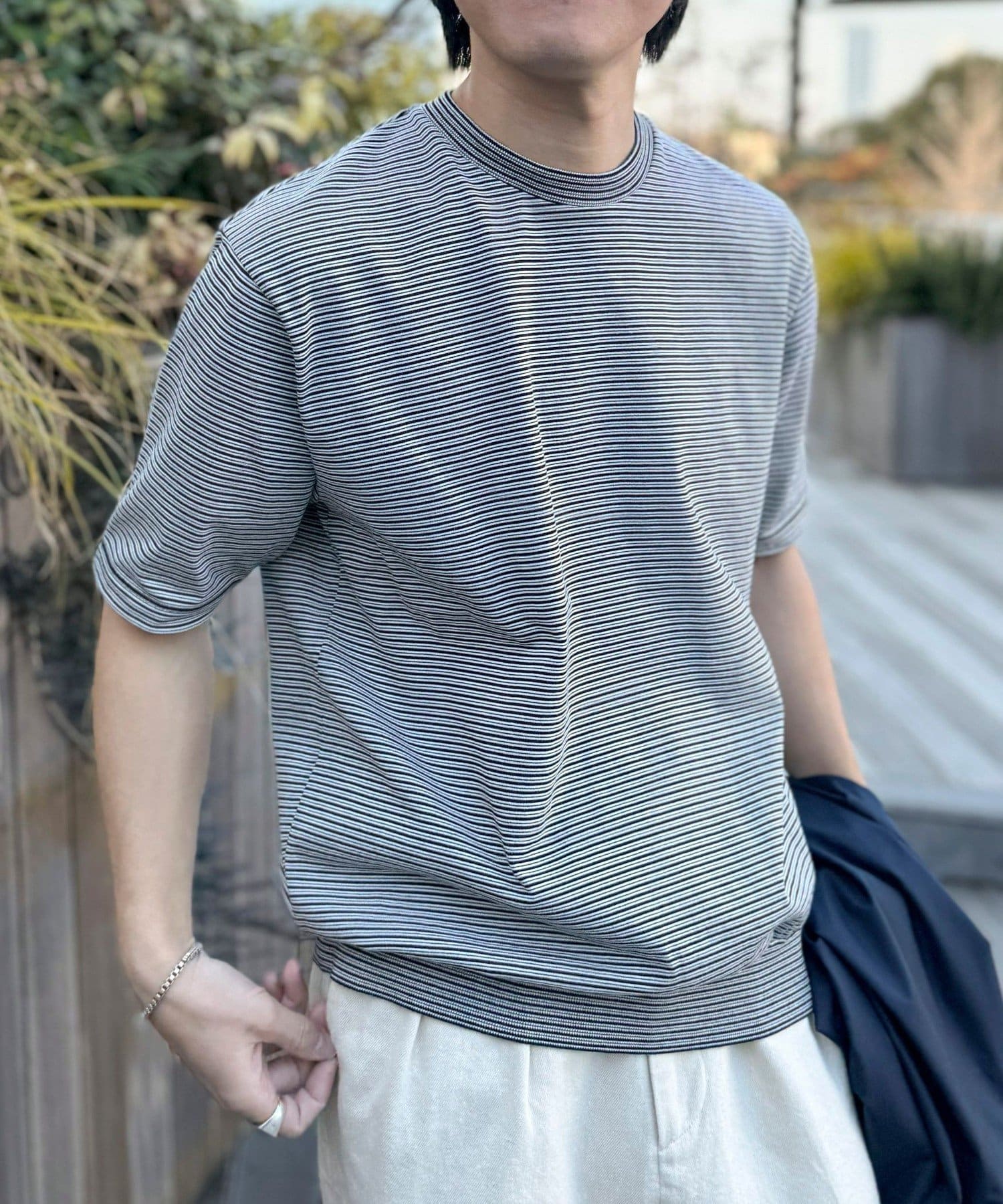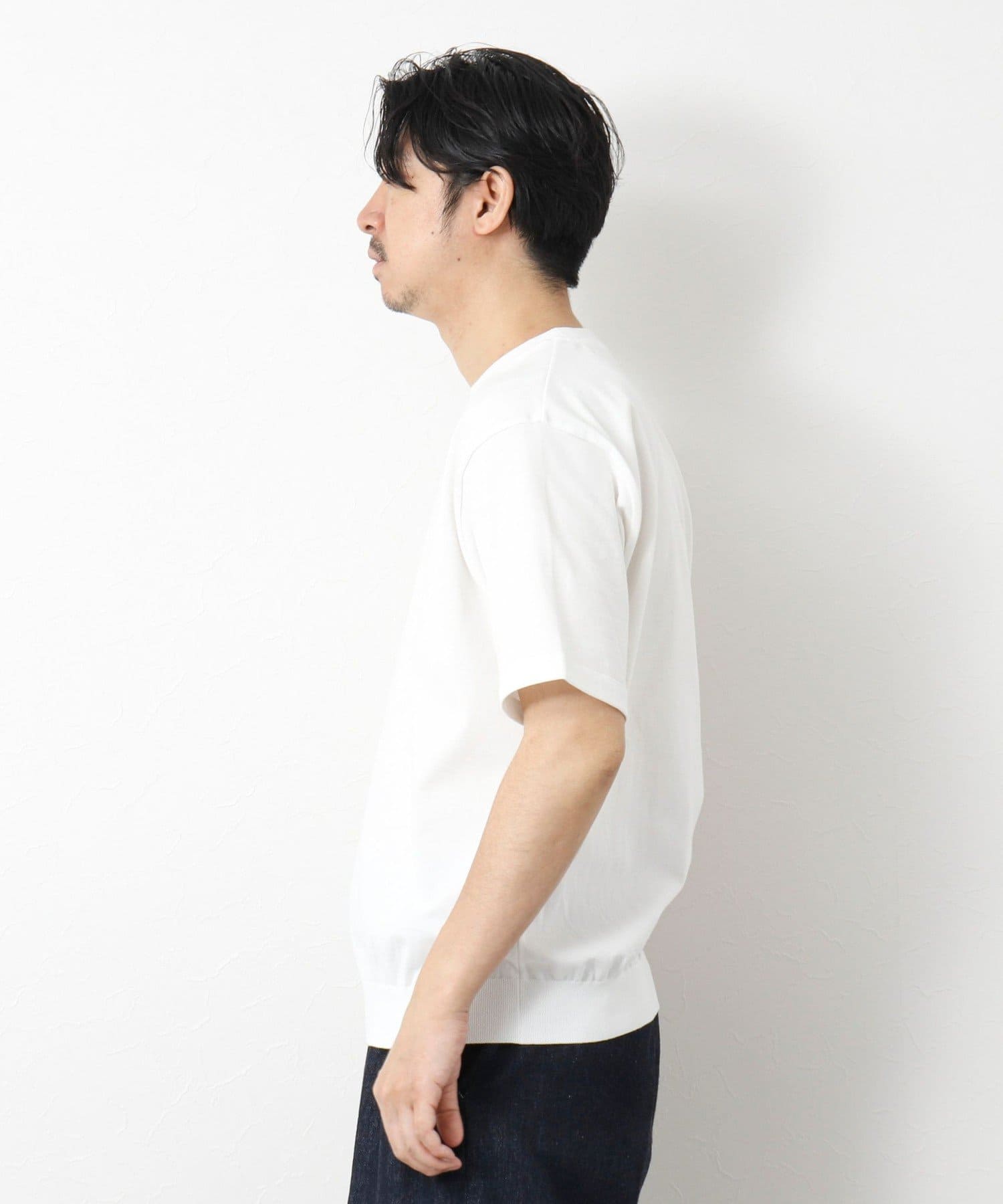 超長綿の毛羽立ちを抑えるようコンパクト紡績し、しっかりと度詰めで編んだアイテム。ニットならではの組織変化によるリブ付きでブラウジングがしっかり効いたTシャツ。1枚でサマになるようなパターンのTシャツです。