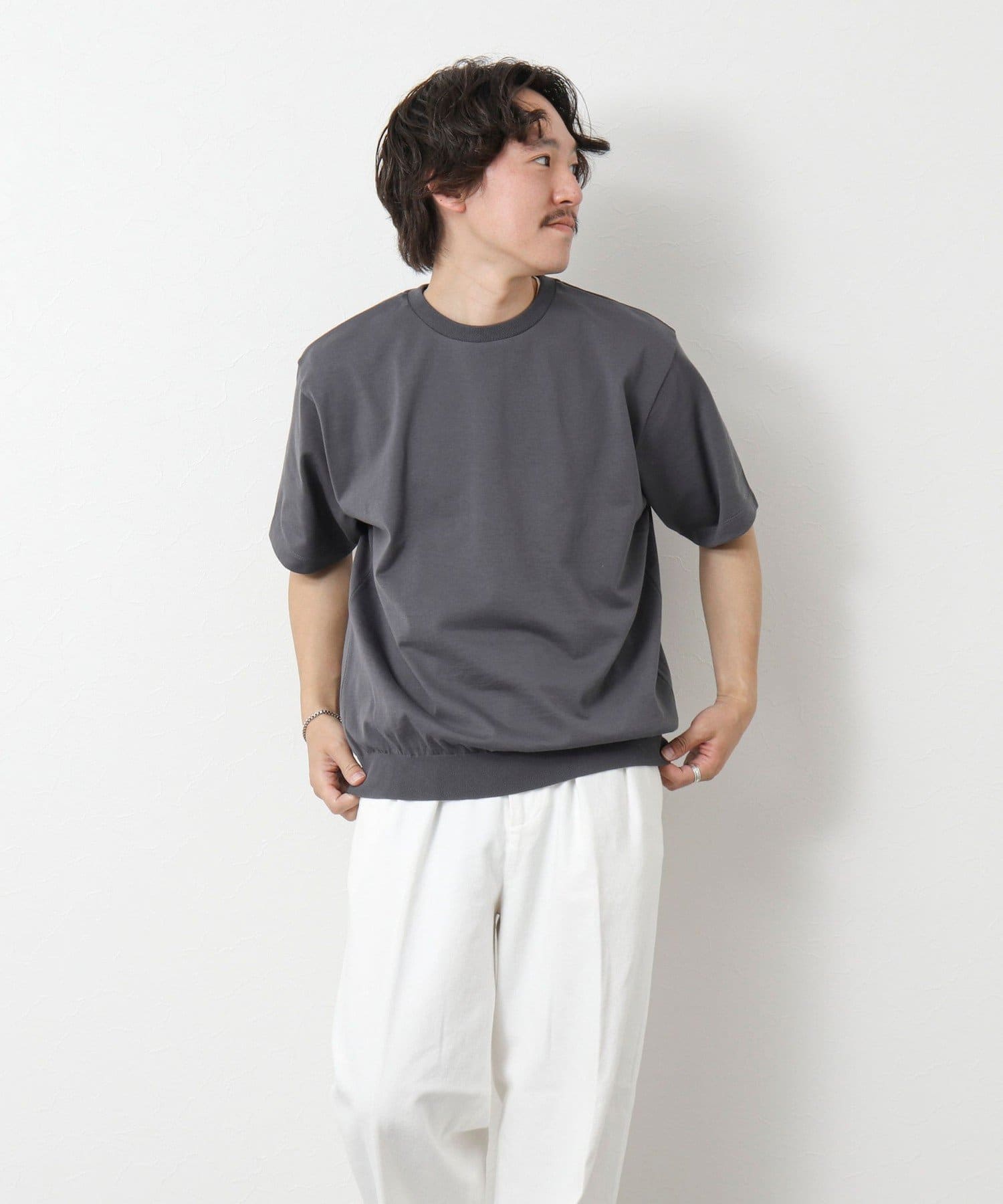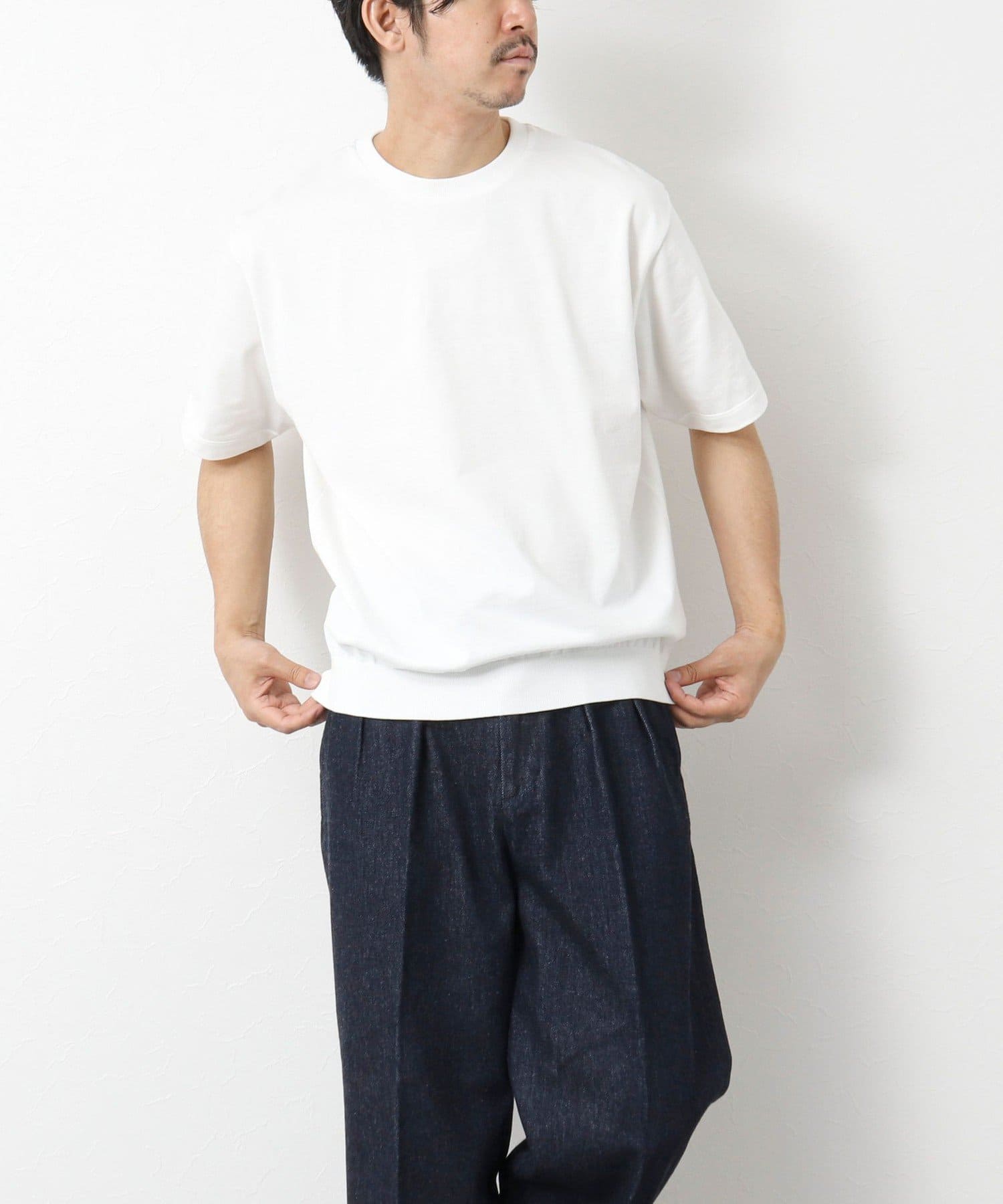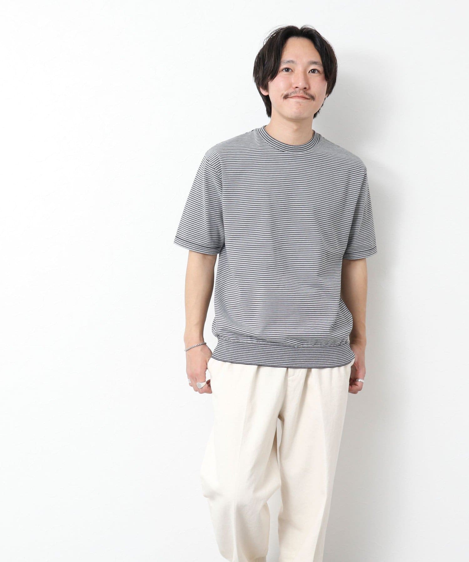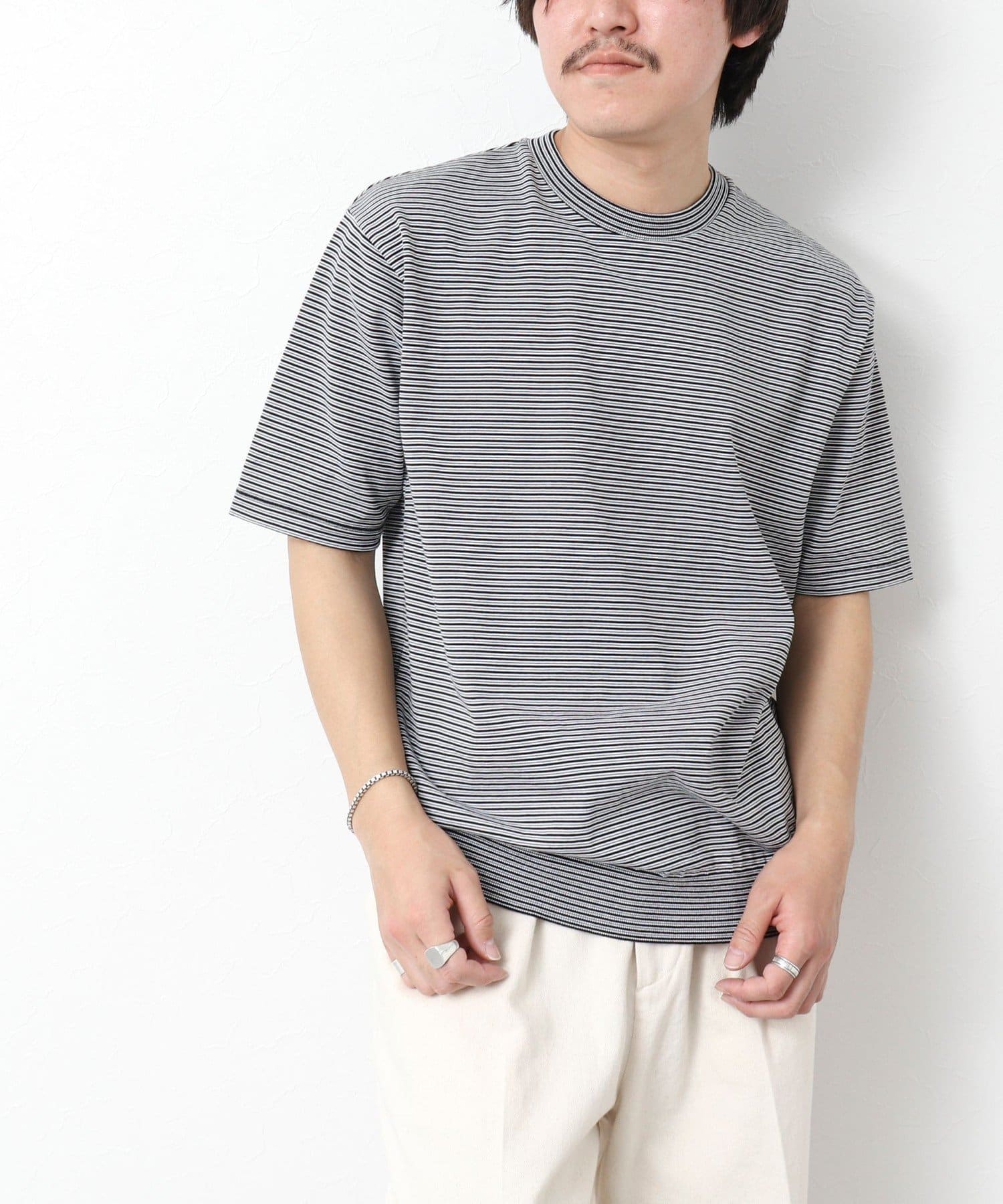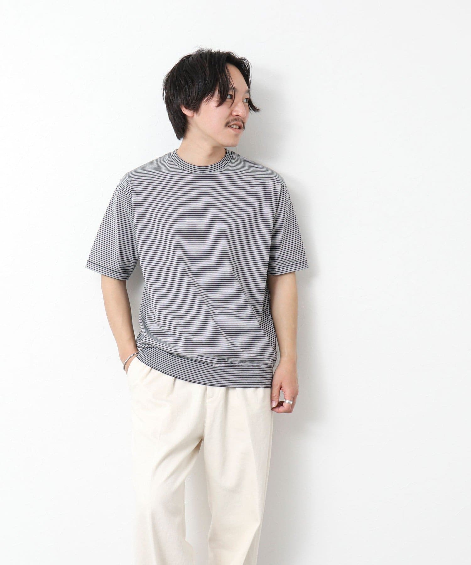 超長綿の毛羽立ちを抑えるようコンパクト紡績し、しっかりと度詰めで編んだアイテム。ニットならではの組織変化によるリブ付きでブラウジングがしっかり効いたTシャツ。1枚でサマになるようなパターンのTシャツです。