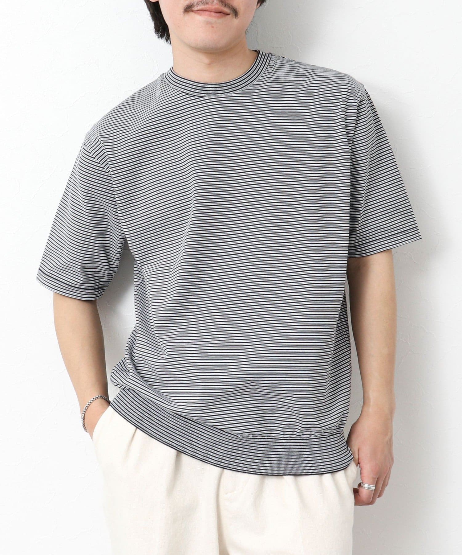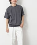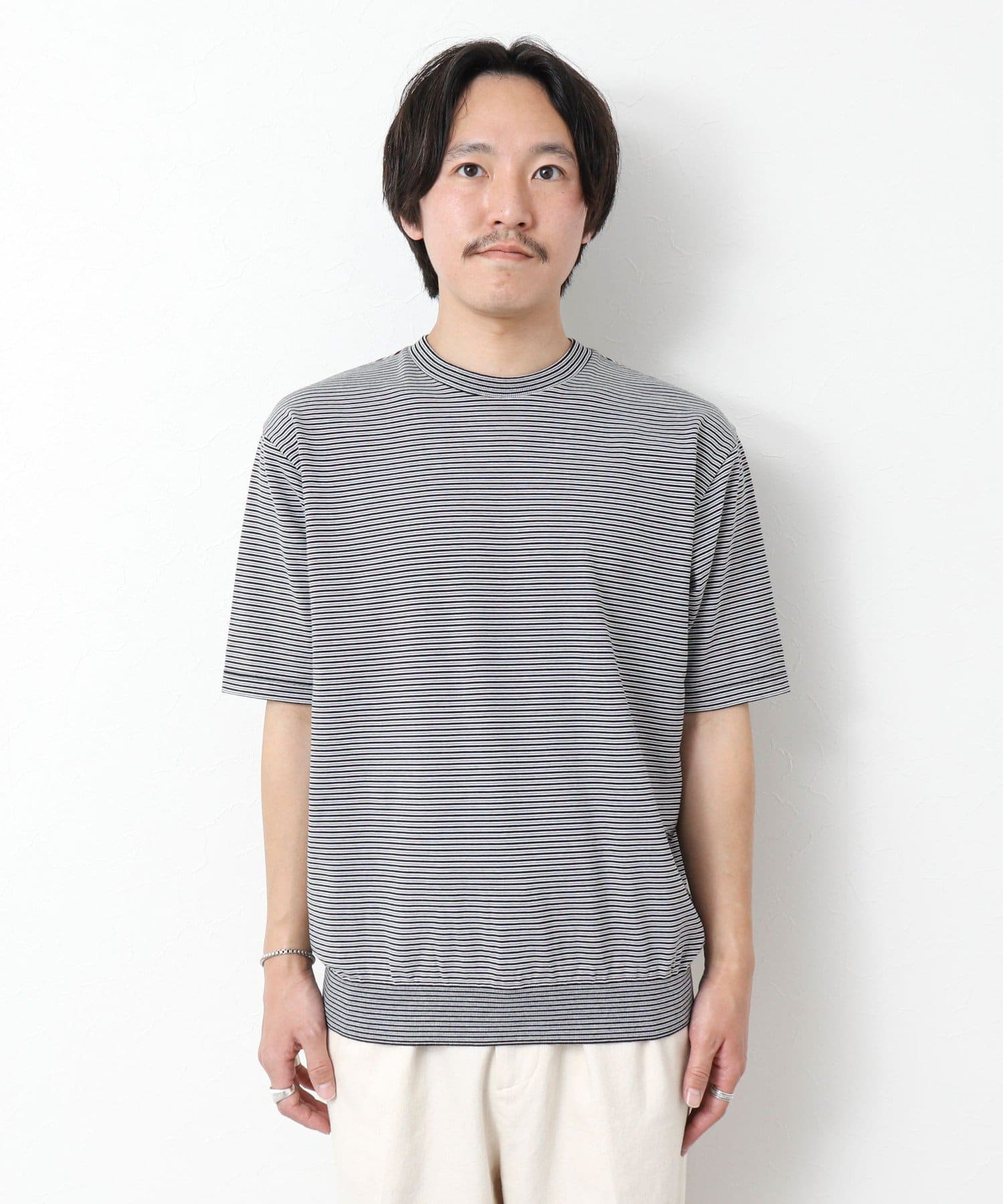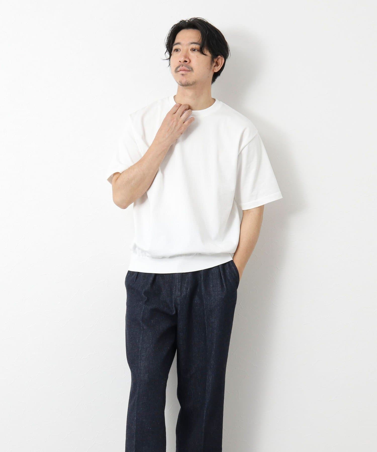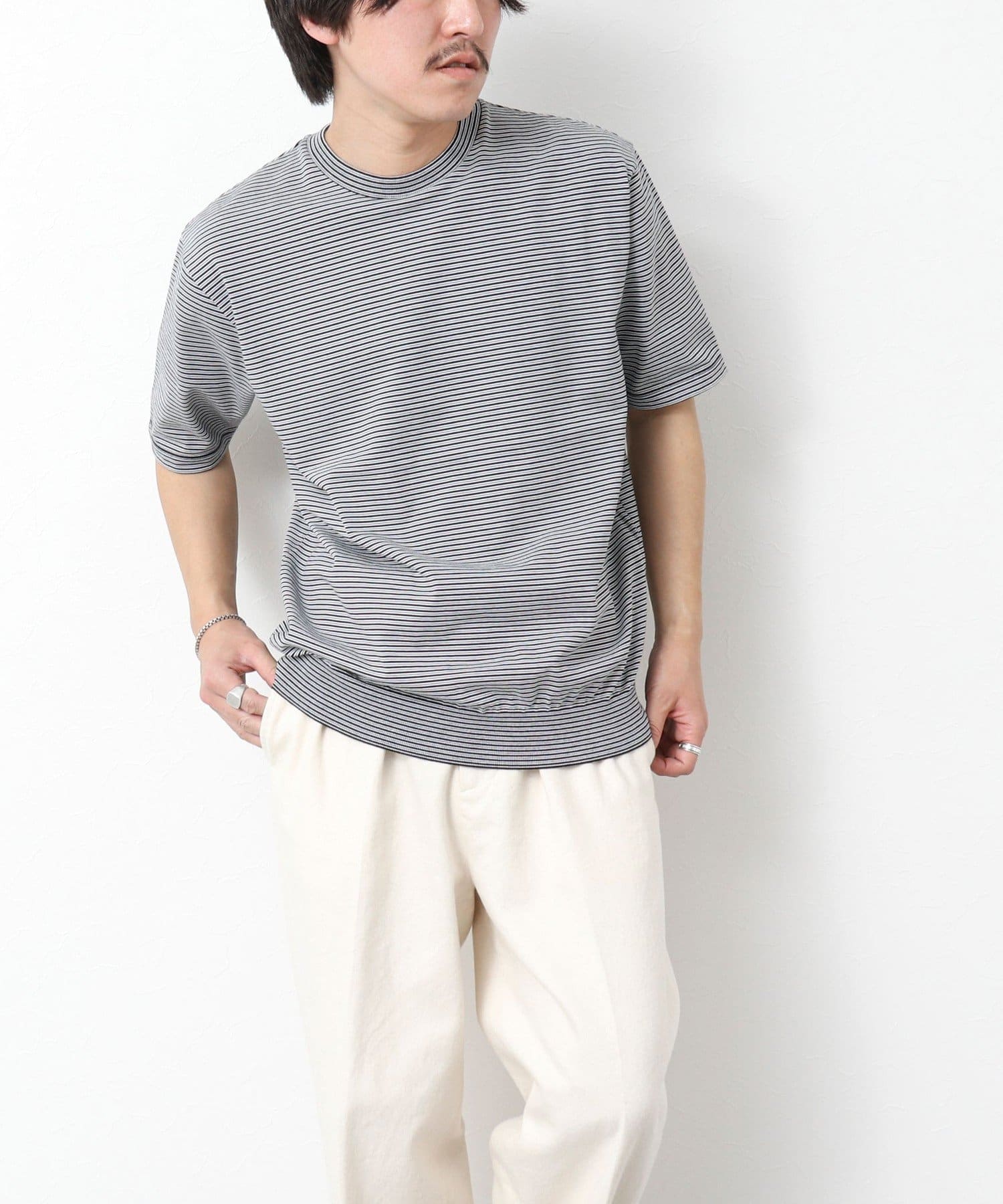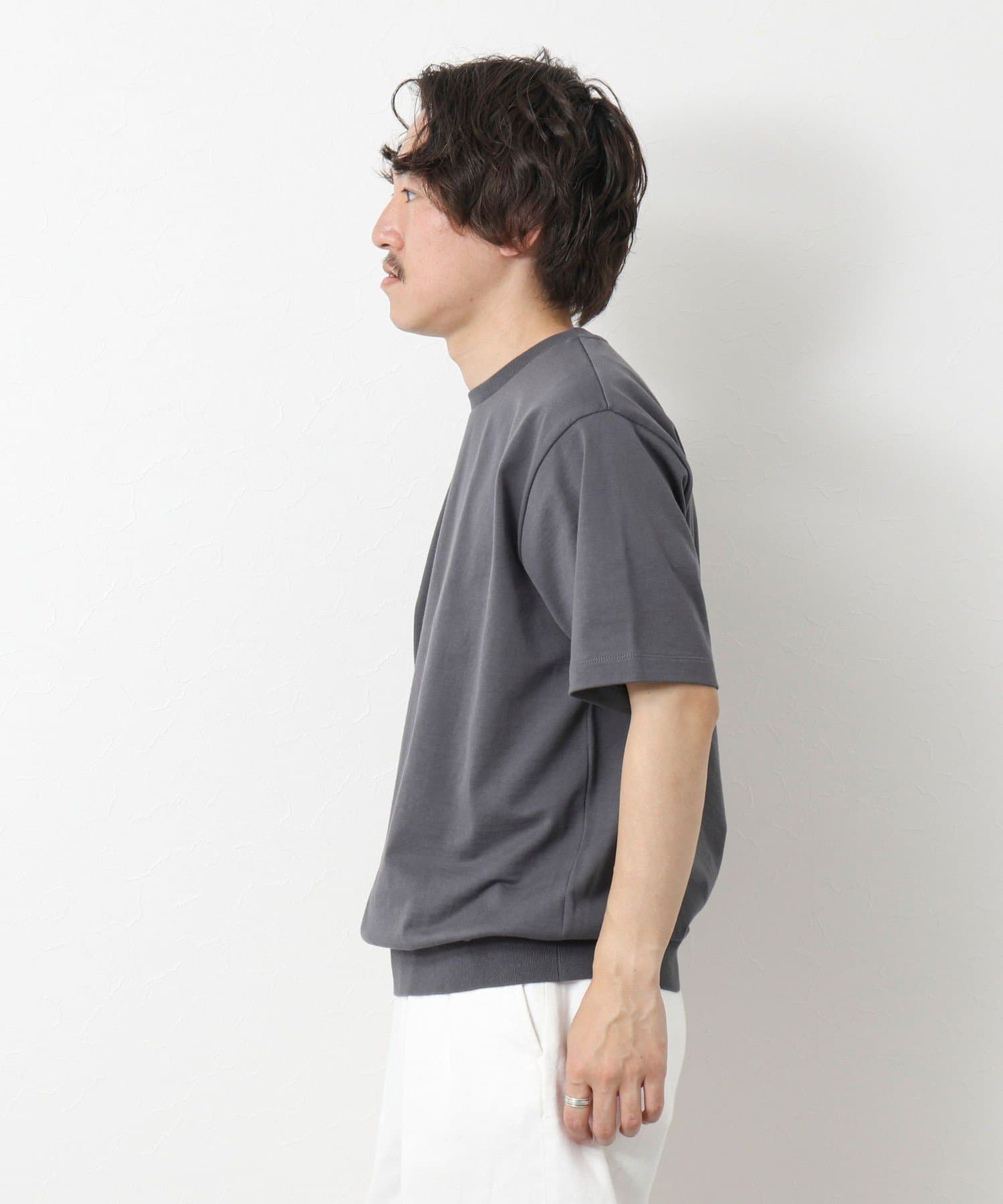超長綿の毛羽立ちを抑えるようコンパクト紡績し、しっかりと度詰めで編んだアイテム。ニットならではの組織変化によるリブ付きでブラウジングがしっかり効いたTシャツ。1枚でサマになるようなパターンのTシャツです。
