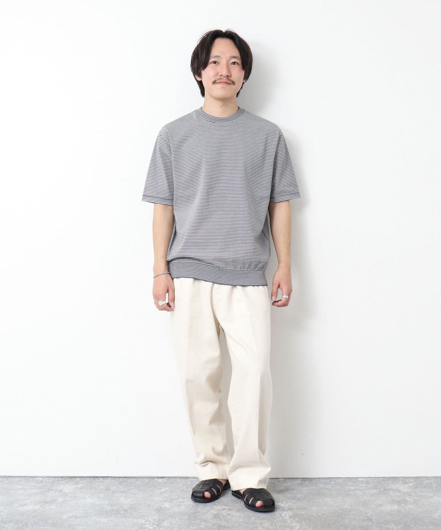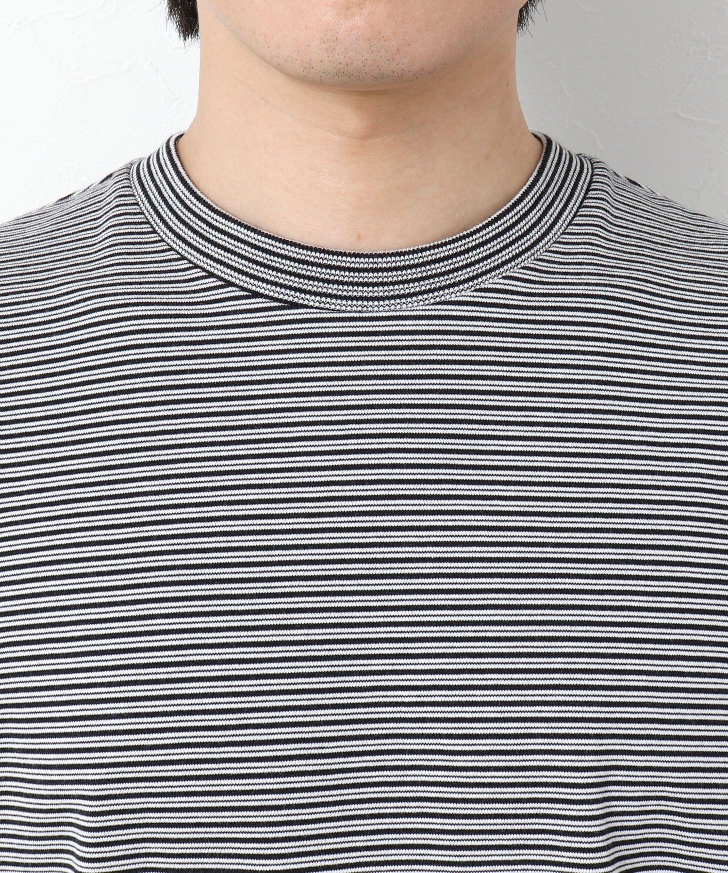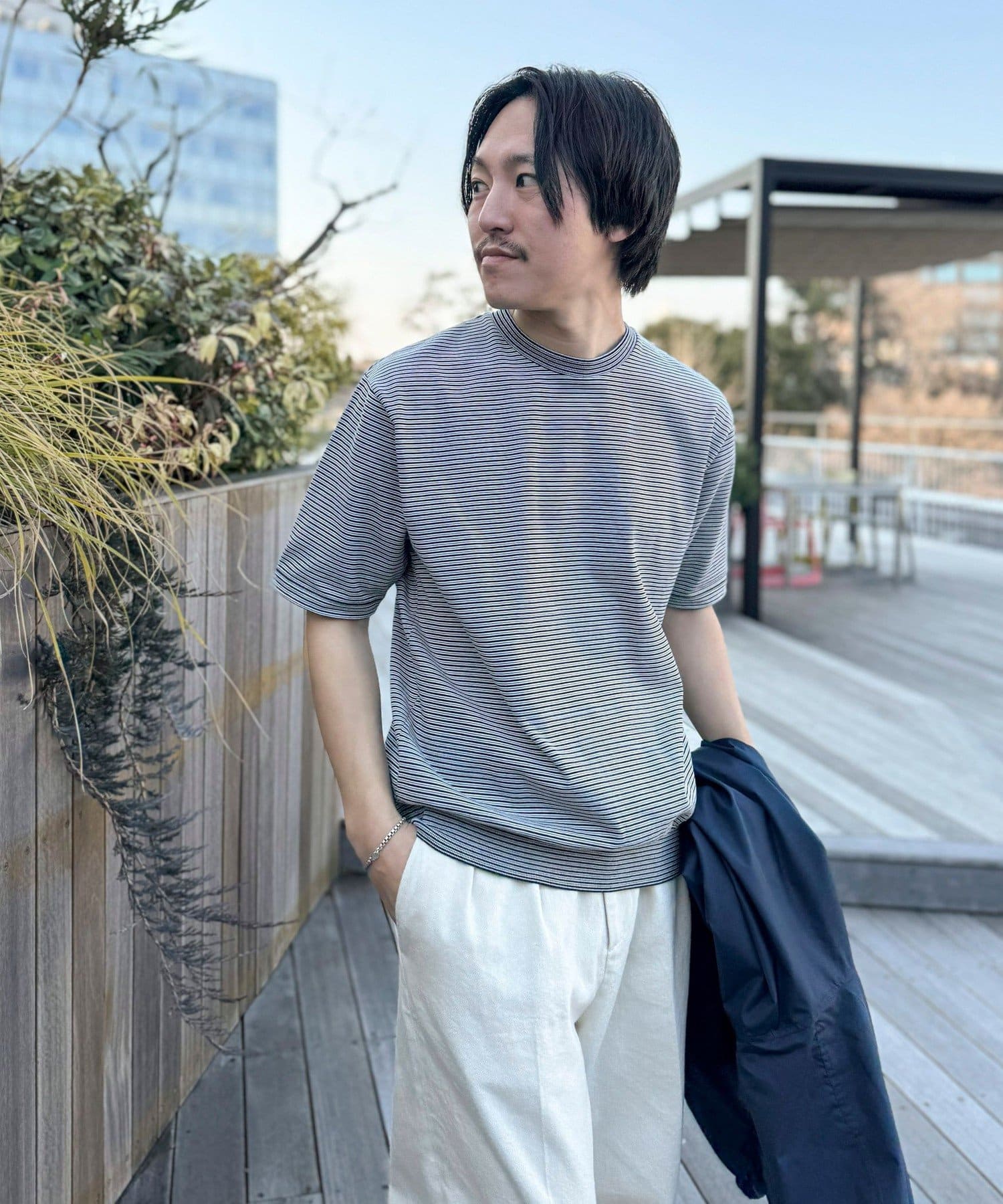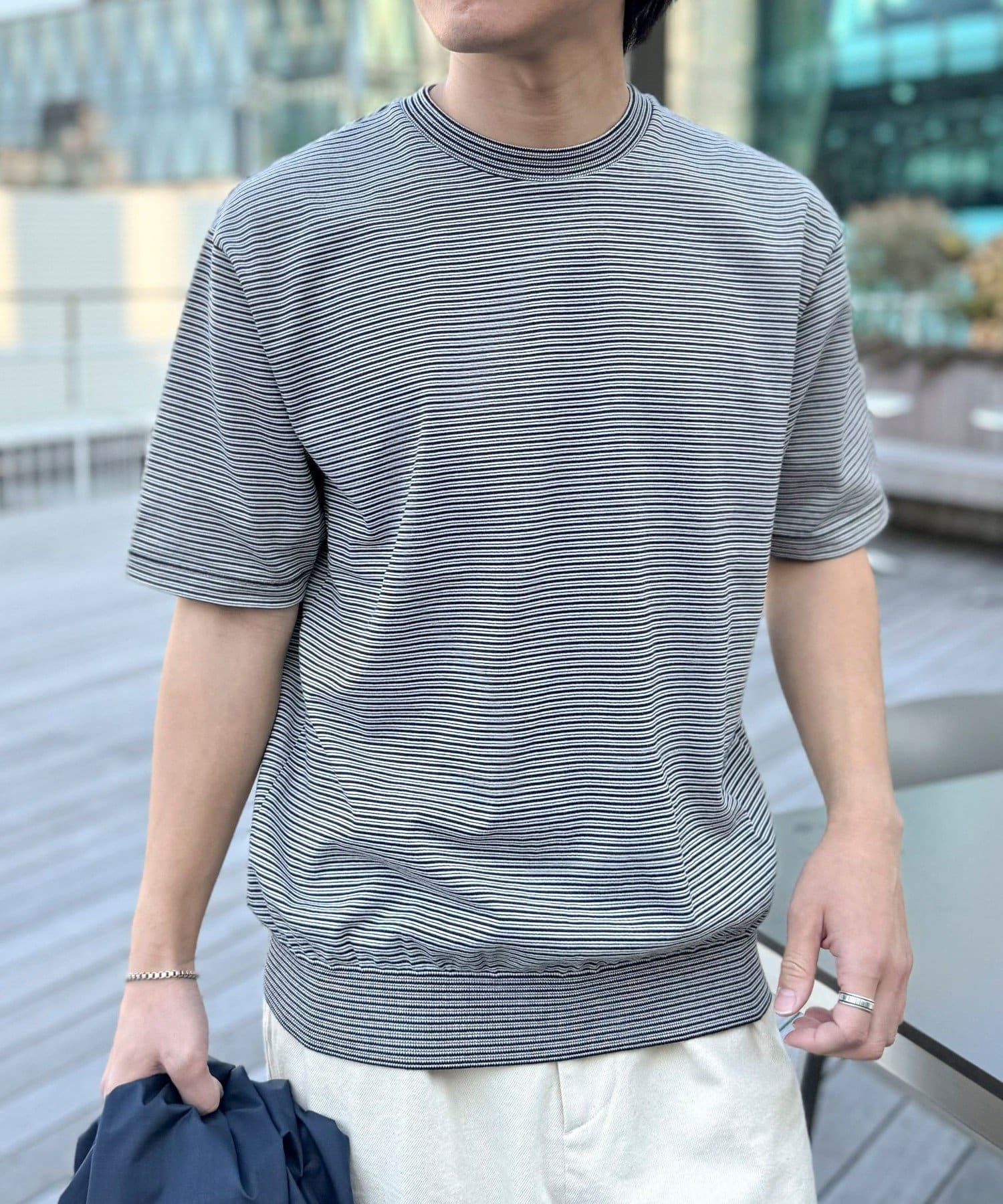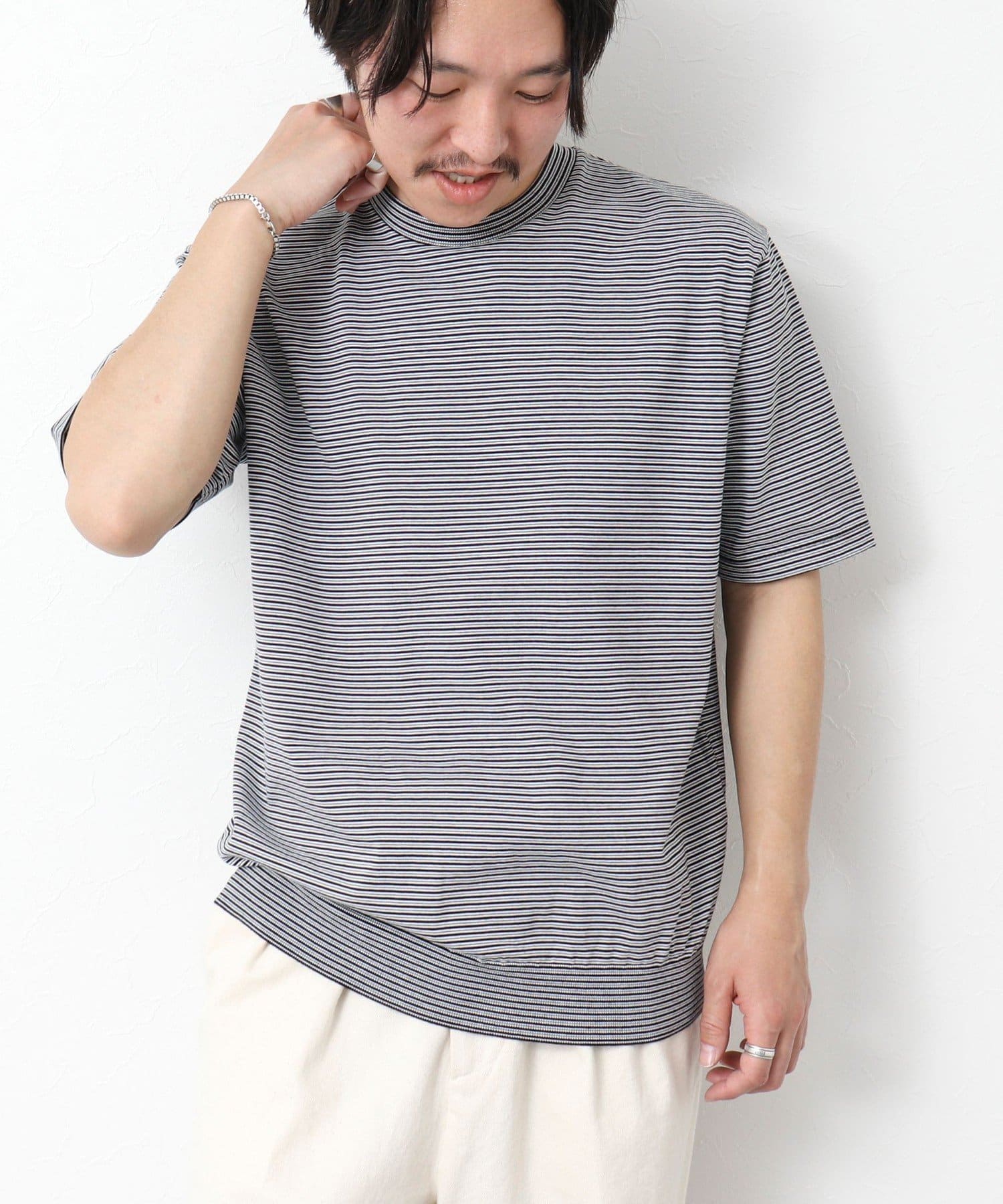 超長綿の毛羽立ちを抑えるようコンパクト紡績し、しっかりと度詰めで編んだアイテム。ニットならではの組織変化によるリブ付きでブラウジングがしっかり効いたTシャツ。1枚でサマになるようなパターンのTシャツです。