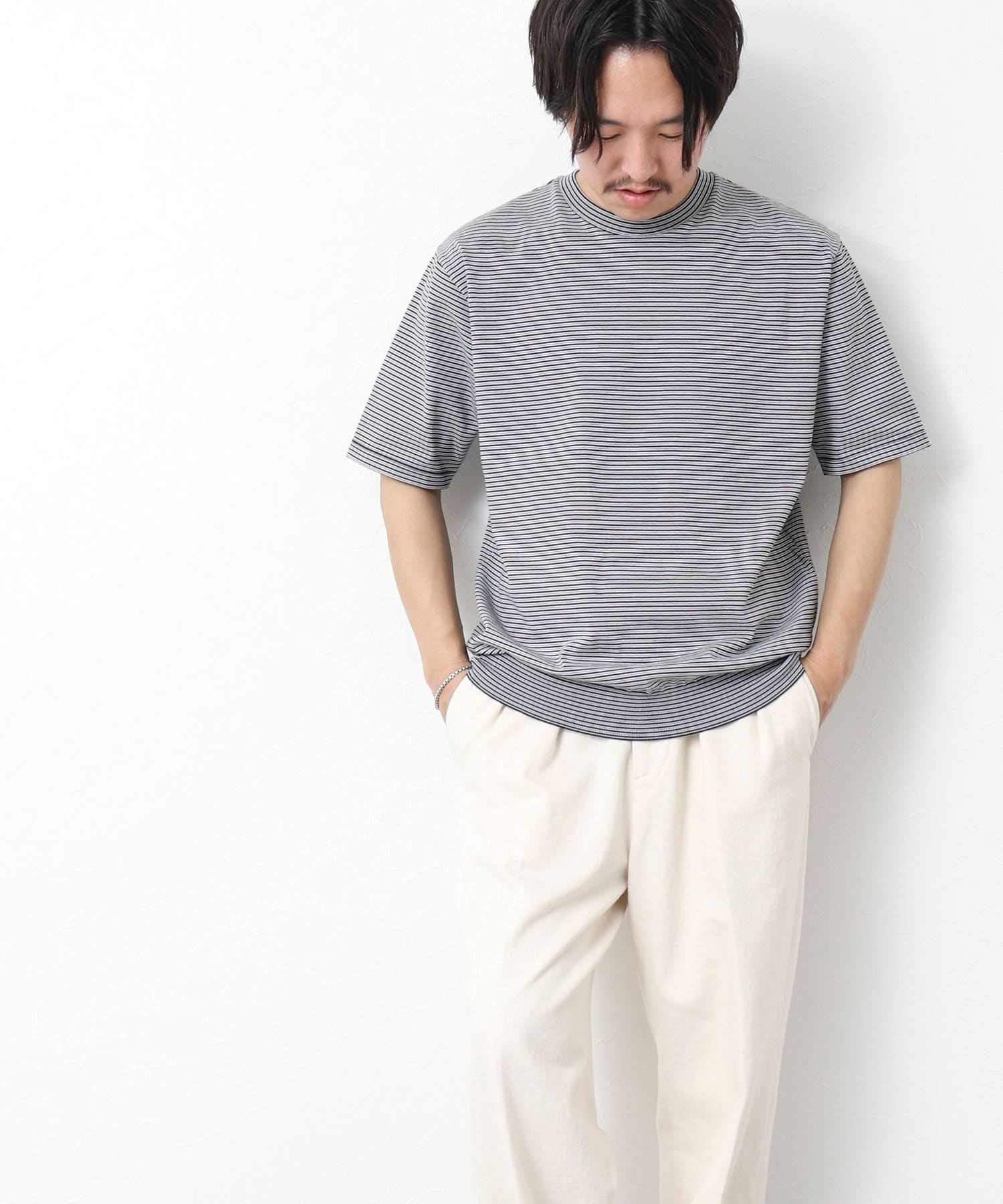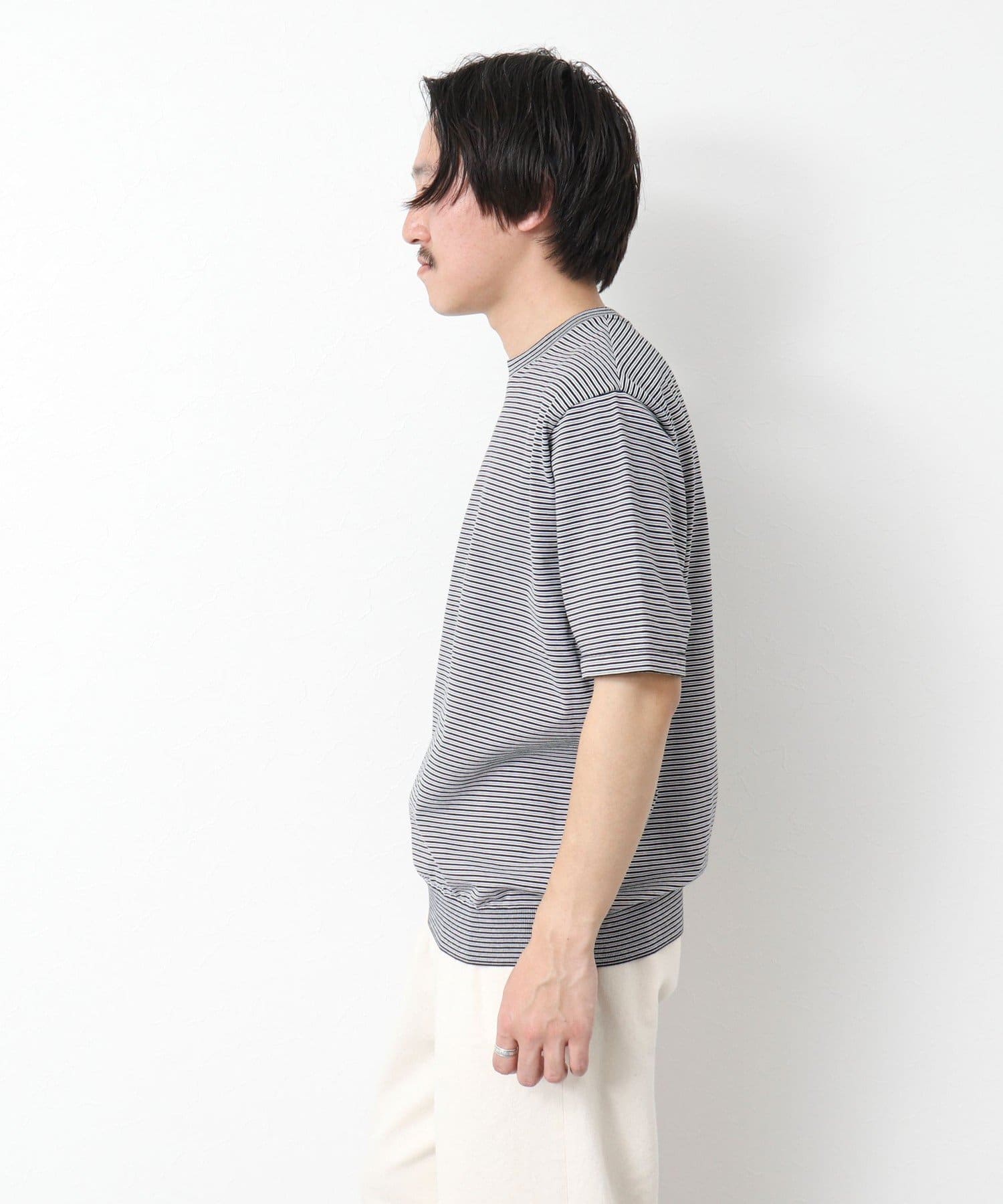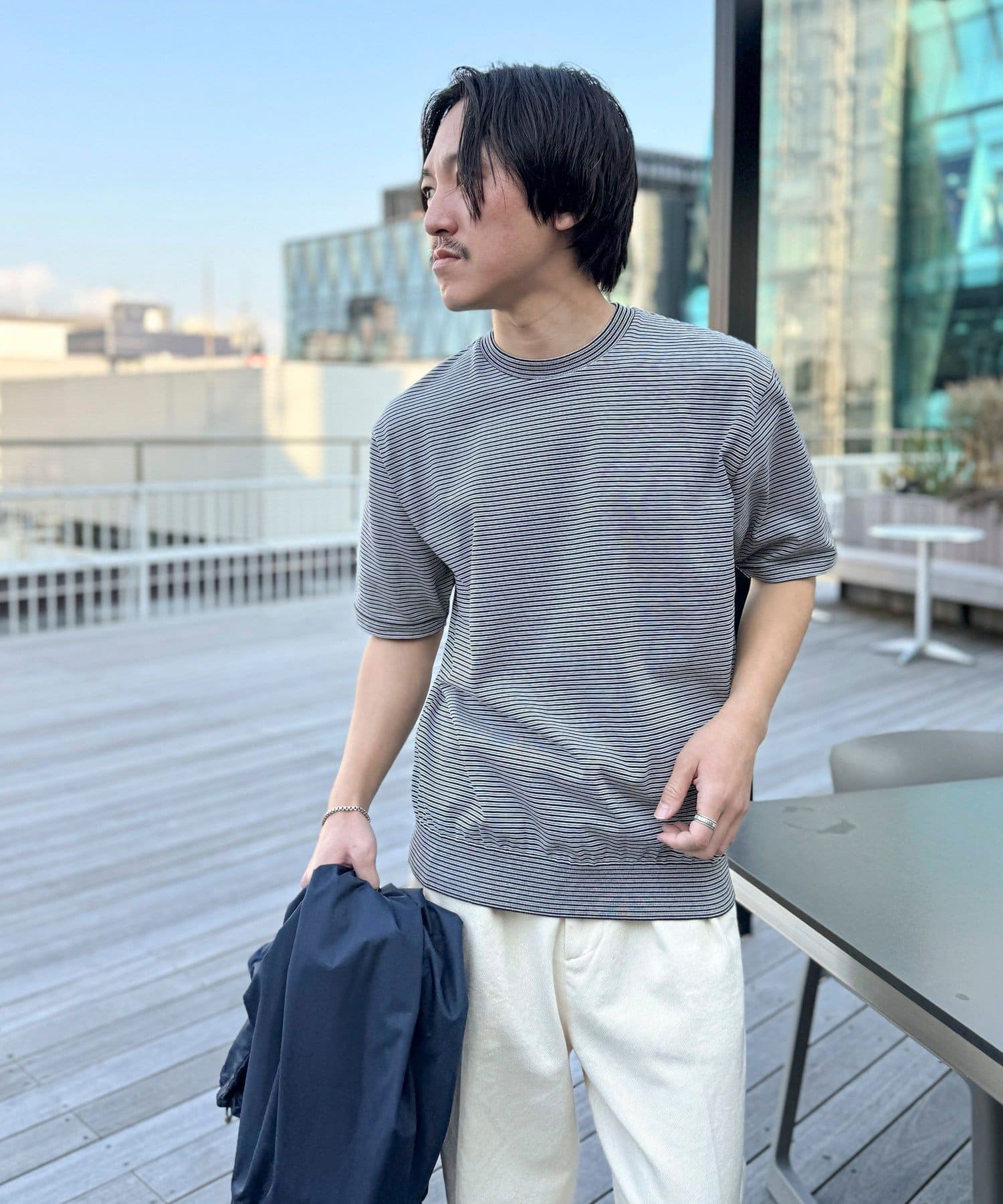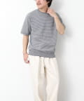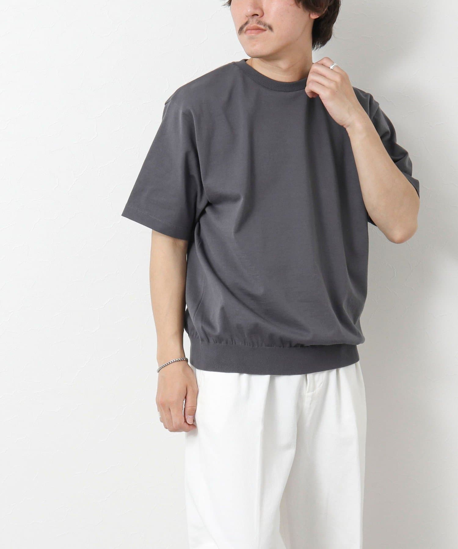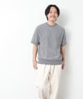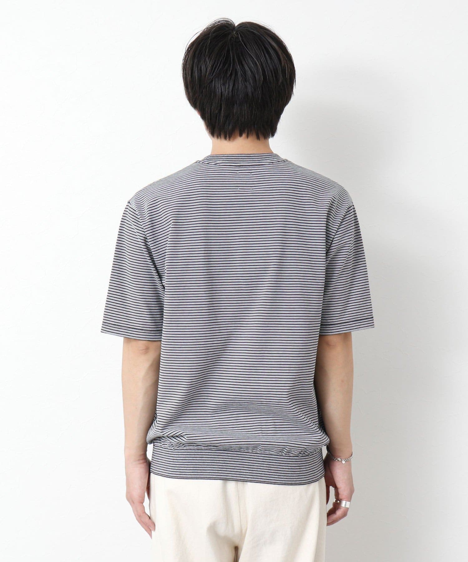 超長綿の毛羽立ちを抑えるようコンパクト紡績し、しっかりと度詰めで編んだアイテム。ニットならではの組織変化によるリブ付きでブラウジングがしっかり効いたTシャツ。1枚でサマになるようなパターンのTシャツです。