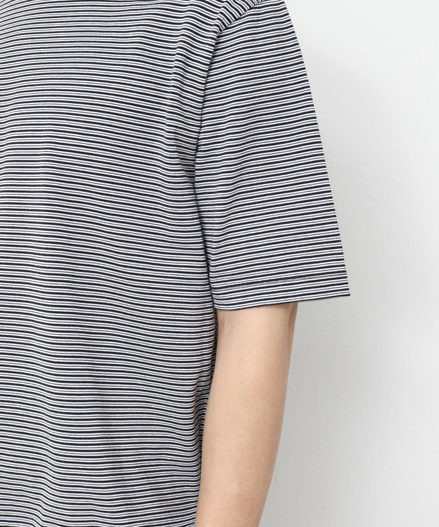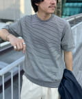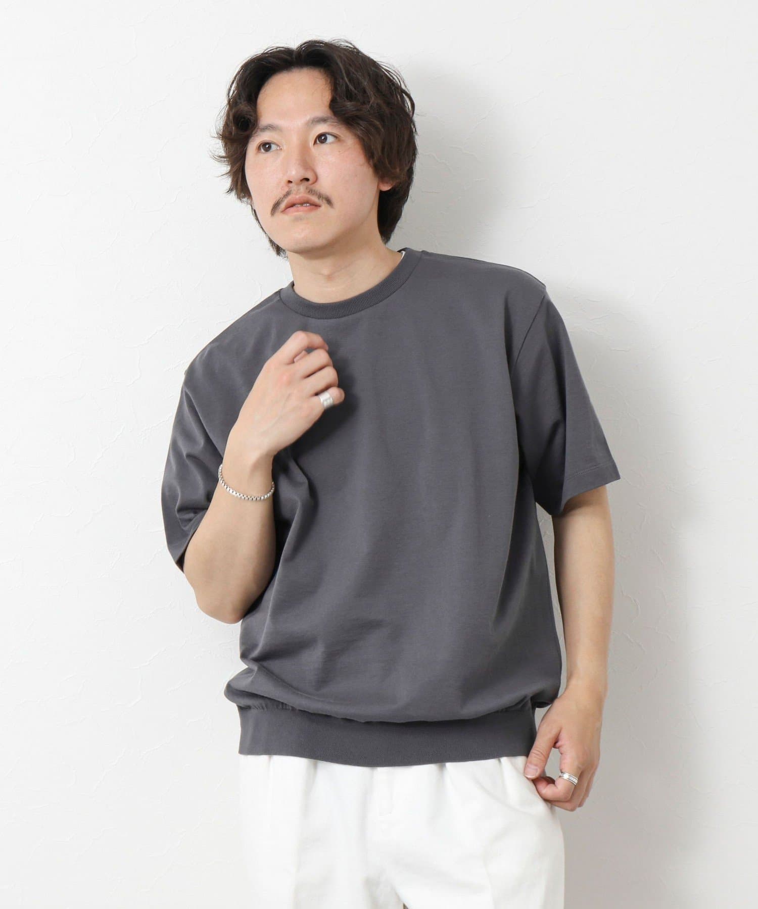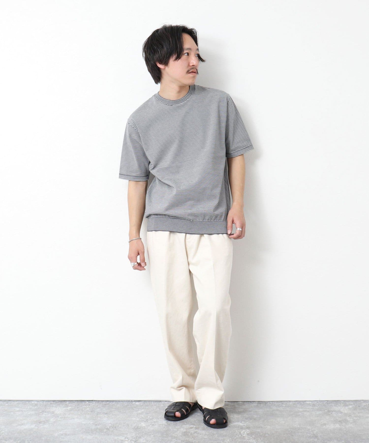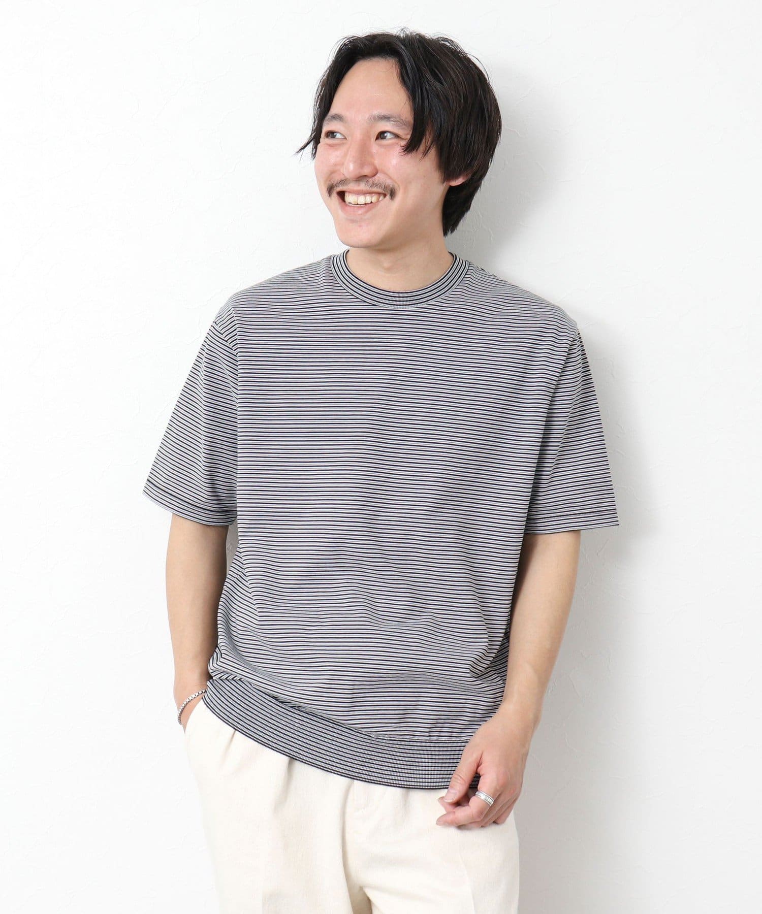 超長綿の毛羽立ちを抑えるようコンパクト紡績し、しっかりと度詰めで編んだアイテム。ニットならではの組織変化によるリブ付きでブラウジングがしっかり効いたTシャツ。1枚でサマになるようなパターンのTシャツです。