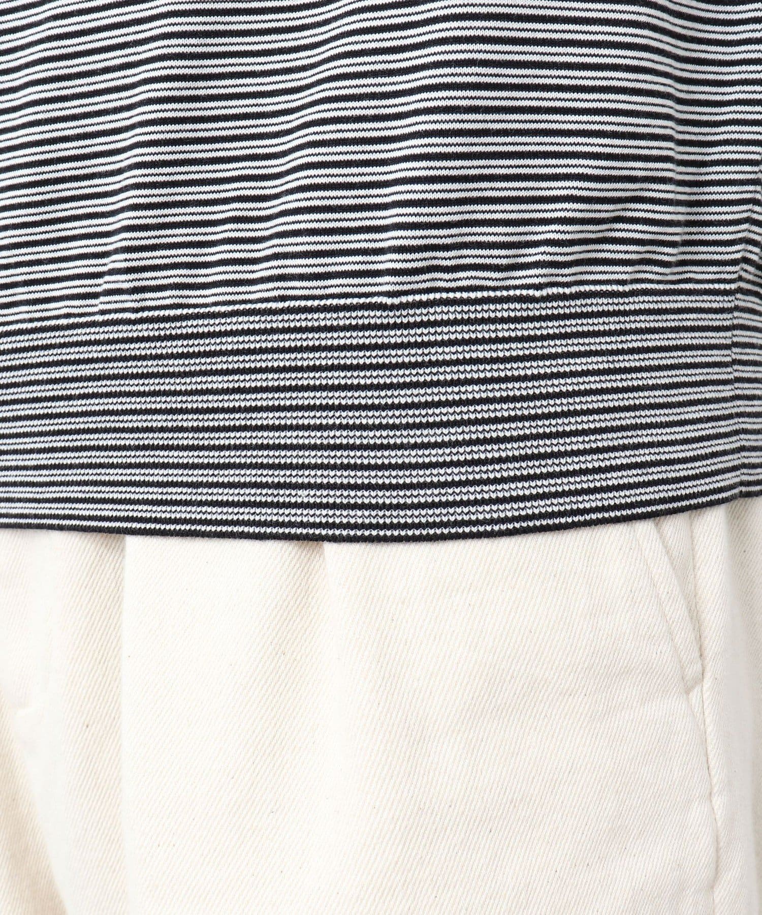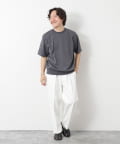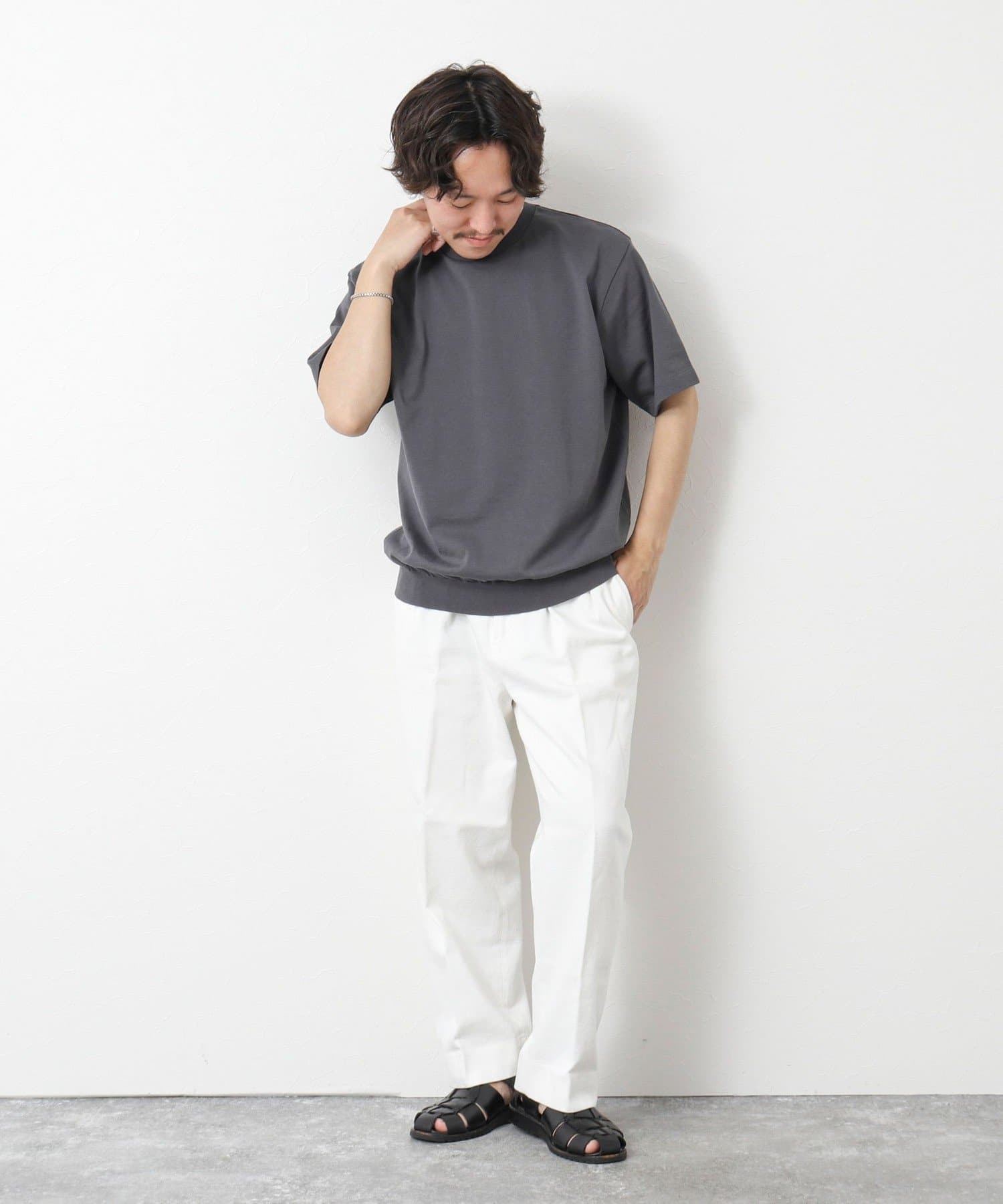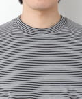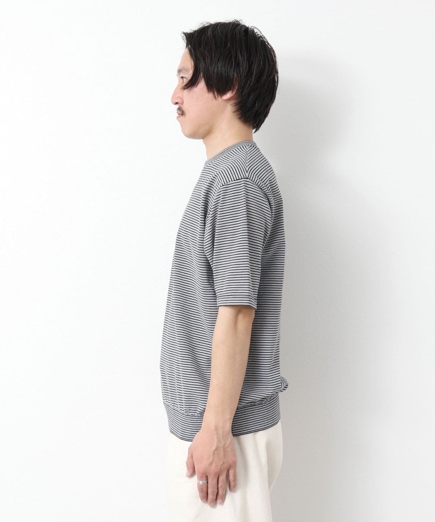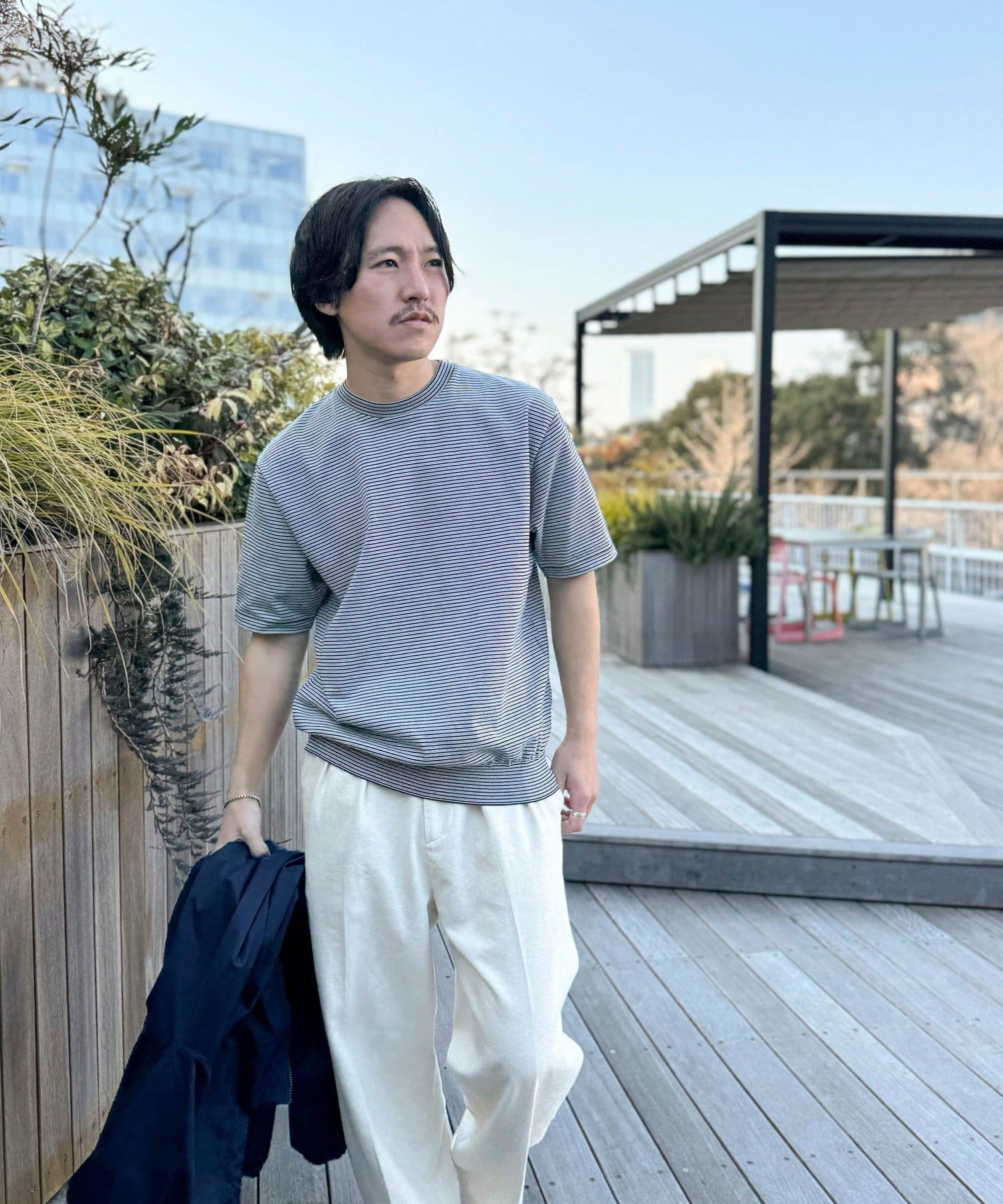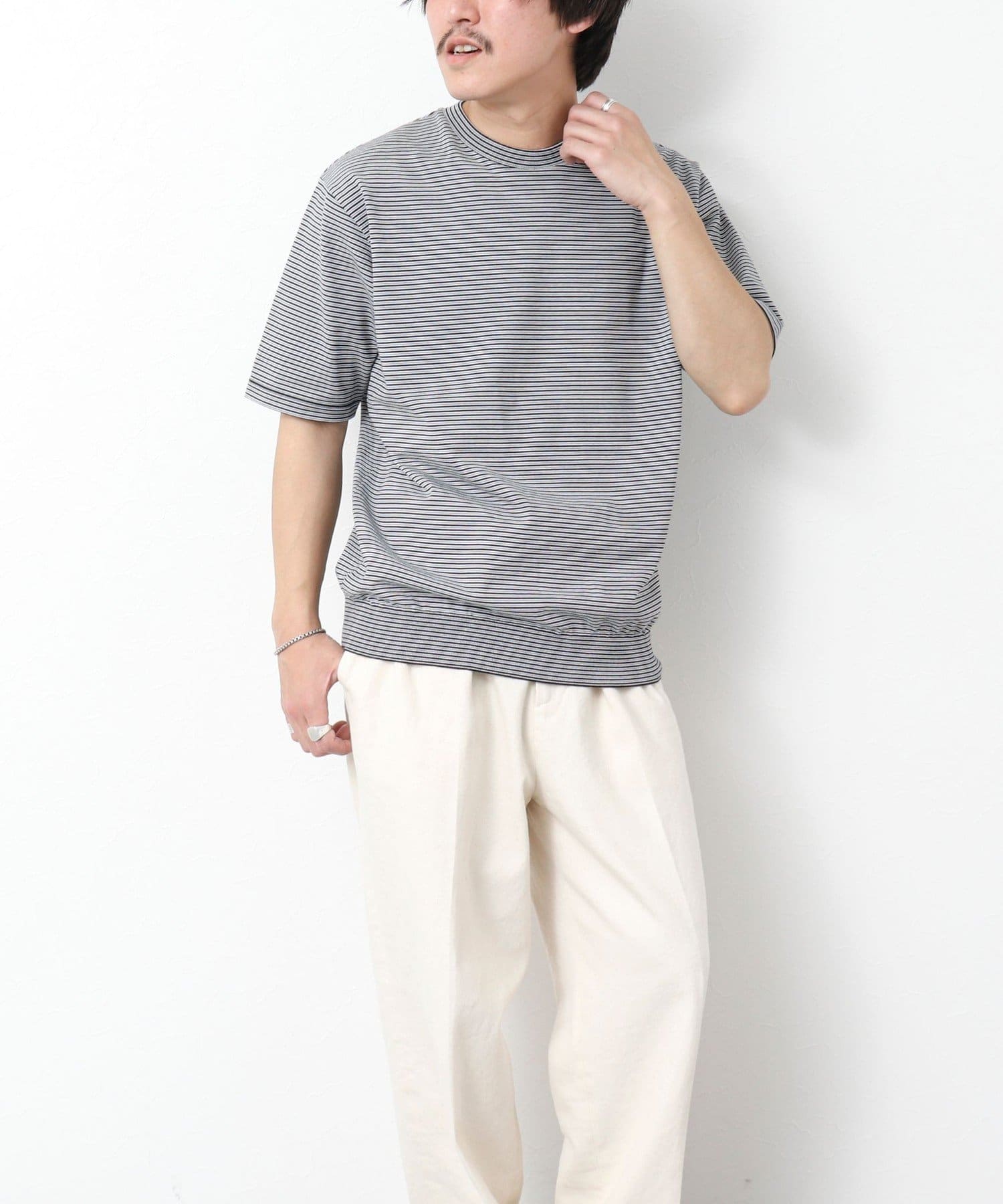 超長綿の毛羽立ちを抑えるようコンパクト紡績し、しっかりと度詰めで編んだアイテム。ニットならではの組織変化によるリブ付きでブラウジングがしっかり効いたTシャツ。1枚でサマになるようなパターンのTシャツです。