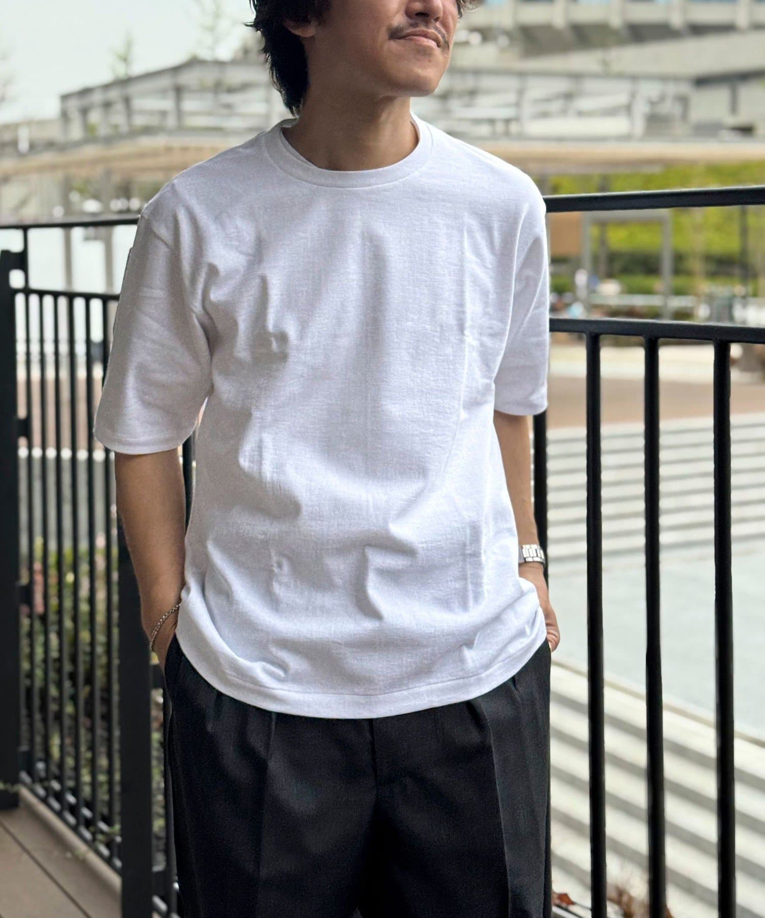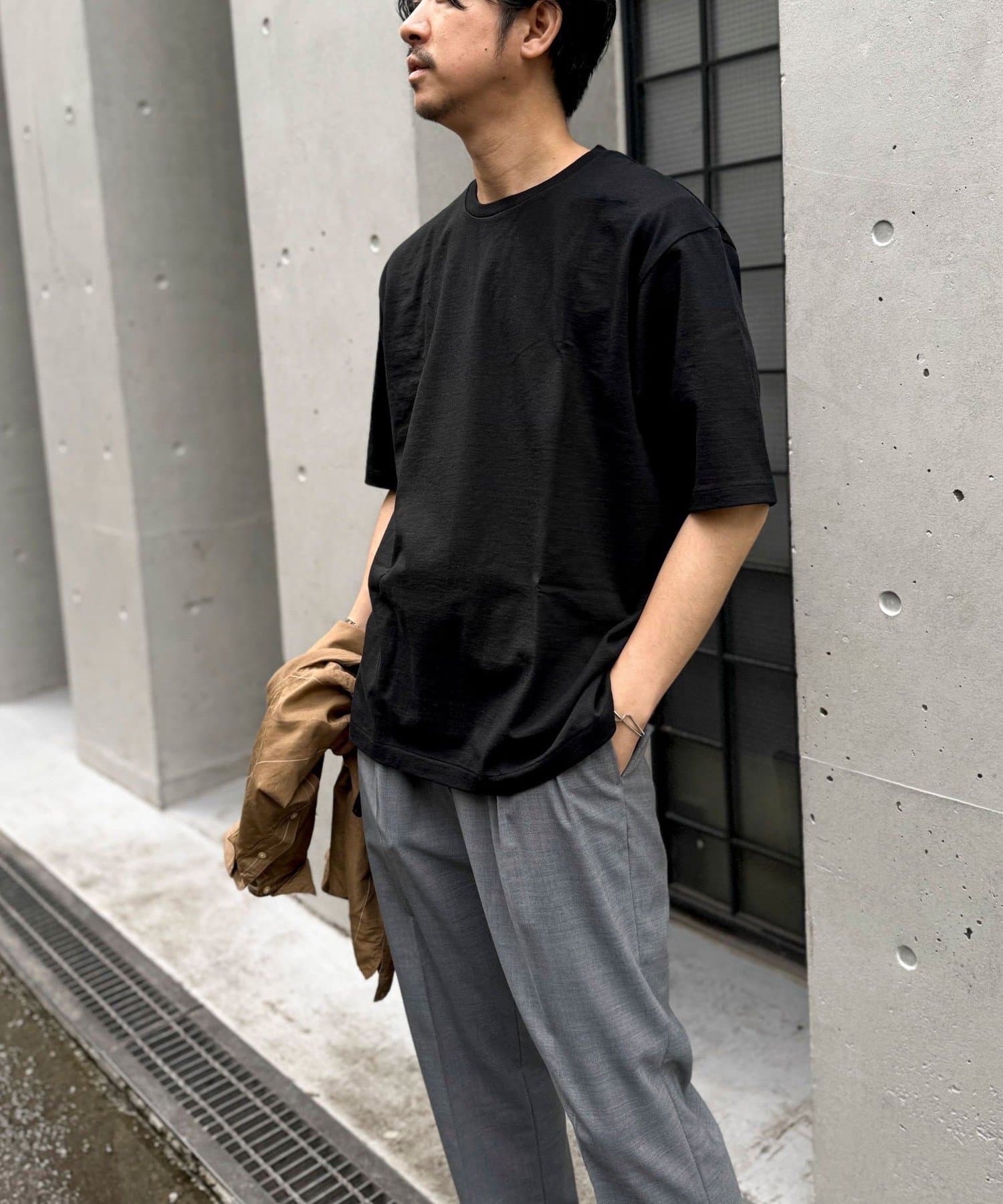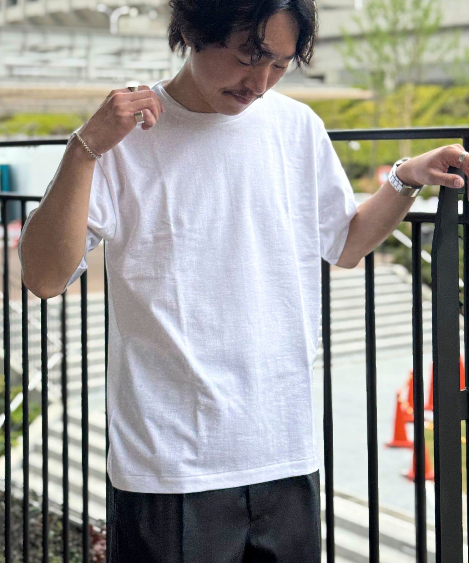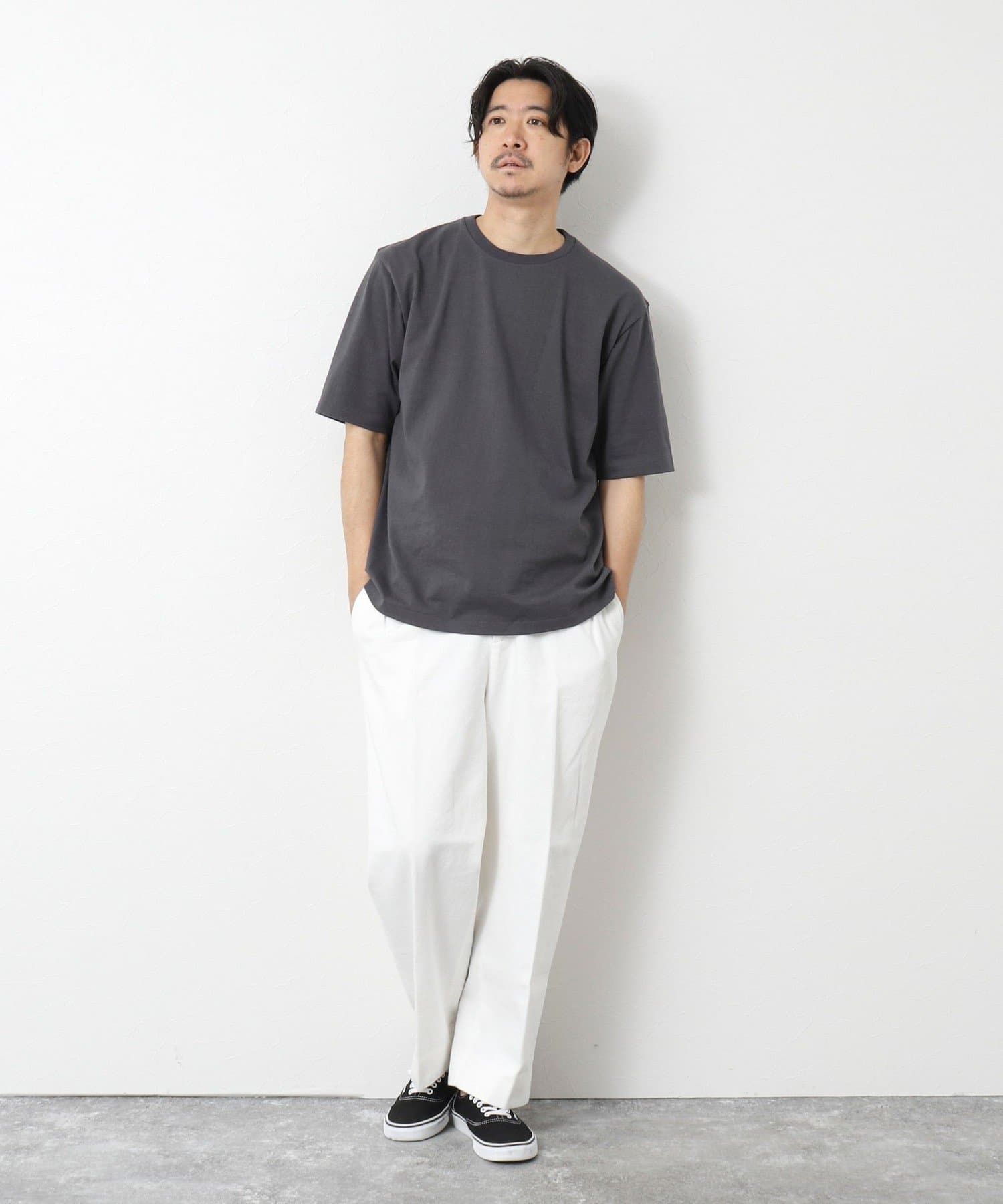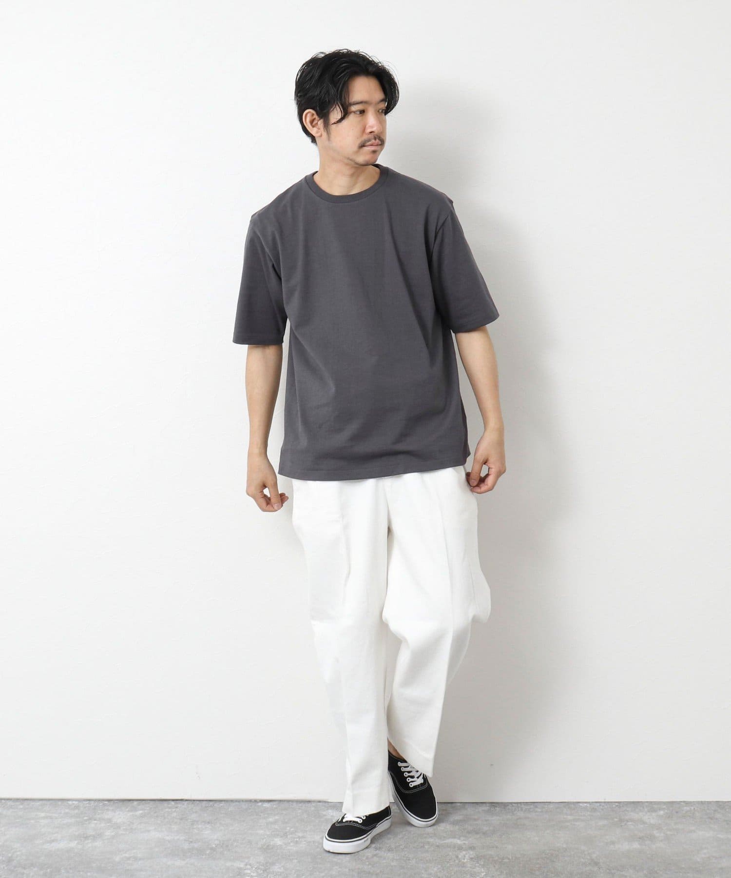柔らかさと美しい白度の高いスーピマ超長綿を空気紡績し、カジュアルな表情がありながら上品な光沢感も合わせ持った糸を吊り編機で編立したアイテム。吊り編機特有の着心地の良いテンションと丸胴ならではのストレスフリーなTシャツです。
