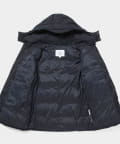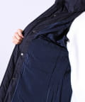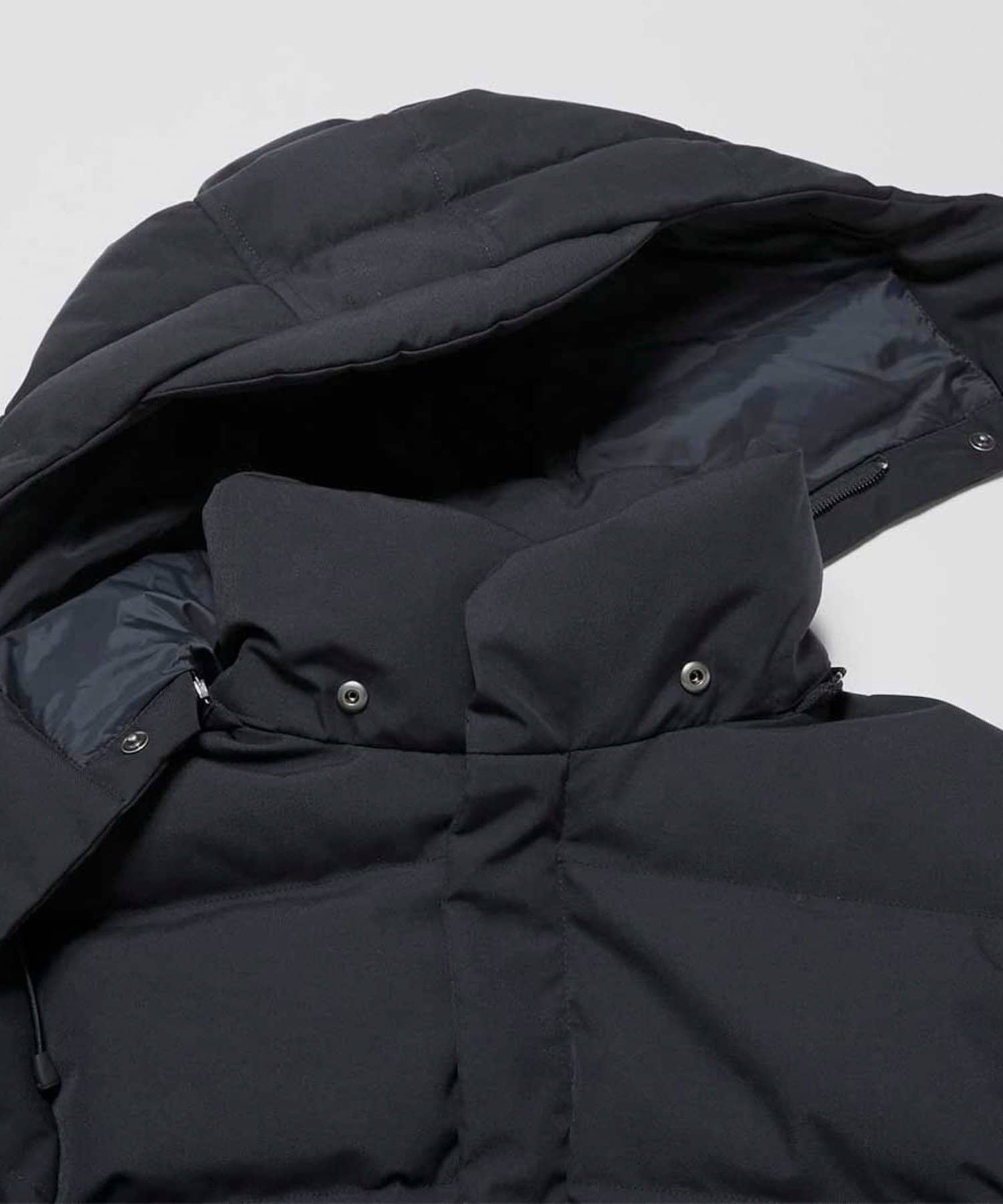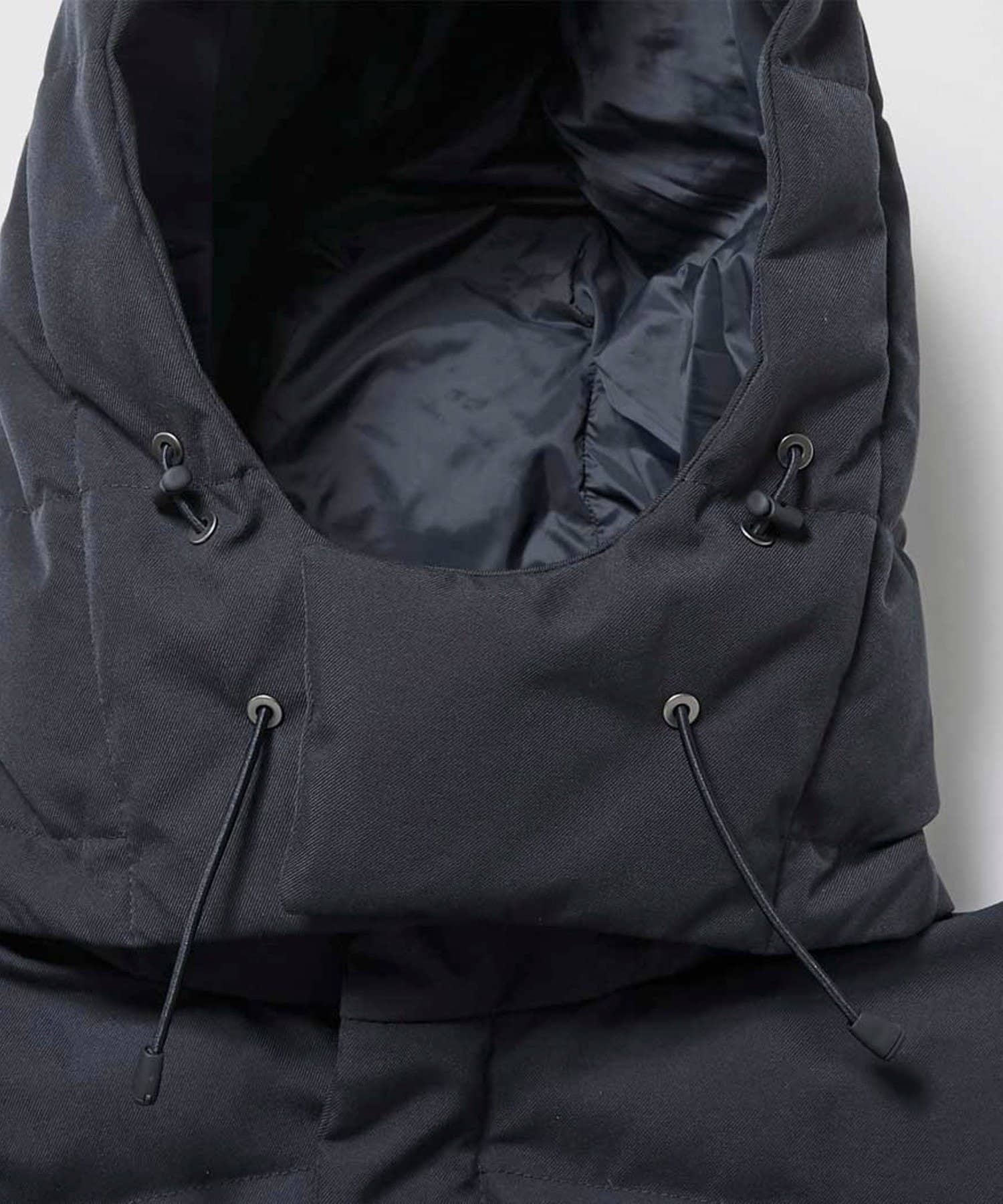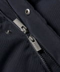 フロントボタンは表から隠れて見えない仕様で、程良い高さのスタンドカラーに着脱可能なフードを備えています。