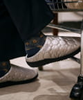 ・アッパー生地はサークル型をモチーフとしたステッチが全面に配置されたオリジナリティが加わったほか、今まで同様に水や汚れに強いテフロン加工を施しており、近所へのちょっとした外出やアウトドアシーン、オフィスや自宅などでルームシューズとしても最適