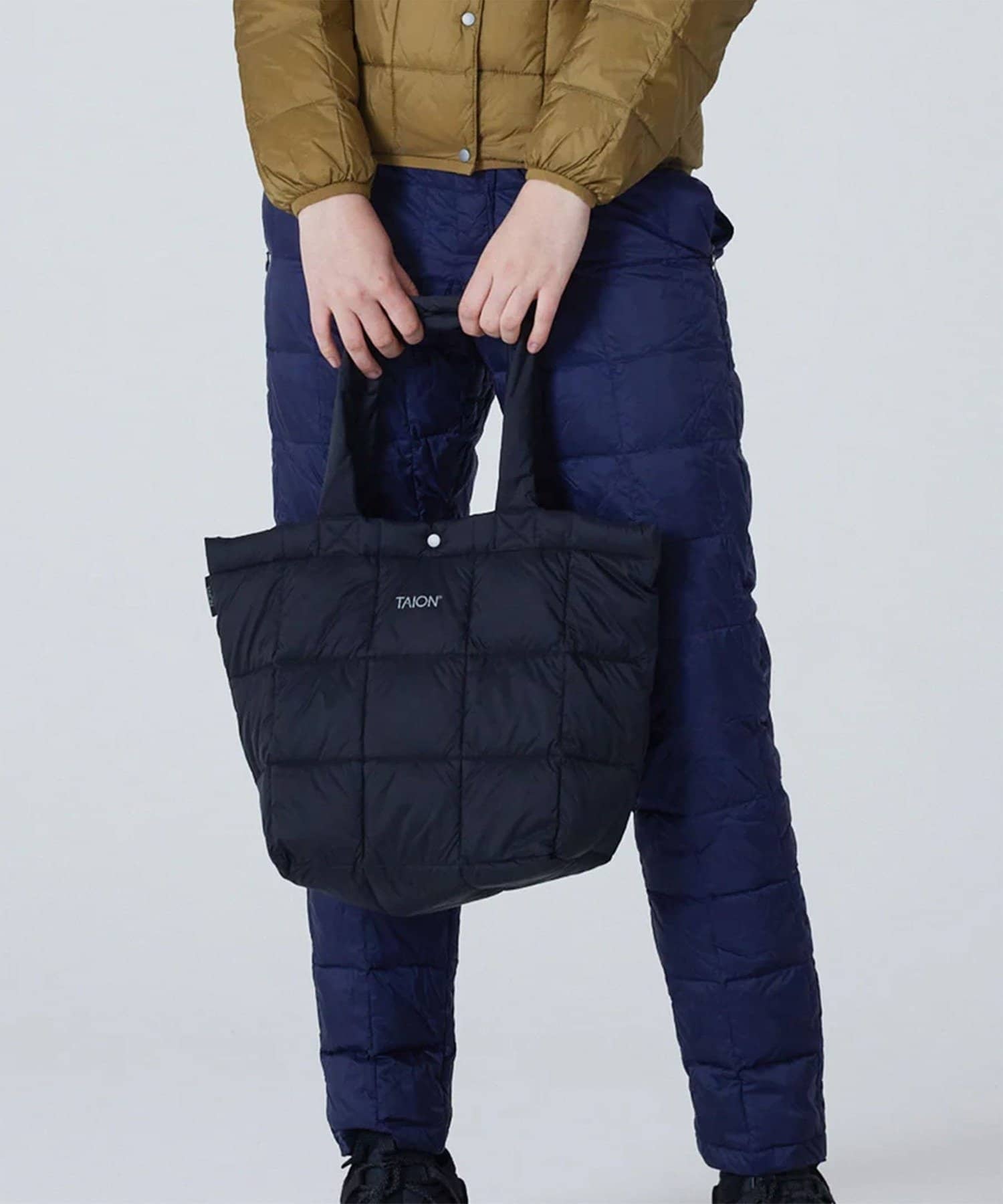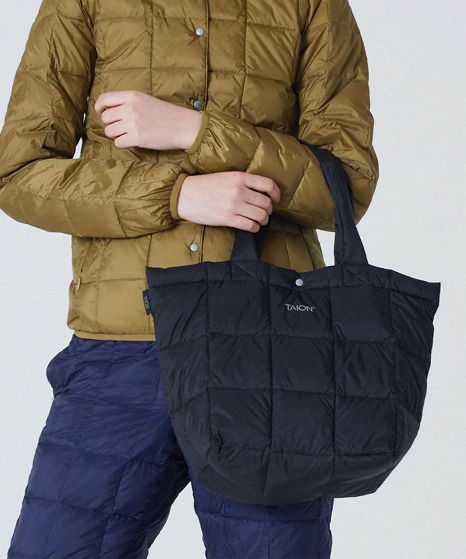 "軽くて柔らかなフォルムが特徴的、中型ダウントートバッグ"